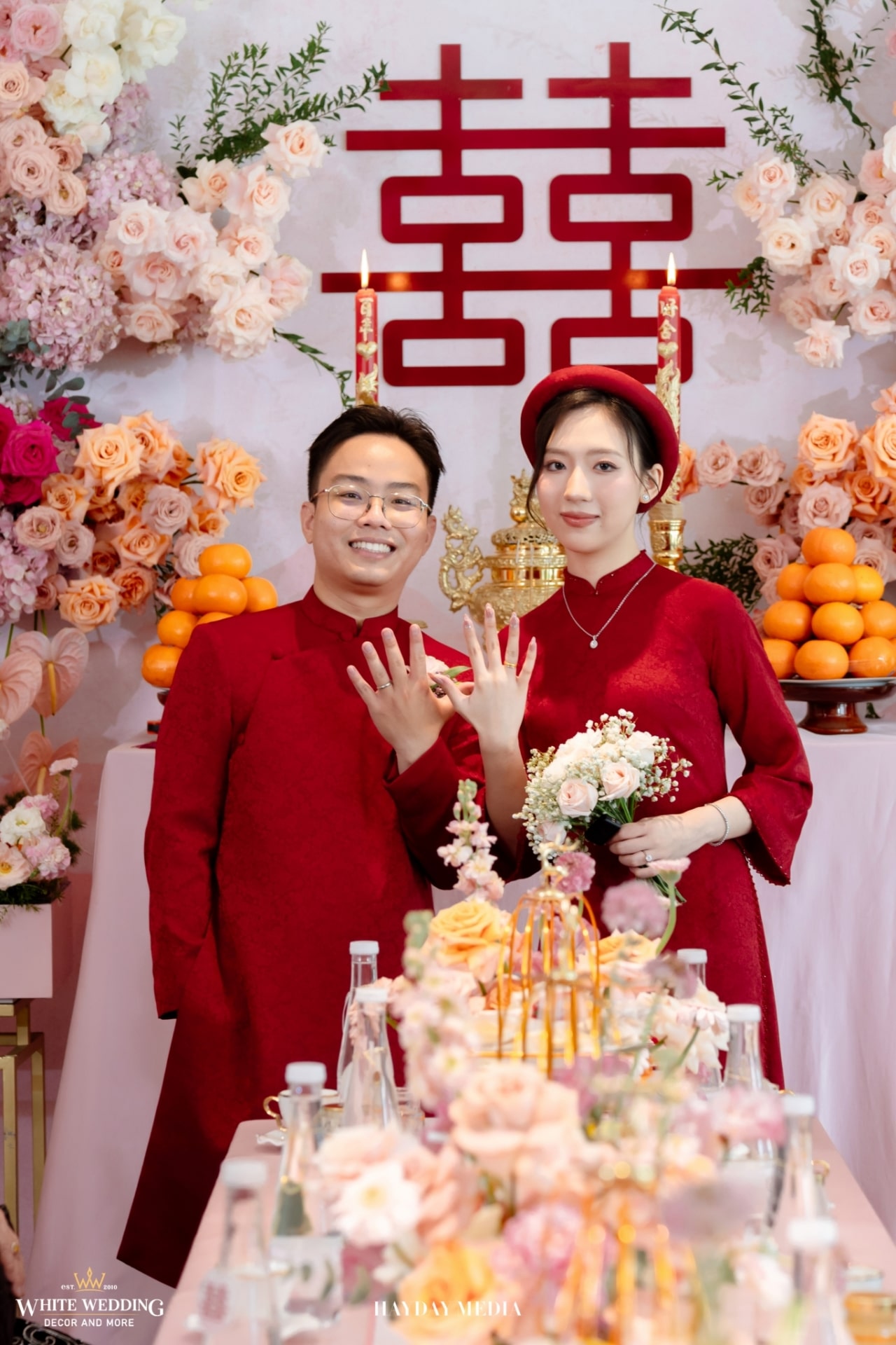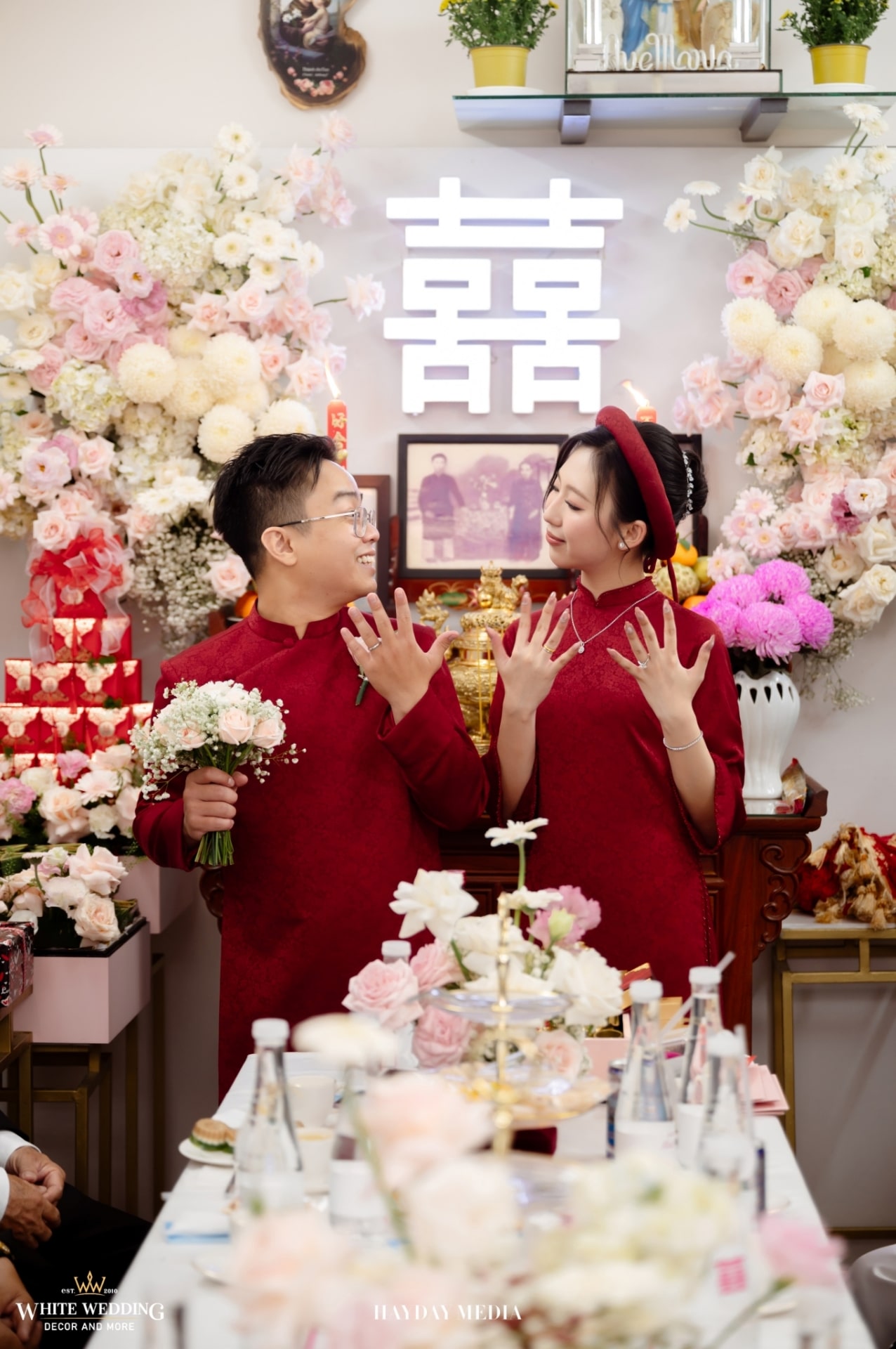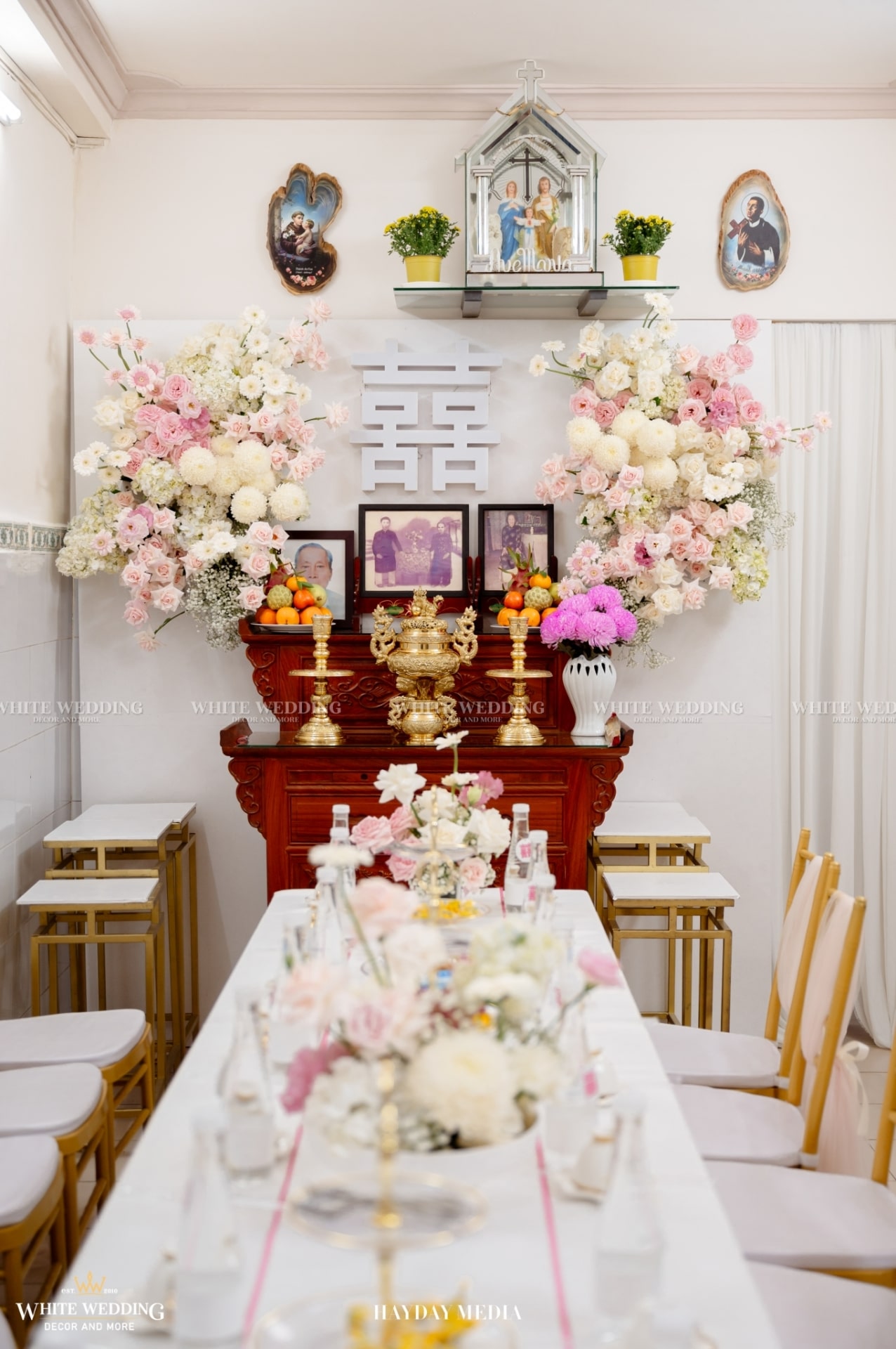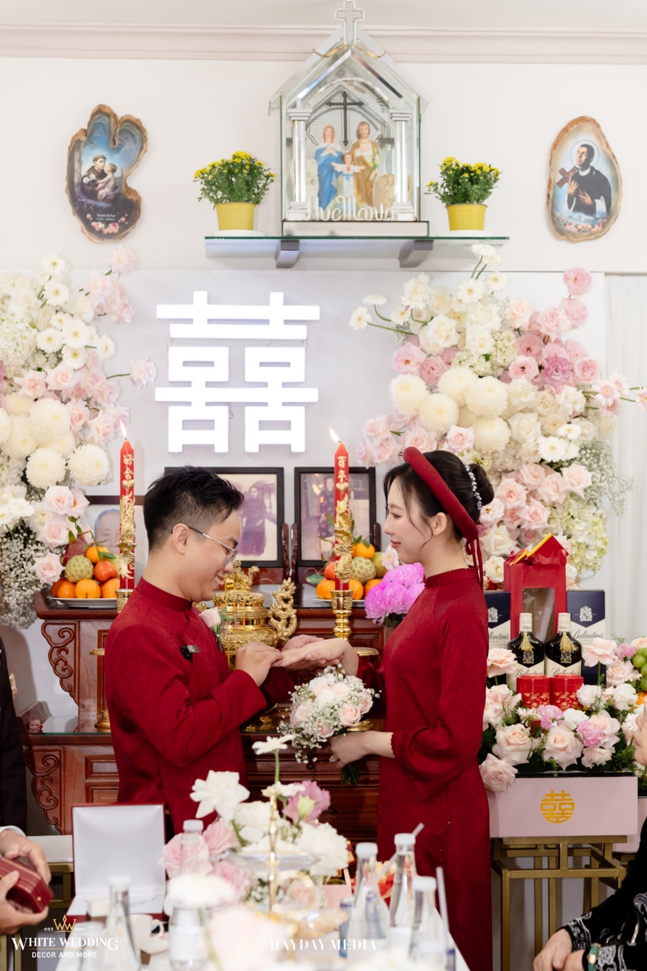 Không gian gia tiên trong lễ cưới Tâm & Hùng được trang hoàng bằng những đoá hoa tươi sắc, nhẹ nhàng nhưng tinh tế – như lòng thành kính dâng lên tổ tiên, cũng là lời chúc phúc cho một cuộc sống mới an yên, thuận hòa.