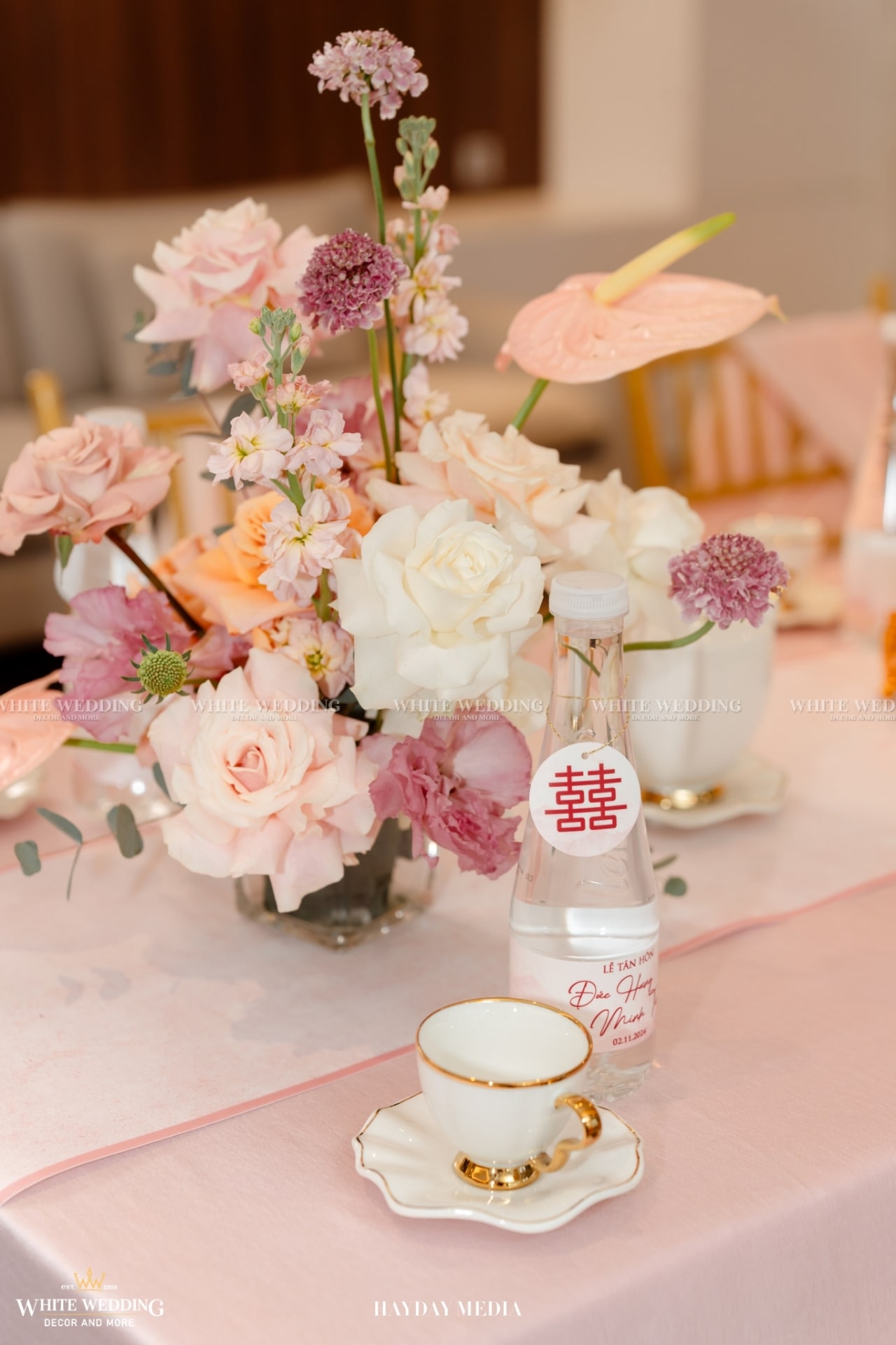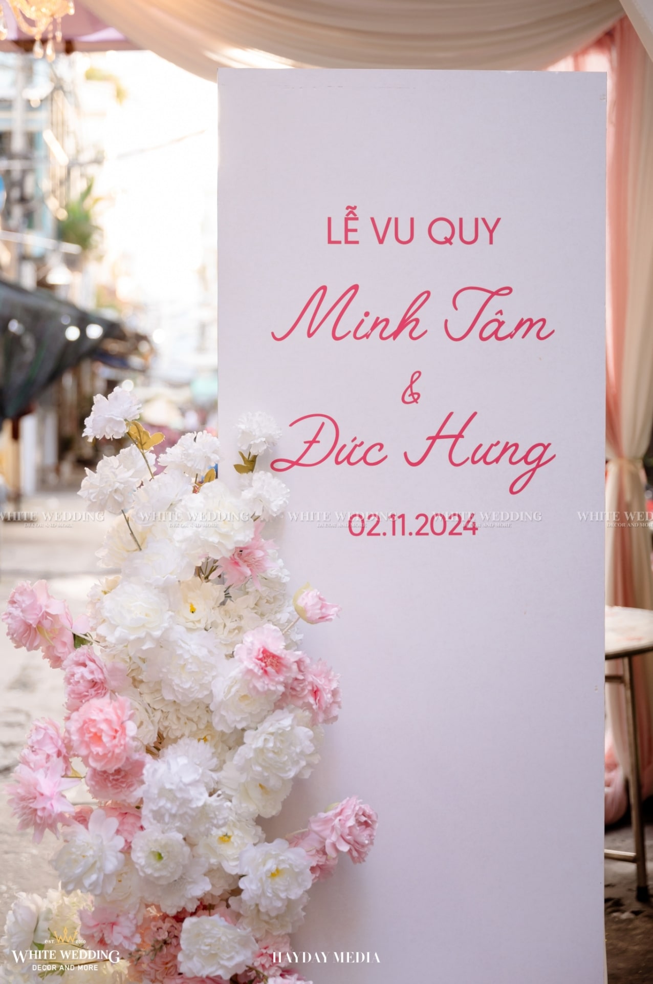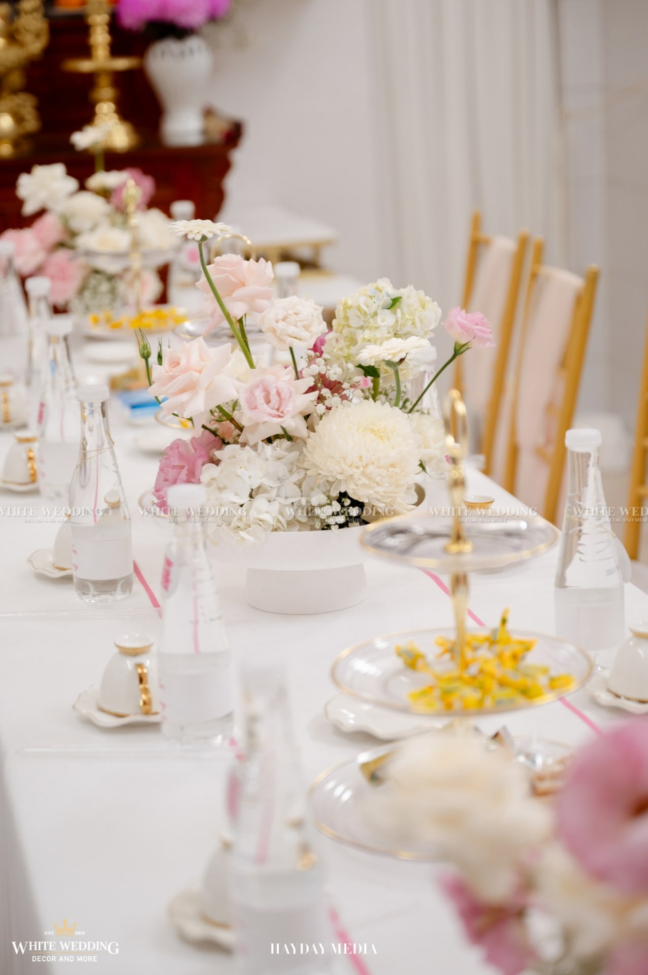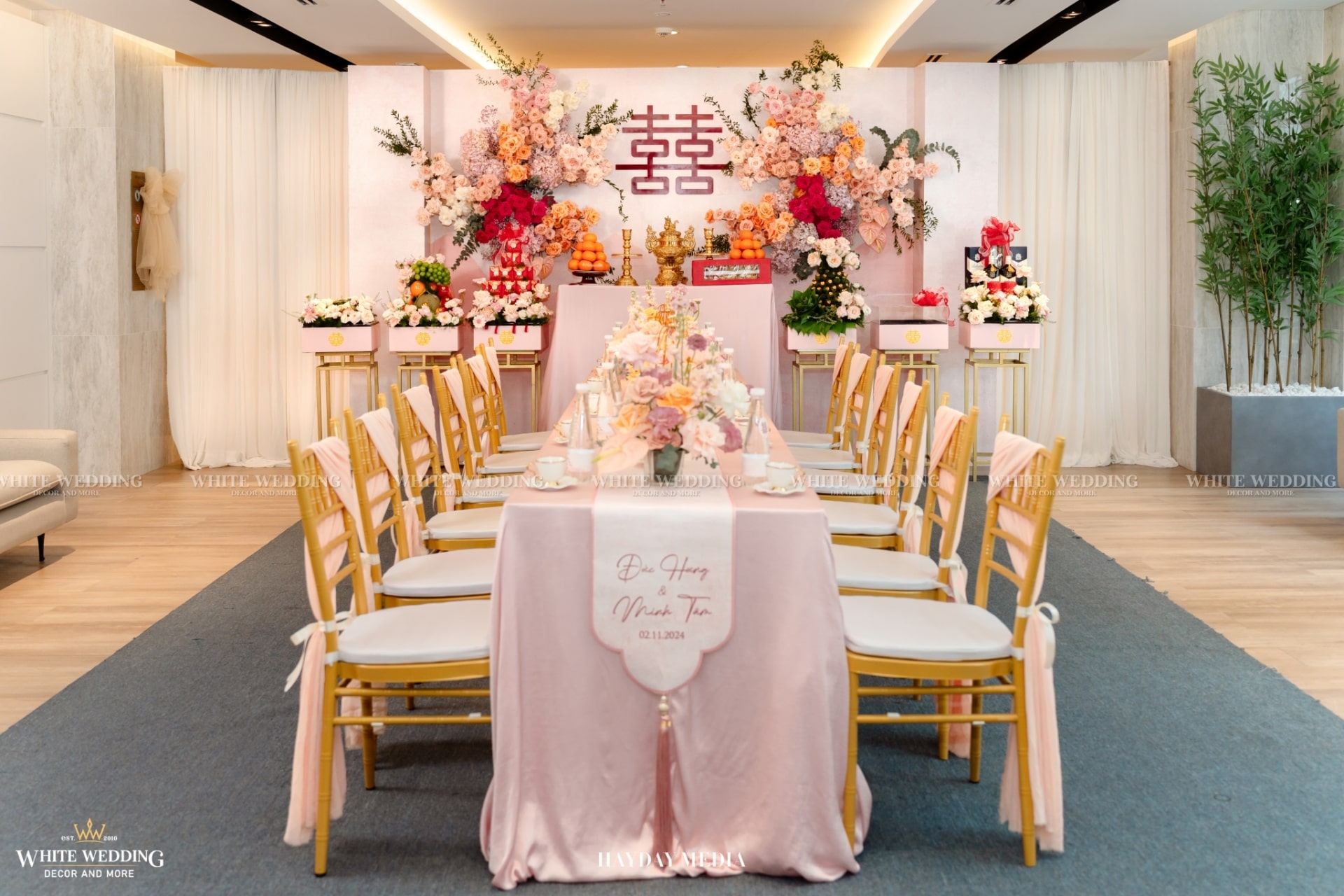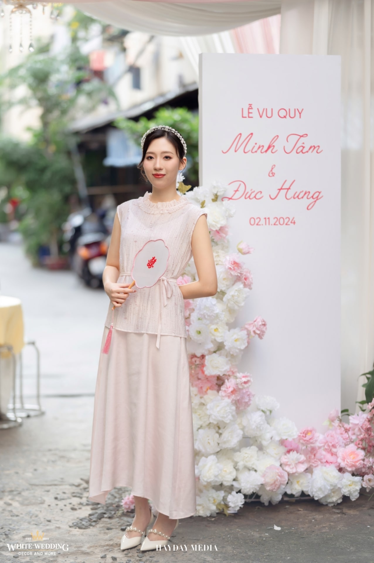 Không gian gia tiên trong lễ cưới Tâm & Hùng được trang hoàng bằng những đoá hoa tươi sắc, nhẹ nhàng nhưng tinh tế – như lòng thành kính dâng lên tổ tiên, cũng là lời chúc phúc cho một cuộc sống mới an yên, thuận hòa.