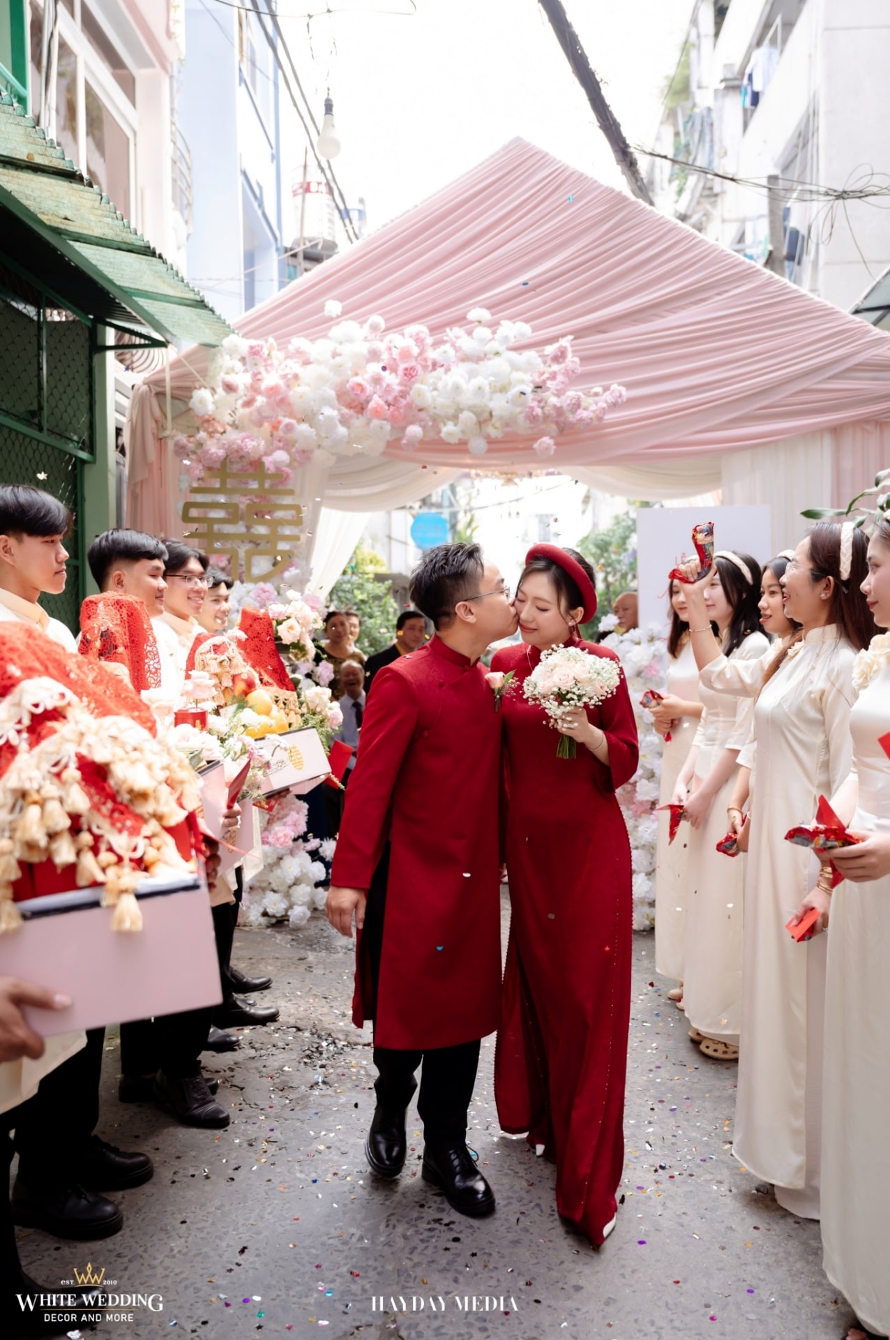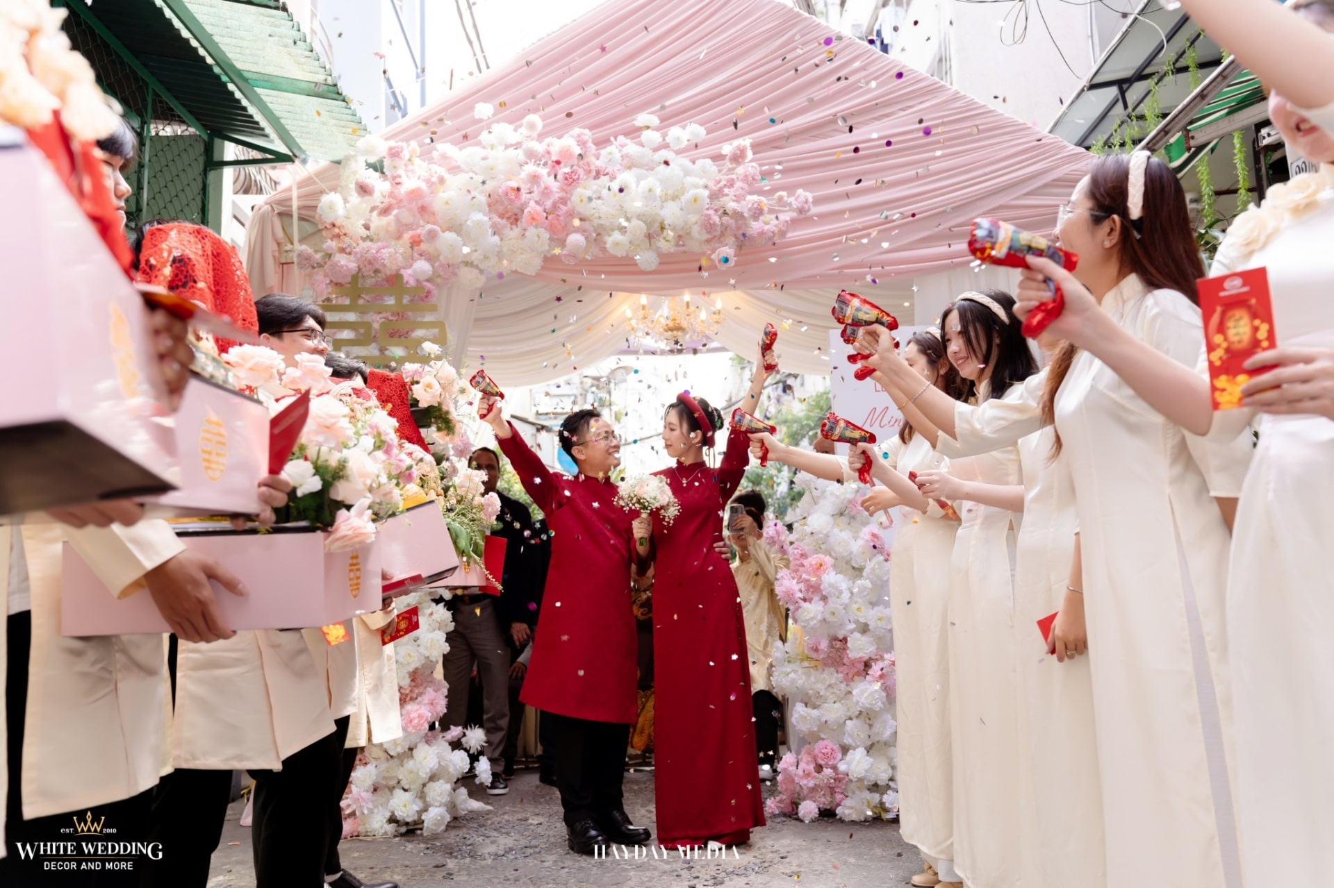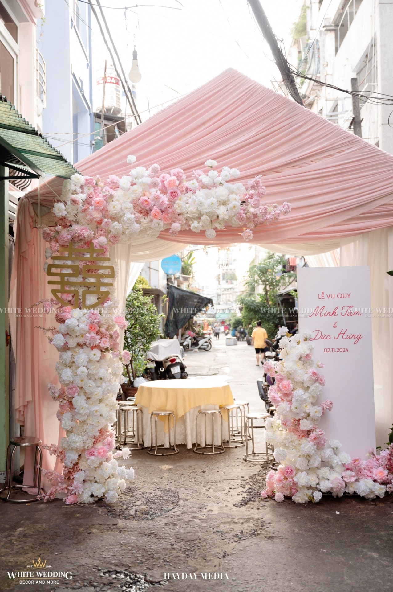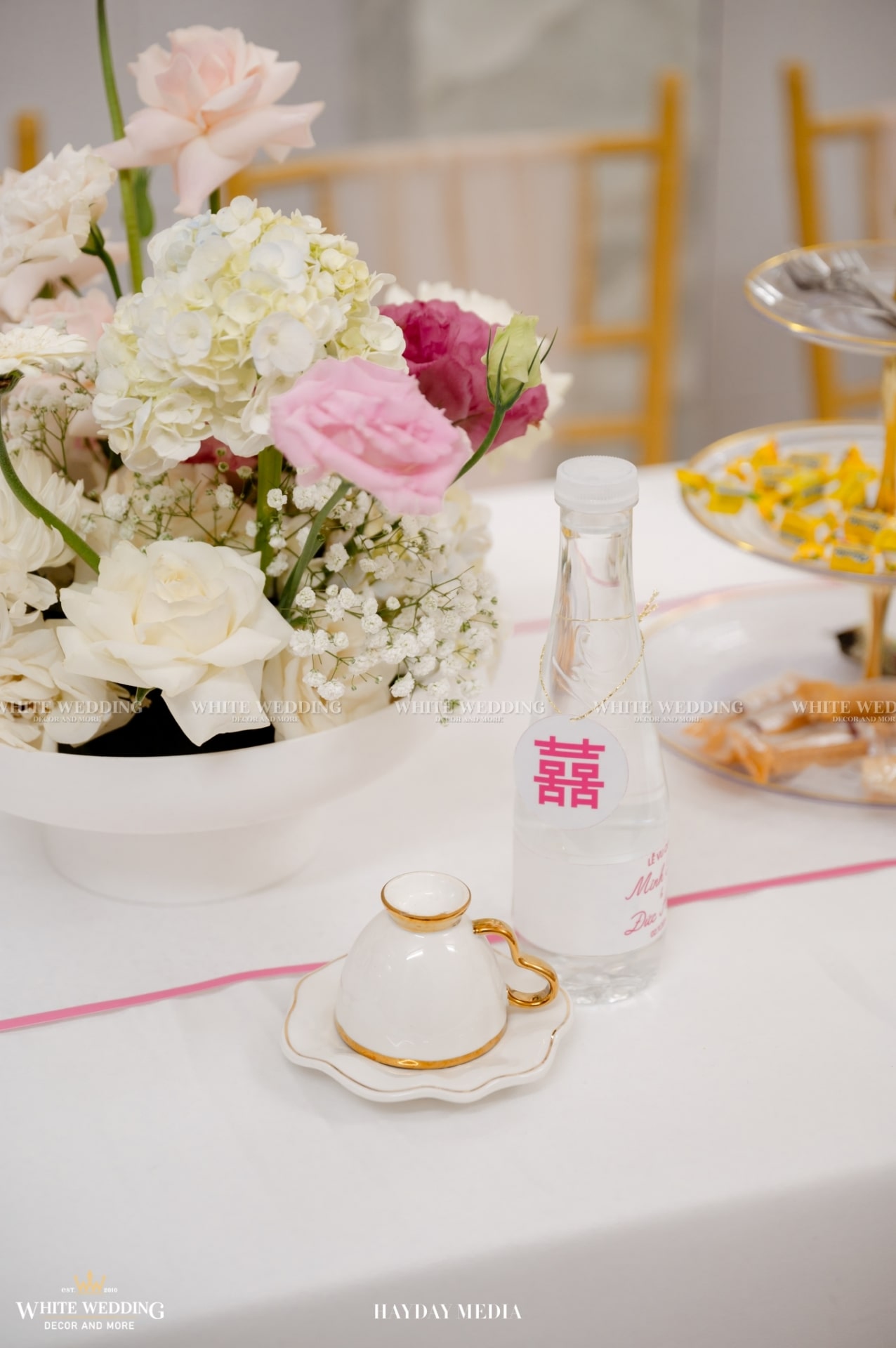 Không gian gia tiên trong lễ cưới Tâm & Hùng được trang hoàng bằng những đoá hoa tươi sắc, nhẹ nhàng nhưng tinh tế – như lòng thành kính dâng lên tổ tiên, cũng là lời chúc phúc cho một cuộc sống mới an yên, thuận hòa.