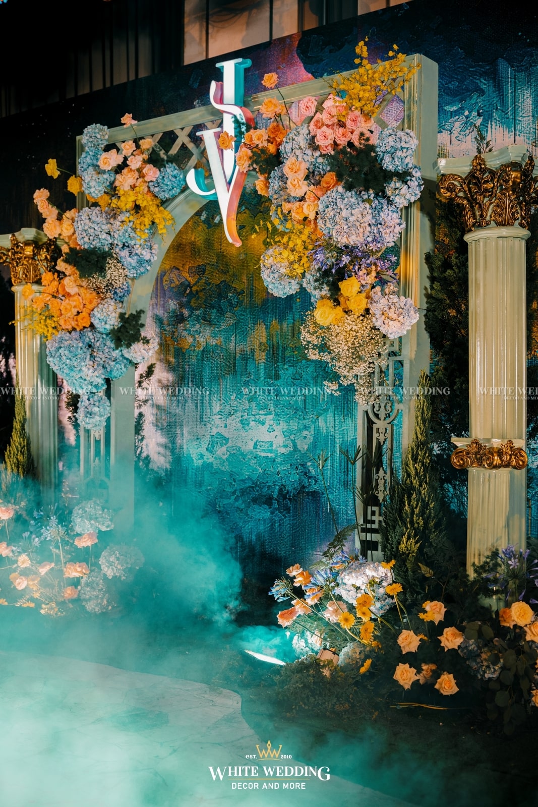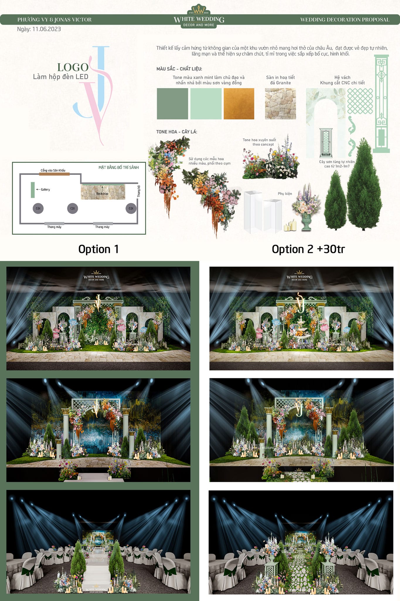 Gói trang trí A DREAMY GARDEN lấy cảm hứng từ chủ đề khu vườn đầy hoa sắc màu trong lâu đài phong cách Châu âu theo sở thích của CD Vy và CR Jonas. Bao gồm 4 hàng mục cơ bản Backdrop – Gallery – Lối đi – Sân khấu. Được thiết kế tối ưu dựa trên ngân sách cố định 1xx triệu và tập trung vào 2 hạng mục chính là Backdrop chụp hình và Sân khấu. Hạng mục bàn Gallery và Lối đi được thể hiện đơn giản lại.