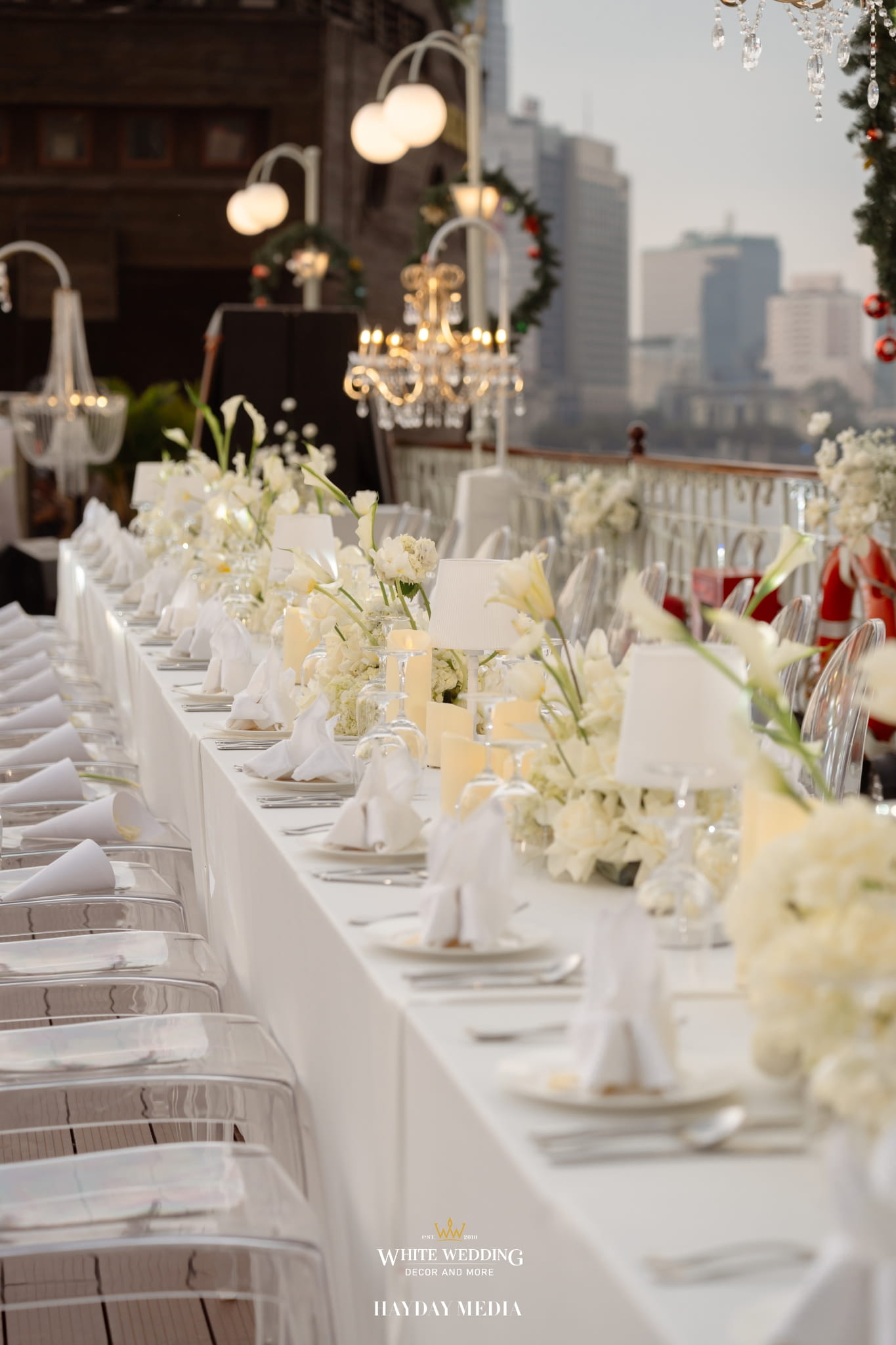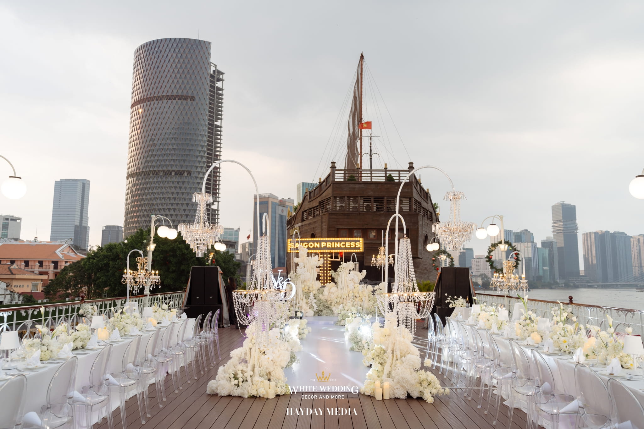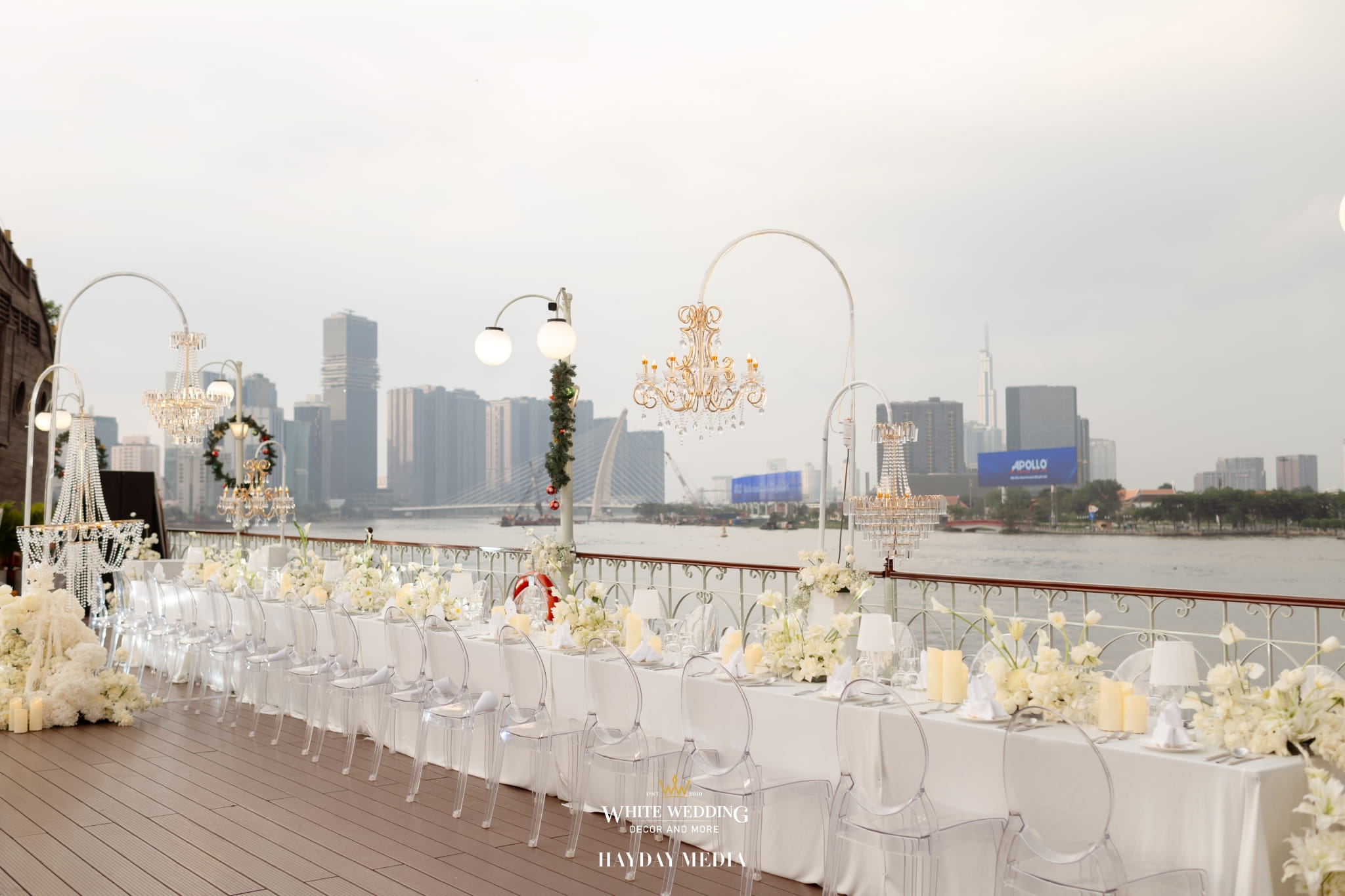 Tiệc cưới trên du thuyền được trang trí với tone trắng tinh tế, nổi bật cùng hoa tươi sang trọng, đèn chùm pha lê và ánh nến ấm áp. Không gian hôn lễ được kiến tạo như một bản giao hưởng của cảm xúc: sang trọng, tinh tế và đầy lãng mạn, để tình yêu ấy được nâng niu trong từng chi tiết.