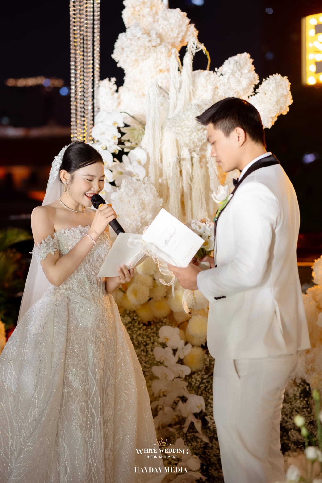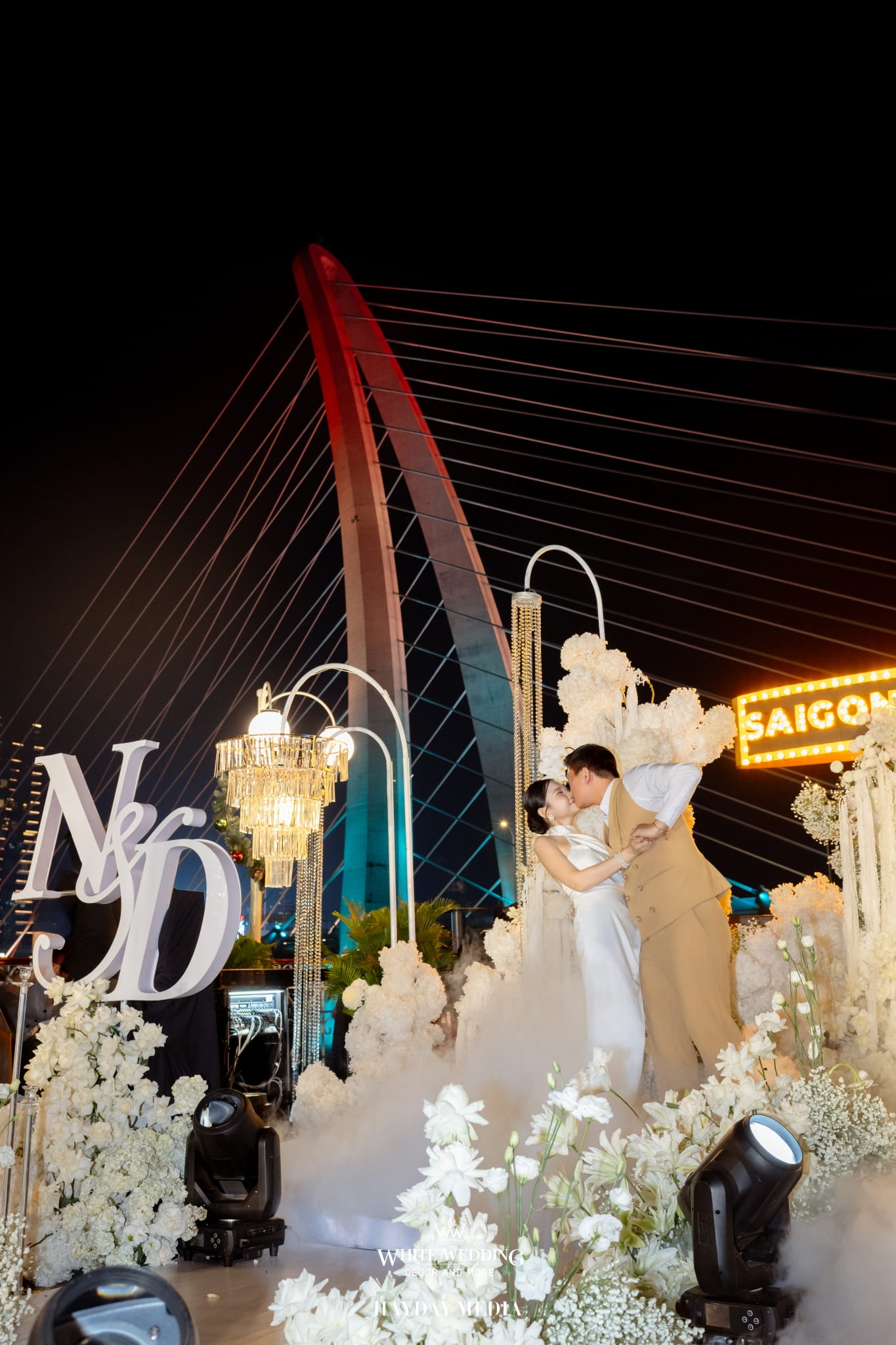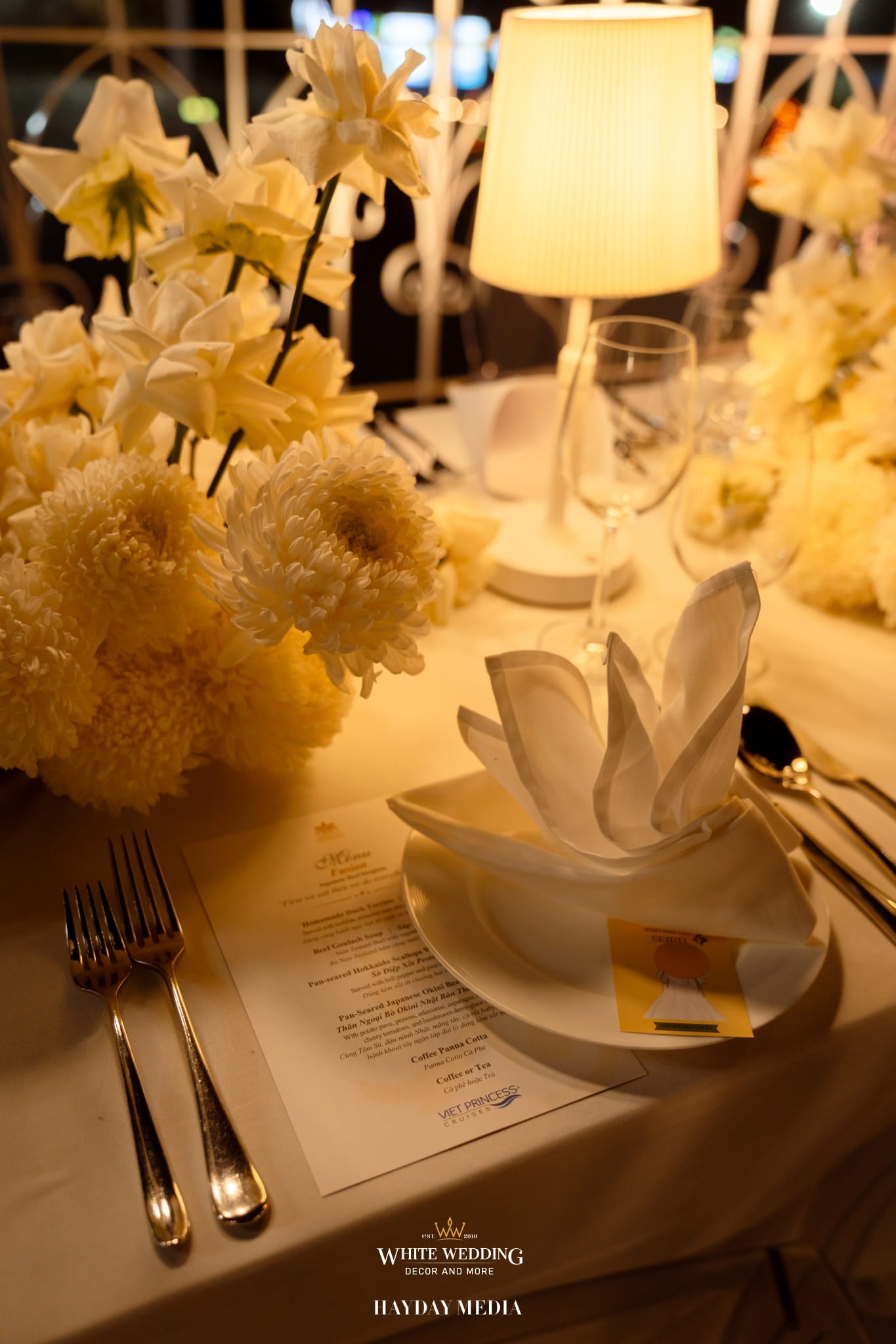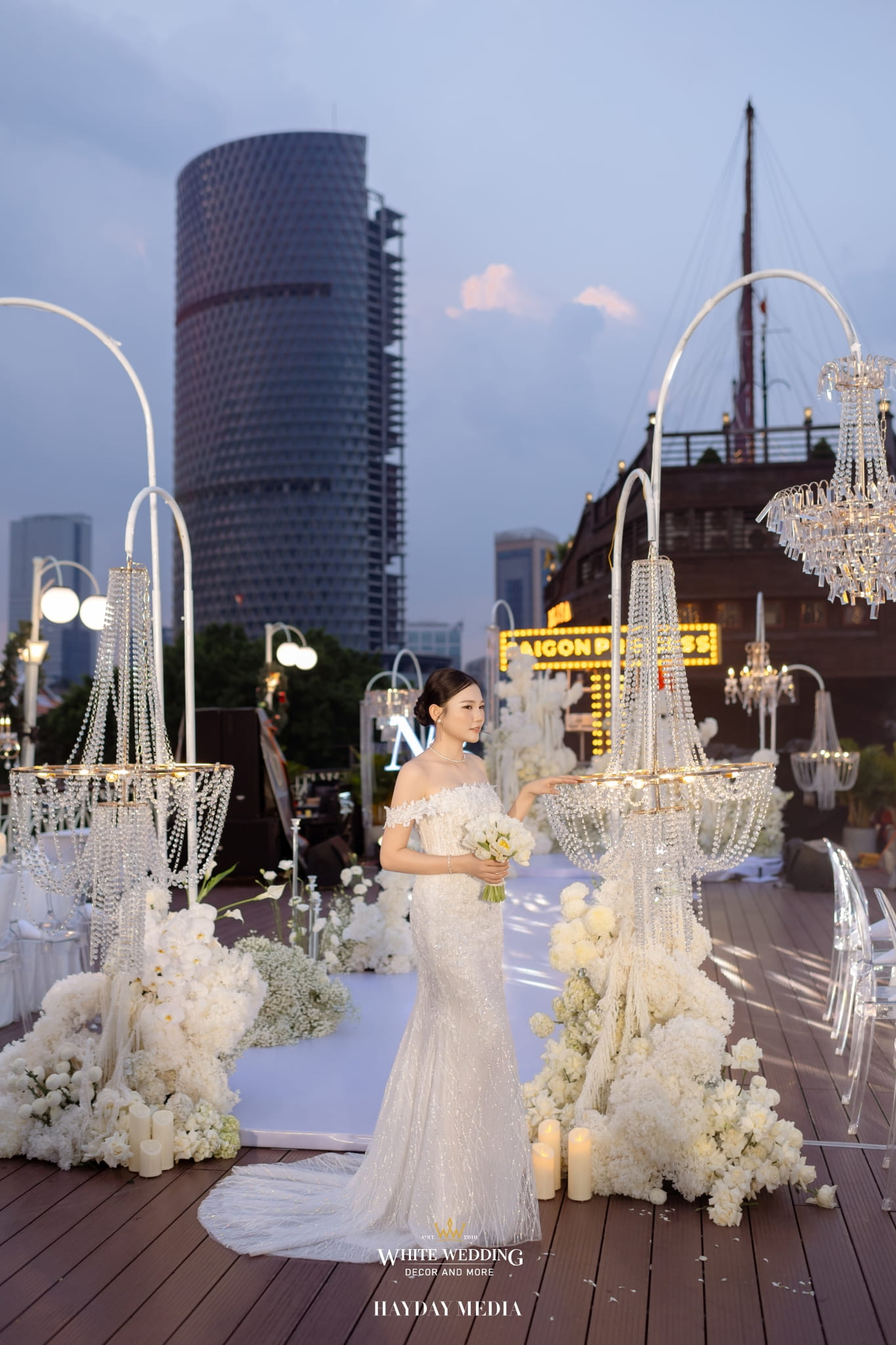 Tiệc cưới trên du thuyền được trang trí với tone trắng tinh tế, nổi bật cùng hoa tươi sang trọng, đèn chùm pha lê và ánh nến ấm áp. Không gian hôn lễ được kiến tạo như một bản giao hưởng của cảm xúc: sang trọng, tinh tế và đầy lãng mạn, để tình yêu ấy được nâng niu trong từng chi tiết.