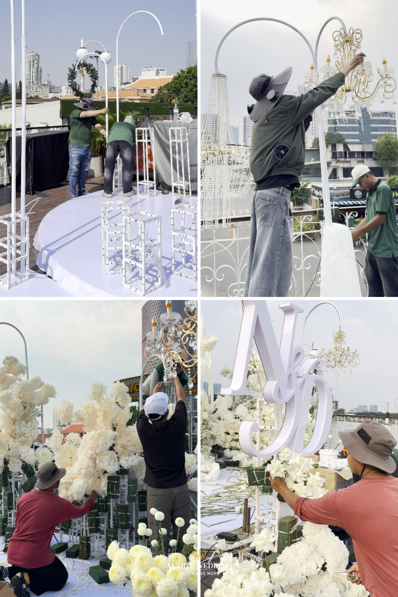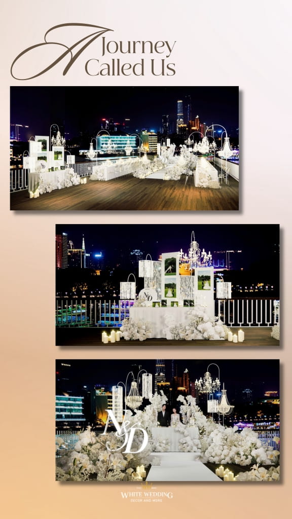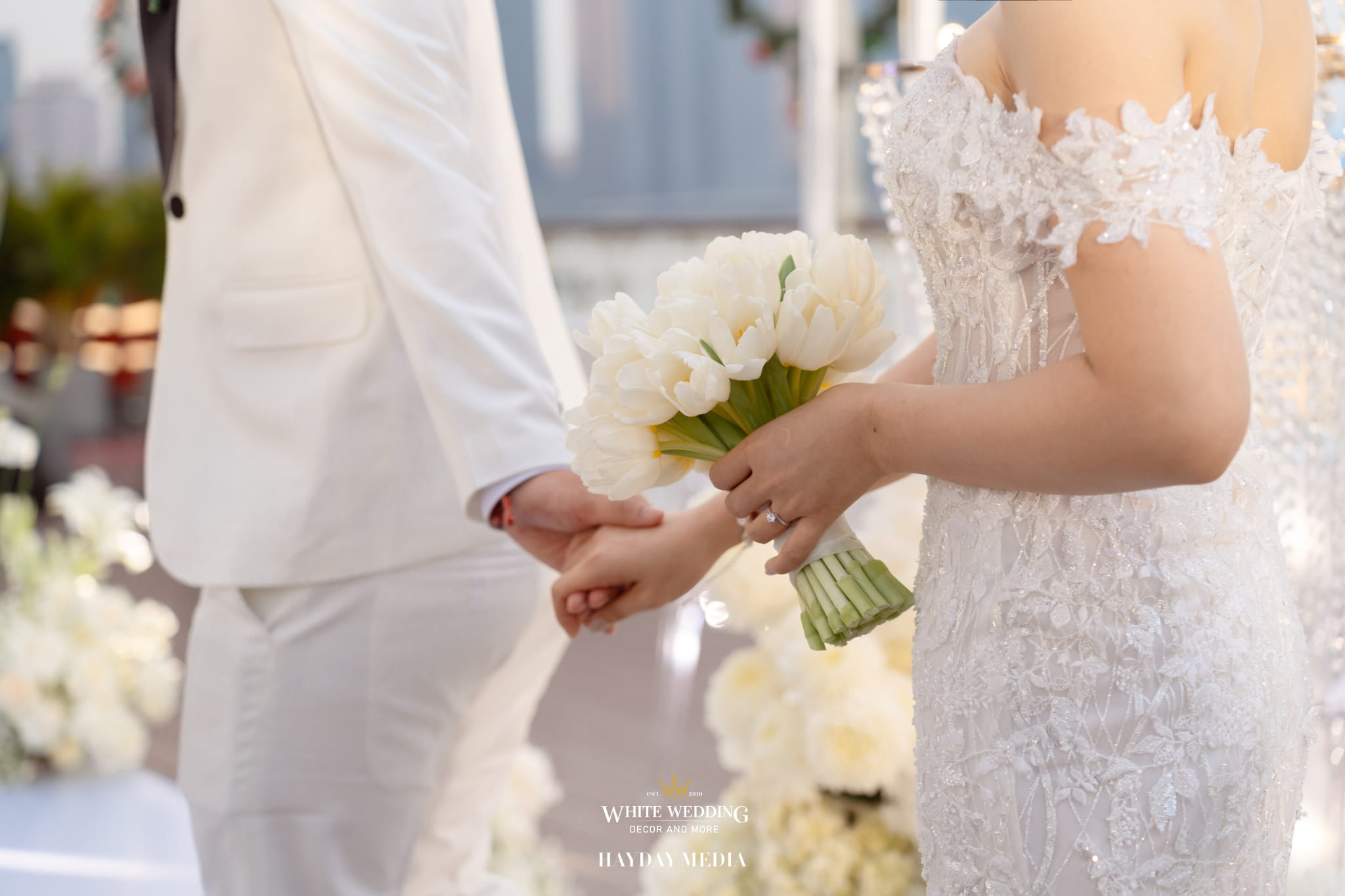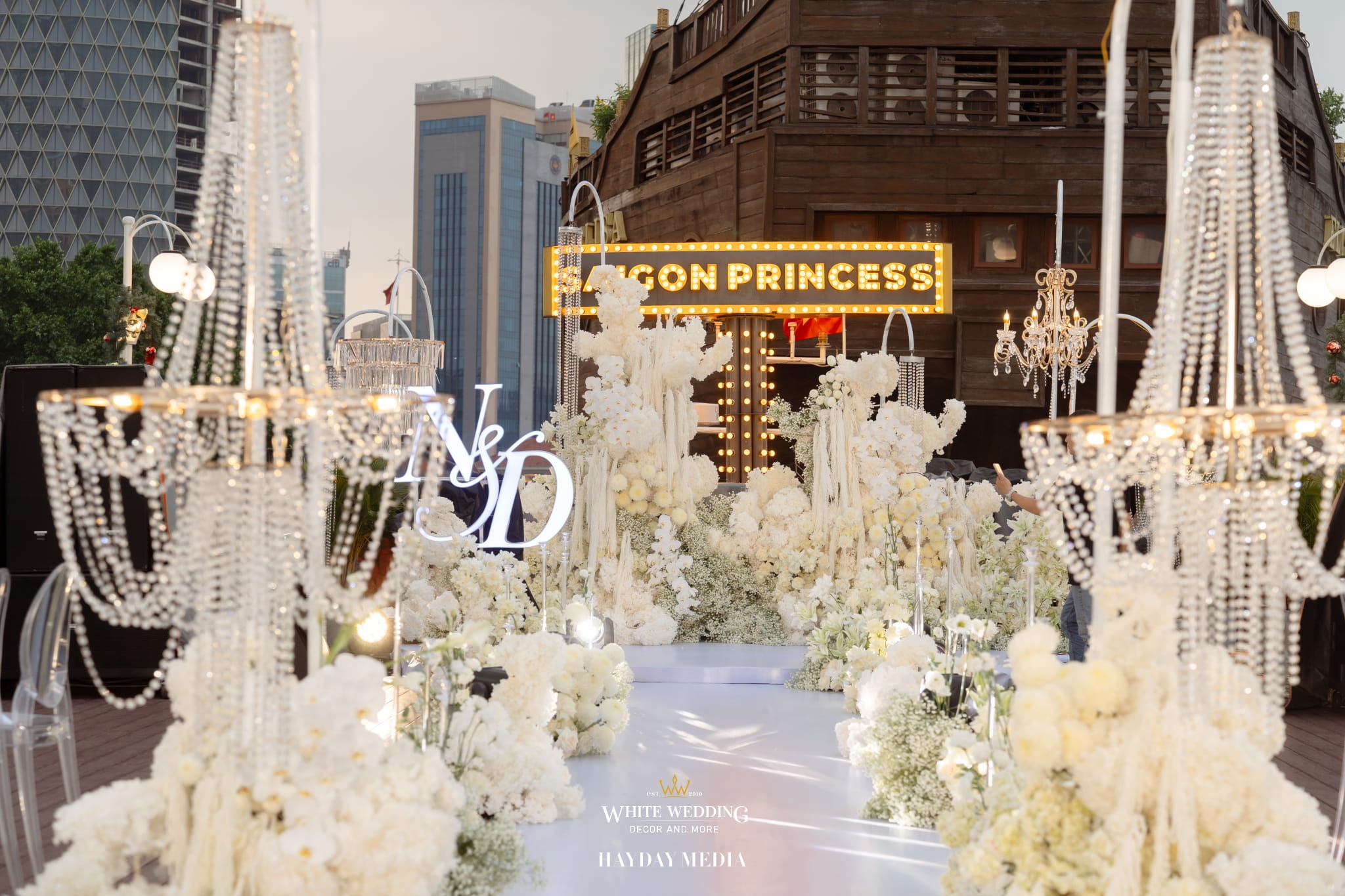 Tiệc cưới trên du thuyền được trang trí với tone trắng tinh tế, nổi bật cùng hoa tươi sang trọng, đèn chùm pha lê và ánh nến ấm áp. Không gian hôn lễ được kiến tạo như một bản giao hưởng của cảm xúc: sang trọng, tinh tế và đầy lãng mạn, để tình yêu ấy được nâng niu trong từng chi tiết.