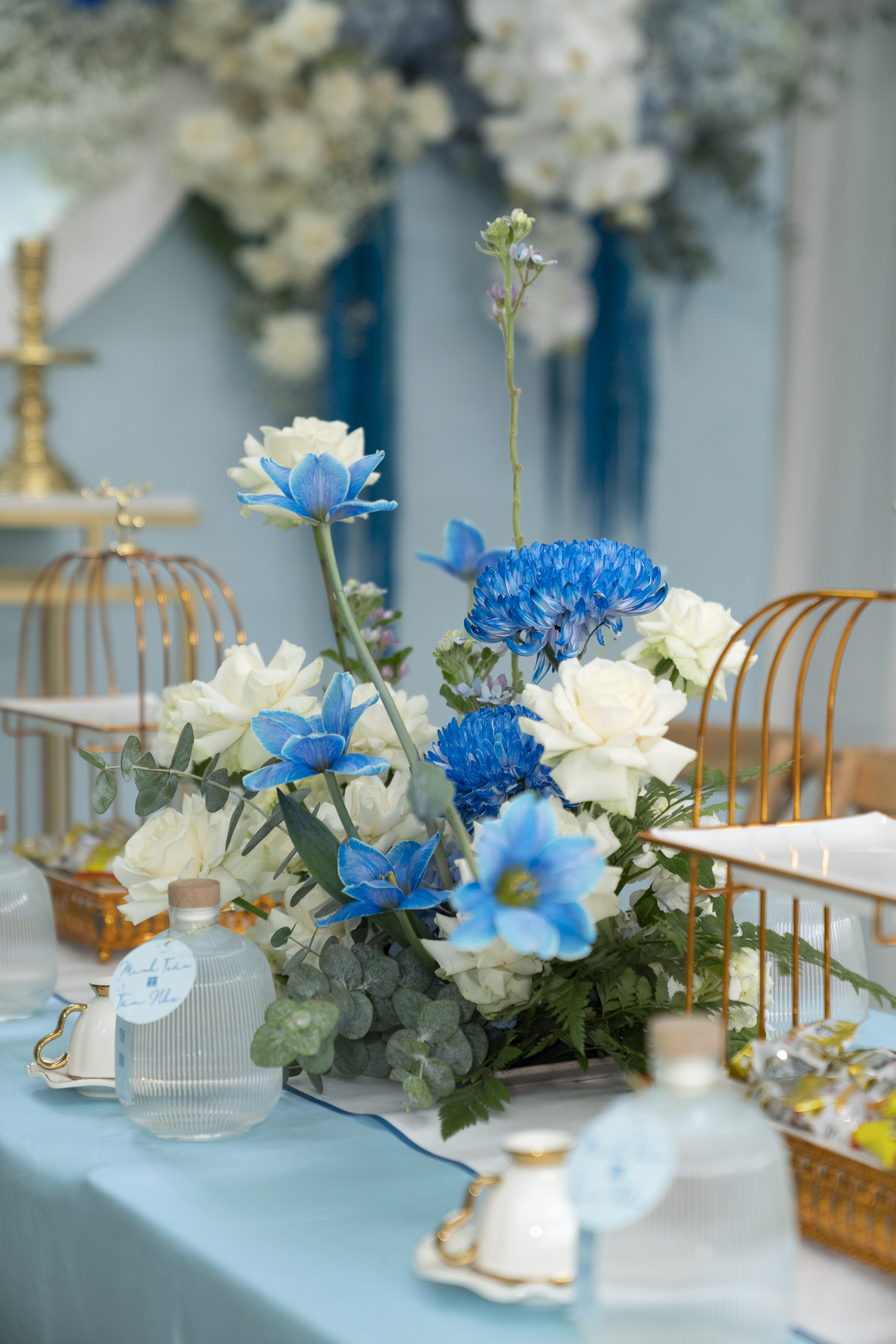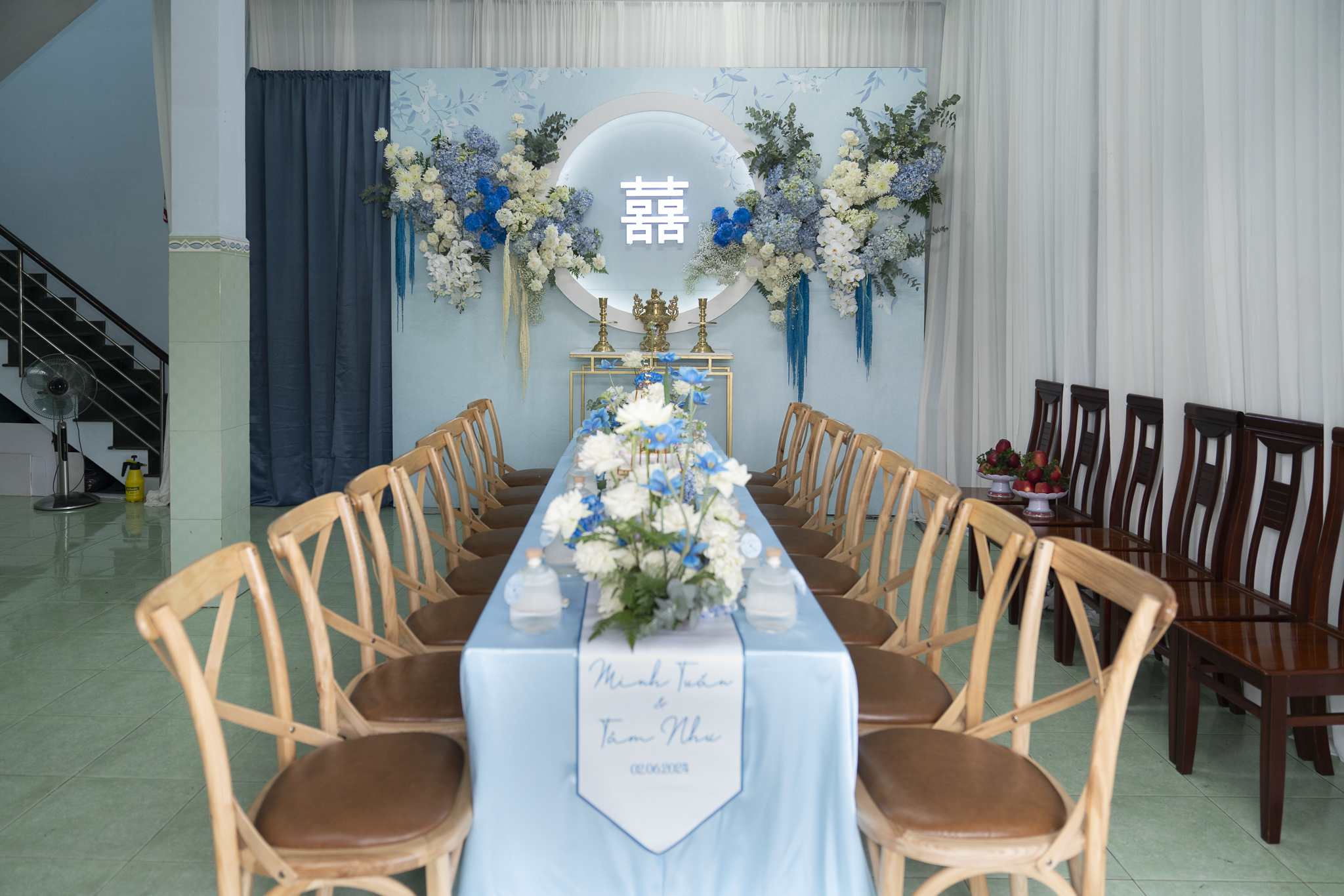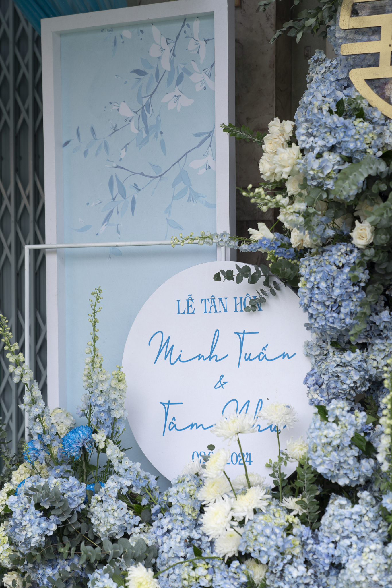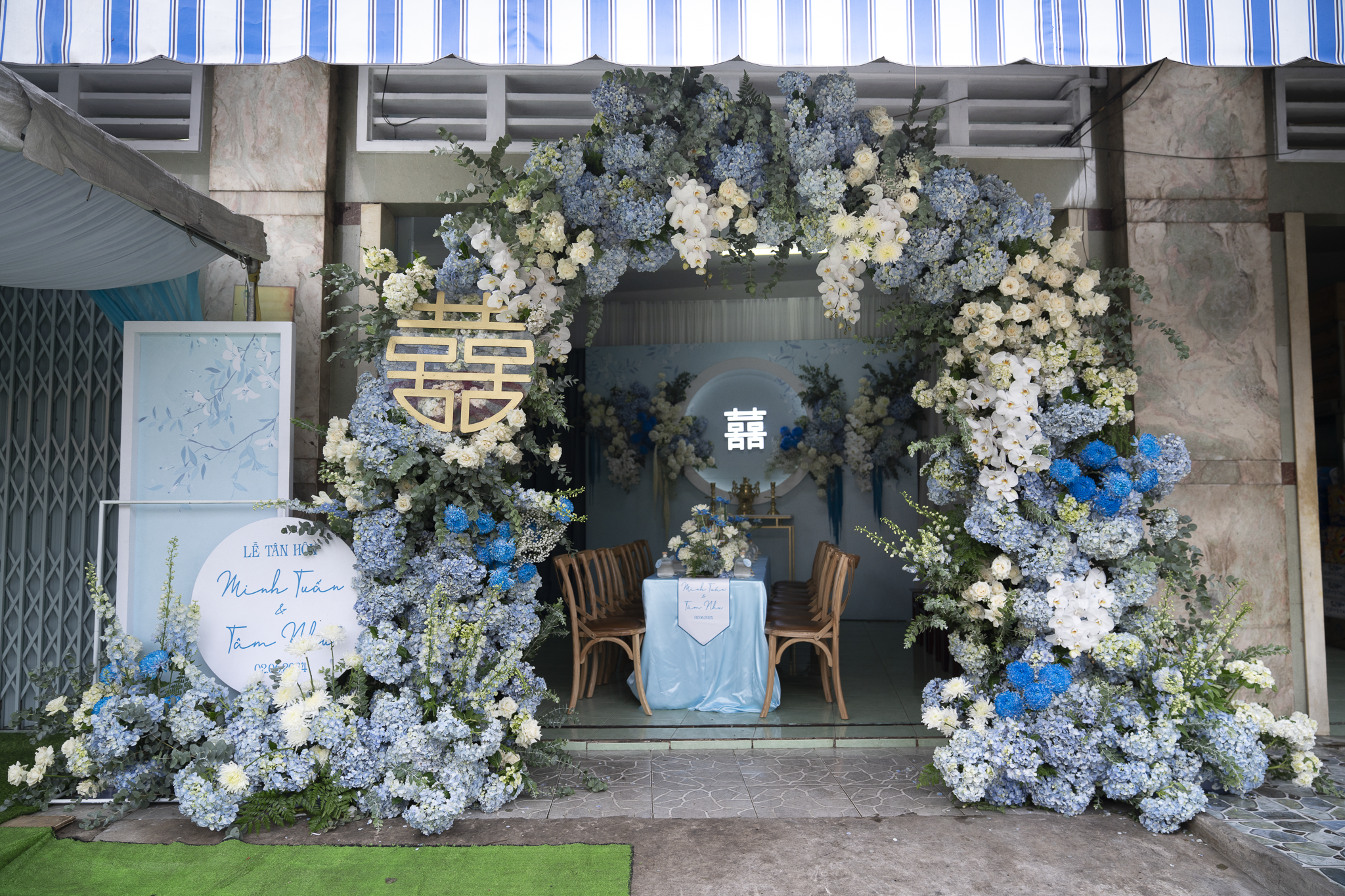 Buổi tiệc của Tuấn và Như được trang trí với tông trắng và xanh dương, tạo không gian tươi mát nhưng sang trọng. Điểm nhấn nổi bật là cổng hoa tươi 100%, được kết từ nhiều loại hoa cao cấp như Hoa Hồng Ecuador, Hoa mẫu đơn, Hoa lan hồ điệp, hoa Cẩm tú cầu, Hoa Tulip, tạo cảm giác tự nhiên và tinh tế.