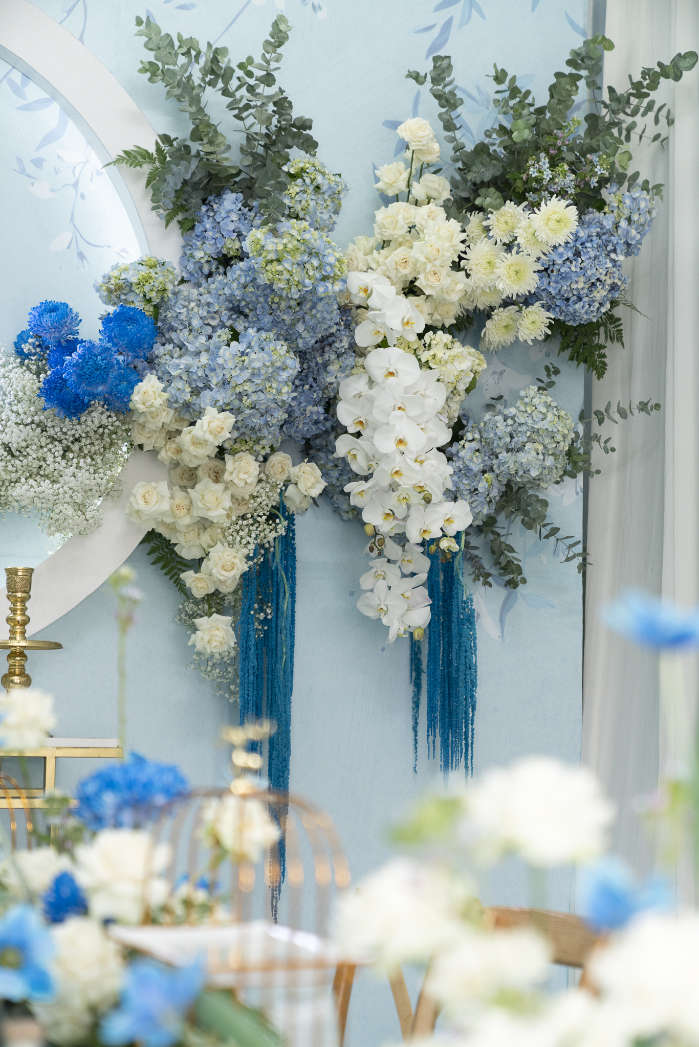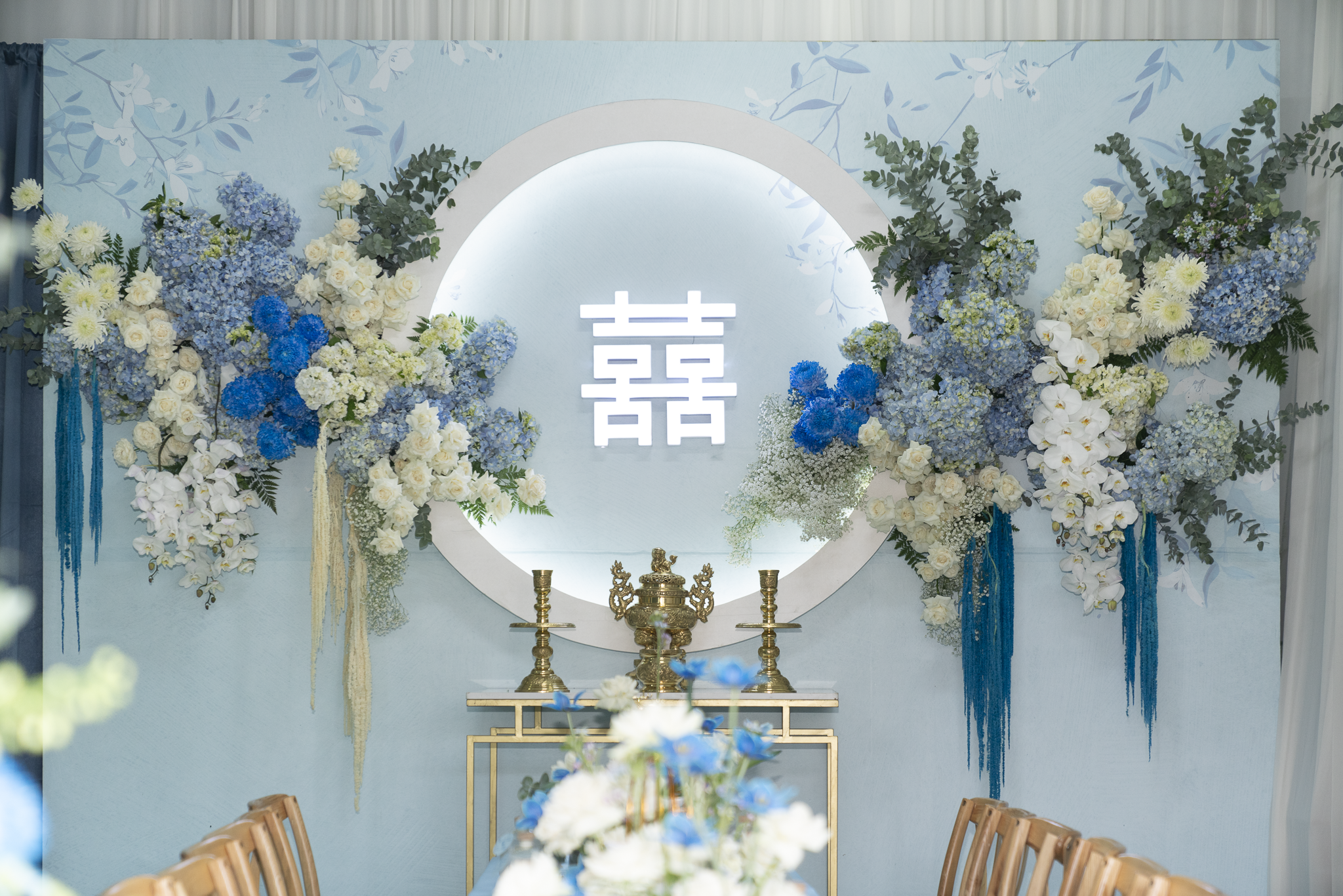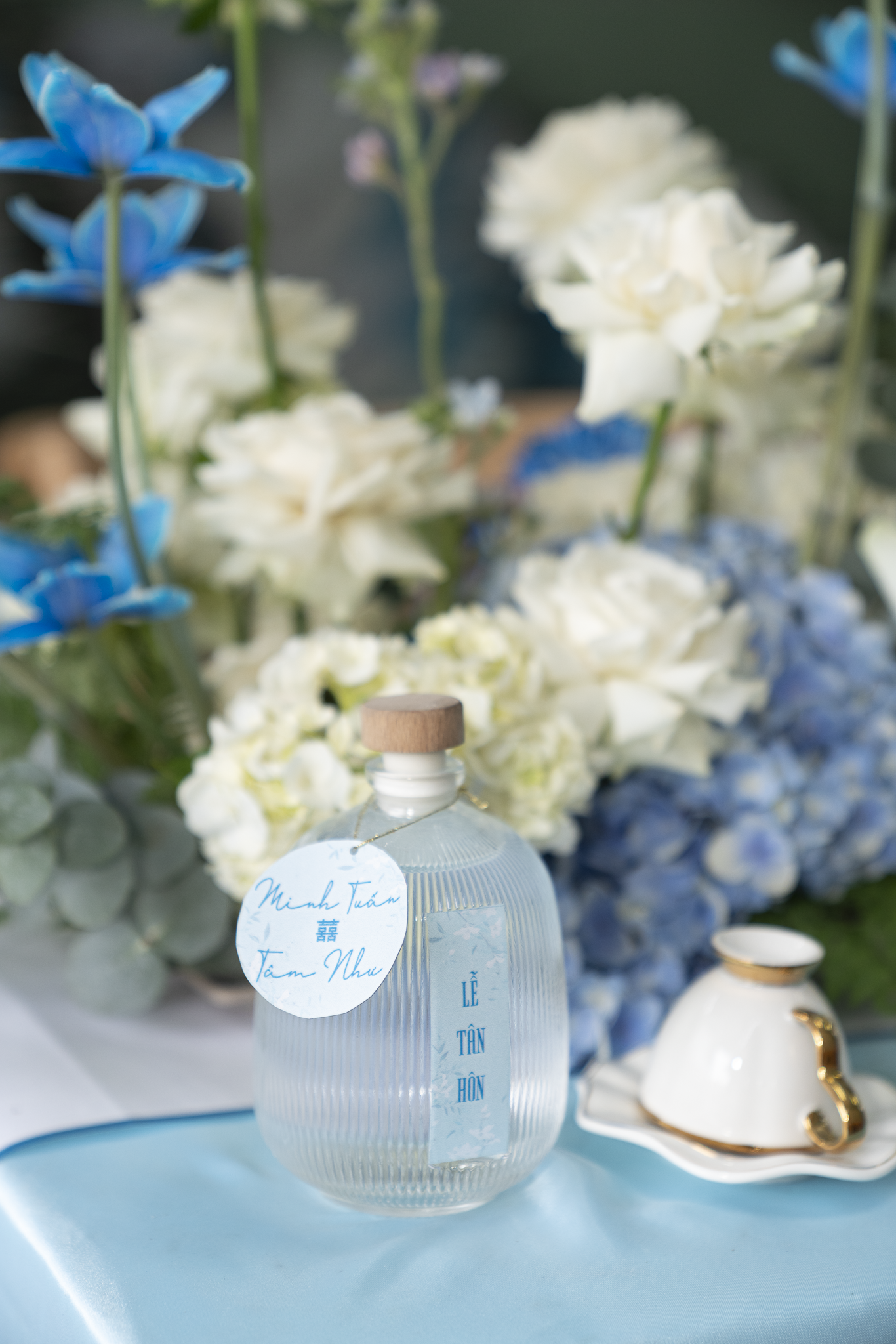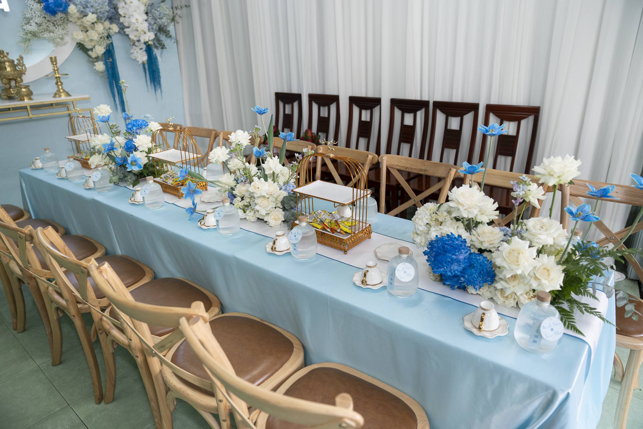 Buổi tiệc của Tuấn và Như được trang trí với tông trắng và xanh dương, tạo không gian tươi mát nhưng sang trọng. Điểm nhấn nổi bật là cổng hoa tươi 100%, được kết từ nhiều loại hoa cao cấp như Hoa Hồng Ecuador, Hoa mẫu đơn, Hoa lan hồ điệp, hoa Cẩm tú cầu, Hoa Tulip, tạo cảm giác tự nhiên và tinh tế.
