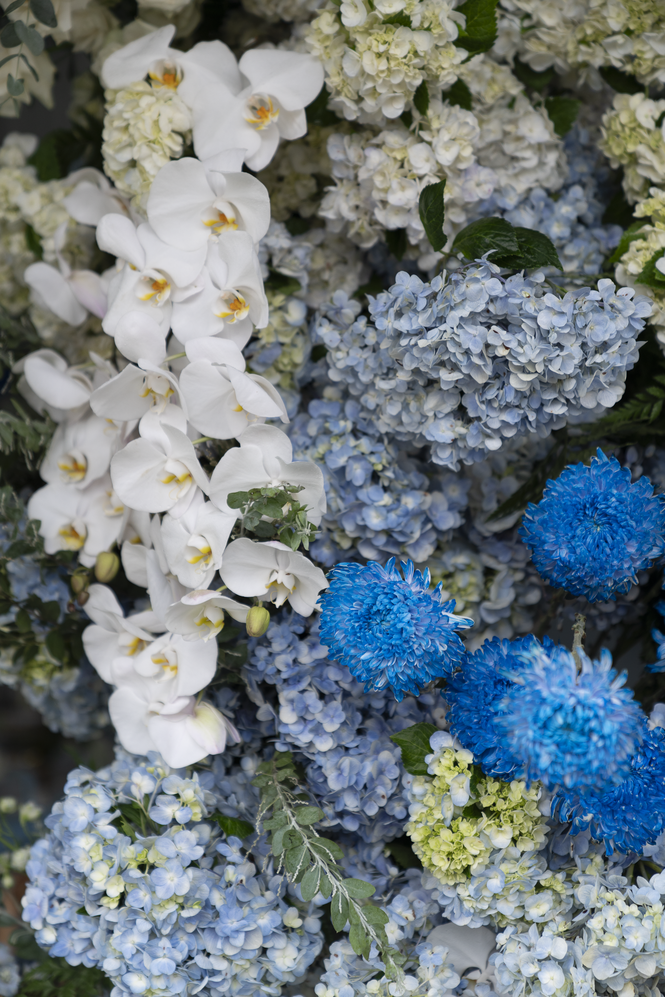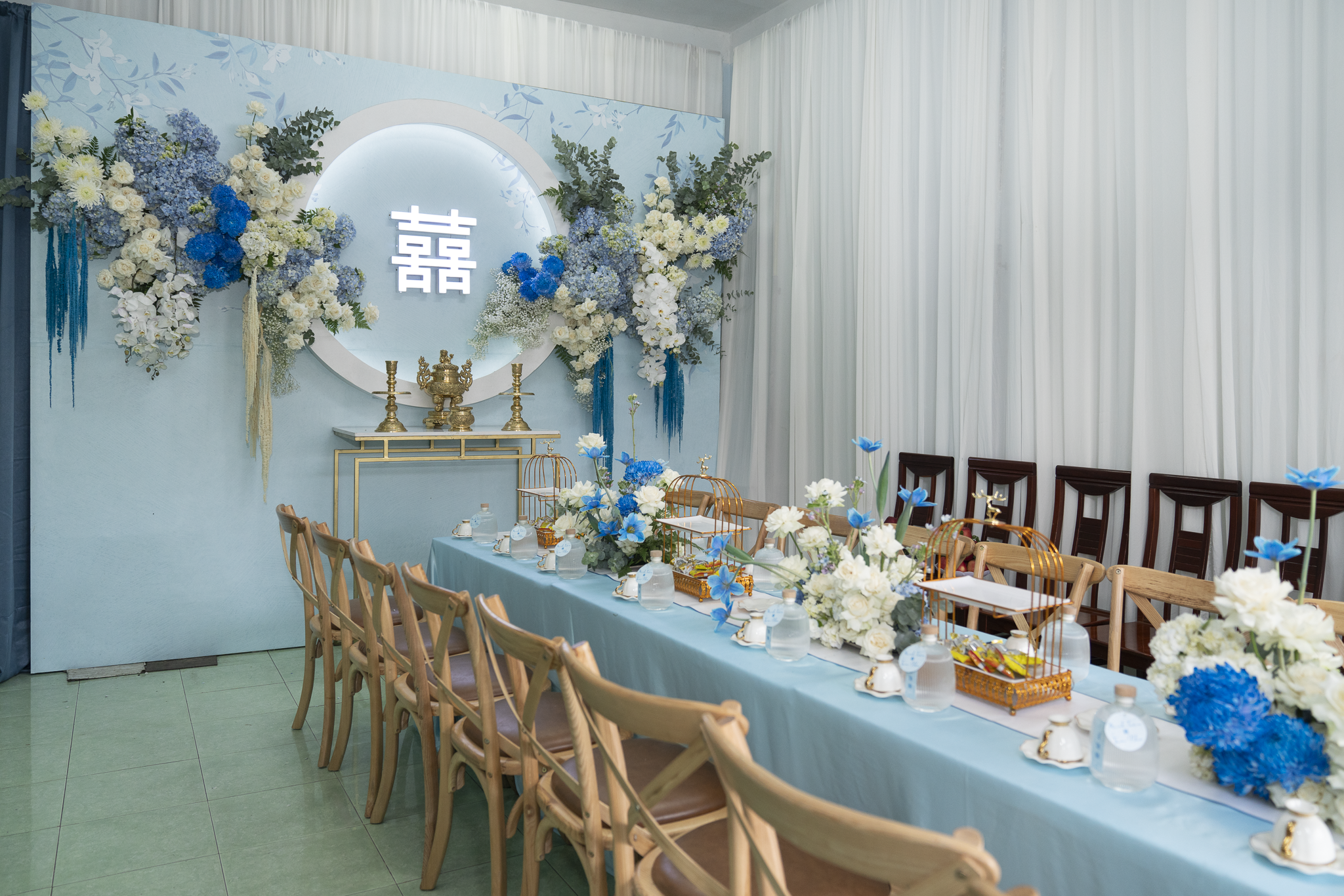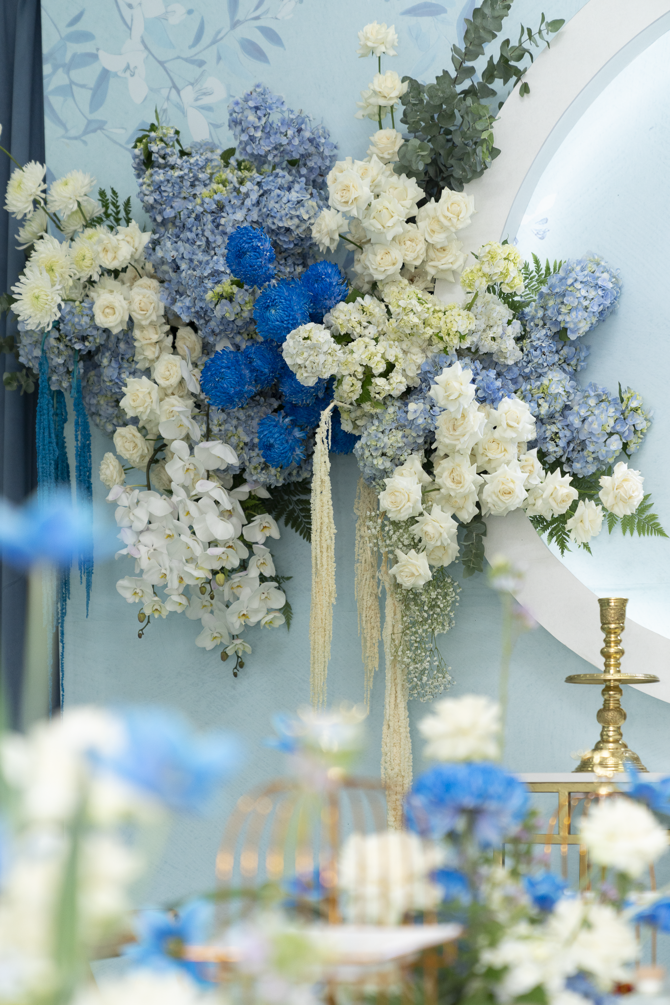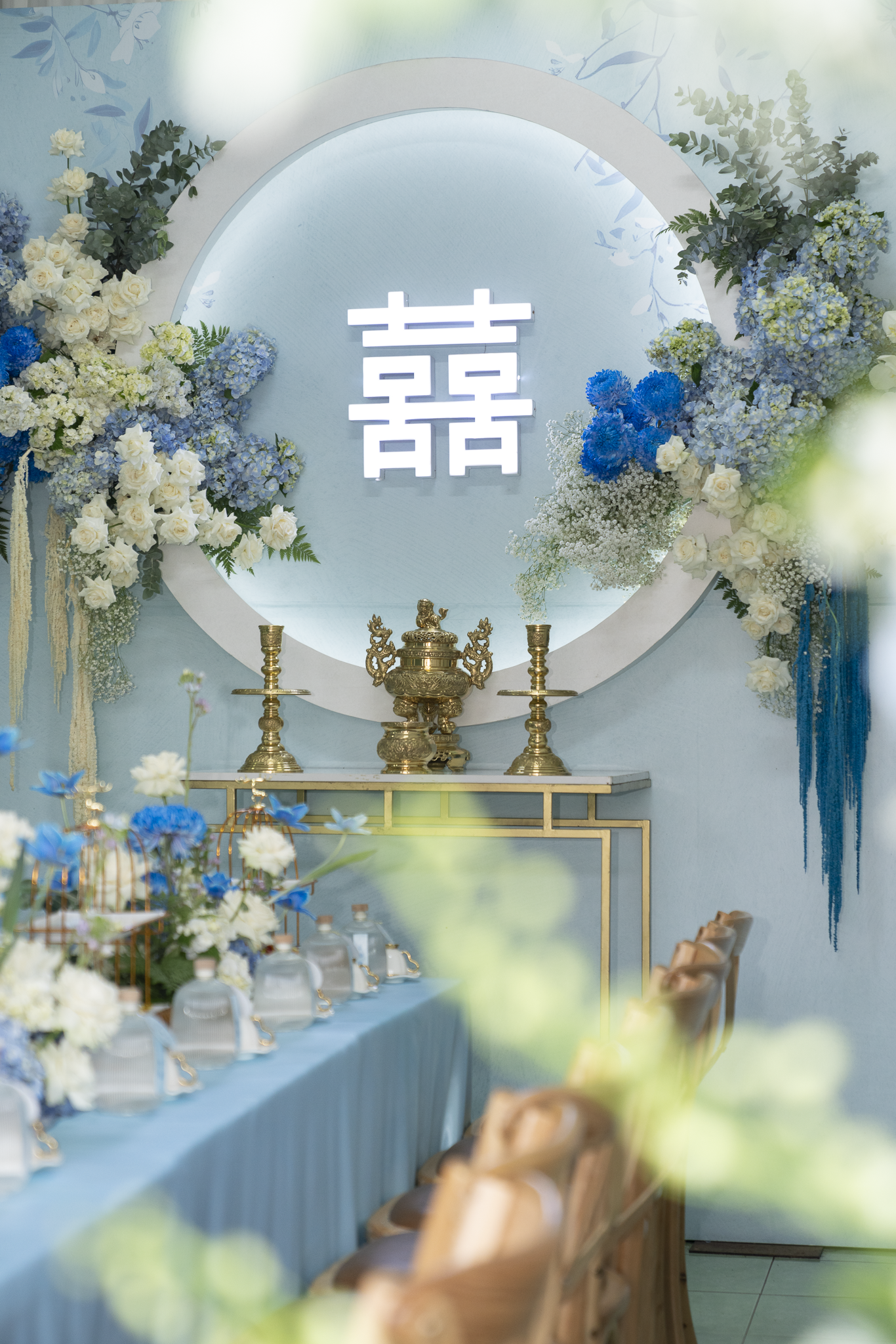 Buổi tiệc của Tuấn và Như được trang trí với tông trắng và xanh dương, tạo không gian tươi mát nhưng sang trọng. Điểm nhấn nổi bật là cổng hoa tươi 100%, được kết từ nhiều loại hoa cao cấp như Hoa Hồng Ecuador, Hoa mẫu đơn, Hoa lan hồ điệp, hoa Cẩm tú cầu, Hoa Tulip, tạo cảm giác tự nhiên và tinh tế.