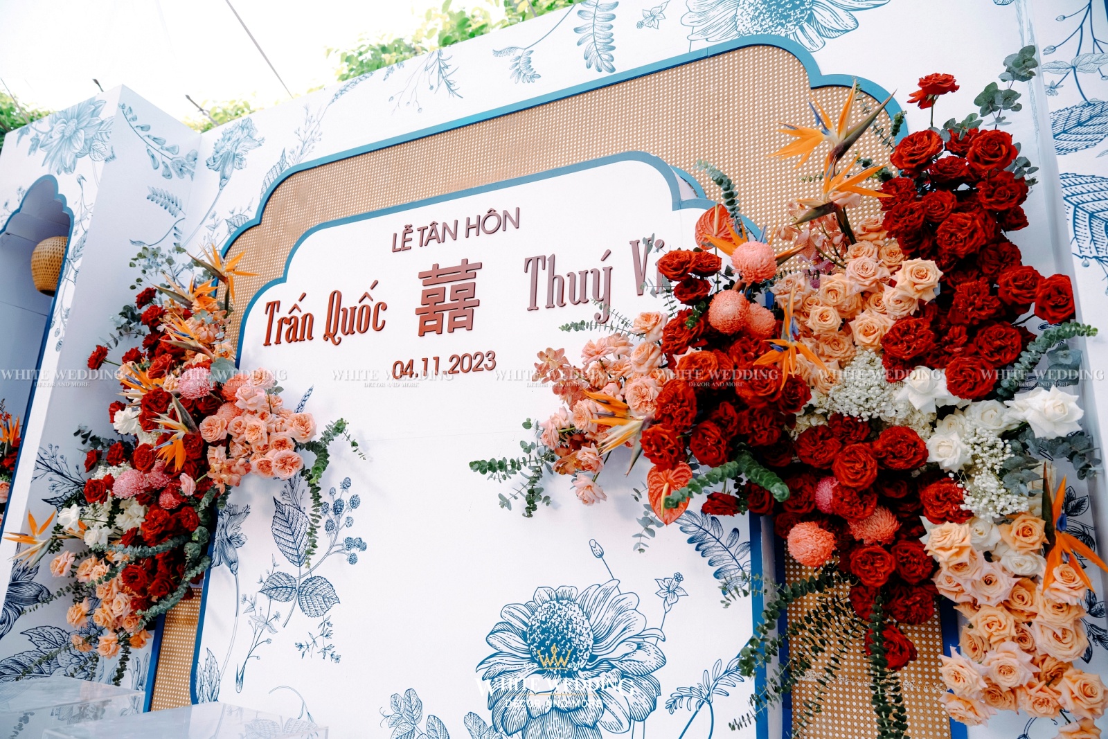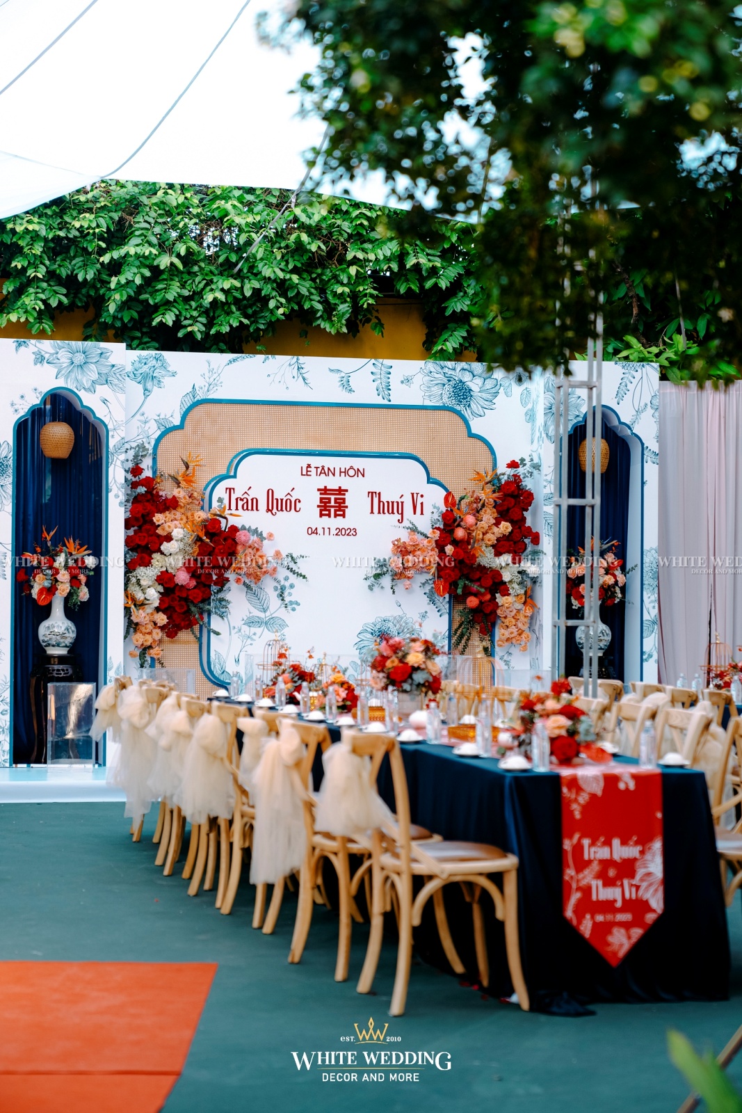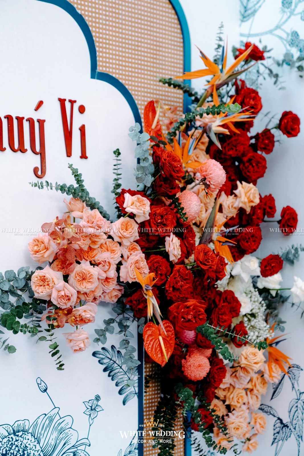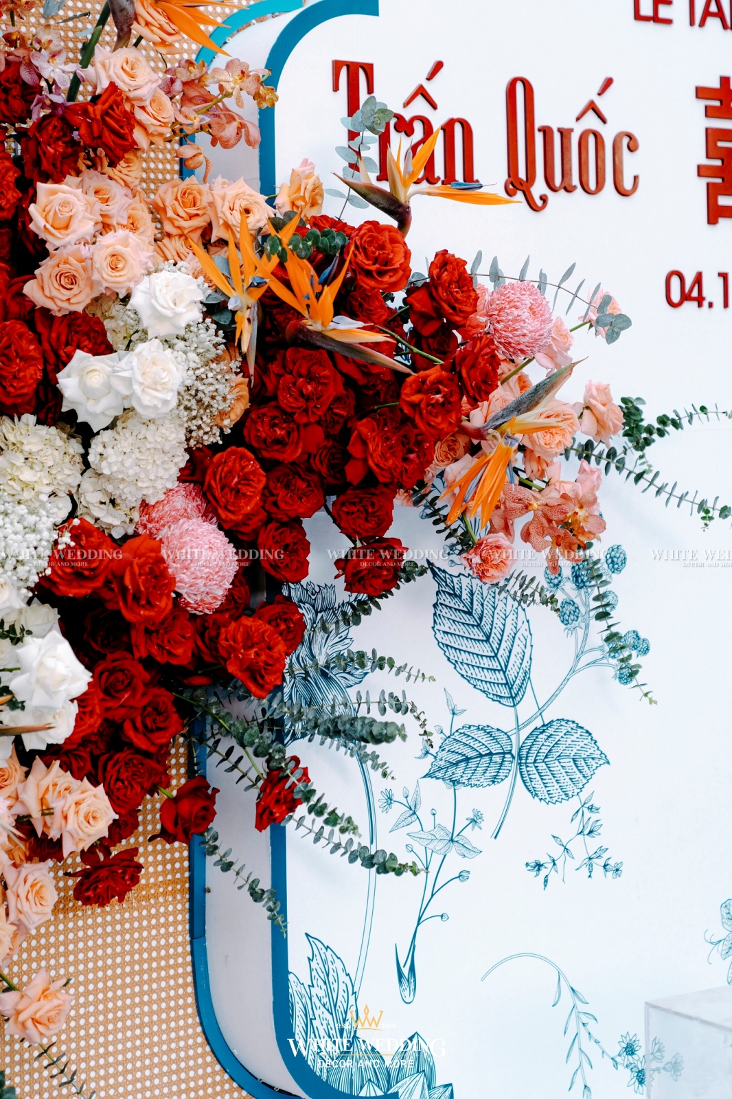 Lễ tân hôn được thiết kế trang trí theo phong cách cổ điển bắt mắt, sử dụng kết hợp Hoa Tươi & Hoạ Lụa cao cấp.
