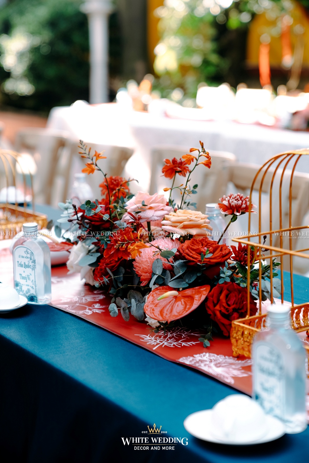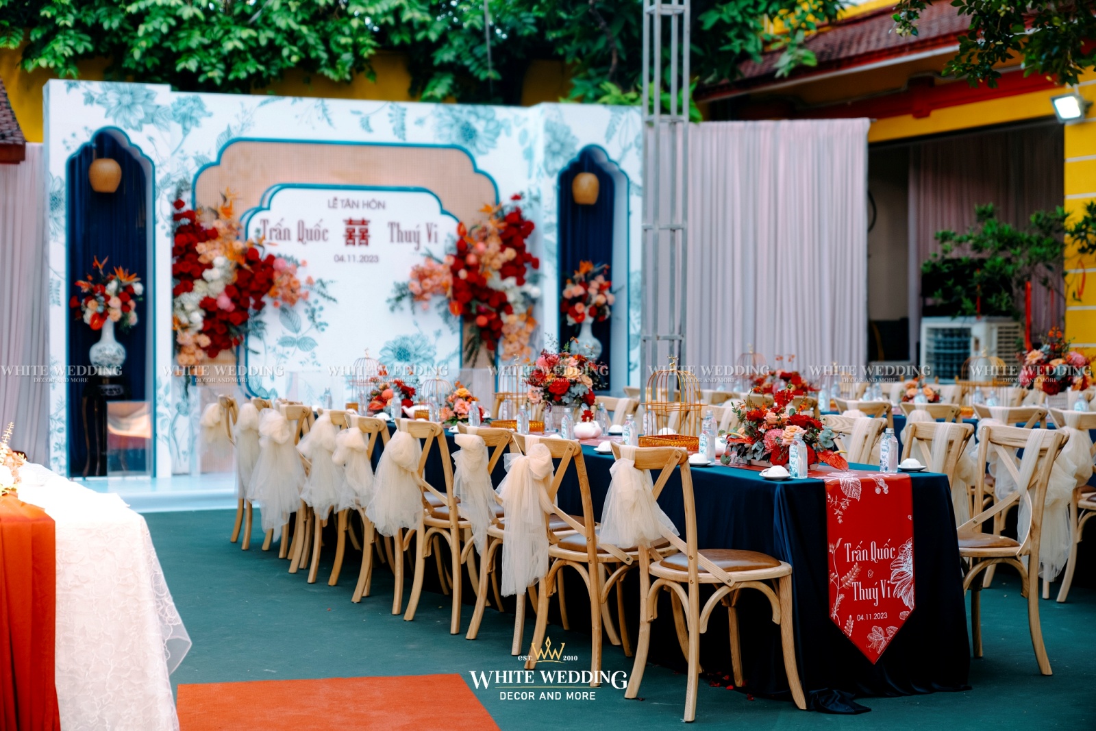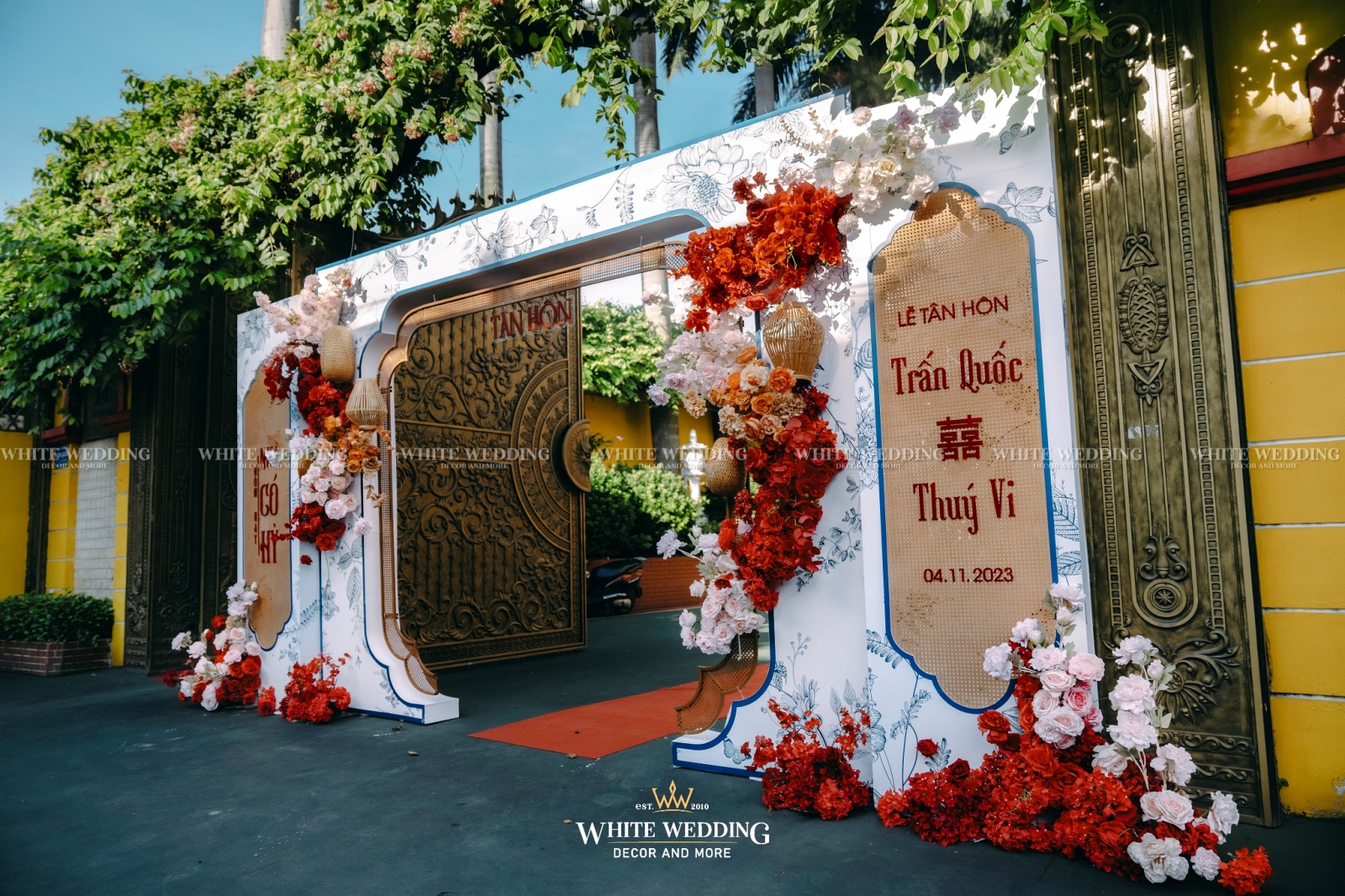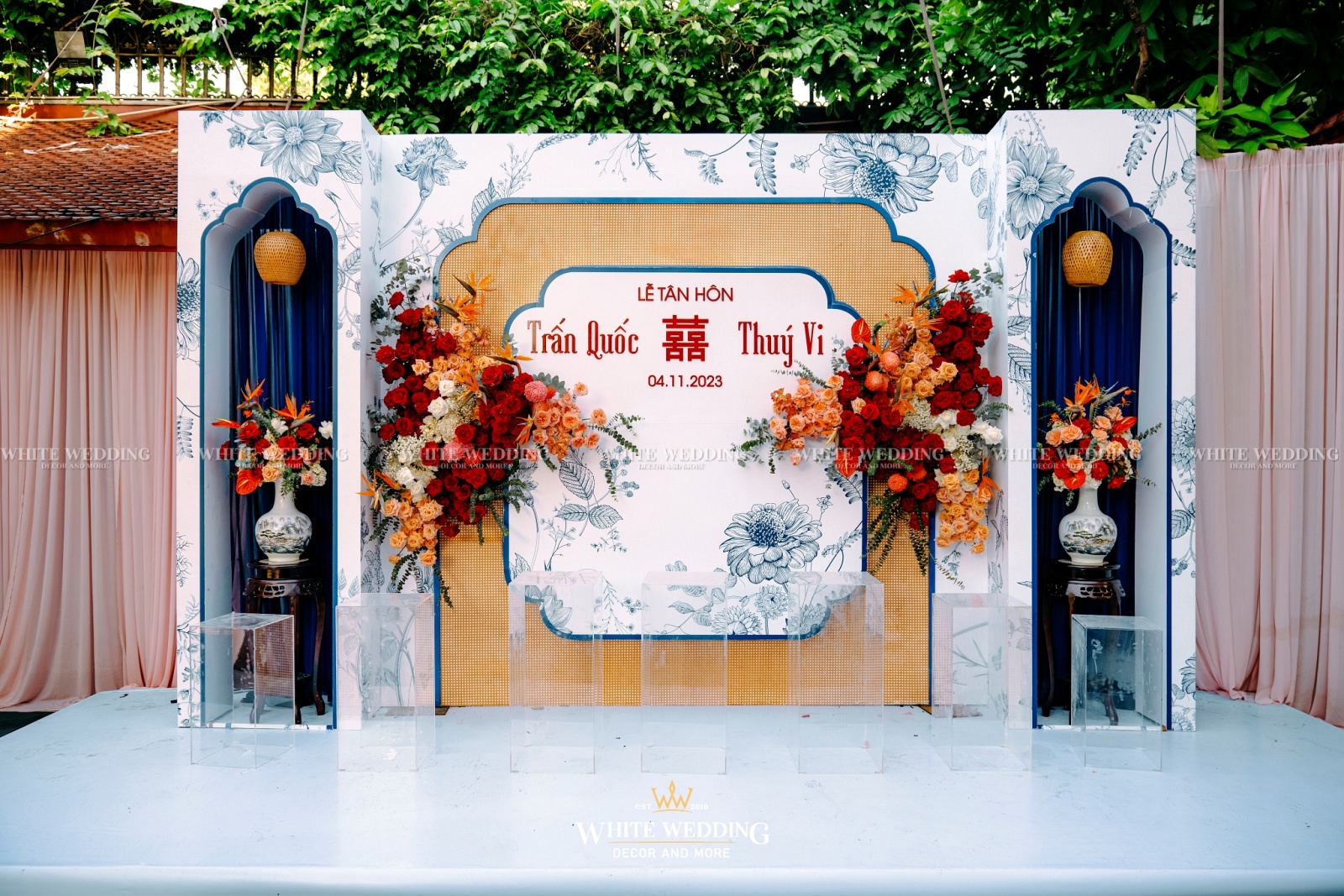 Lễ tân hôn được thiết kế trang trí theo phong cách cổ điển bắt mắt, sử dụng kết hợp Hoa Tươi & Hoạ Lụa cao cấp.