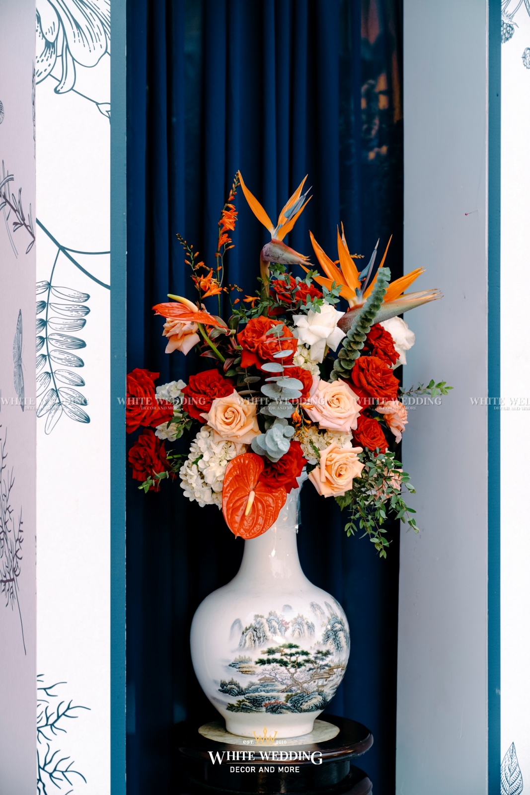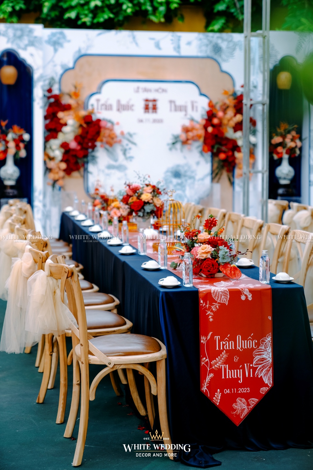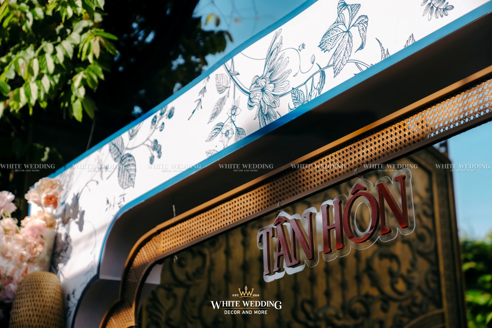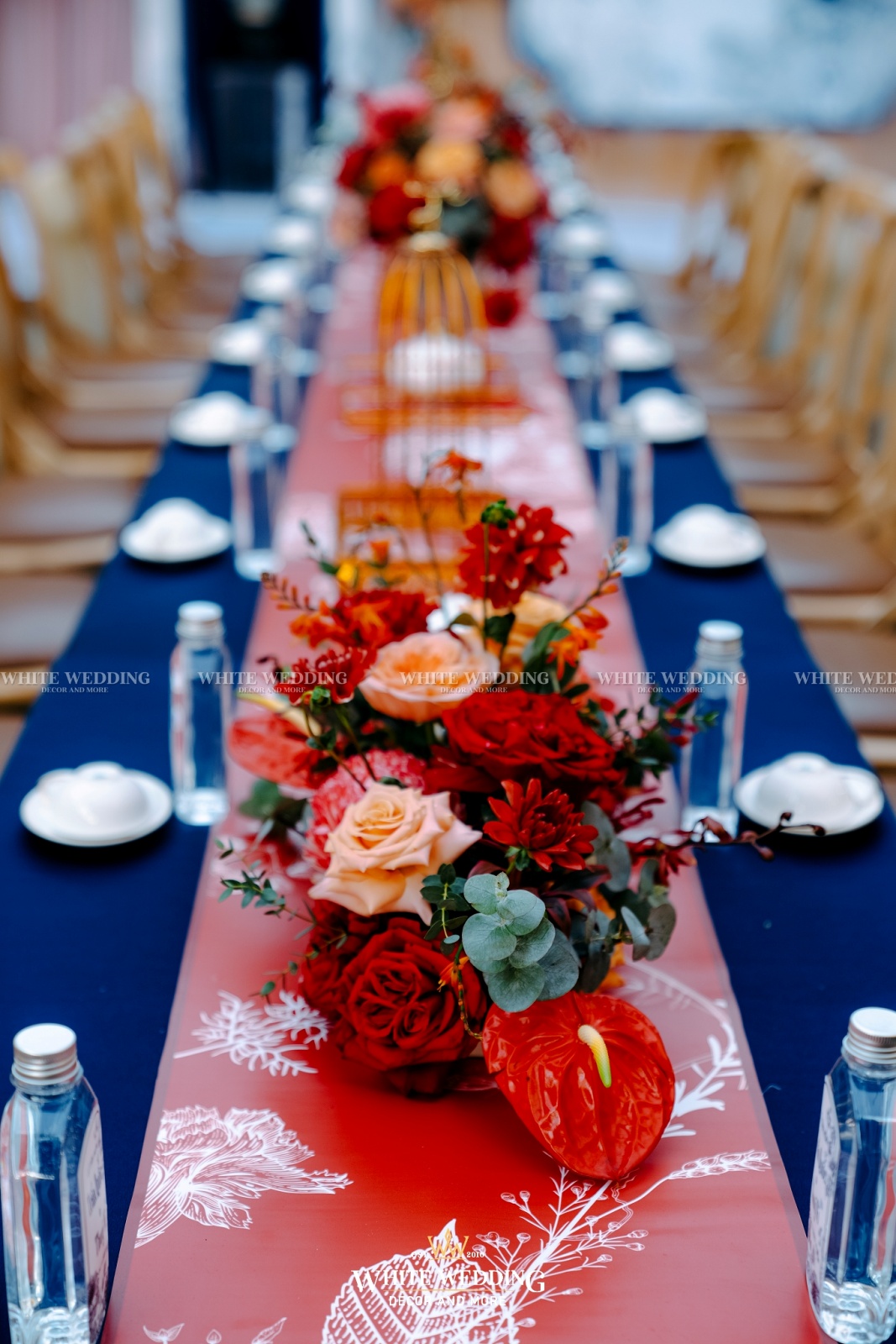 Lễ tân hôn được thiết kế trang trí theo phong cách cổ điển bắt mắt, sử dụng kết hợp Hoa Tươi & Hoạ Lụa cao cấp.