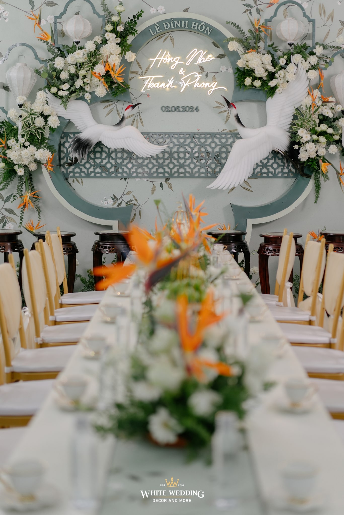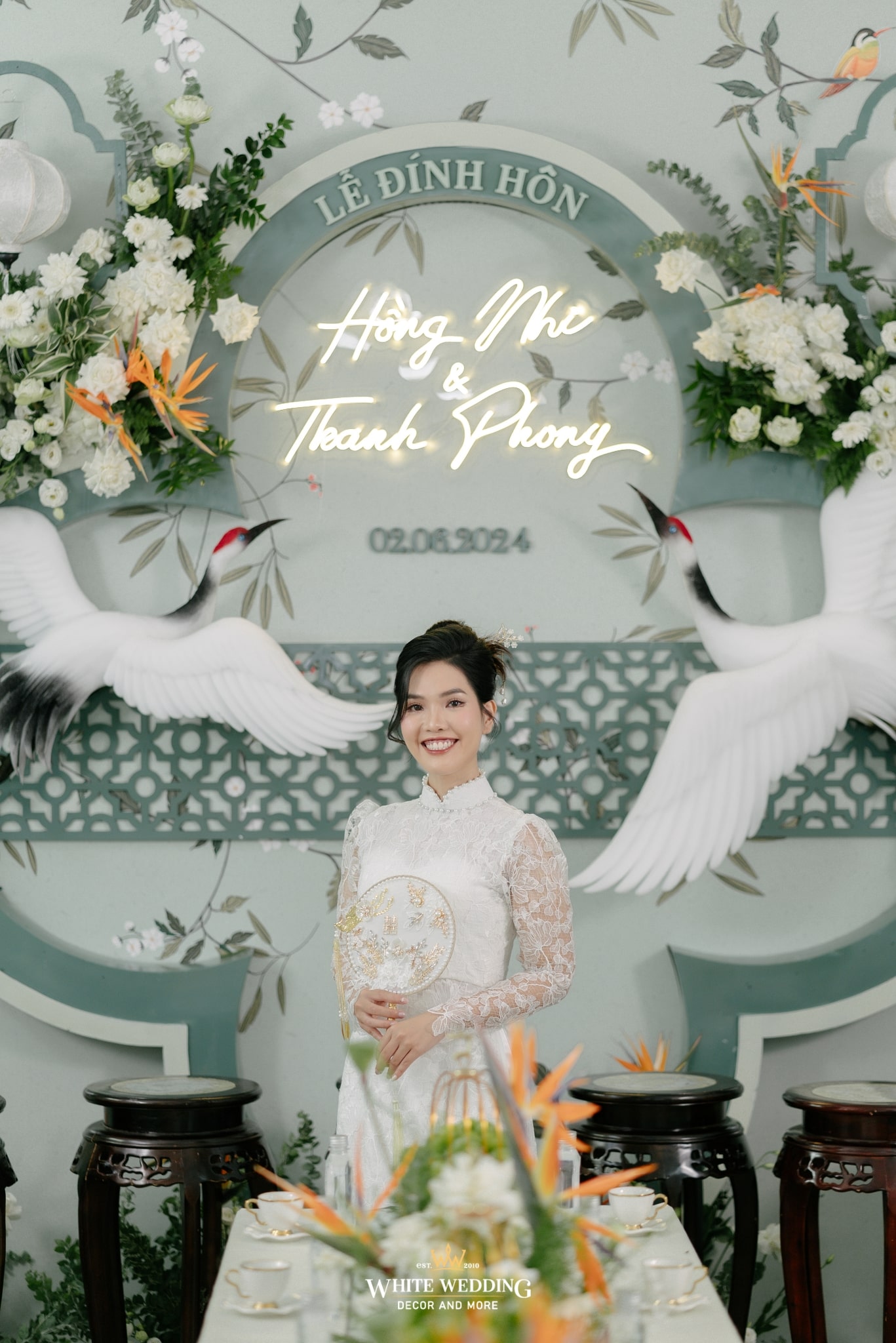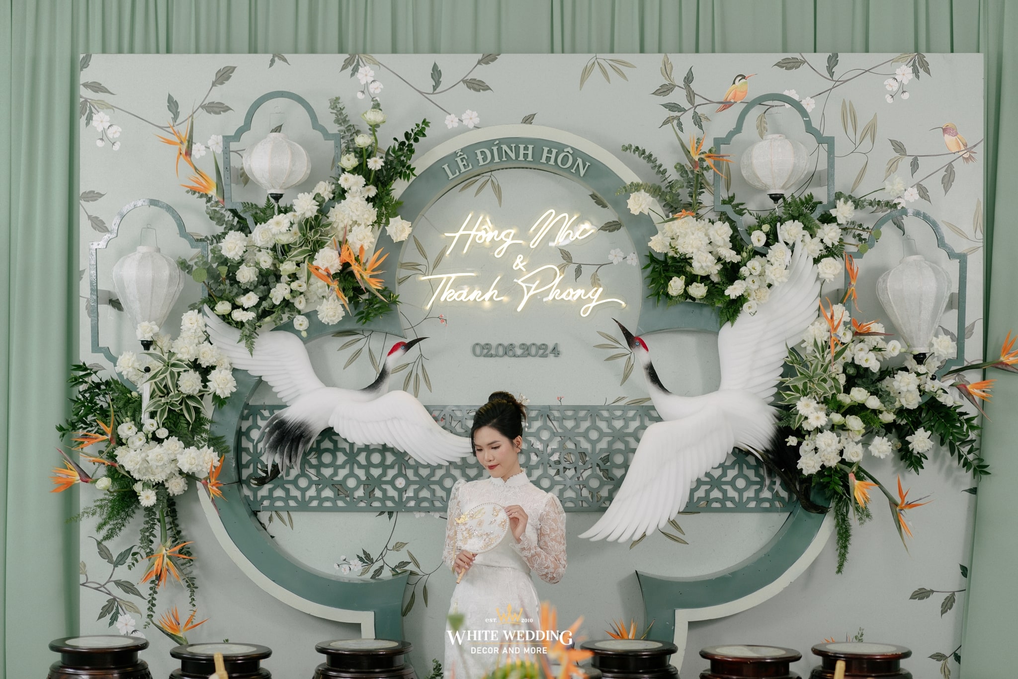 Không gian đính hôn của Nhi và Phong mang hơi thở Indochine cách tân, nơi cổ điển và hiện đại giao thoa trong từng đường nét. Màu xanh ngọc chủ đạo nhẹ nhàng, nền nã như phủ một lớp sương mỏng lên khung cảnh, tạo nên sự thanh thoát và sang trọng ngay từ cái nhìn đầu tiên.