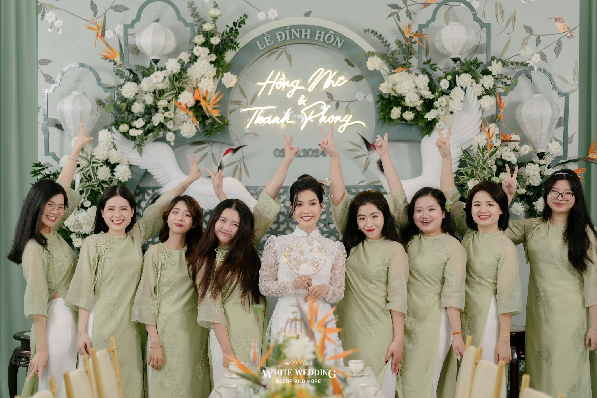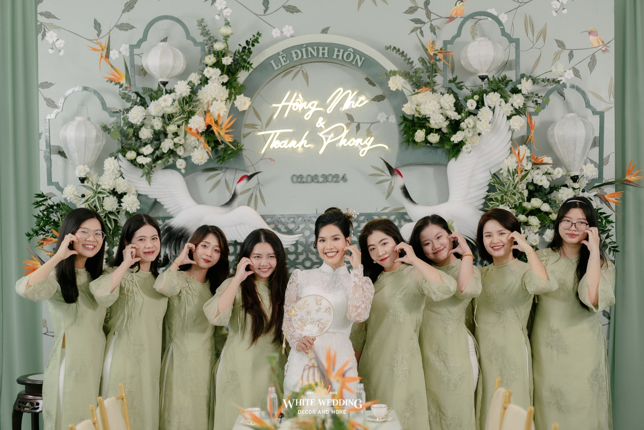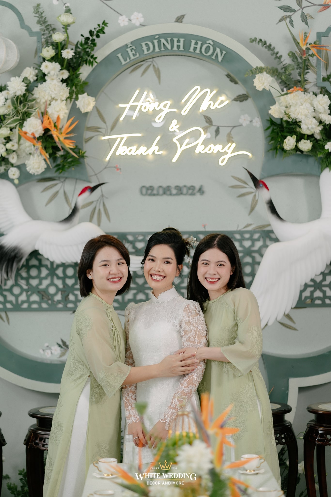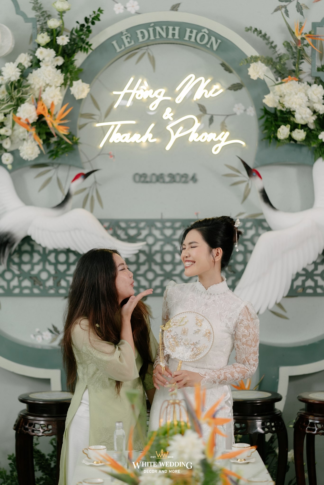 Không gian đính hôn của Nhi và Phong mang hơi thở Indochine cách tân, nơi cổ điển và hiện đại giao thoa trong từng đường nét. Màu xanh ngọc chủ đạo nhẹ nhàng, nền nã như phủ một lớp sương mỏng lên khung cảnh, tạo nên sự thanh thoát và sang trọng ngay từ cái nhìn đầu tiên.