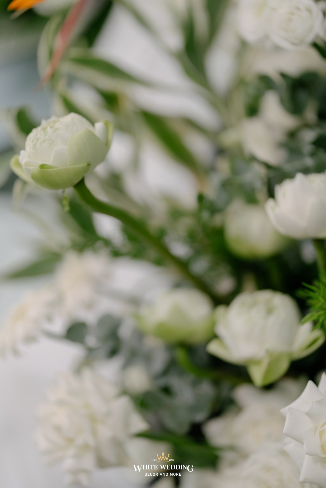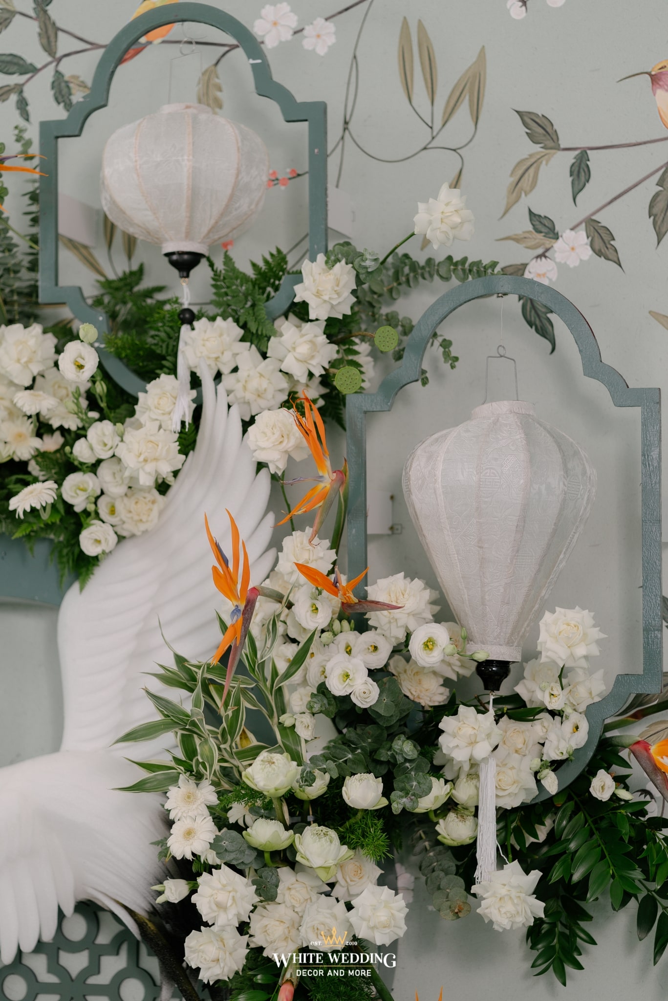 Chi tiết hoa được sắp đặt khéo léo: Hoa thiên điểu với sắc cam rực rỡ xen lẫn hồng trắng kết hợp với những chiếc đèn lồng giấy trắng ẩn mình giữa vòm hoa, gợi nhắc đến vẻ đẹp xưa cũ của Hội An hay Hà Nội những thập niên đầu thế kỷ.