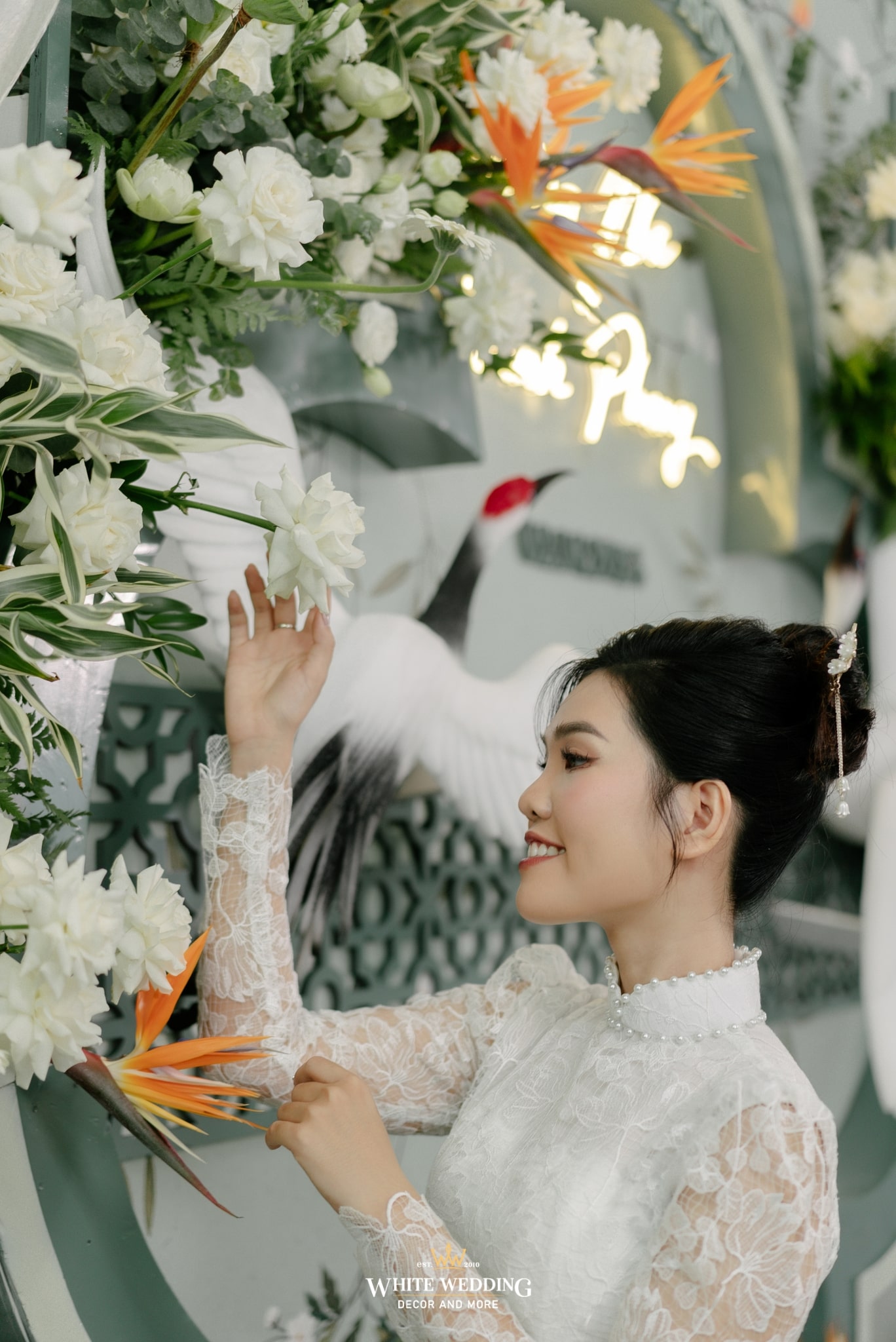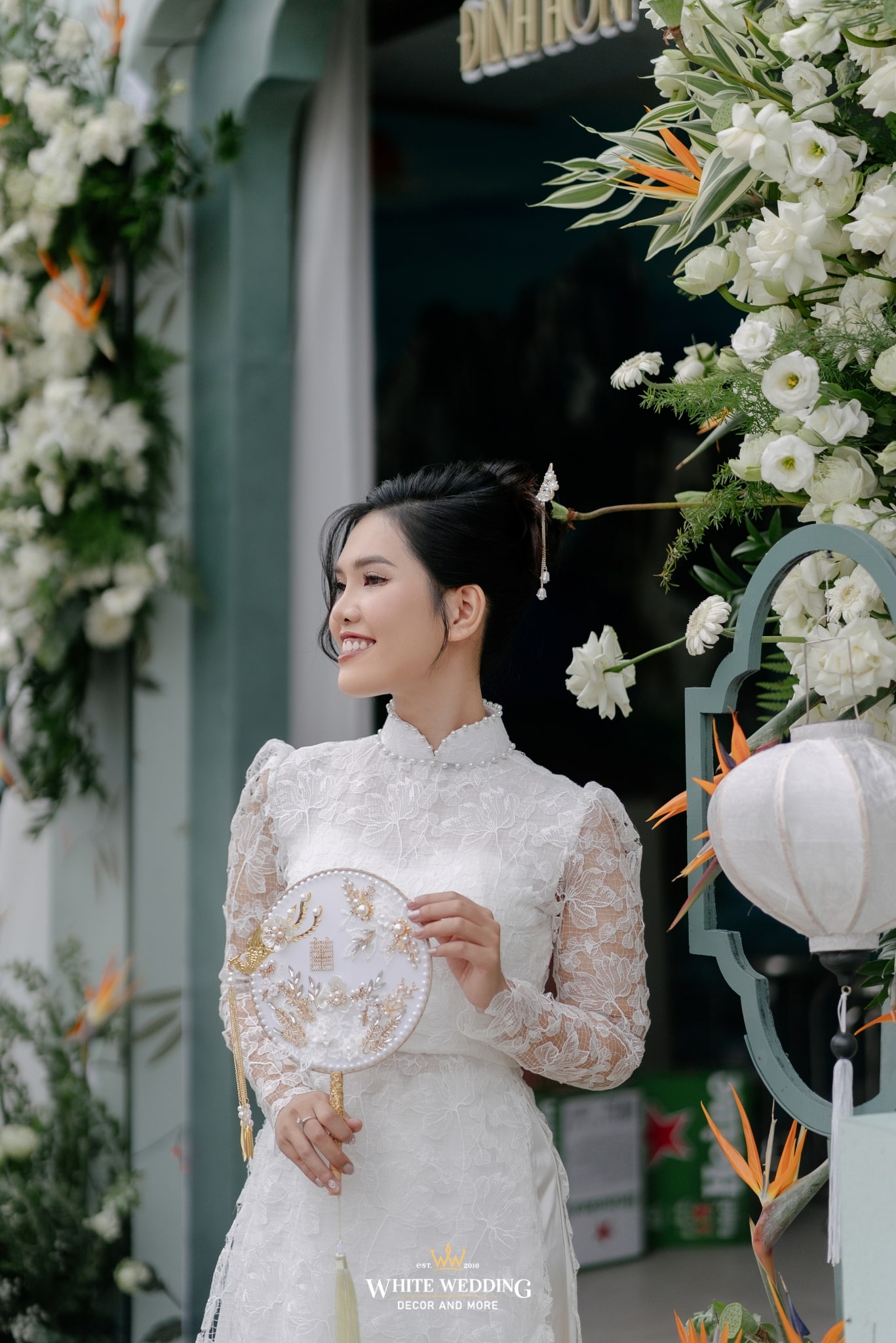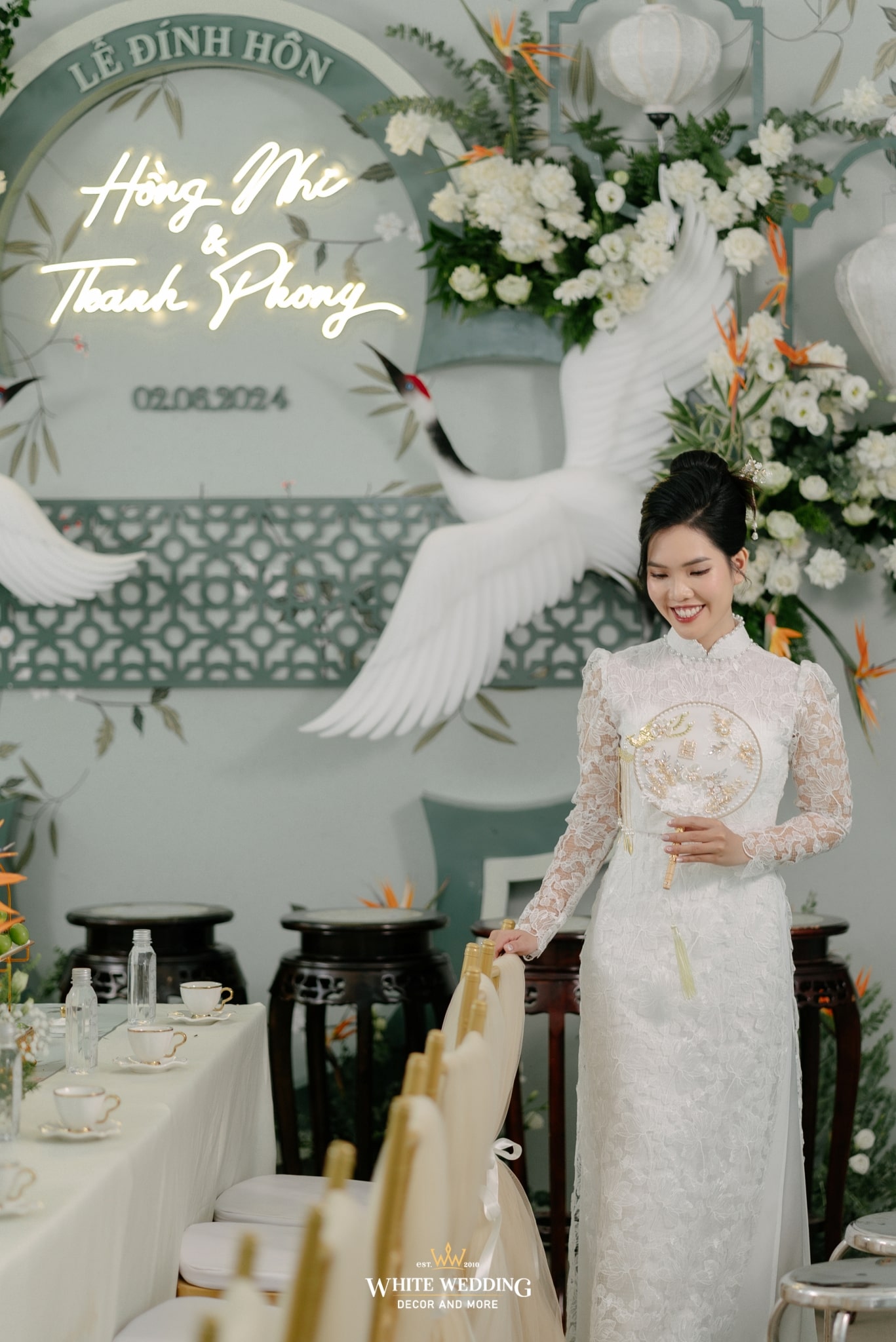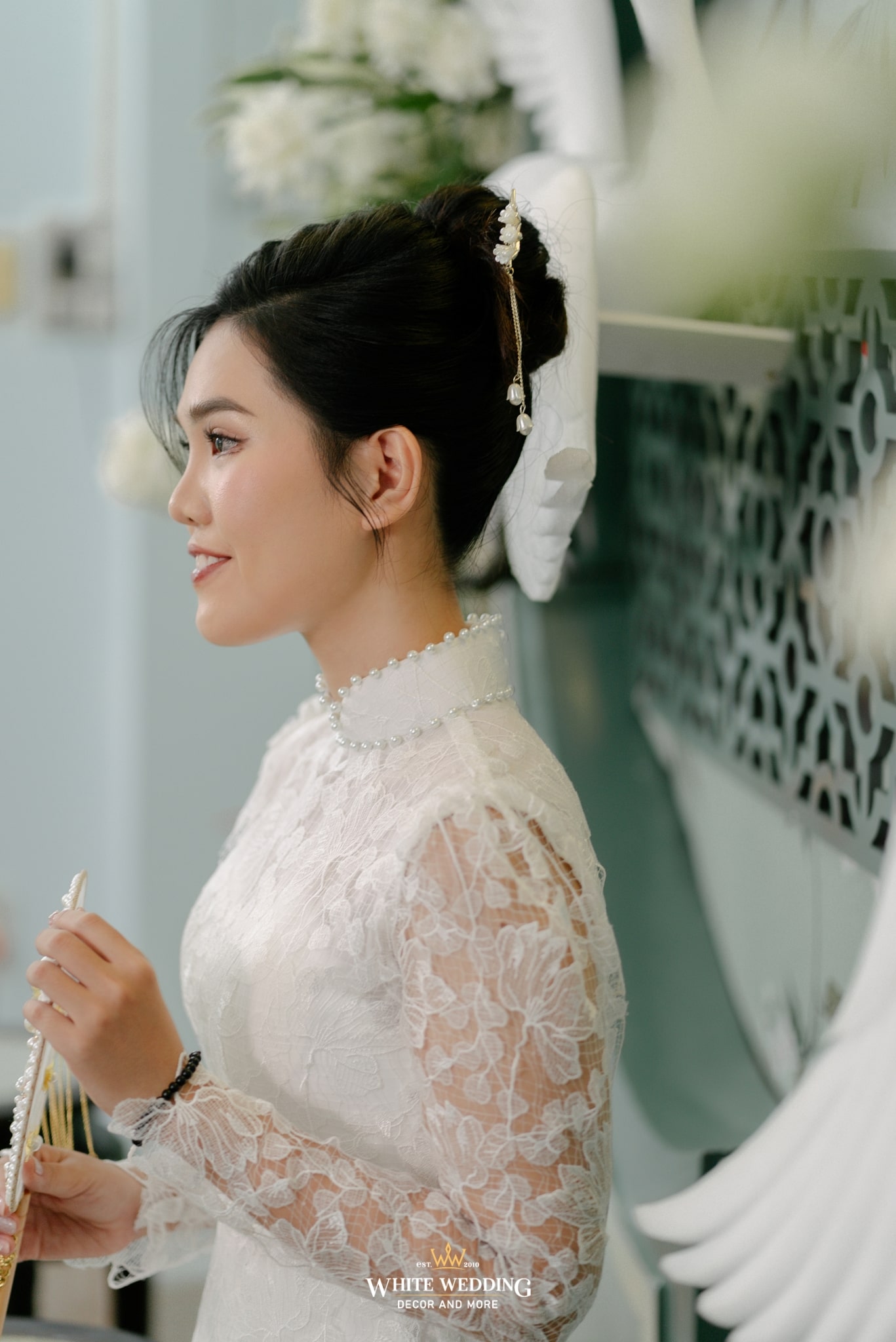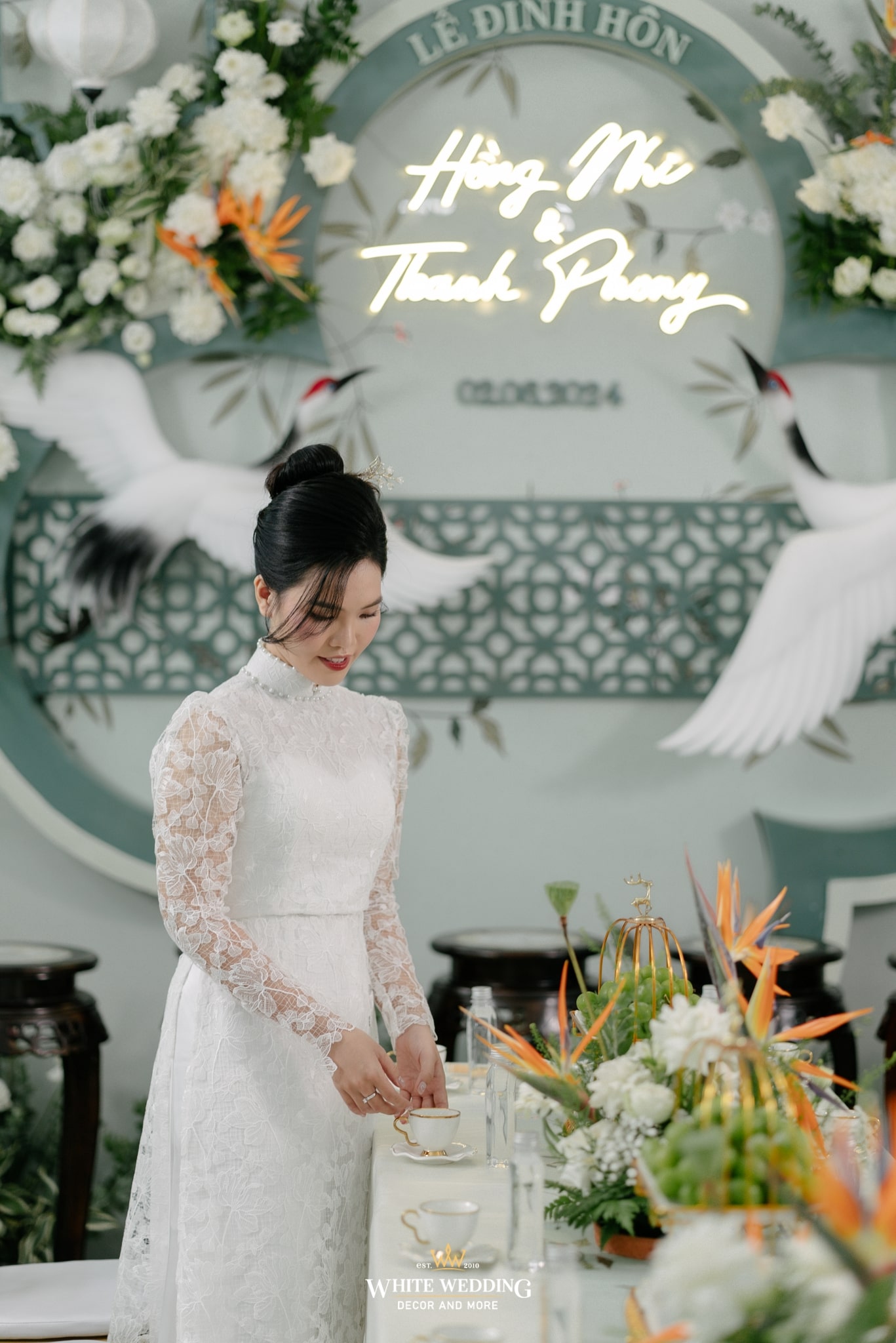 Tất cả hoà quyện, làm nền cho cô dâu trong tà áo dài ren trắng cổ điển — thuần khiết, kiêu sa, như bước ra từ một thước phim xưa.