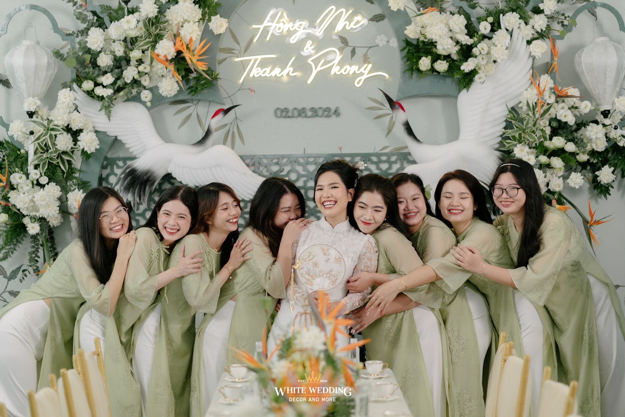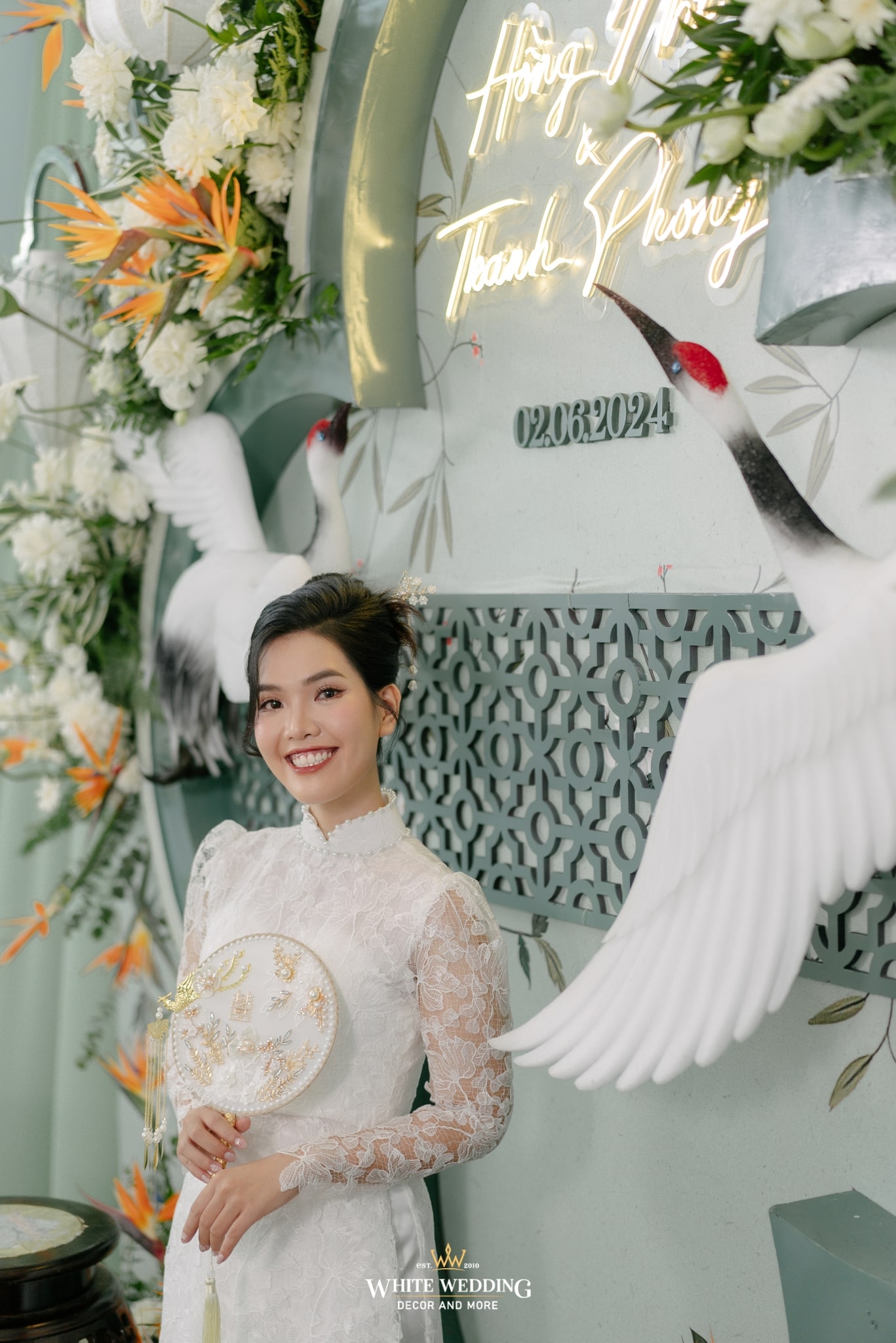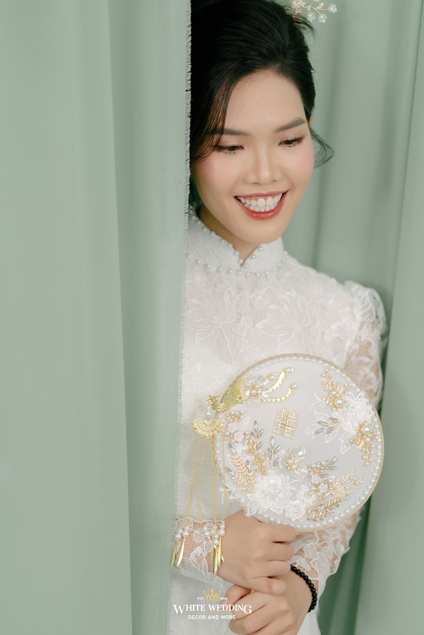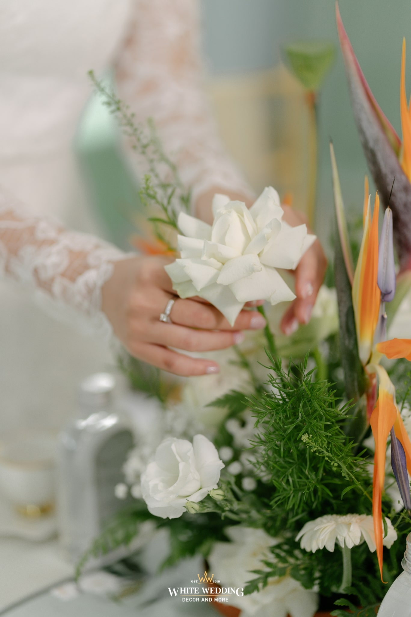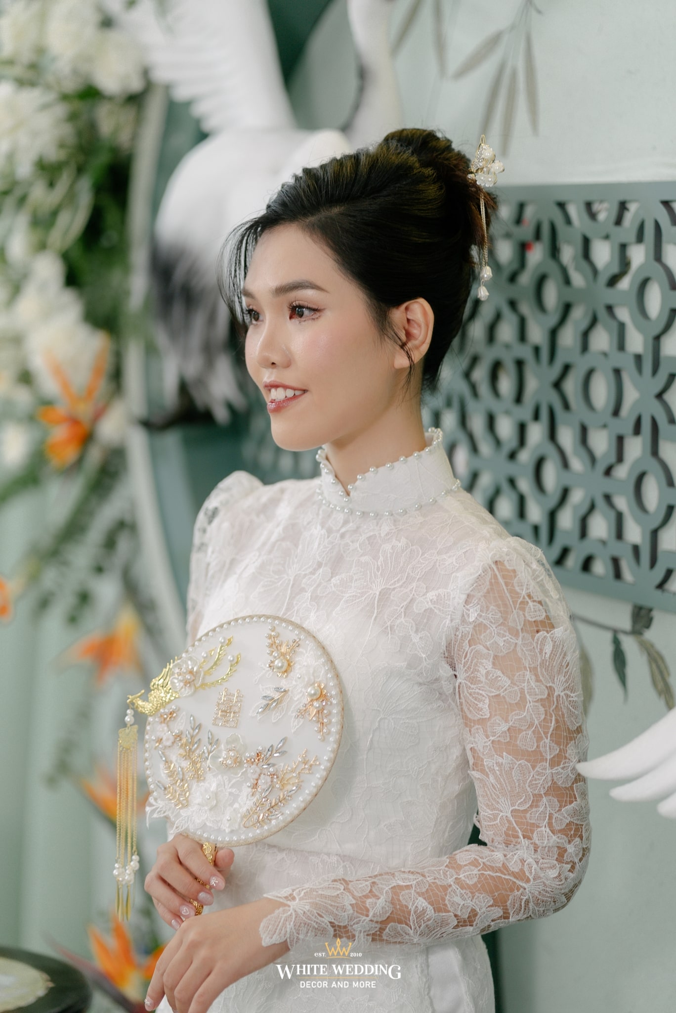 Tất cả hoà quyện, làm nền cho cô dâu trong tà áo dài ren trắng cổ điển — thuần khiết, kiêu sa, như bước ra từ một thước phim xưa.