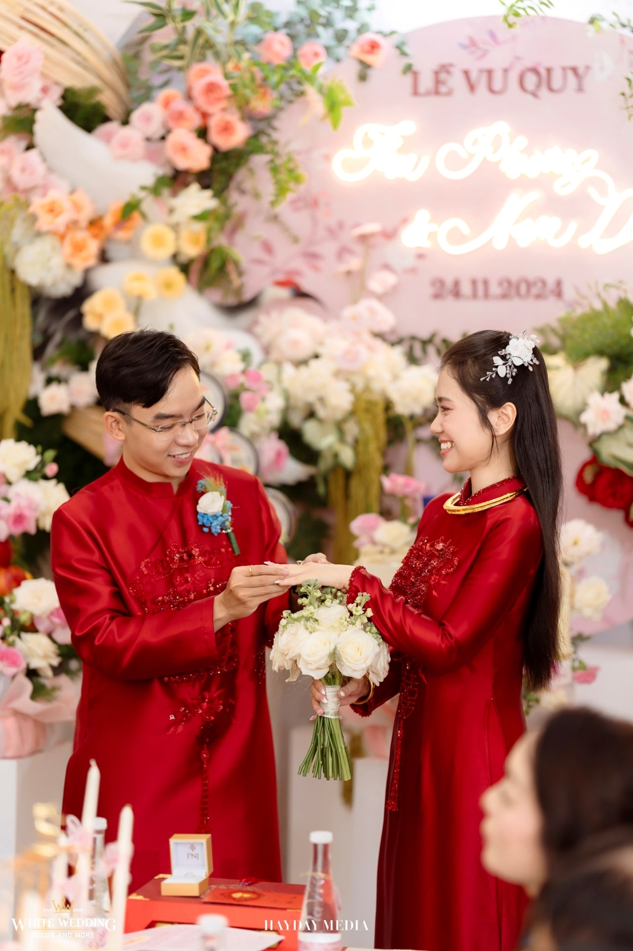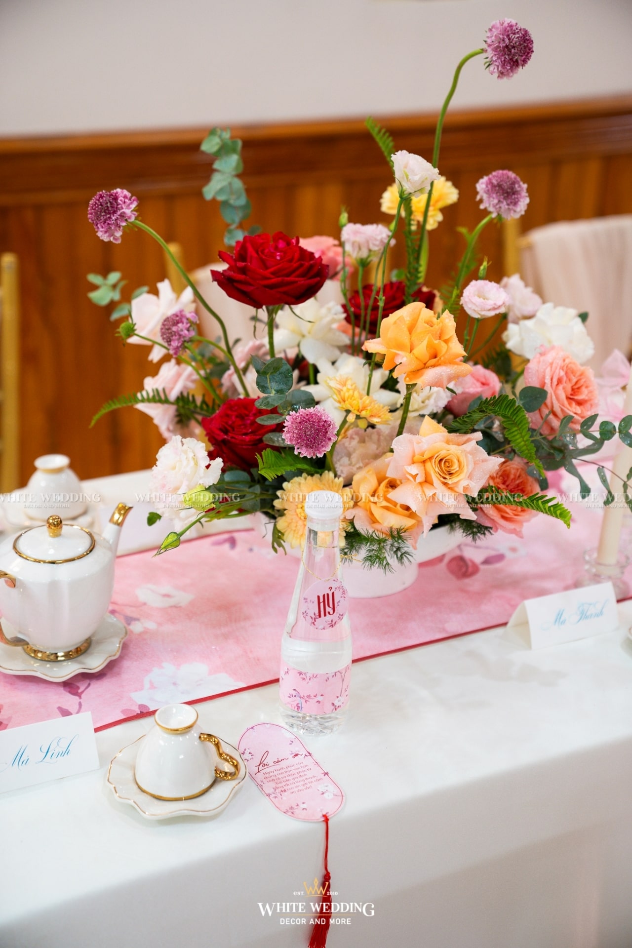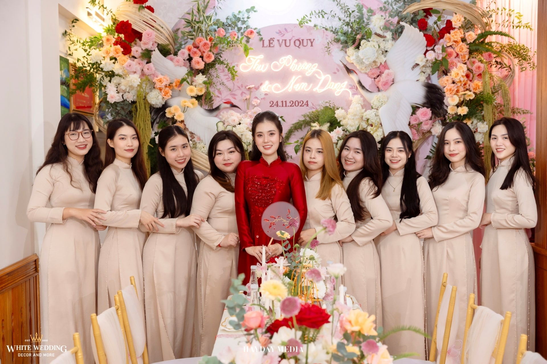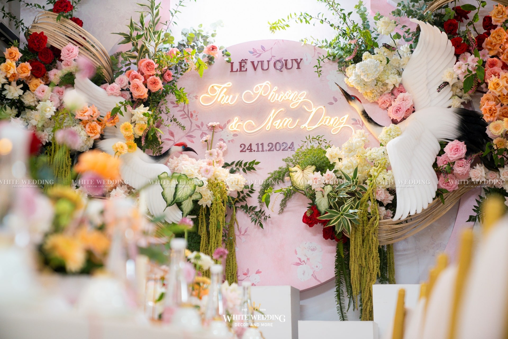 Từ cánh cổng ngập sắc hồng tươi tắn, đến không gian bàn tiệc ấm cúng, tất cả hòa quyện trong một bản tình ca mang tên hạnh phúc.