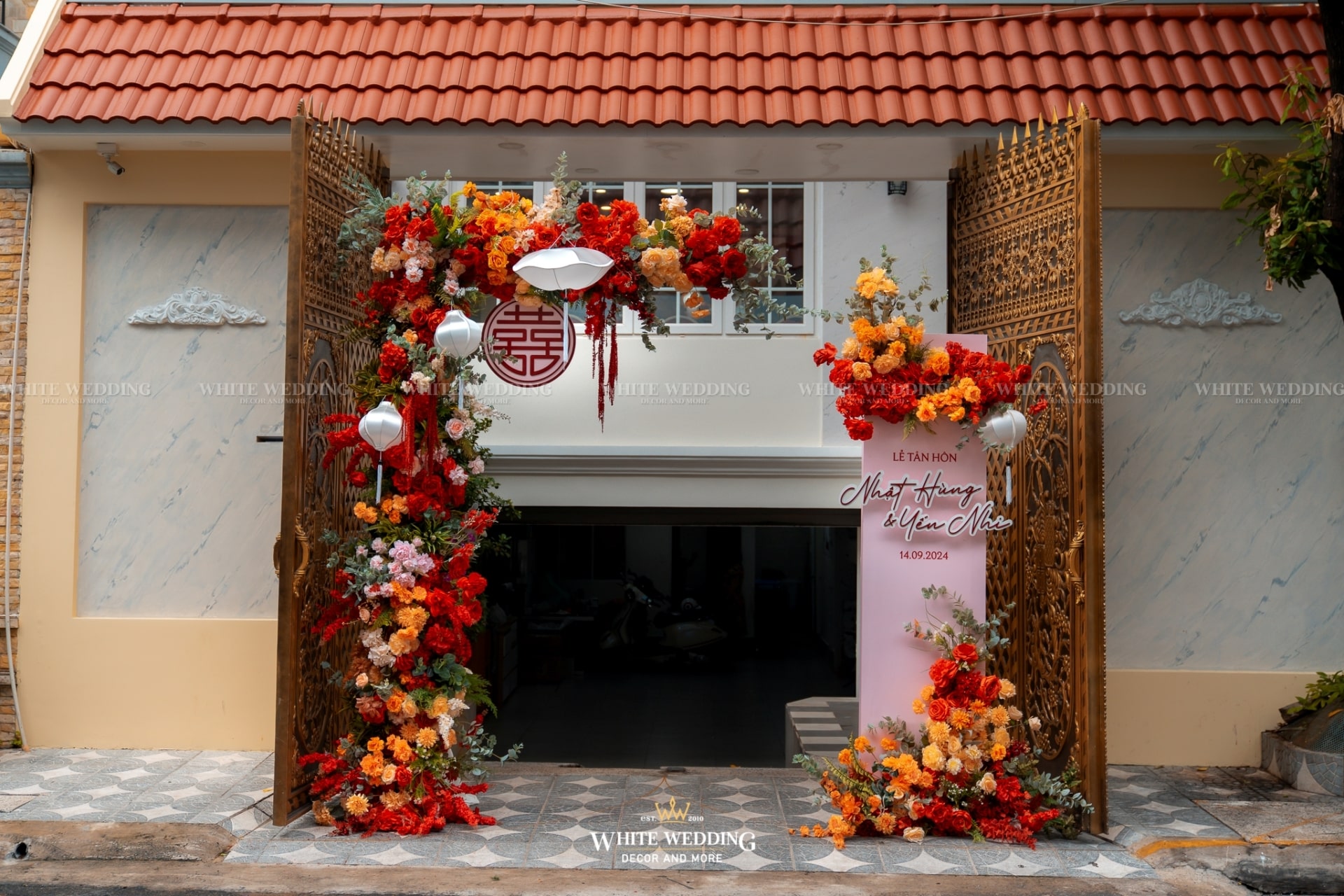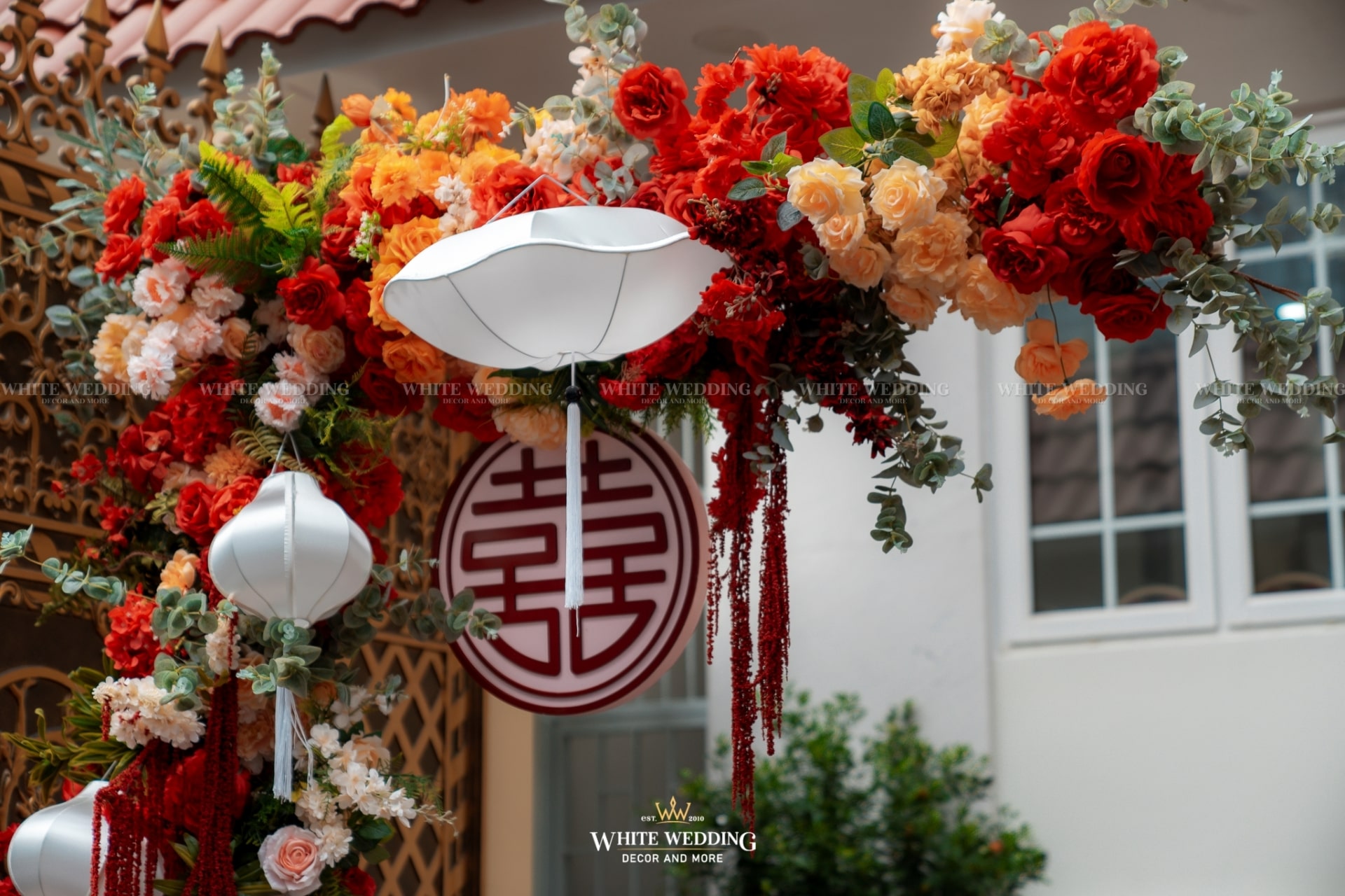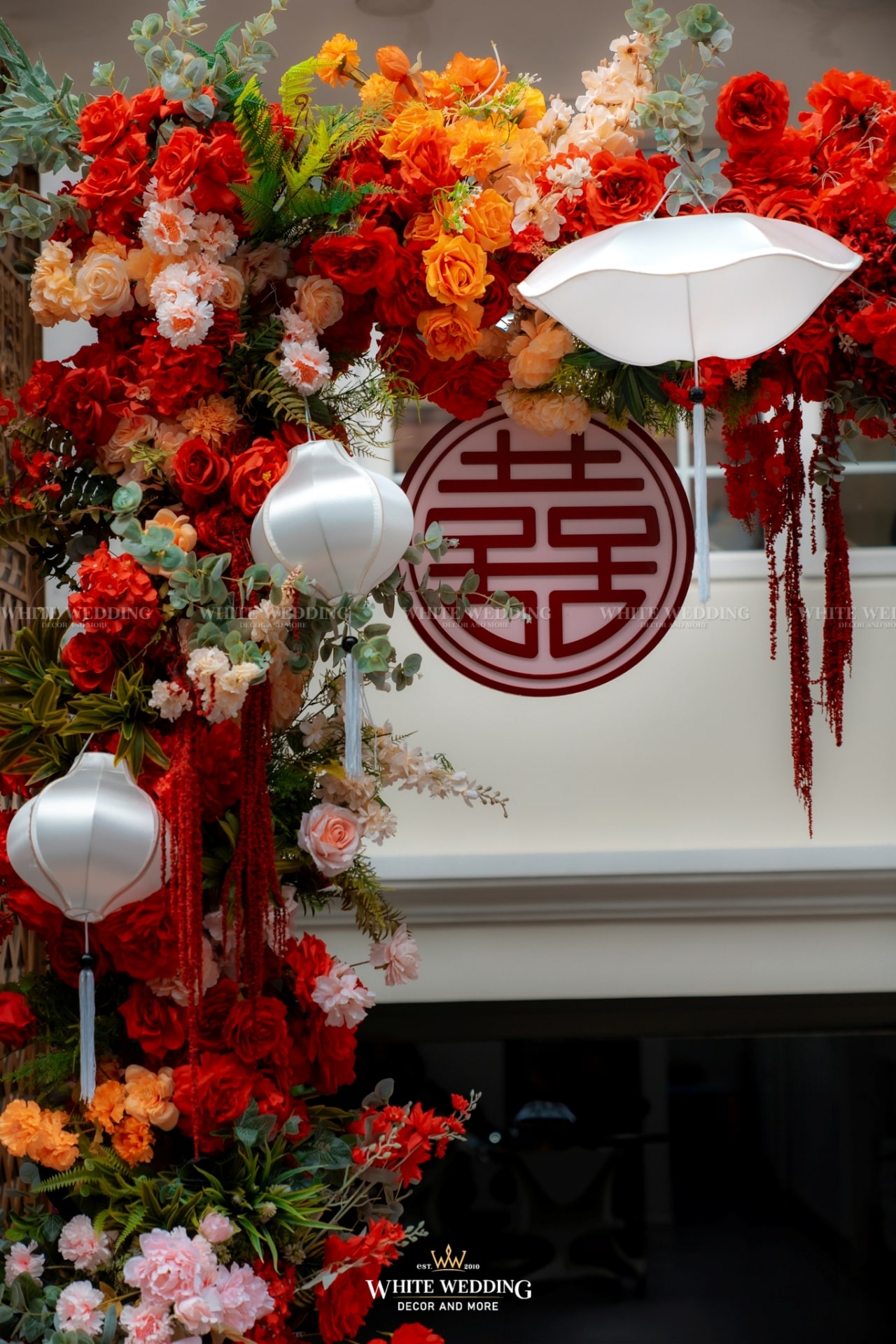 Cổng hoa lụa cao cấp nổi bật khi phối sắc đỏ – cam – nude ấm áp, sang trọng. Layer hoa được xử lý tỉ mỉ, đan xen cùng lồng đèn và chữ song hỷ