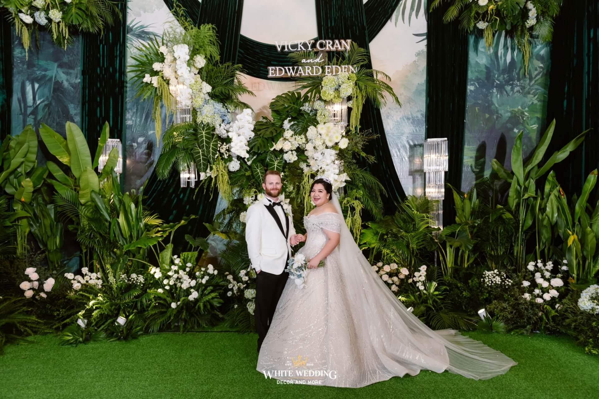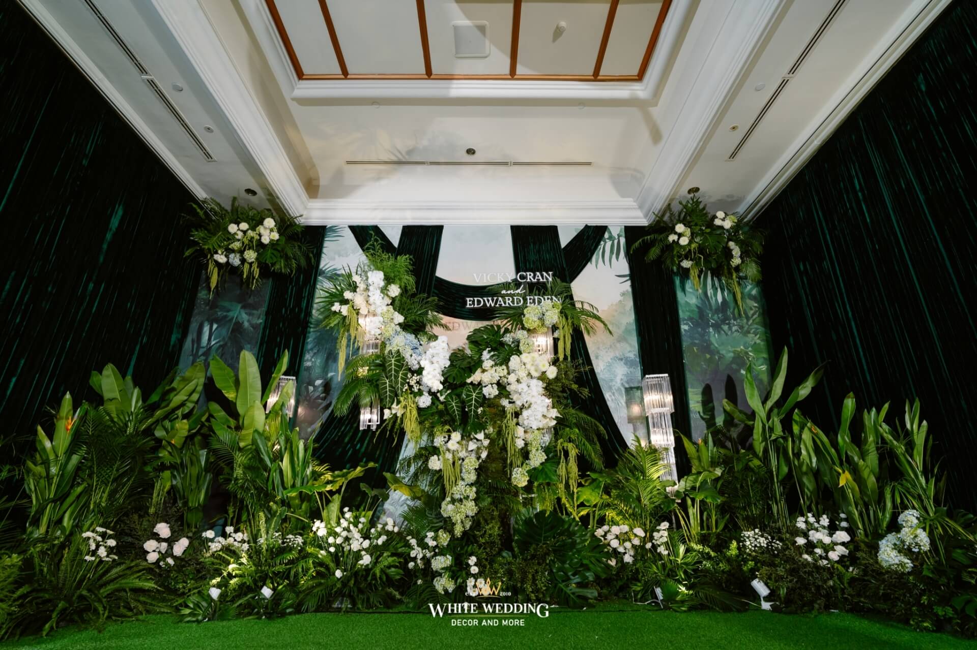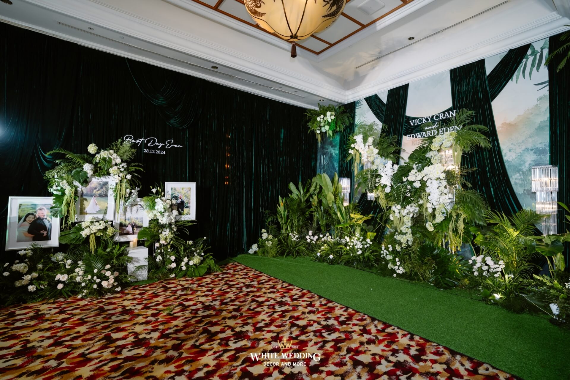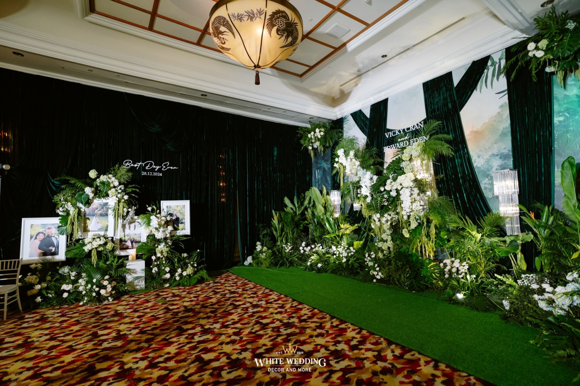 Green Land Lấy cảm hứng từ một khu rừng xanh hoang dã với tone màu chủ đạo Forest-White, thiết kế được phối thêm nhiều loại cây nhiệt đới thật và khối đèn phale tạo sự lung linh. Vải nhung được xếp theo layer kết hợp cùng các khối hoa-lá Tropical tạo nên một buổi lễ ấn tượng.