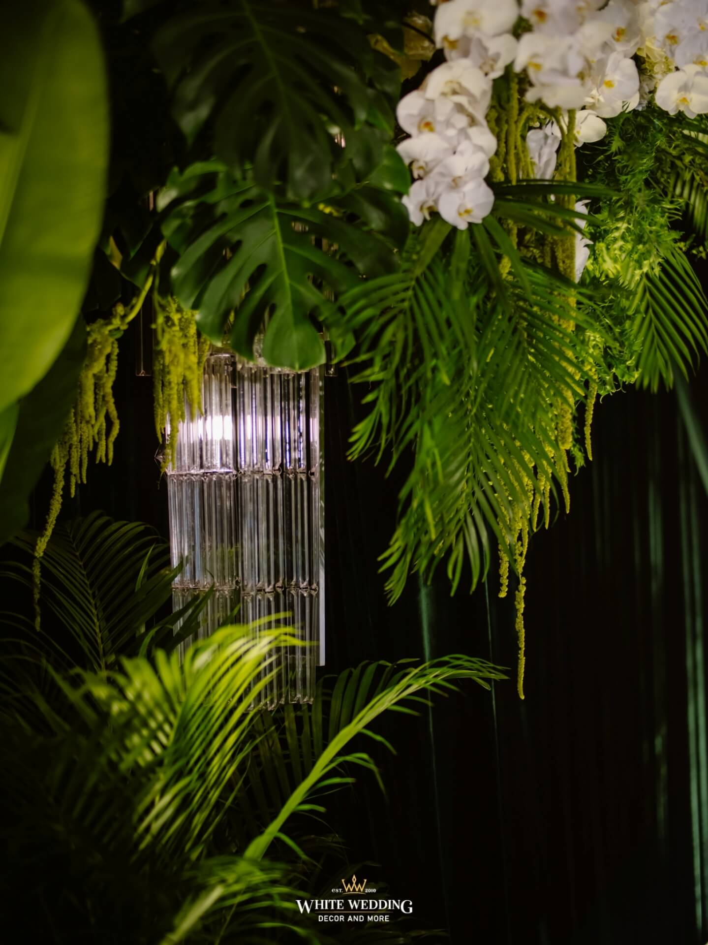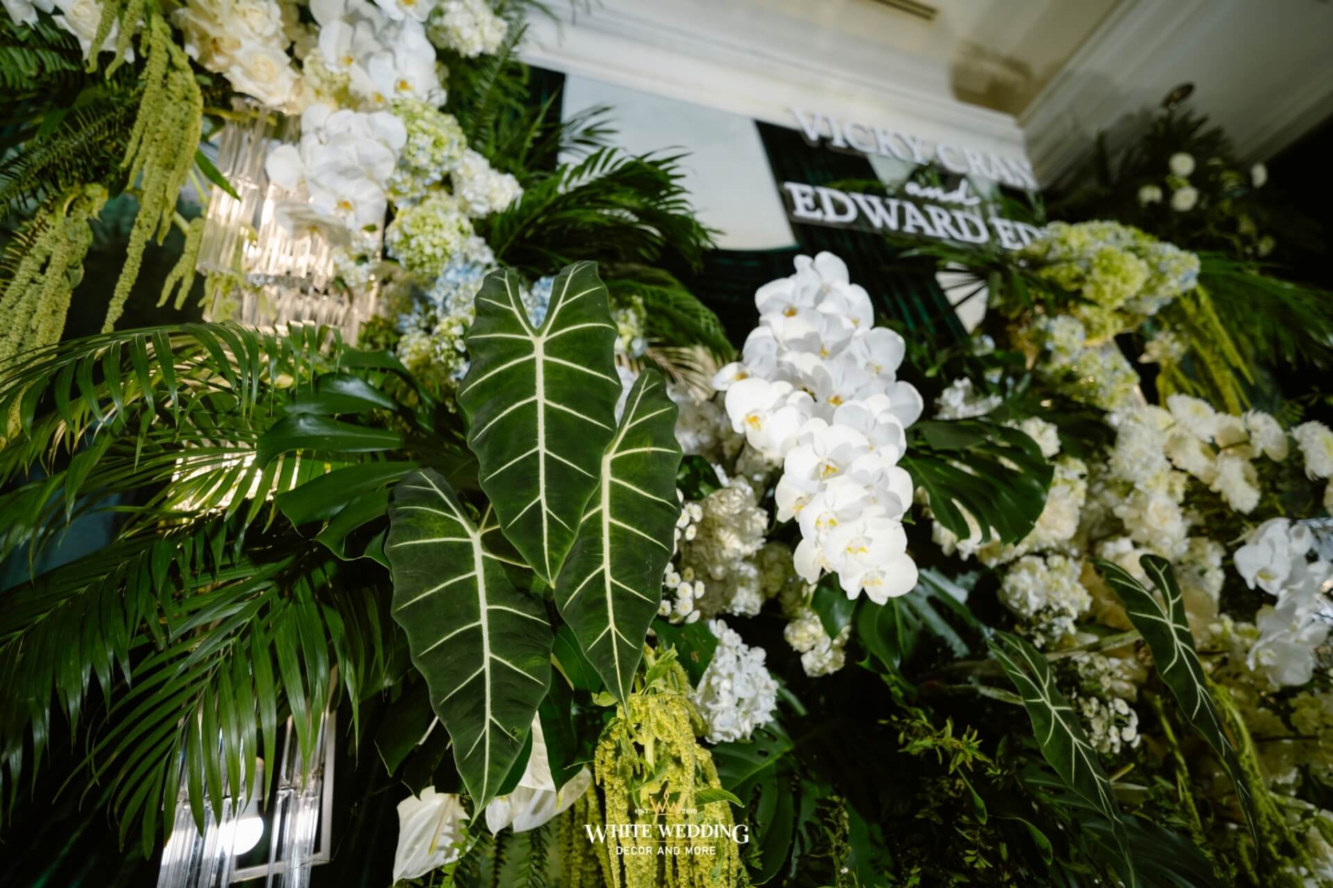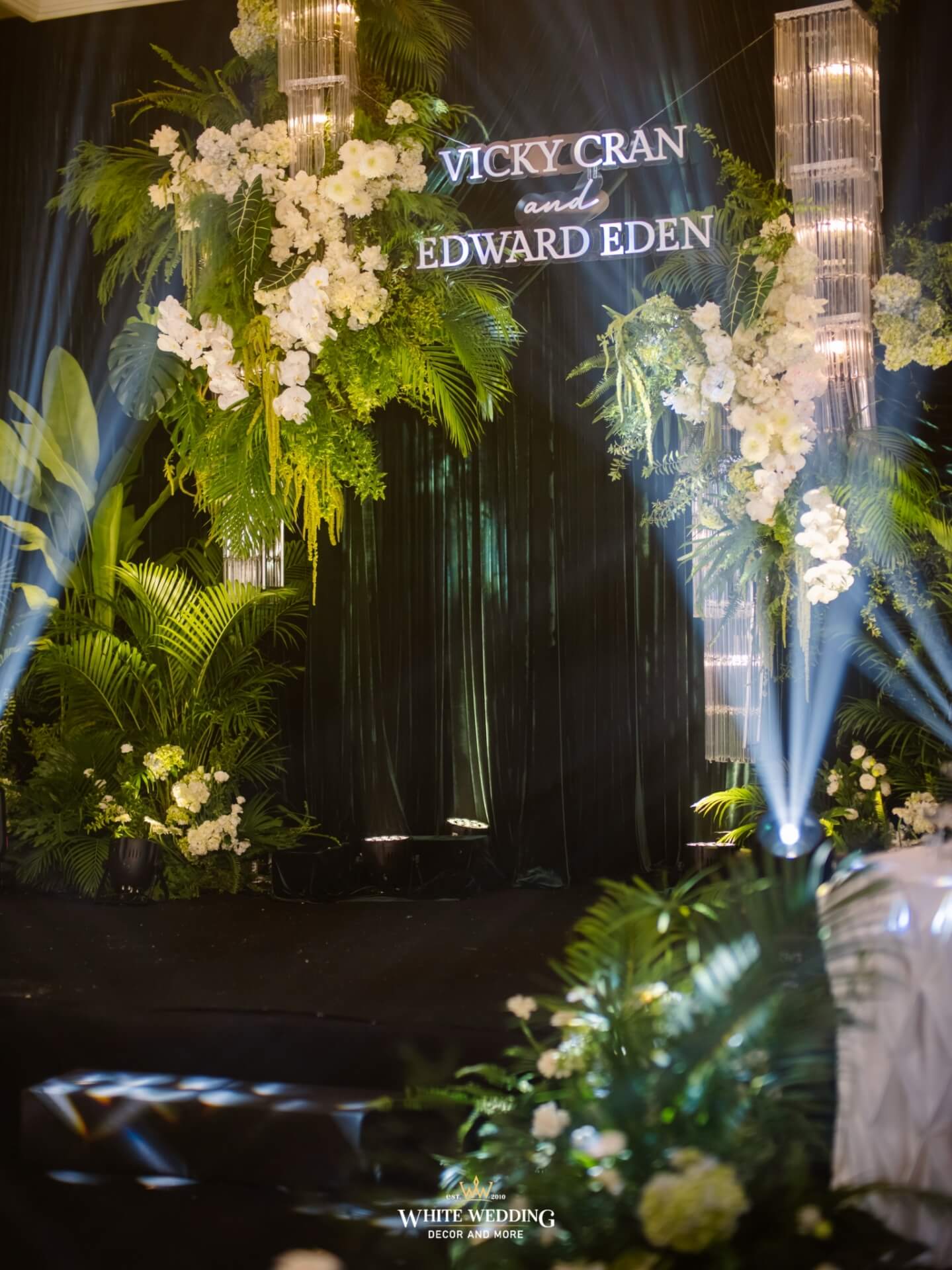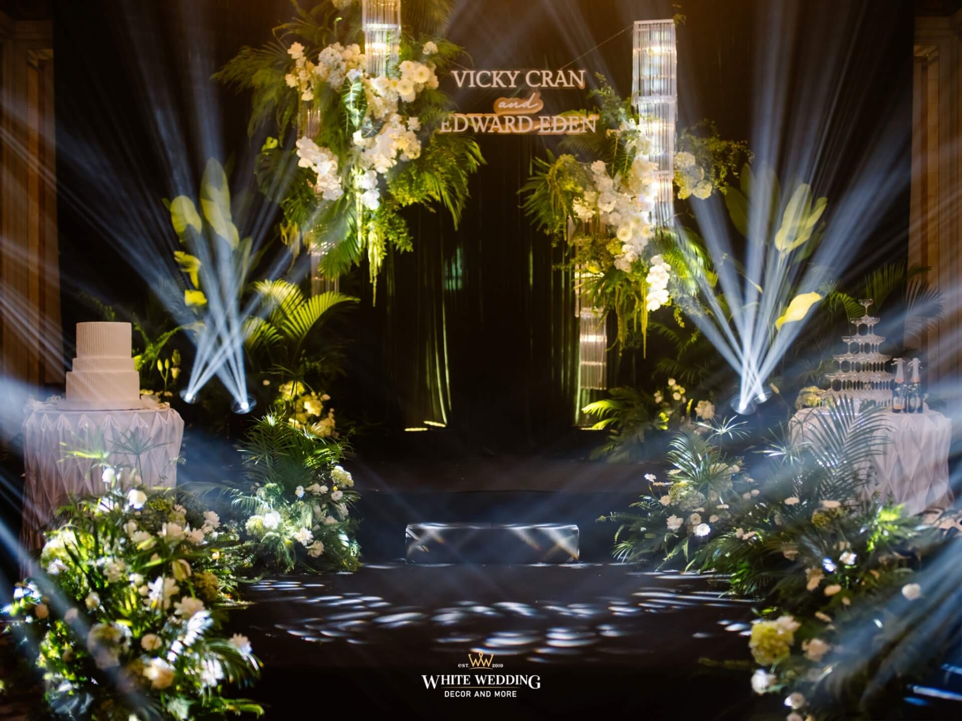 Green Land Lấy cảm hứng từ một khu rừng xanh hoang dã với tone màu chủ đạo Forest-White, thiết kế được phối thêm nhiều loại cây nhiệt đới thật và khối đèn phale tạo sự lung linh. Vải nhung được xếp theo layer kết hợp cùng các khối hoa-lá Tropical tạo nên một buổi lễ ấn tượng.