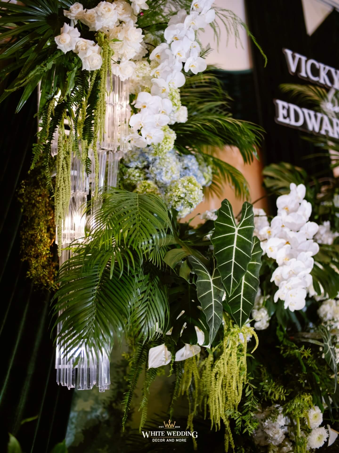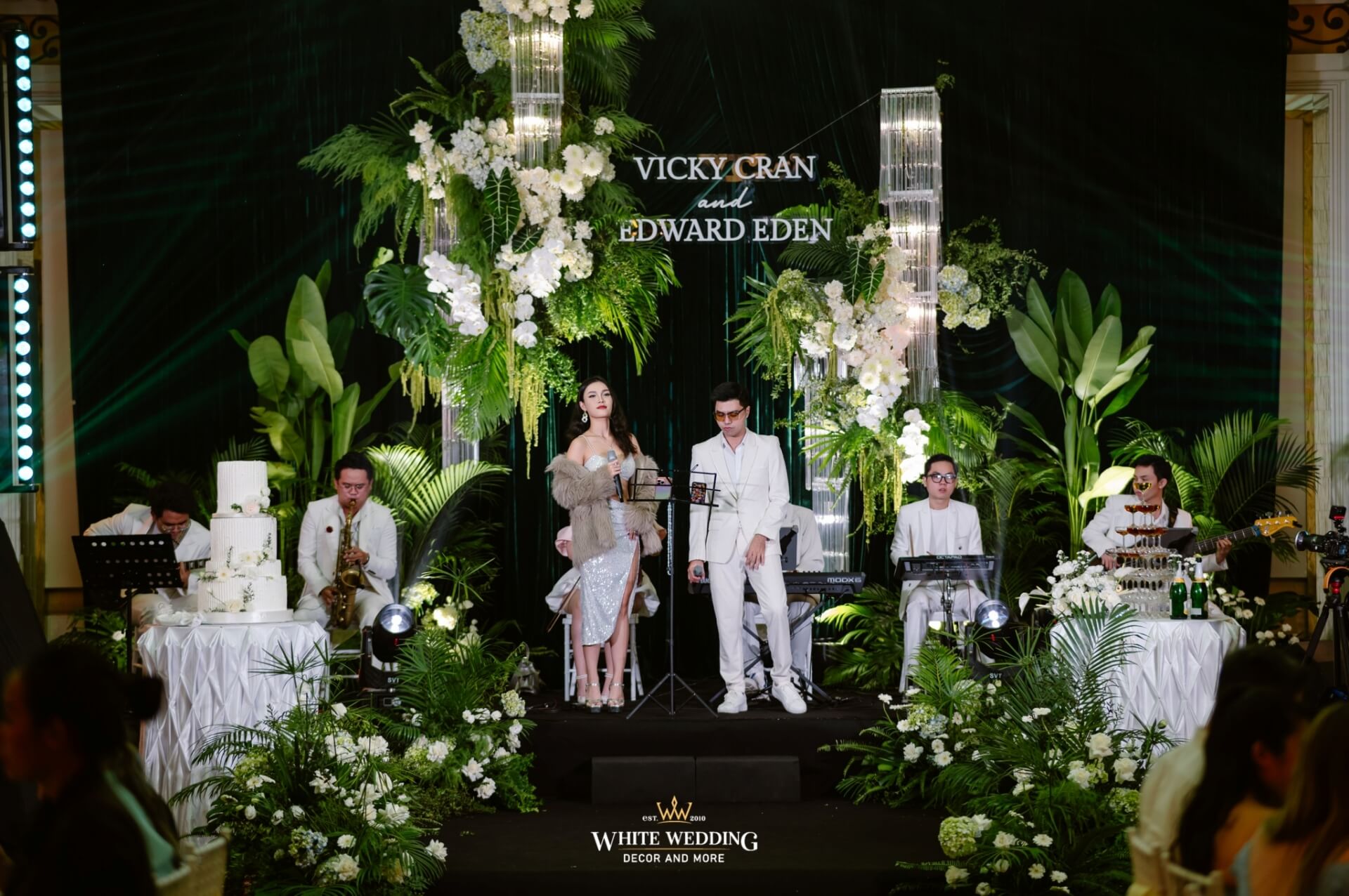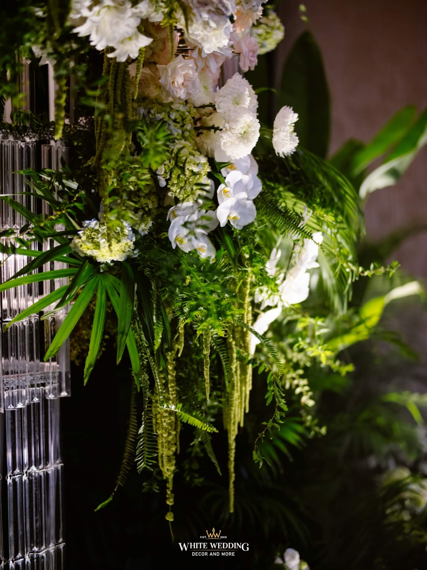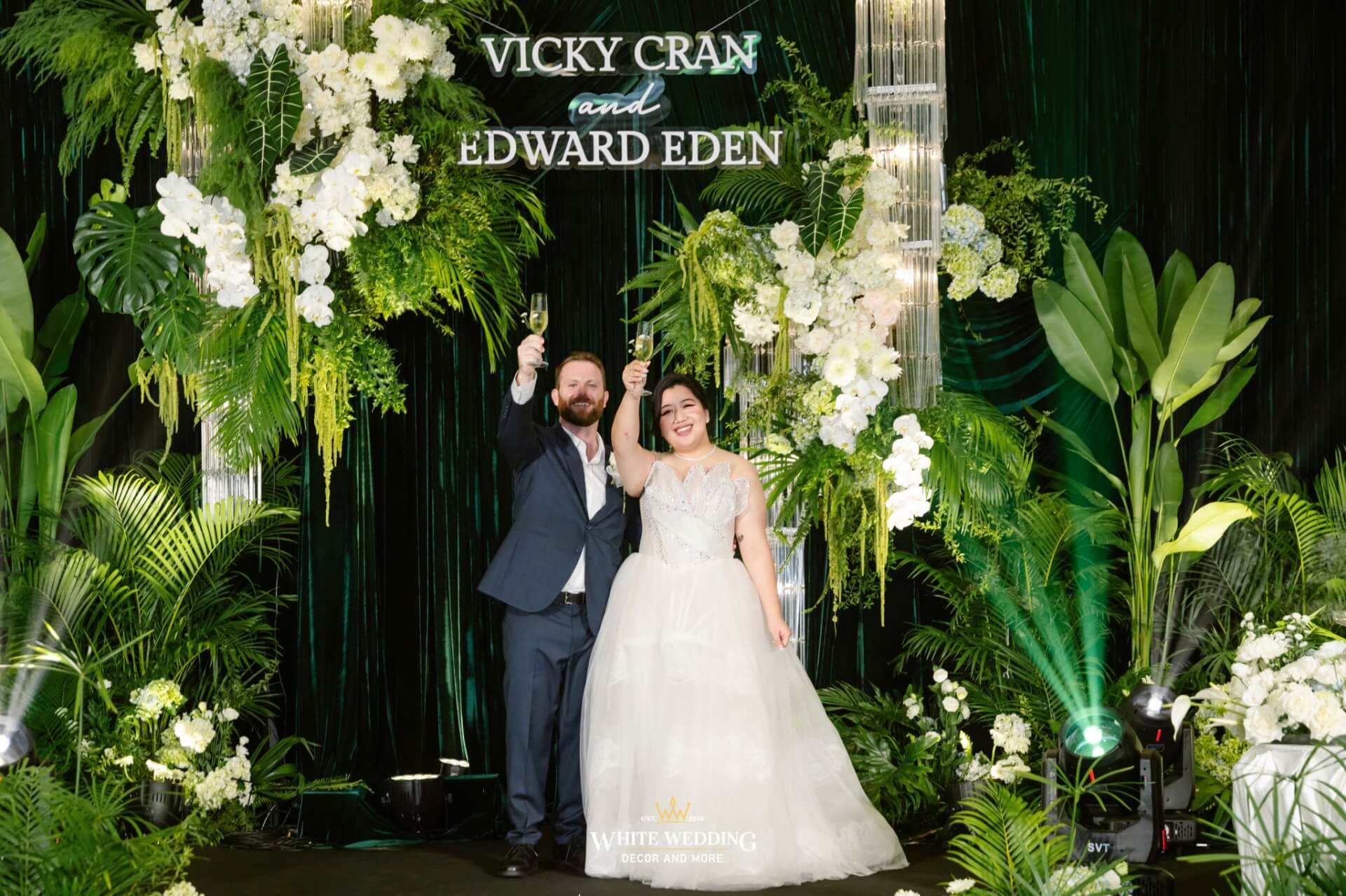 Green Land Lấy cảm hứng từ một khu rừng xanh hoang dã với tone màu chủ đạo Forest-White, thiết kế được phối thêm nhiều loại cây nhiệt đới thật và khối đèn phale tạo sự lung linh. Vải nhung được xếp theo layer kết hợp cùng các khối hoa-lá Tropical tạo nên một buổi lễ ấn tượng.