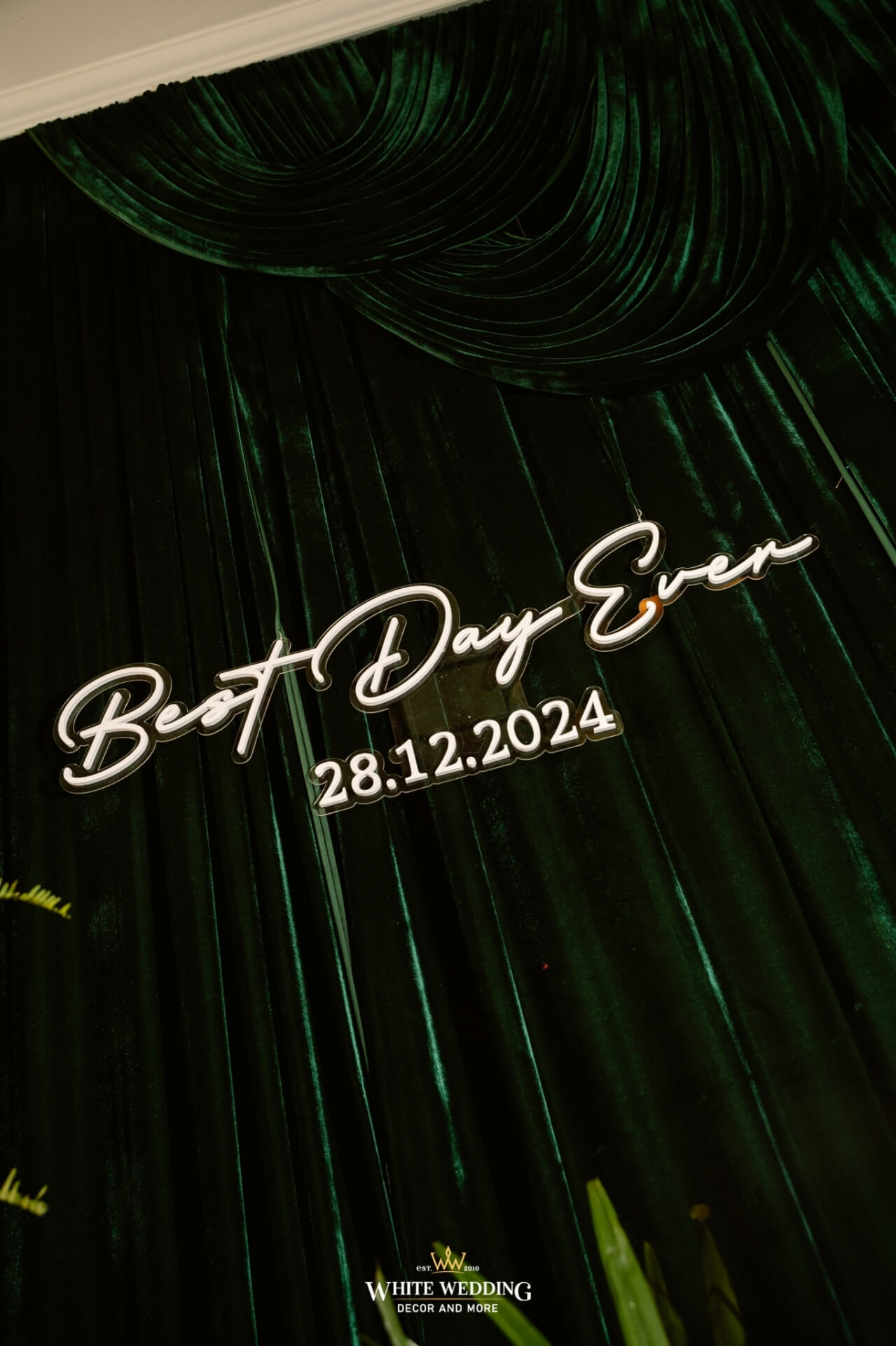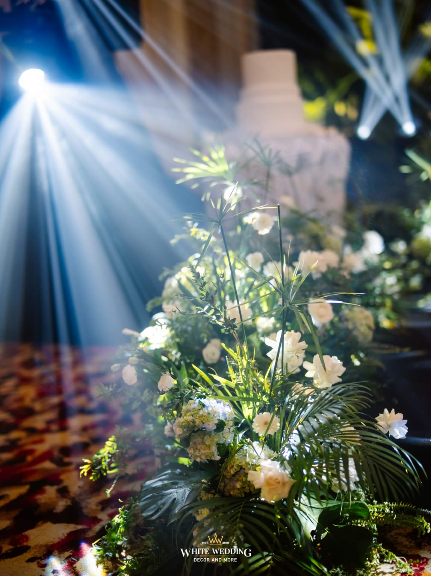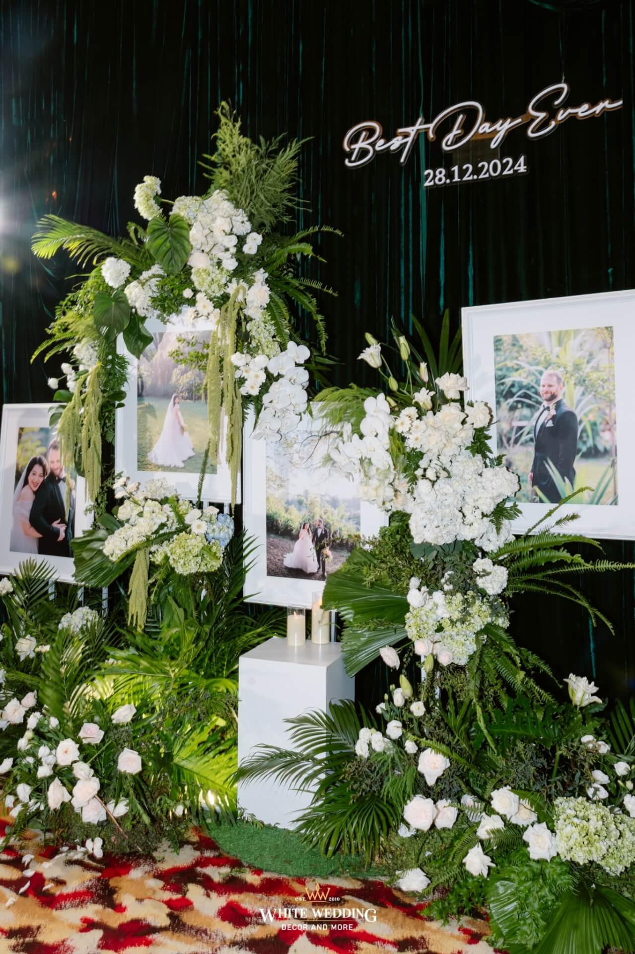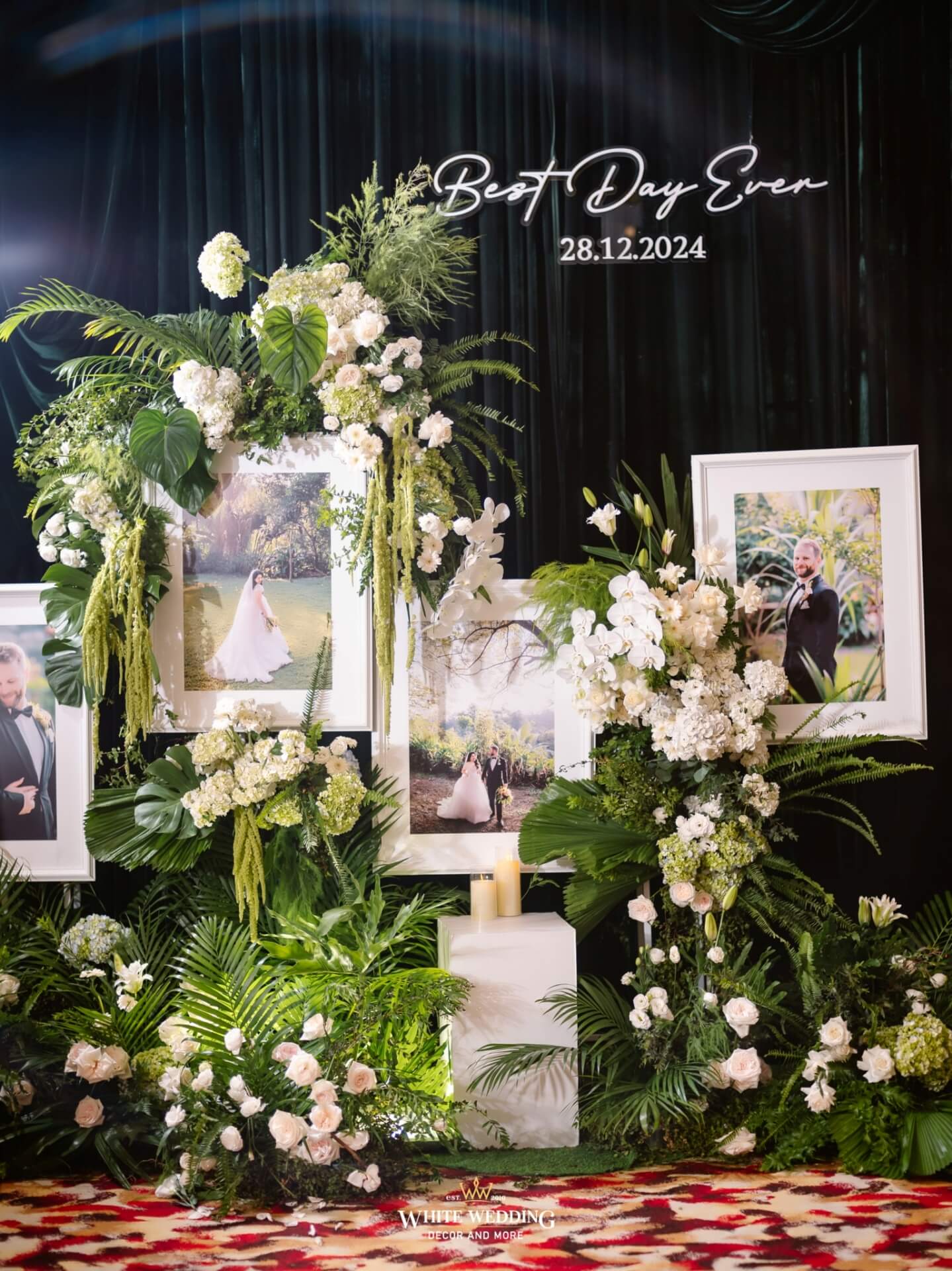 Green Land Lấy cảm hứng từ một khu rừng xanh hoang dã với tone màu chủ đạo Forest-White, thiết kế được phối thêm nhiều loại cây nhiệt đới thật và khối đèn phale tạo sự lung linh. Vải nhung được xếp theo layer kết hợp cùng các khối hoa-lá Tropical tạo nên một buổi lễ ấn tượng.