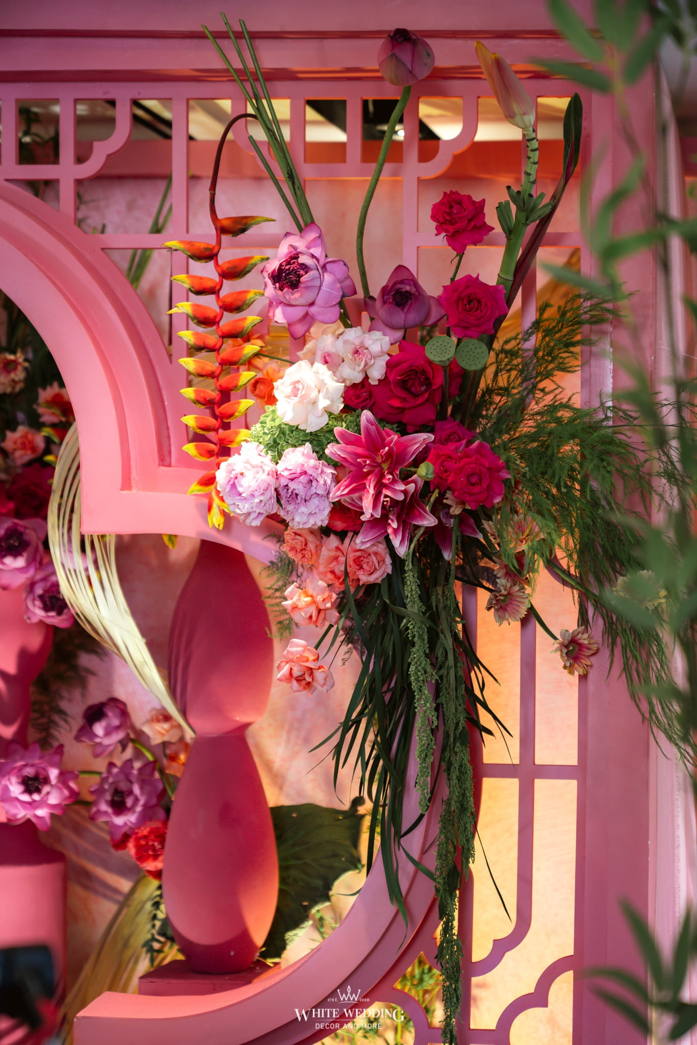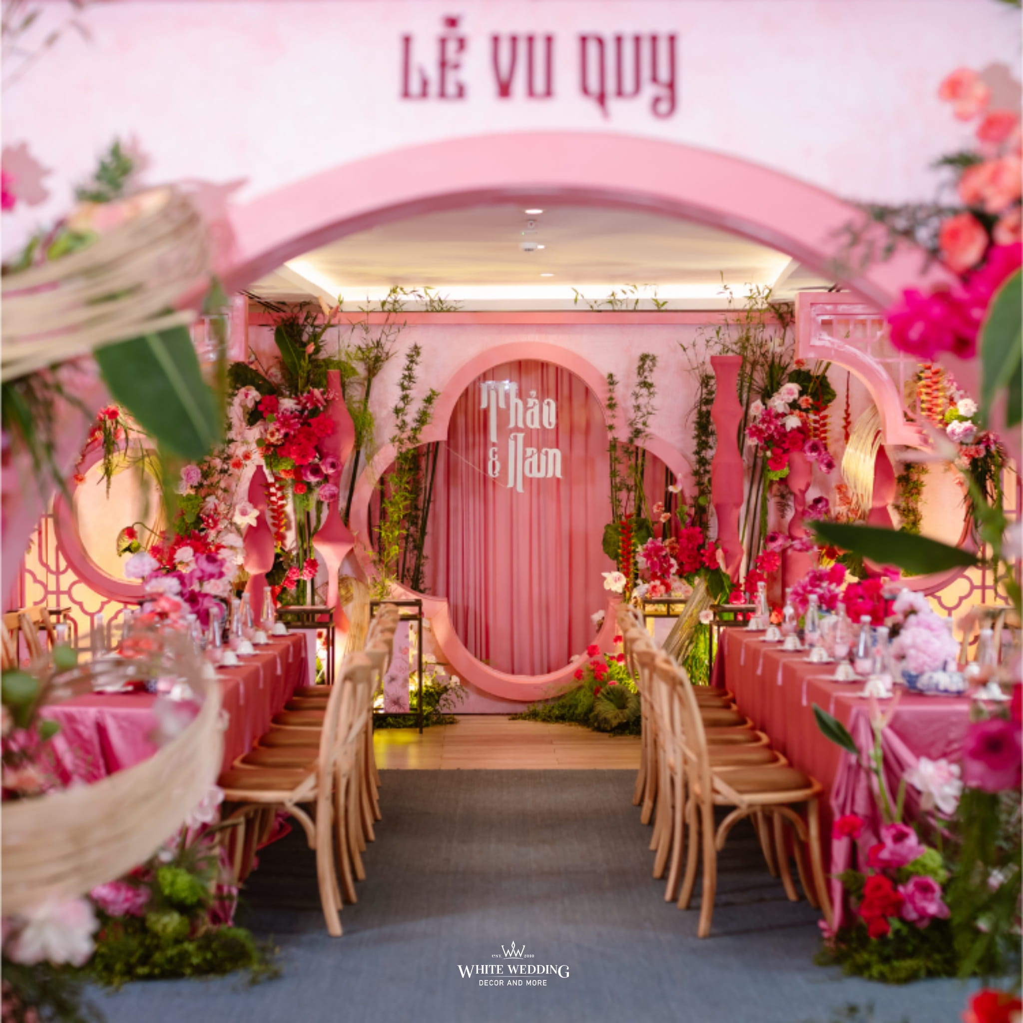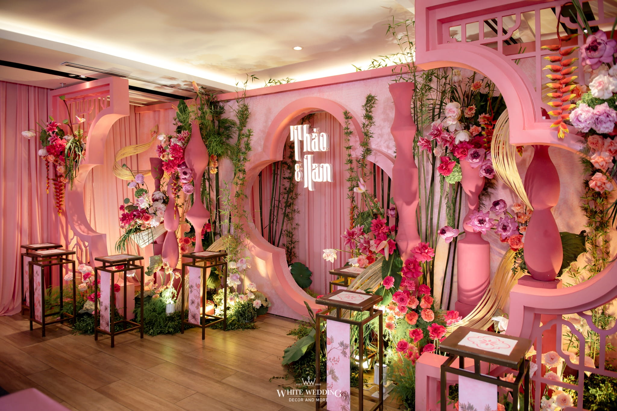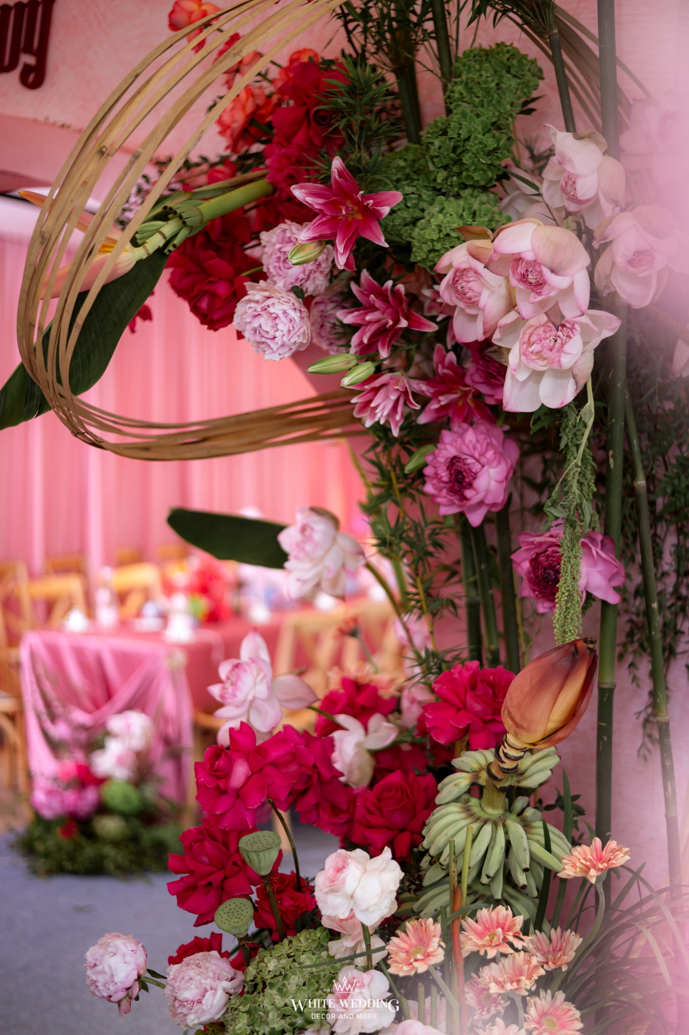 Kế thừa mỹ học phương Đông và mong muốn về một lễ gia tiên rực rỡ sắc hồng của cô dâu Bích Thảo, White Wedding mang làn gió mới vào phong cách Á Đông khi đưa gam hồng raspberry hiện đại vào không gian lễ, biến nhà cộng đồng The Peak thành một hoa viên ngập tràn hương sắc.