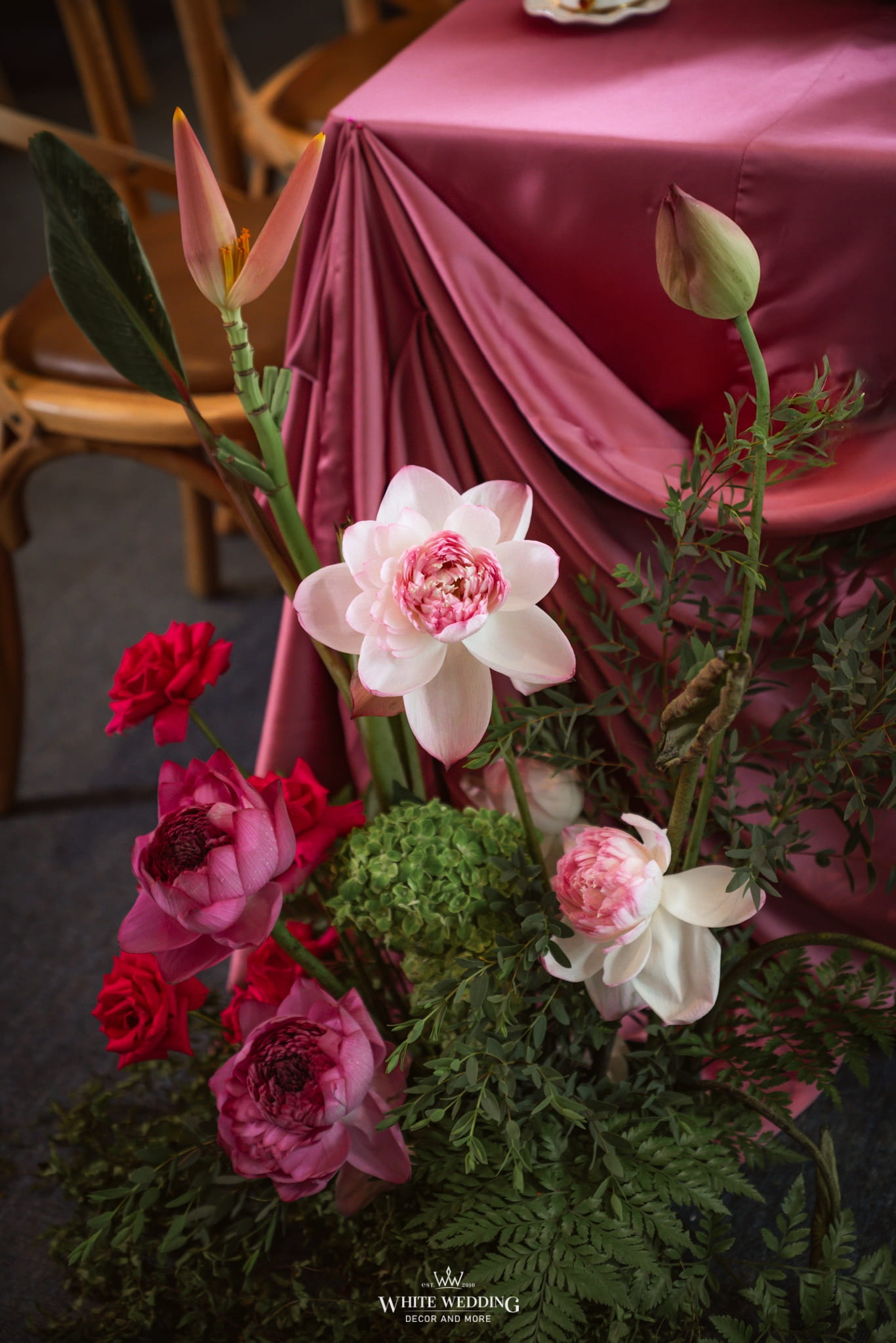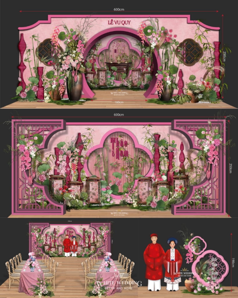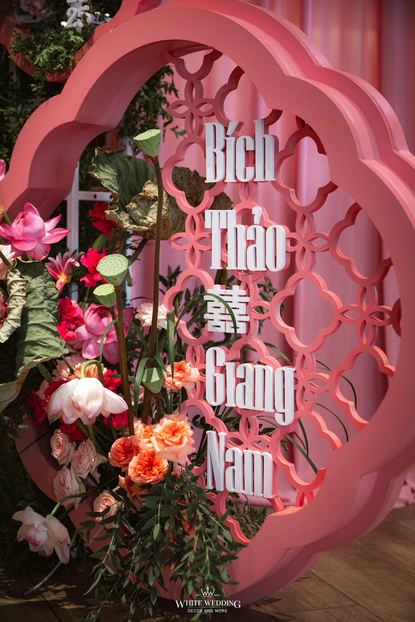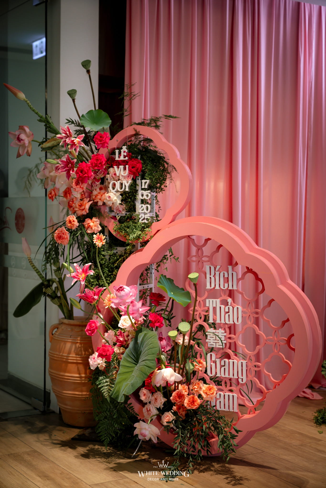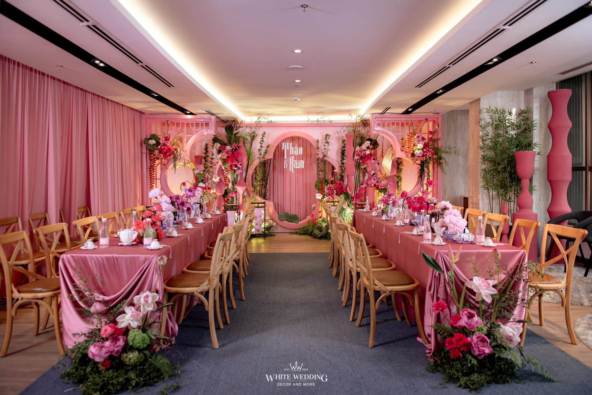Kế thừa mỹ học phương Đông và mong muốn về một lễ gia tiên rực rỡ sắc hồng của cô dâu Bích Thảo, White Wedding mang làn gió mới vào phong cách Á Đông khi đưa gam hồng raspberry hiện đại vào không gian lễ, biến nhà cộng đồng The Peak thành một hoa viên ngập tràn hương sắc.