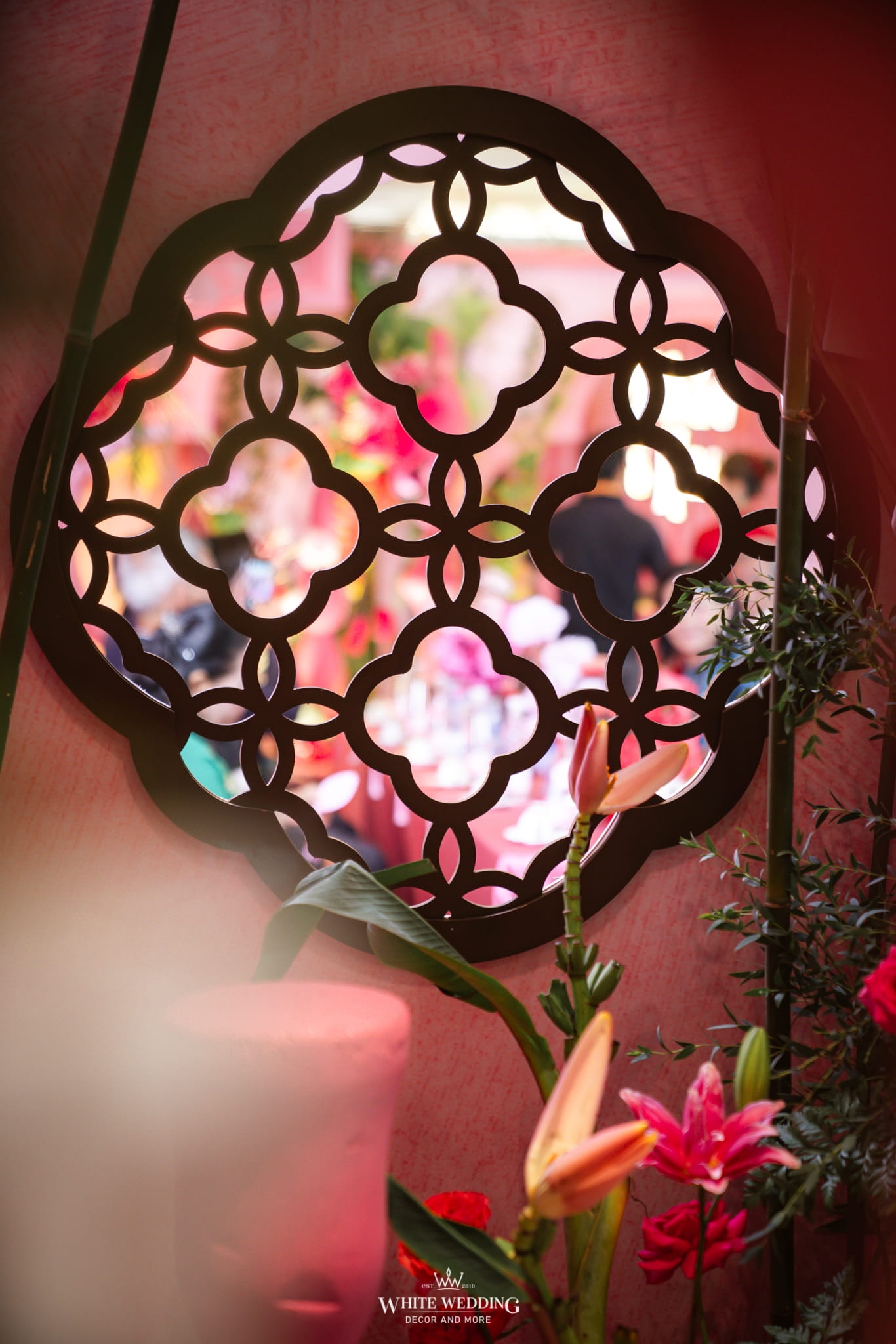 Lấy cảm hứng từ kiến trúc nhà vườn Á Đông, cánh cổng tròn vừa là ranh giới, vừa là điểm nhấn dẫn ánh nhìn vào backdrop hoa thị. Cách sắp đặt không gian theo nguyên lý phong thủy giúp tổng thể trở nên hài hòa, tĩnh tại và đầy chất thơ.