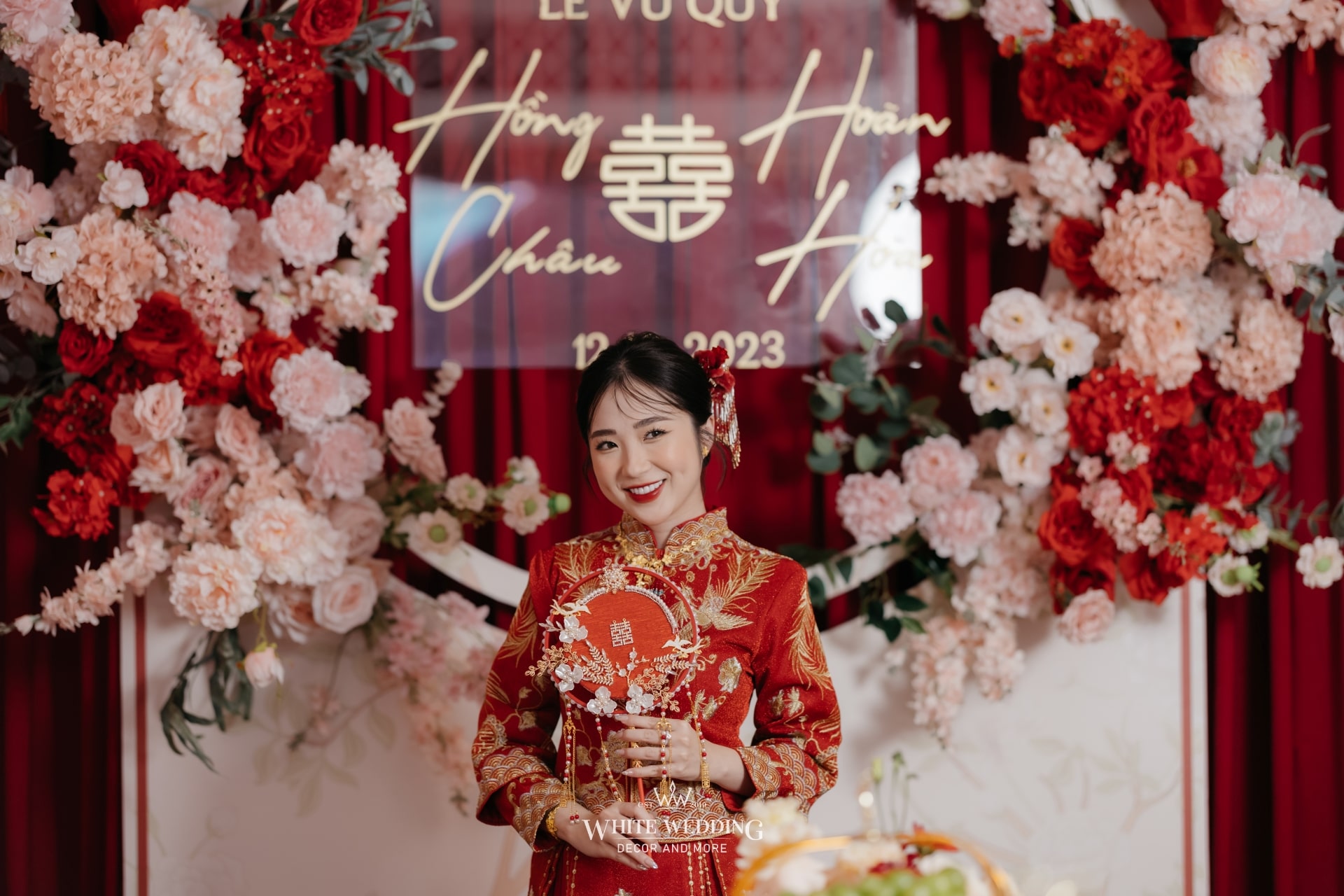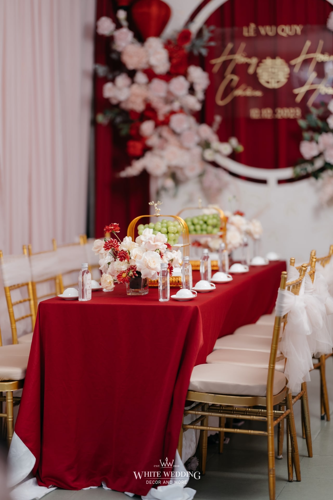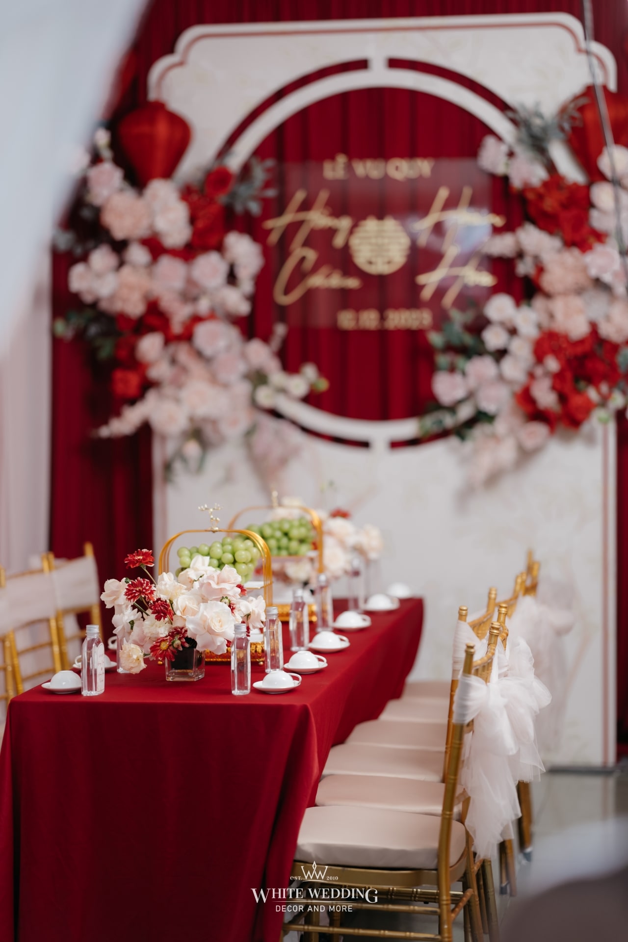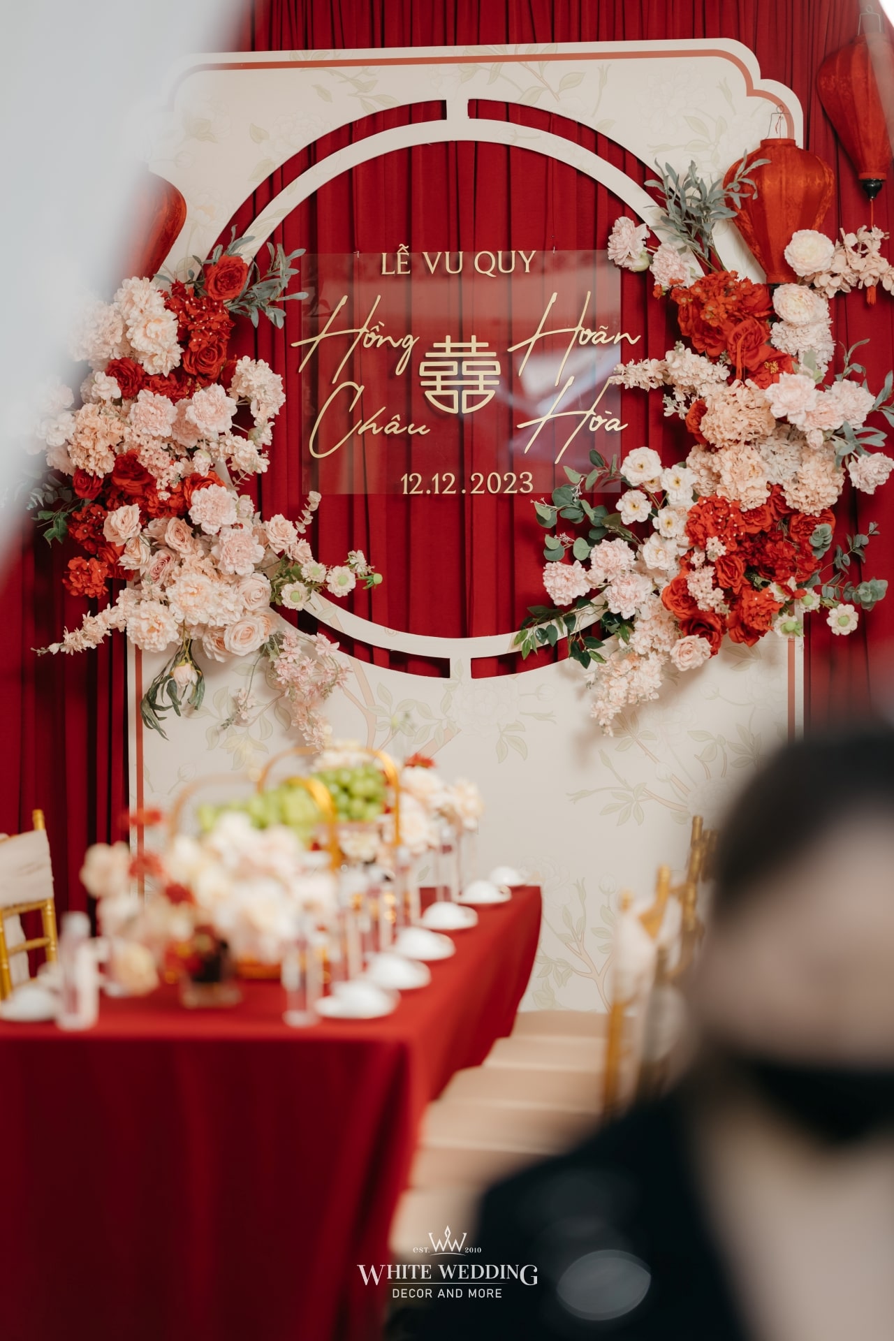 Không gian tiệc mang đậm màu sắc văn hóa người Hoa – nơi sắc đỏ tượng trưng cho may mắn, hỷ sự và viên mãn. Một layout sang trọng, chỉn chu và đầy ý nghĩa được sử dụng phổ biến cho những ngày trọng đại của người Hoa.
