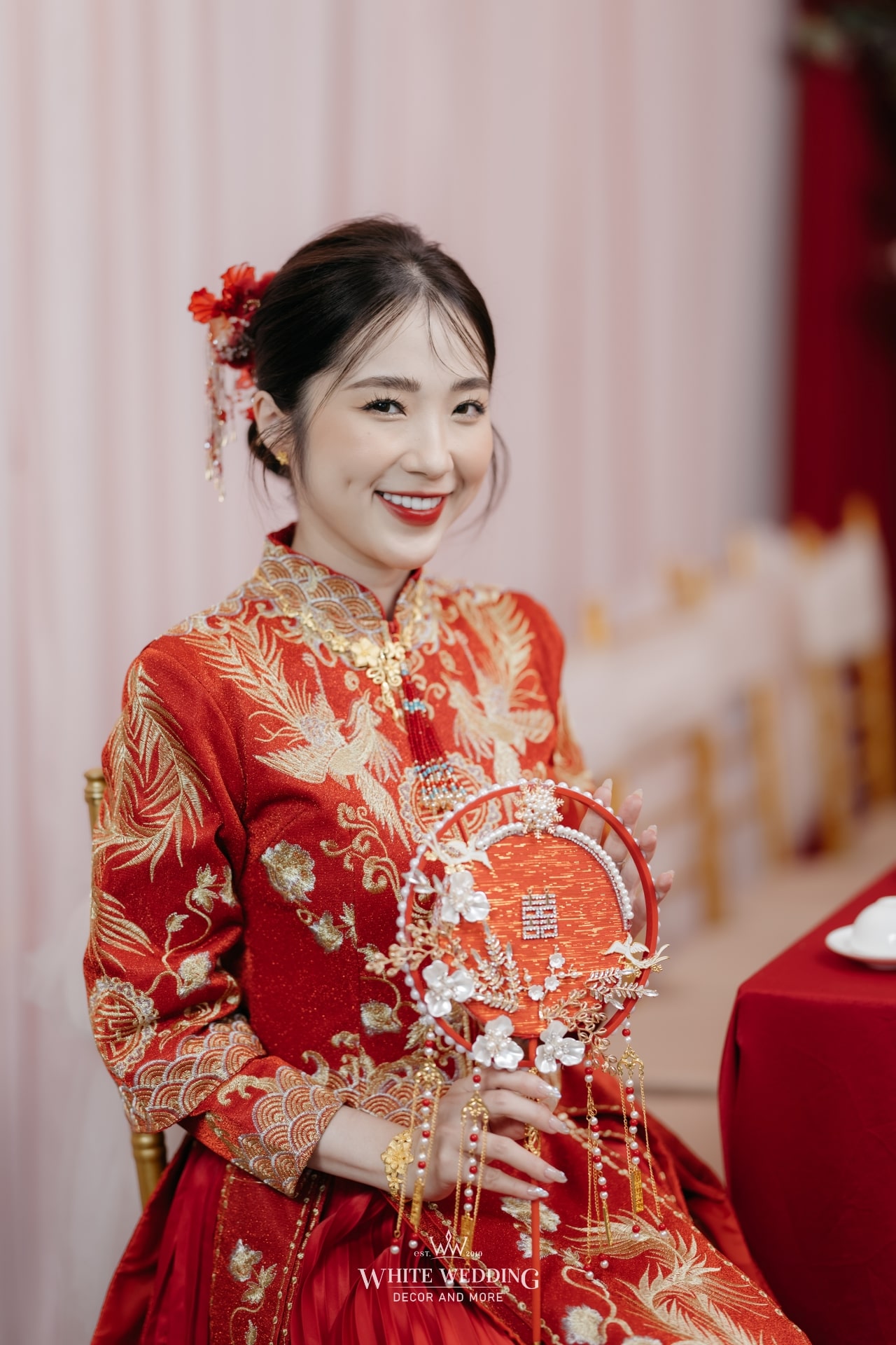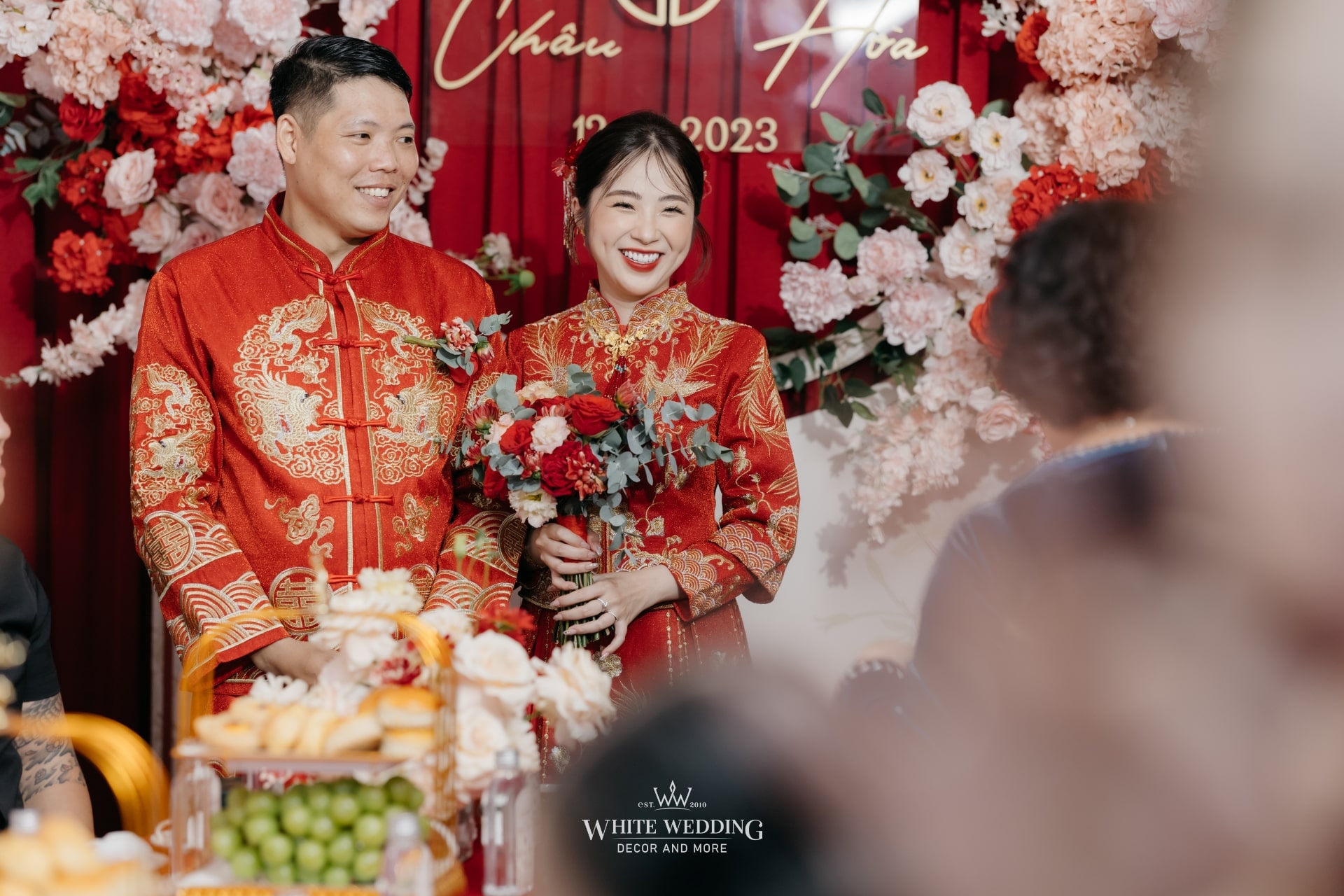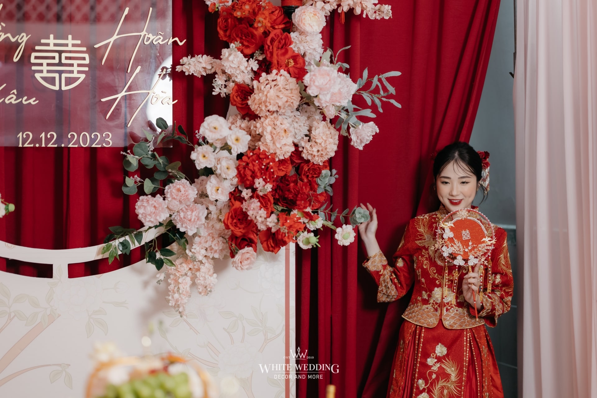 Không gian tiệc mang đậm màu sắc văn hóa người Hoa – nơi sắc đỏ tượng trưng cho may mắn, hỷ sự và viên mãn. Một layout sang trọng, chỉn chu và đầy ý nghĩa được sử dụng phổ biến cho những ngày trọng đại của người Hoa.