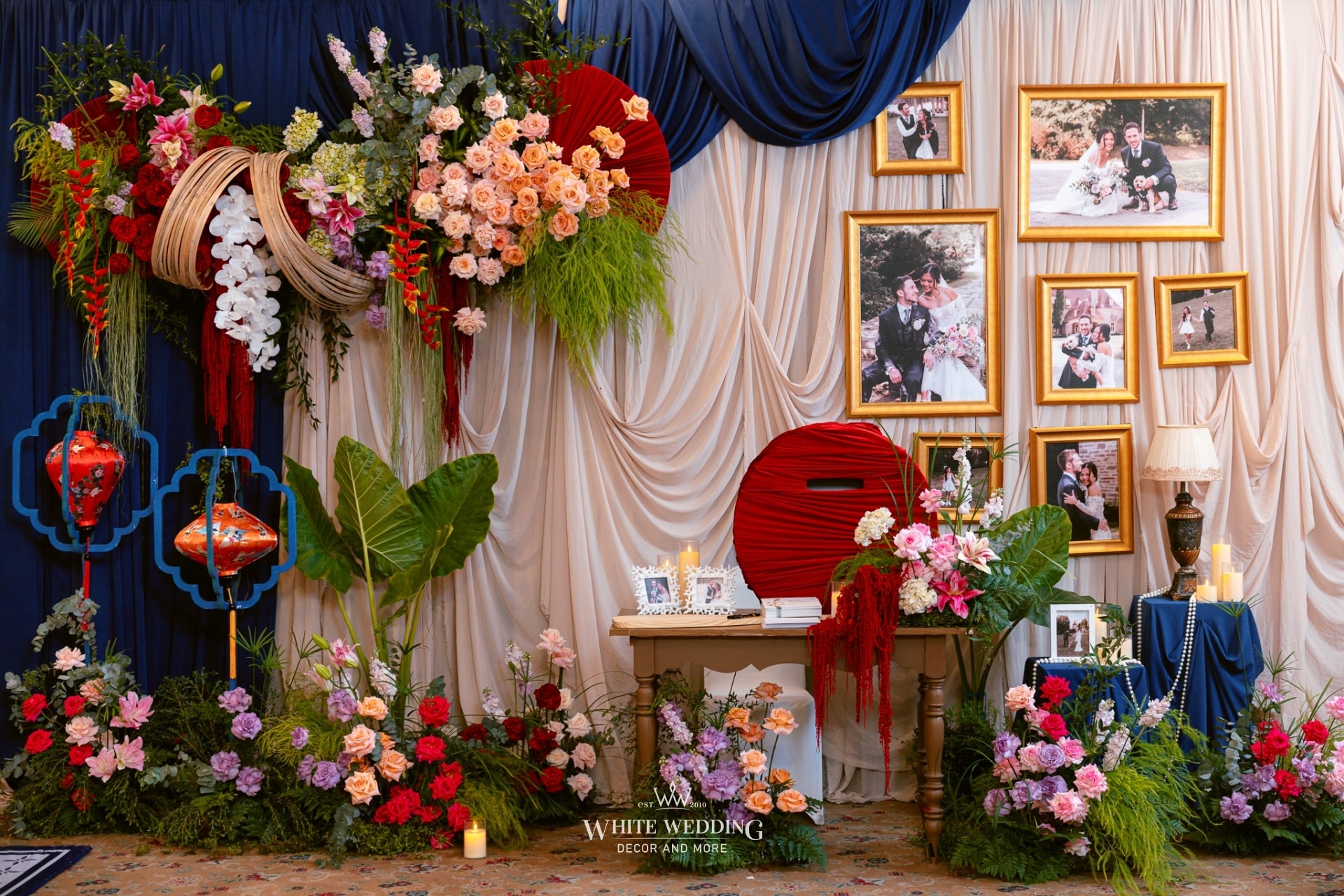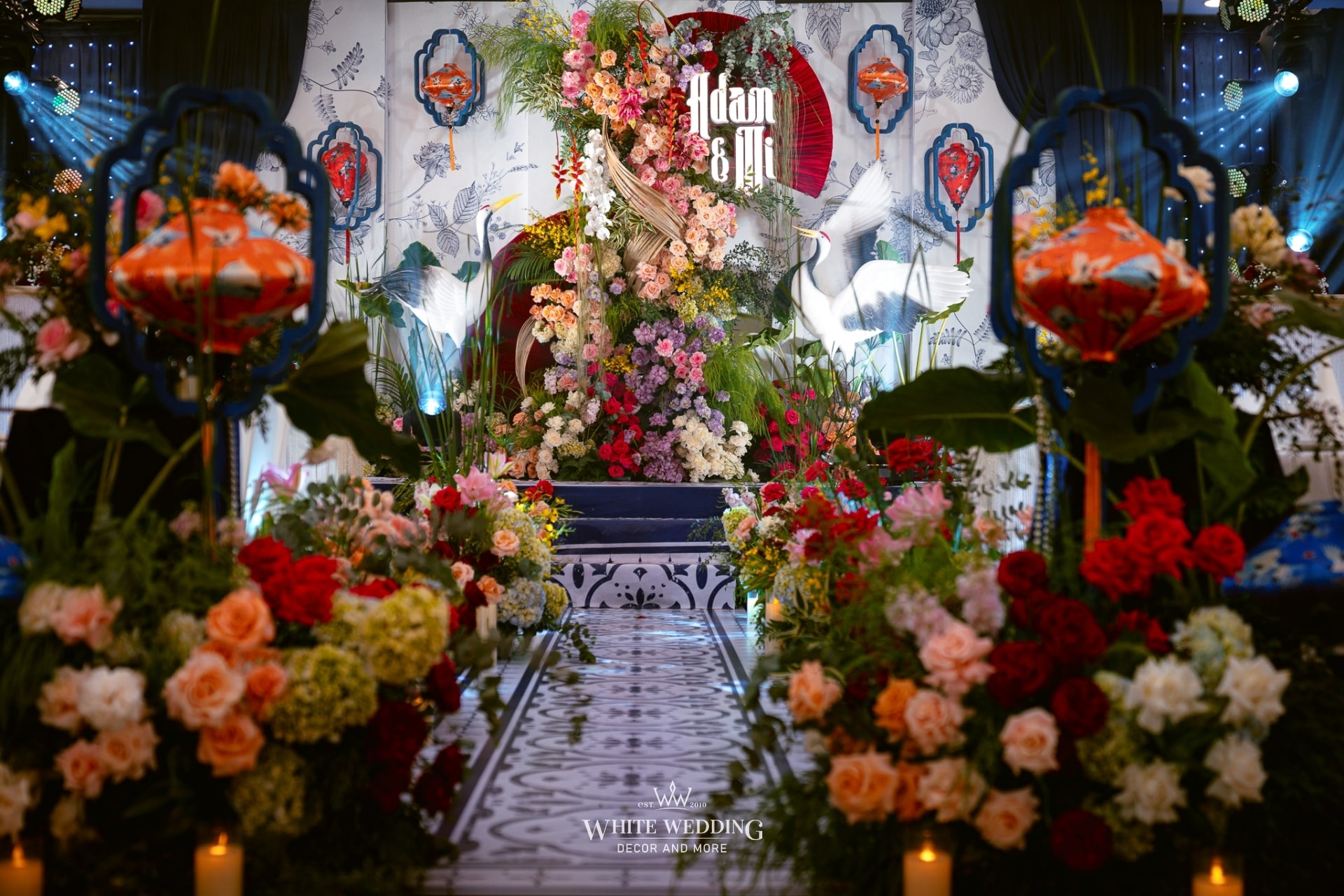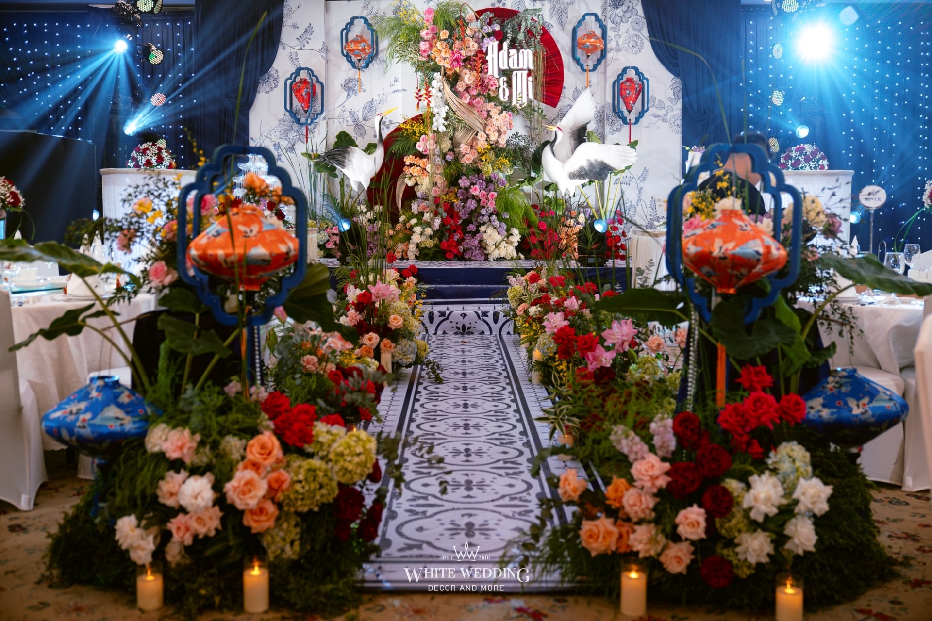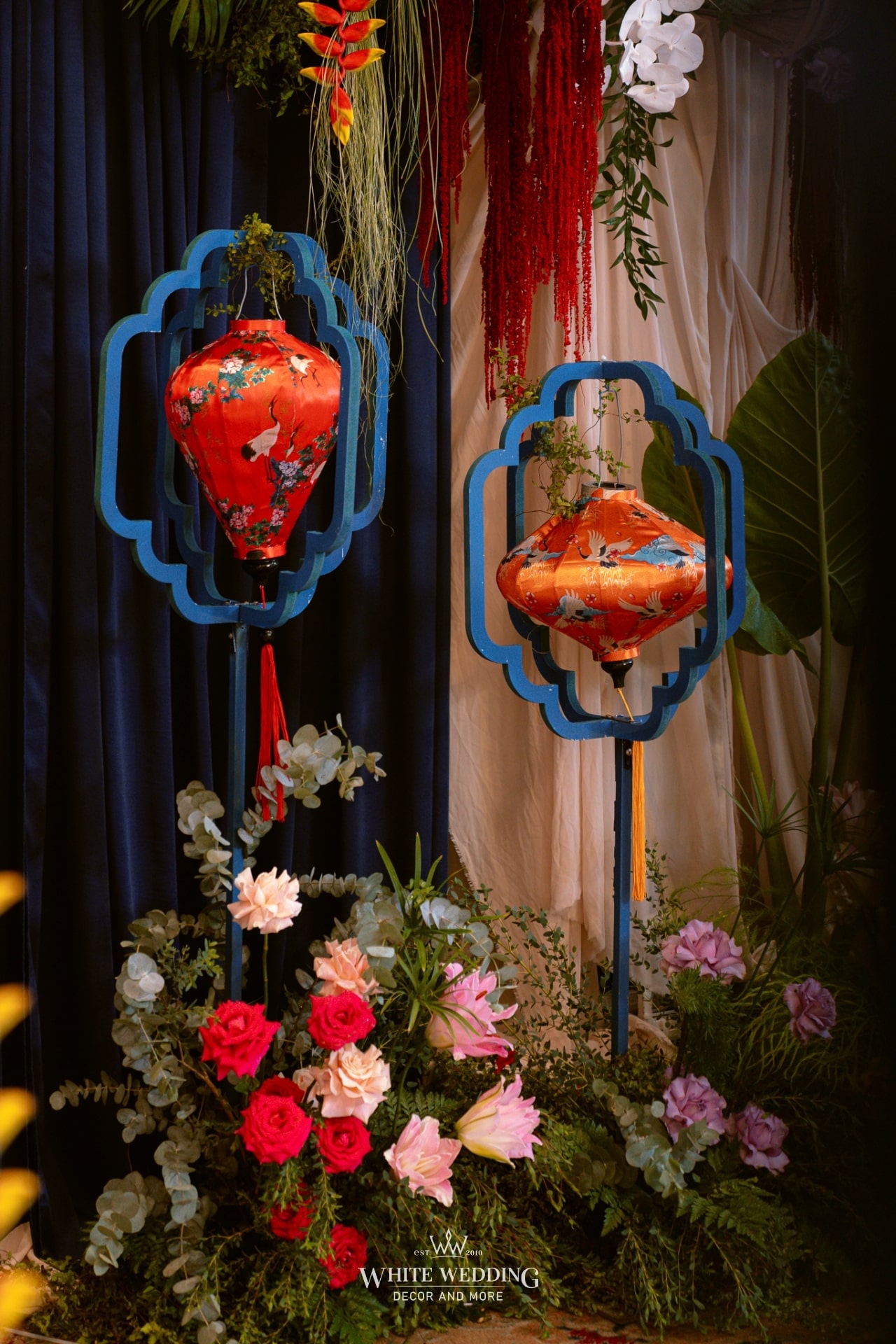Dựa trên mong muốn của & về một không gian cưới mang hơi thở Indochine hiện đại, White Wedding đã phát triển concept với tông màu chủ đạo là xanh navy kết hợp tương phản cùng sắc đỏ velvet.