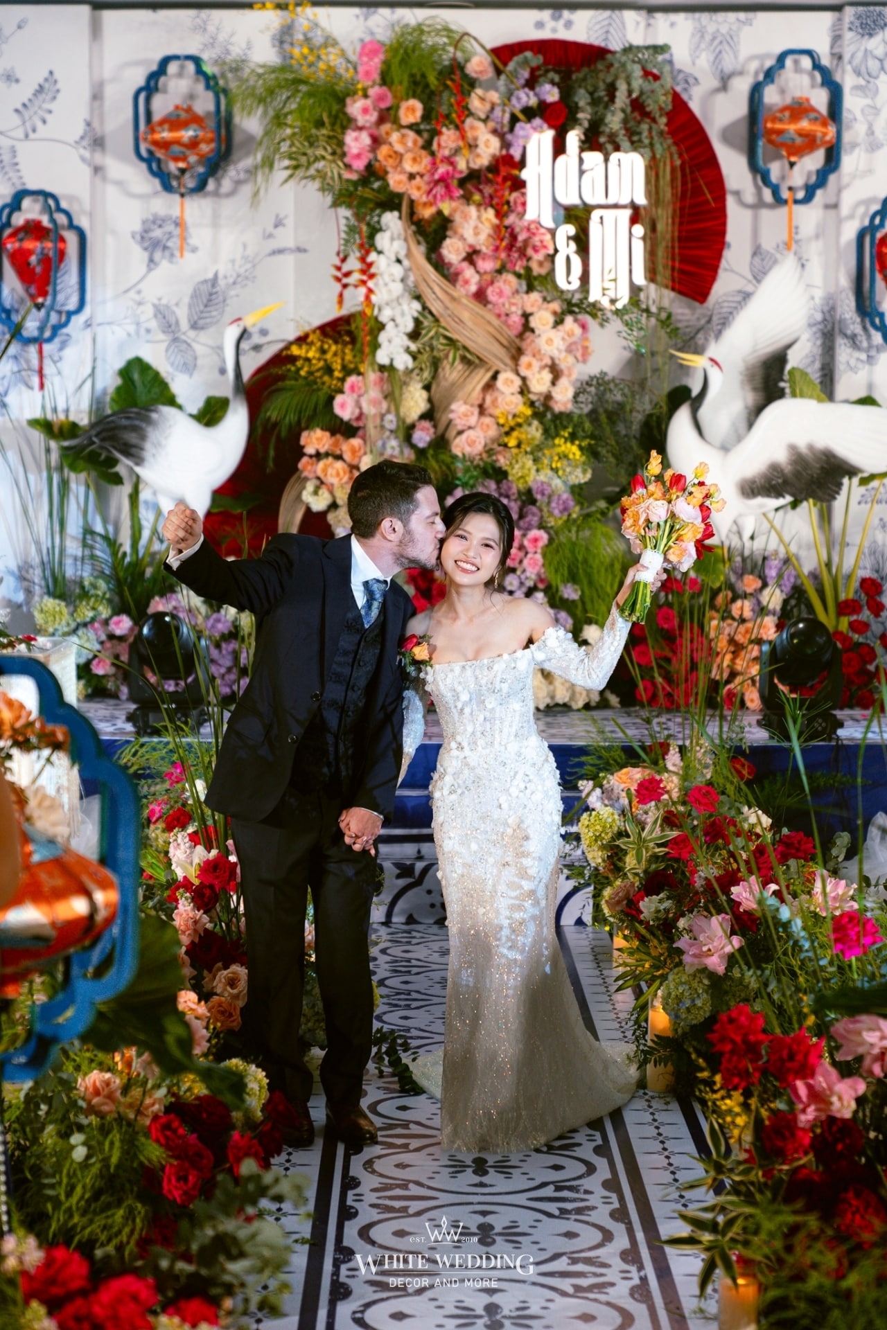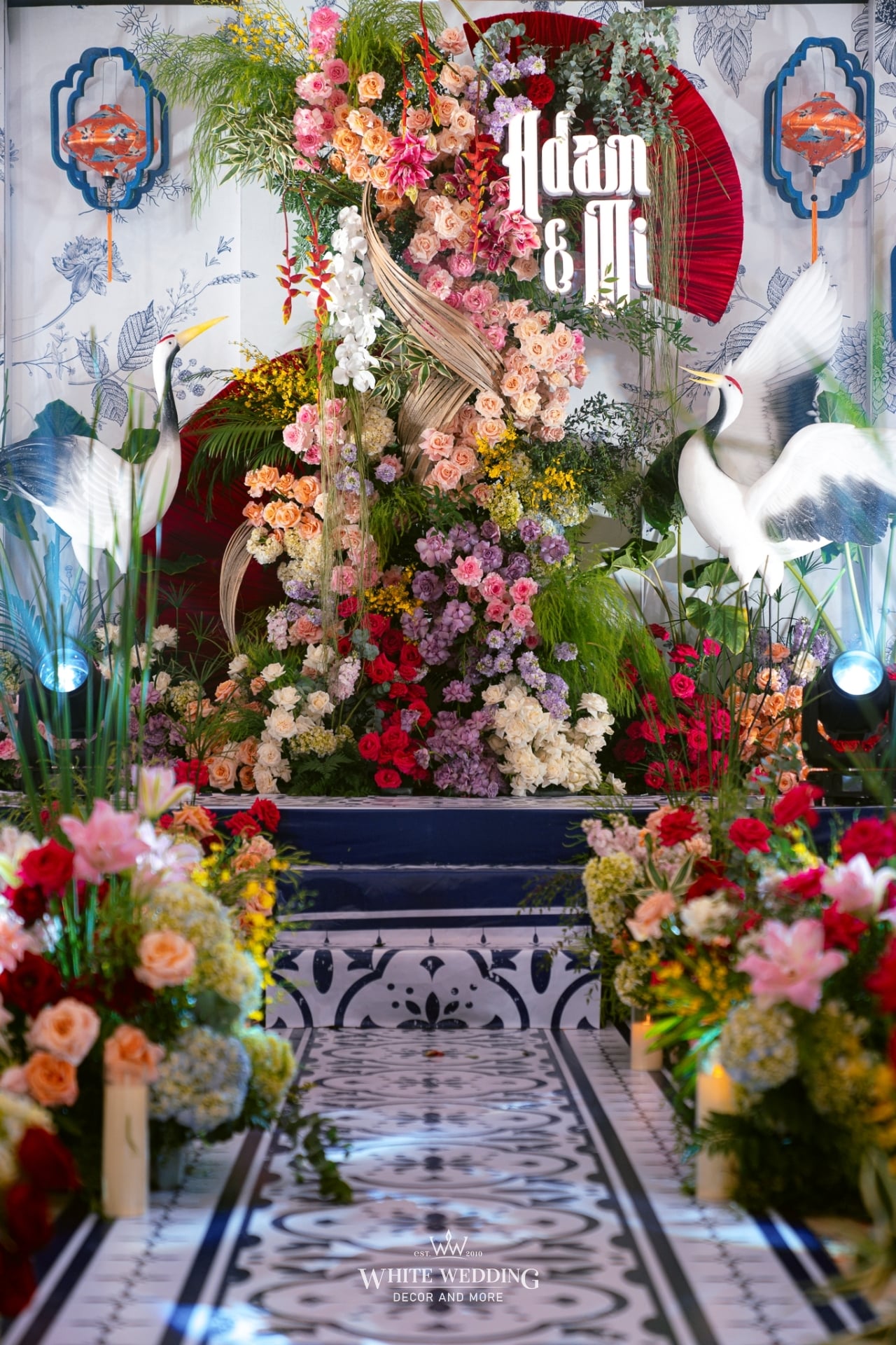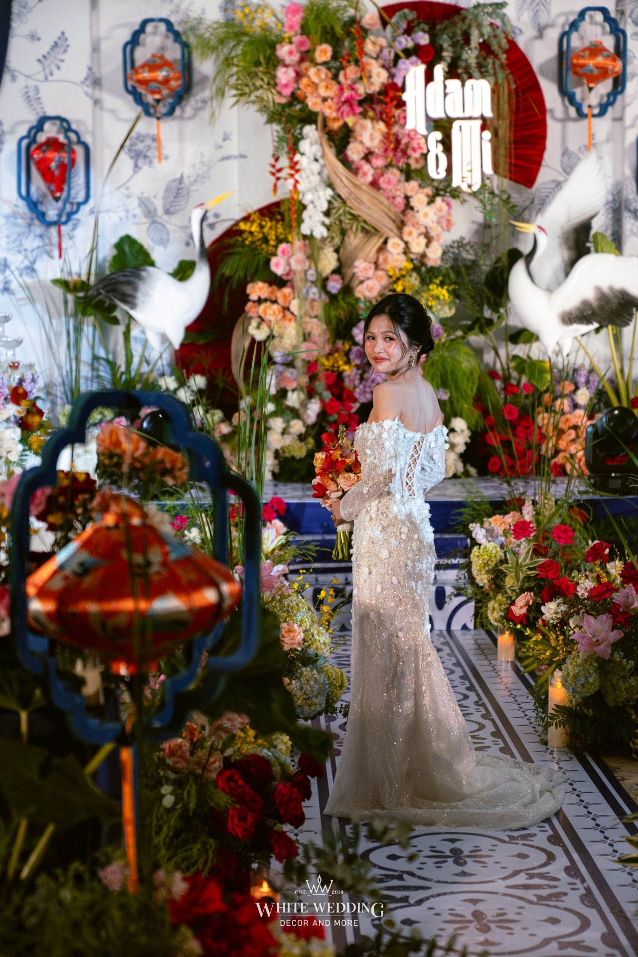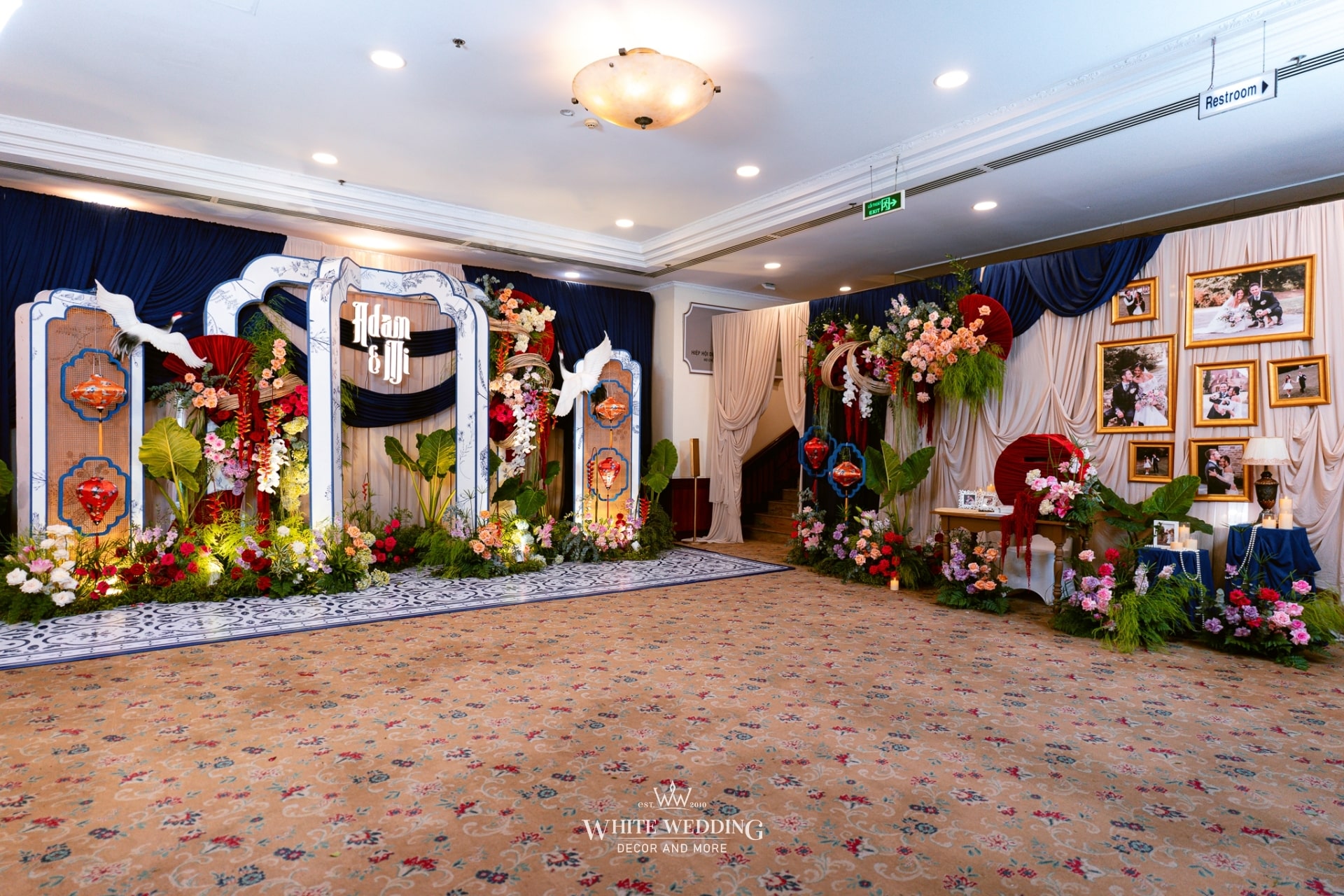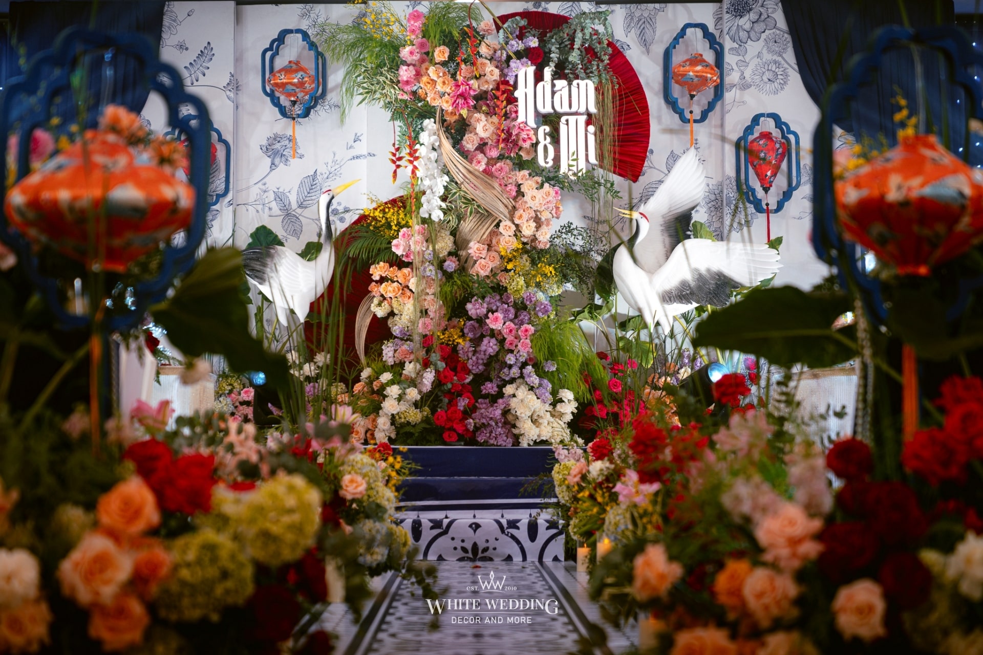 Dựa trên mong muốn của & về một không gian cưới mang hơi thở Indochine hiện đại, White Wedding đã phát triển concept với tông màu chủ đạo là xanh navy kết hợp tương phản cùng sắc đỏ velvet.
