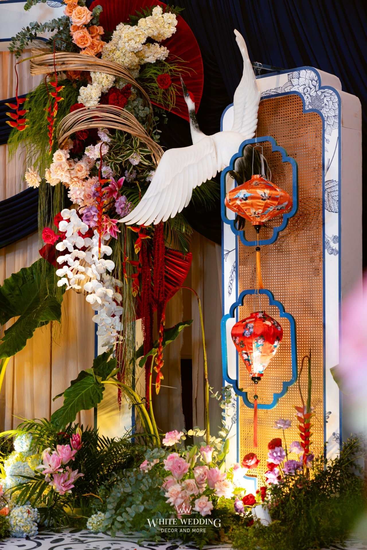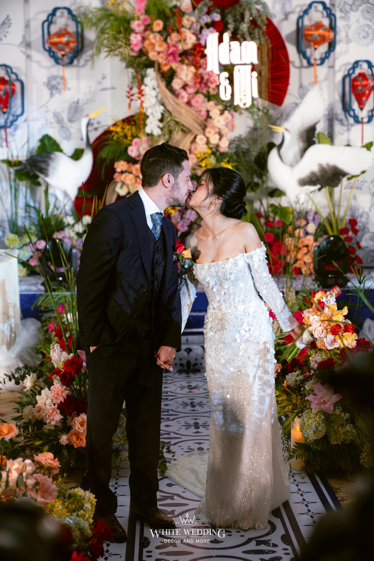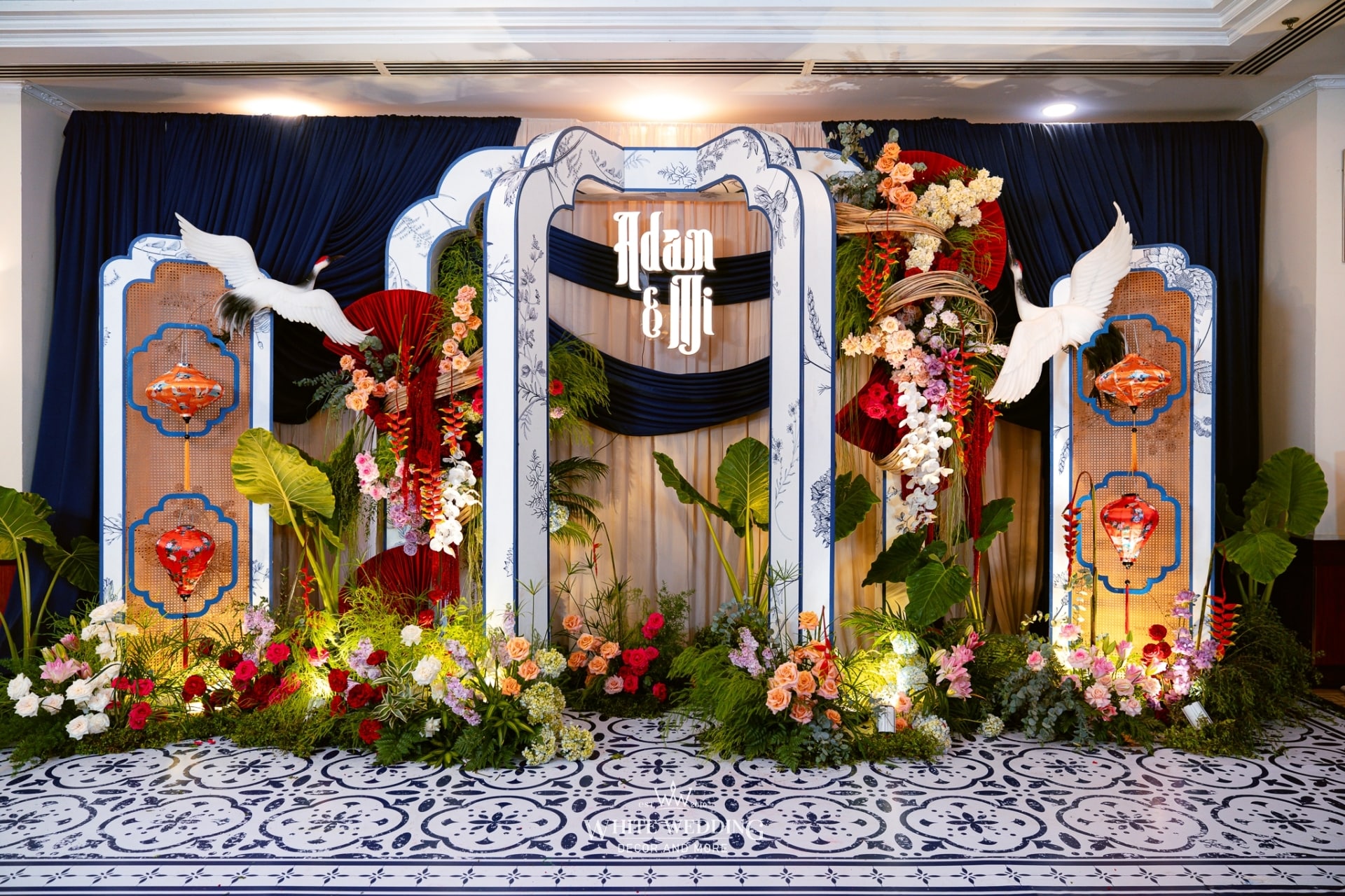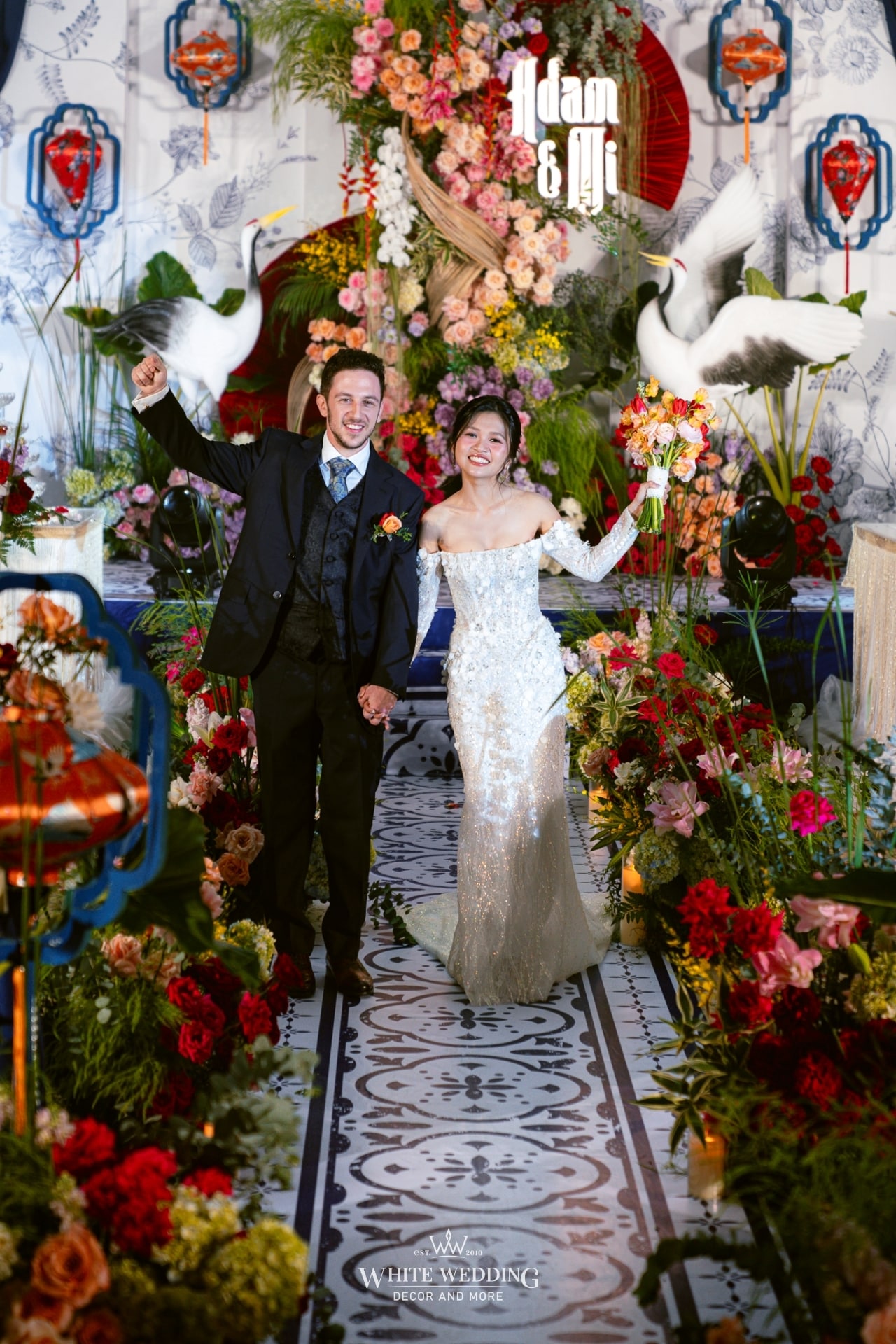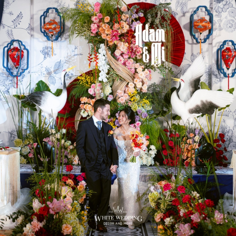Dựa trên mong muốn của & về một không gian cưới mang hơi thở Indochine hiện đại, White Wedding đã phát triển concept với tông màu chủ đạo là xanh navy kết hợp tương phản cùng sắc đỏ velvet.