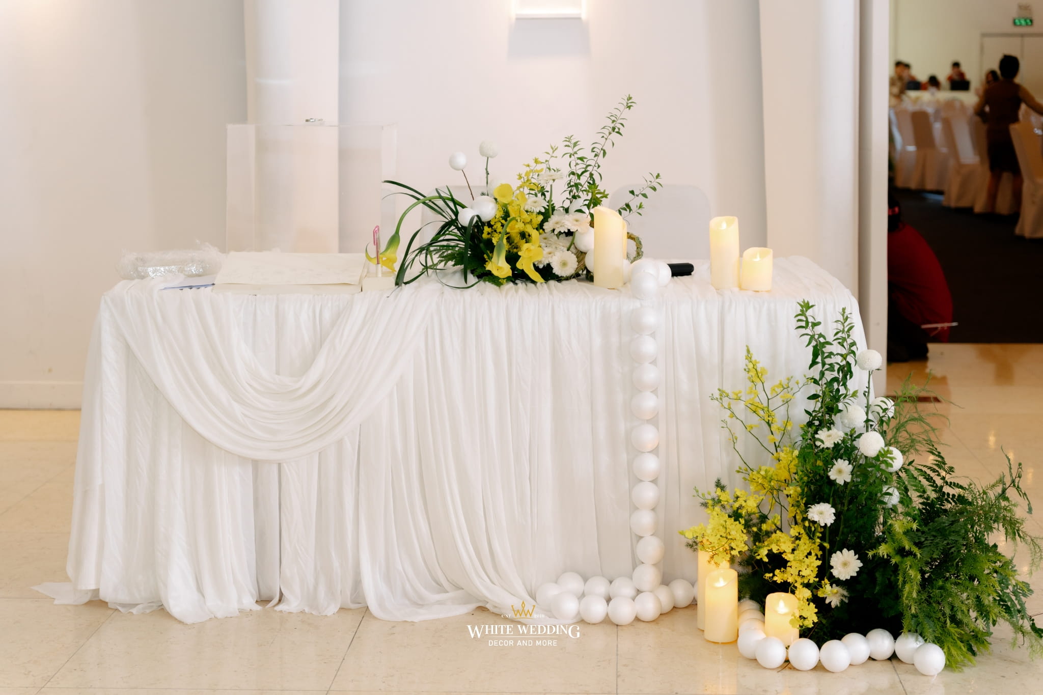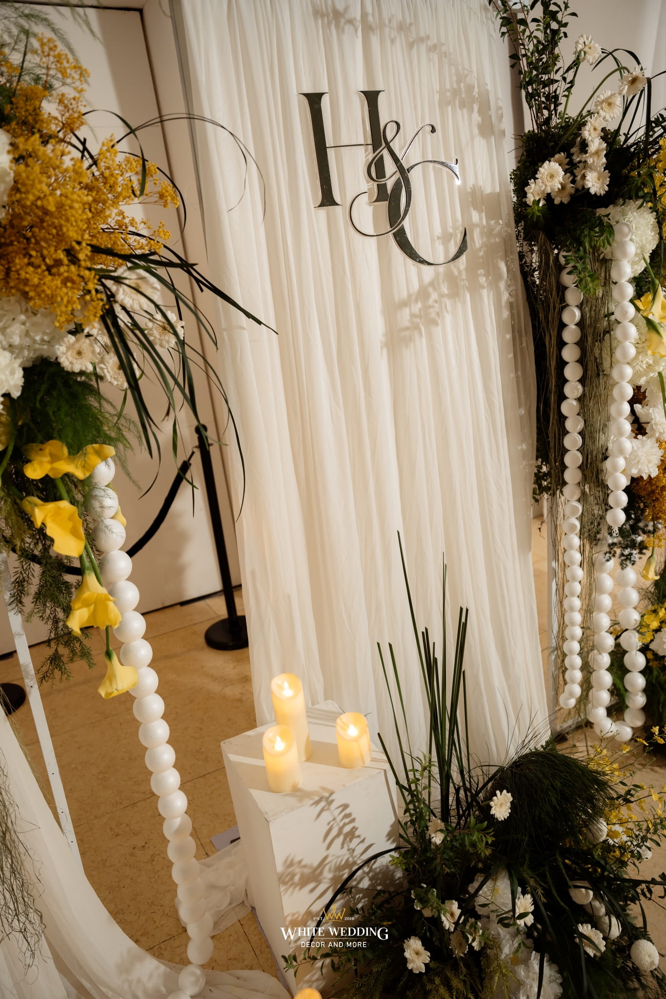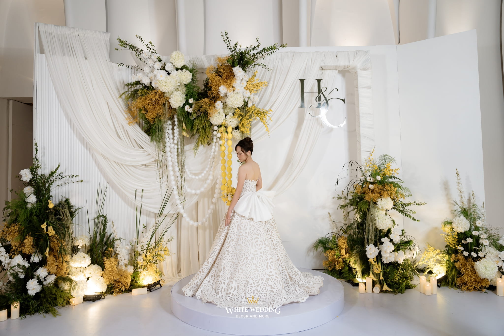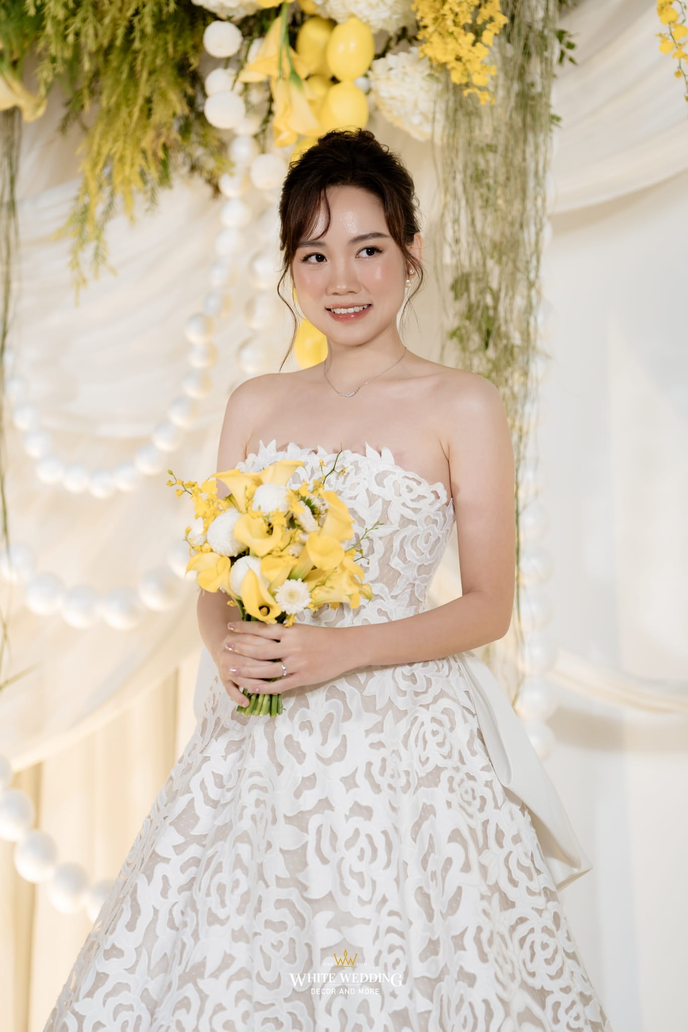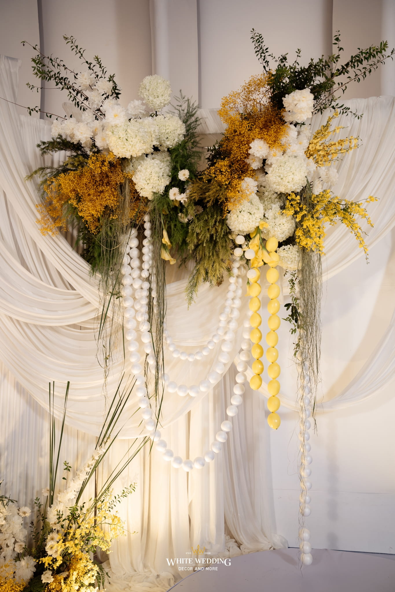 “Ivory Bloom” là concept được White Wedding kiến tạo với tone trắng chủ đạo, kết hợp cùng kỹ thuật xử lý vải mềm mại để tạo nên những lớp chuyển động nhẹ nhàng, ôm trọn khu vực sân khấu. Trên nền trắng ấy, sắc vàng được điểm xuyết tinh tế từ những quả chanh và hoa tươi, mang đến sự tươi mới nhưng vẫn giữ được nét trang nhã xuyên suốt tổng thể.