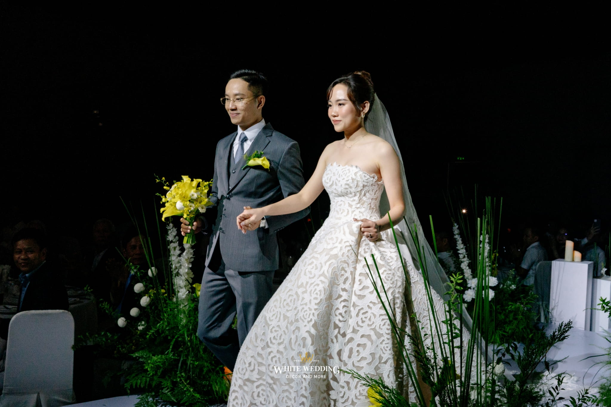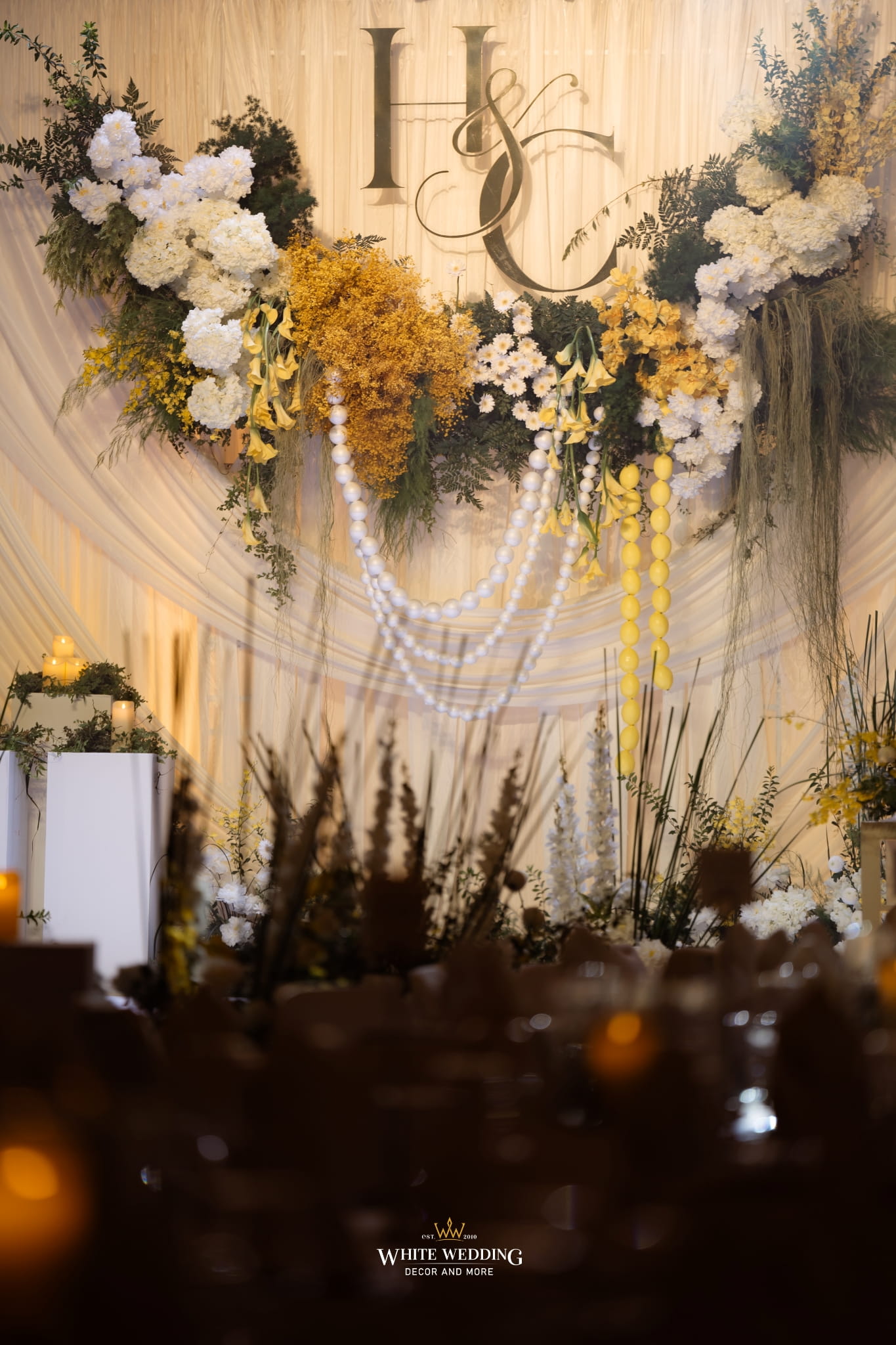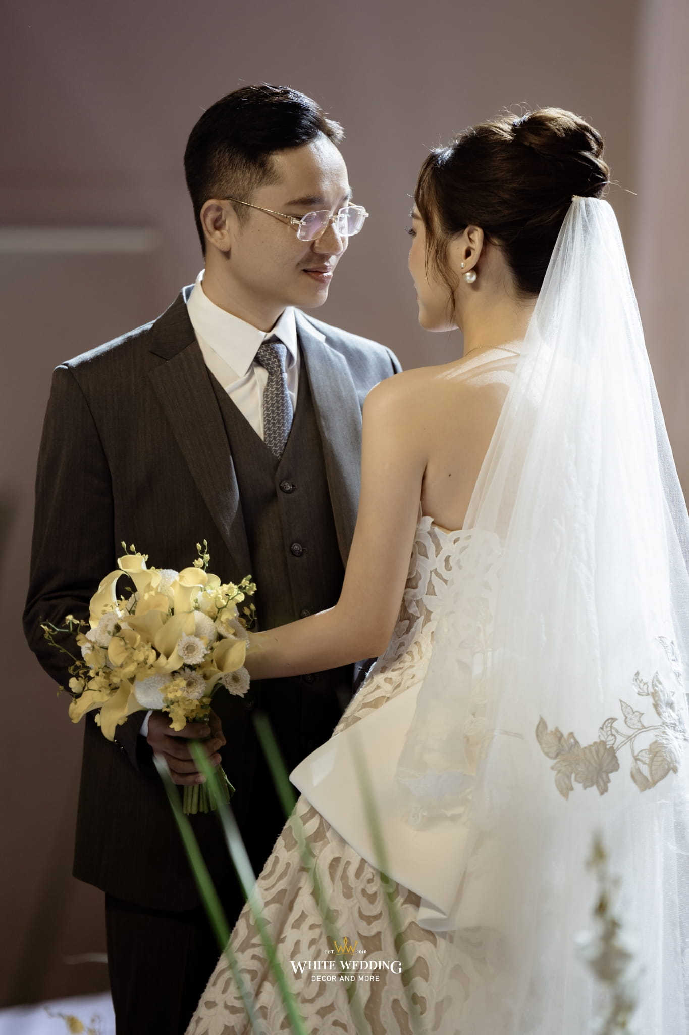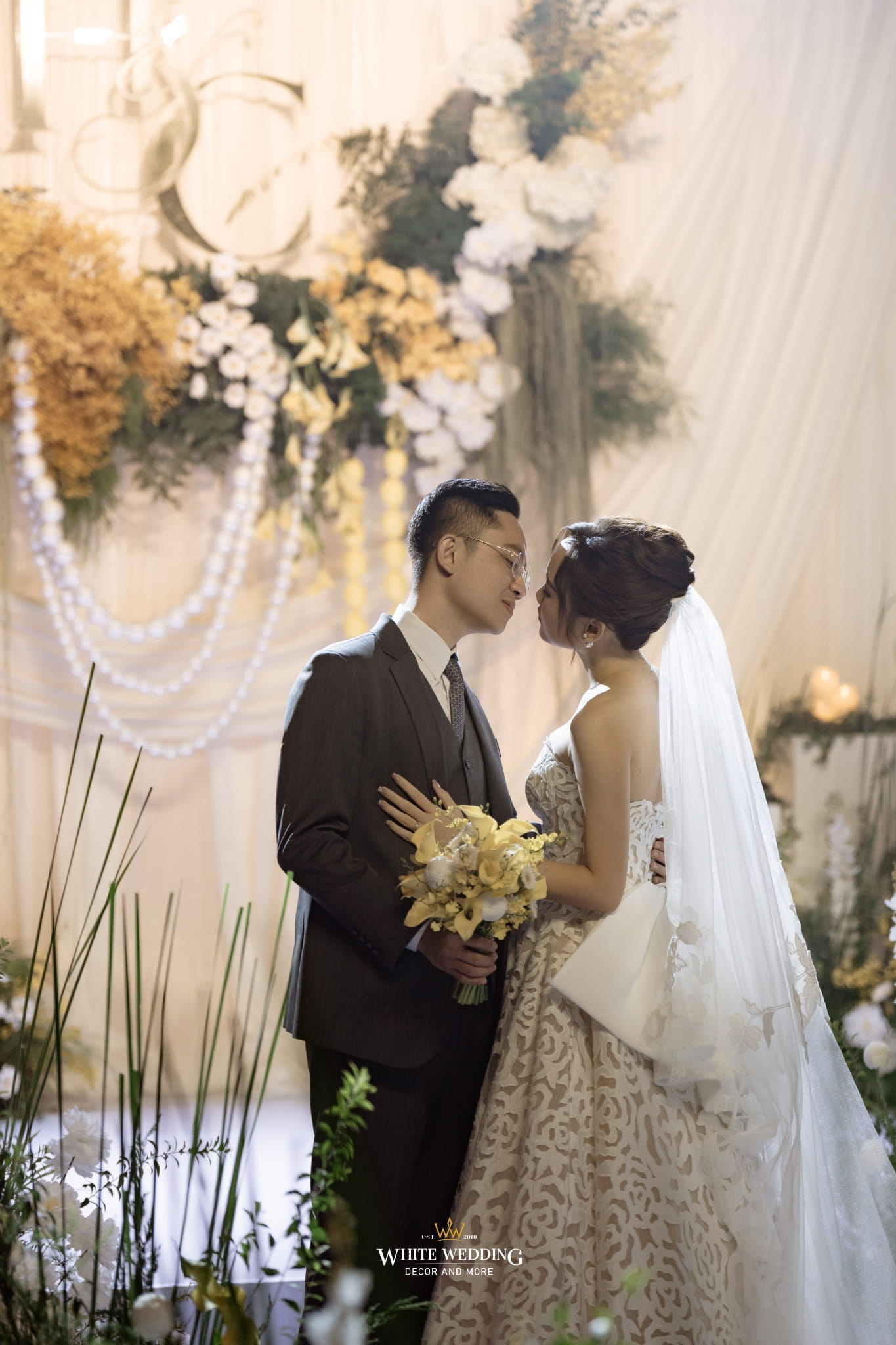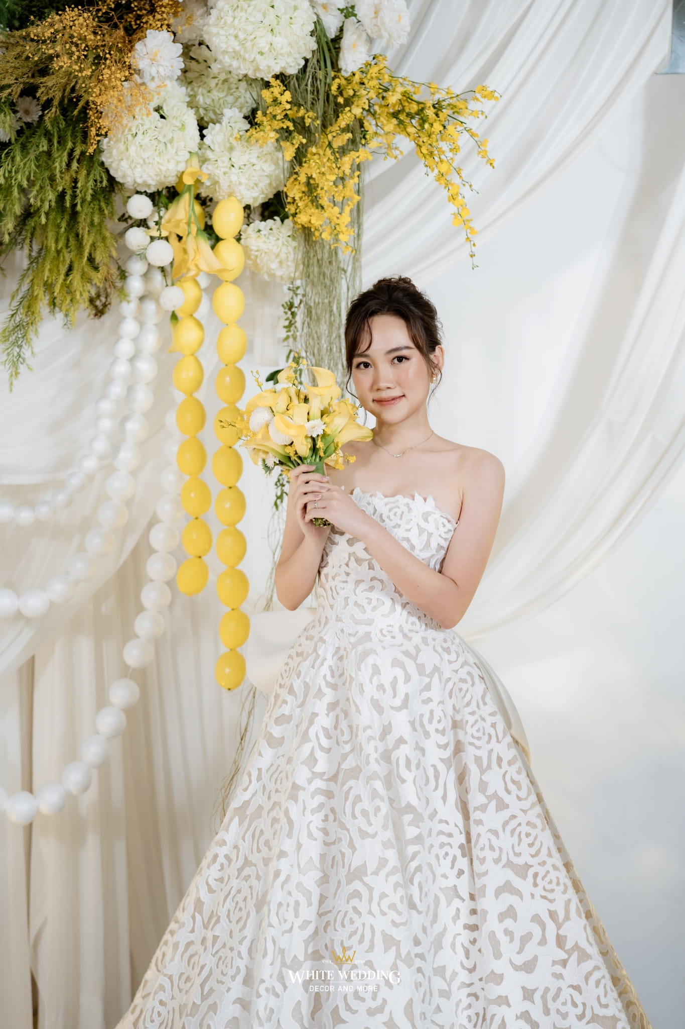 “Ivory Bloom” là concept được White Wedding kiến tạo với tone trắng chủ đạo, kết hợp cùng kỹ thuật xử lý vải mềm mại để tạo nên những lớp chuyển động nhẹ nhàng, ôm trọn khu vực sân khấu. Trên nền trắng ấy, sắc vàng được điểm xuyết tinh tế từ những quả chanh và hoa tươi, mang đến sự tươi mới nhưng vẫn giữ được nét trang nhã xuyên suốt tổng thể.
