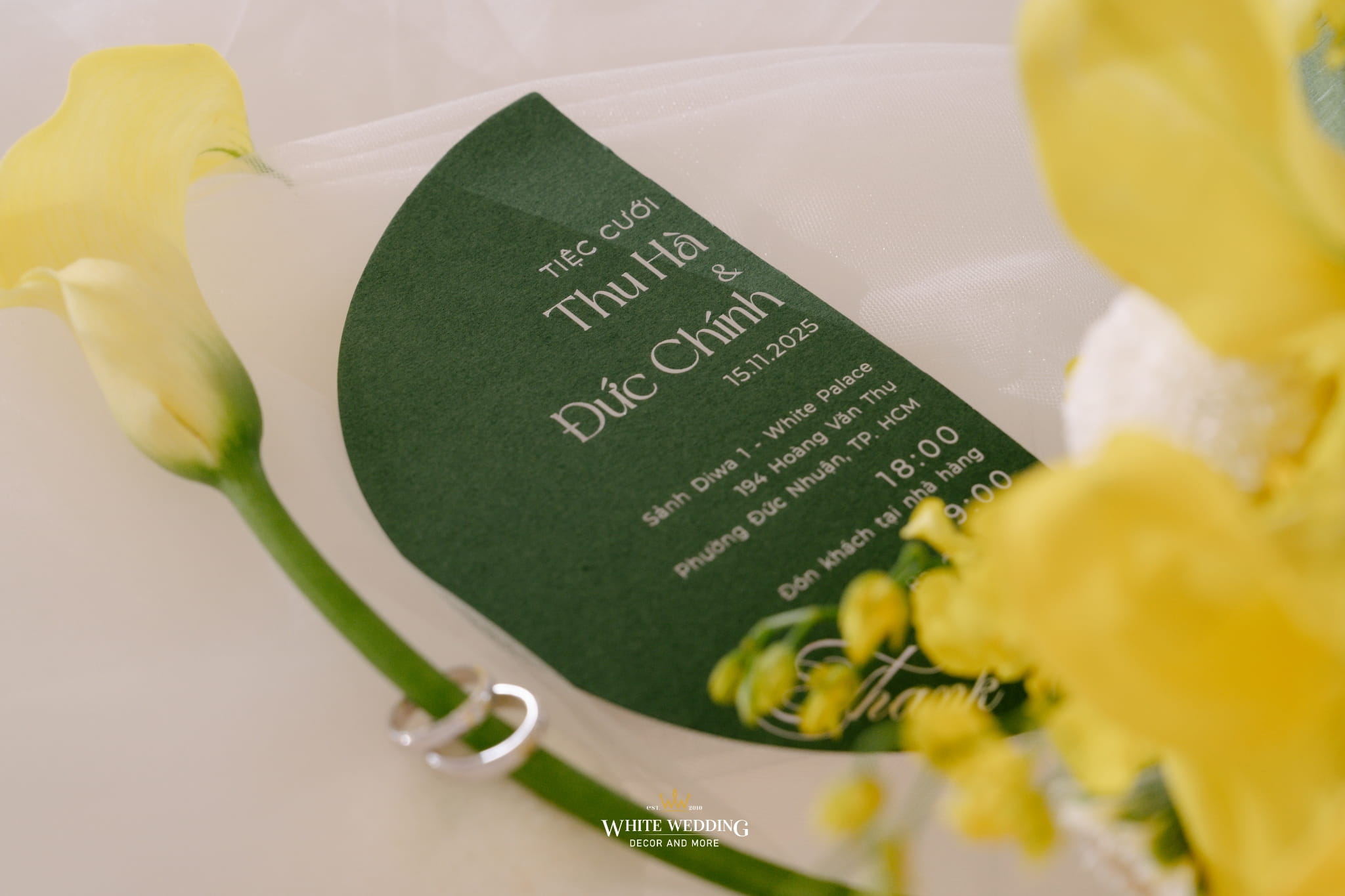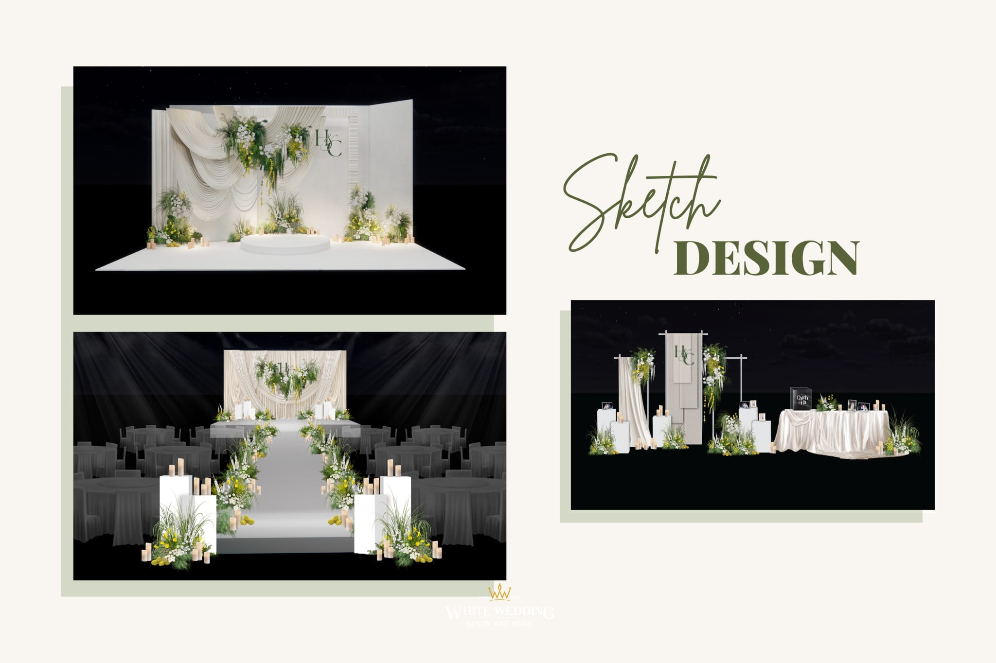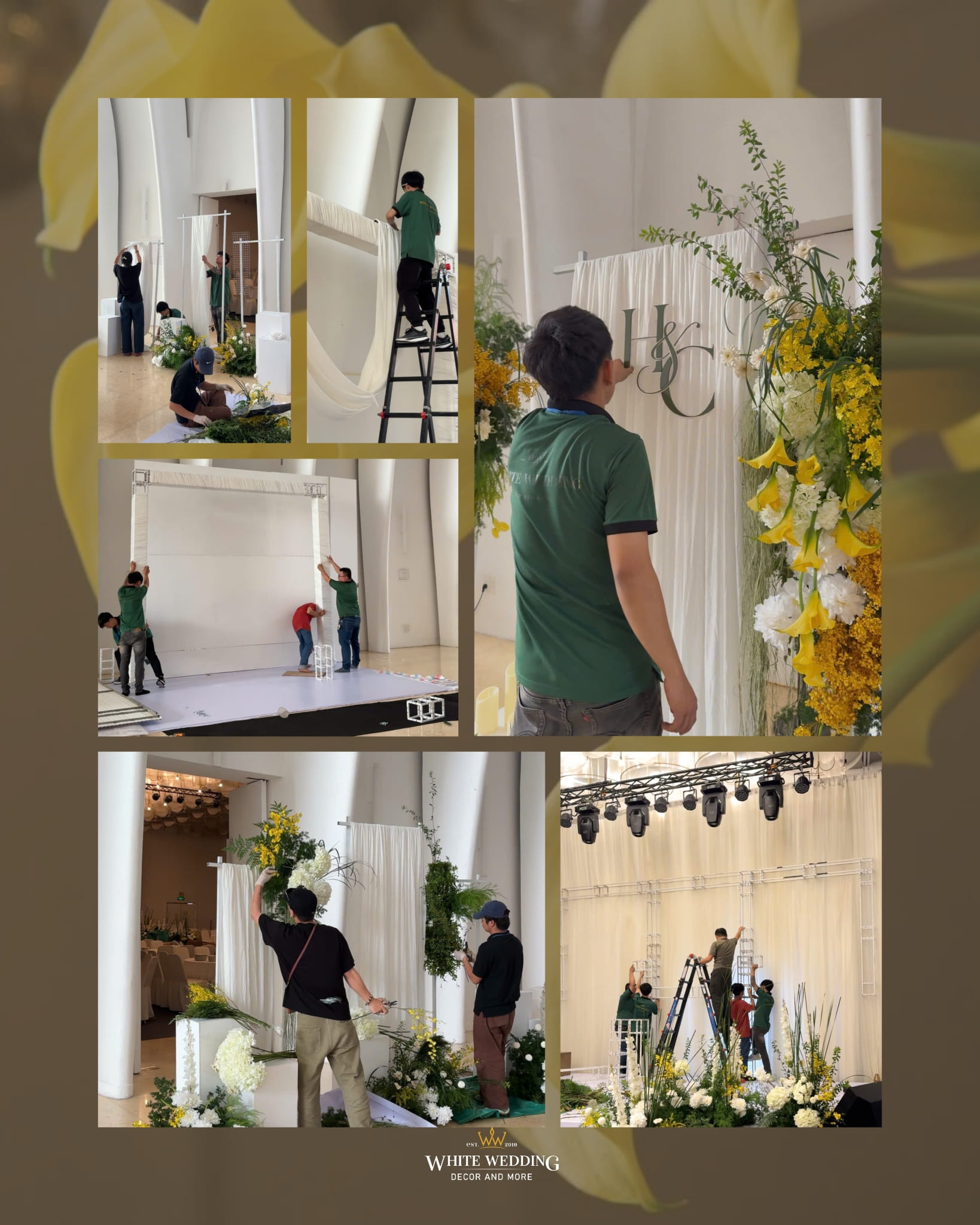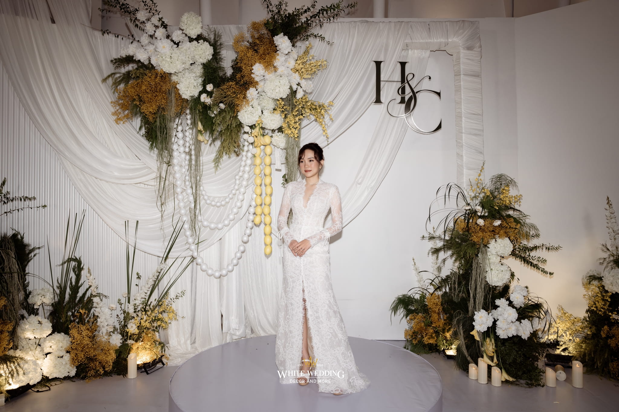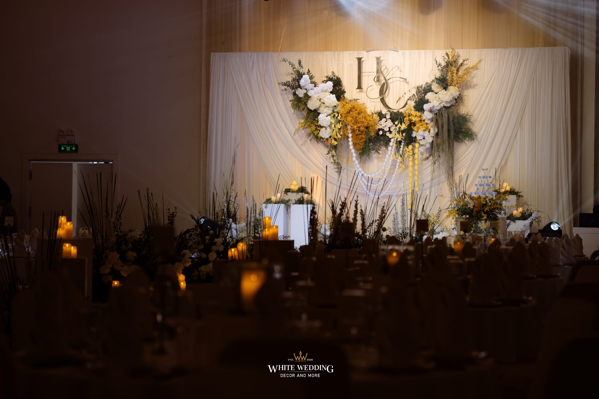 “Ivory Bloom” là concept được White Wedding kiến tạo với tone trắng chủ đạo, kết hợp cùng kỹ thuật xử lý vải mềm mại để tạo nên những lớp chuyển động nhẹ nhàng, ôm trọn khu vực sân khấu. Trên nền trắng ấy, sắc vàng được điểm xuyết tinh tế từ những quả chanh và hoa tươi, mang đến sự tươi mới nhưng vẫn giữ được nét trang nhã xuyên suốt tổng thể.