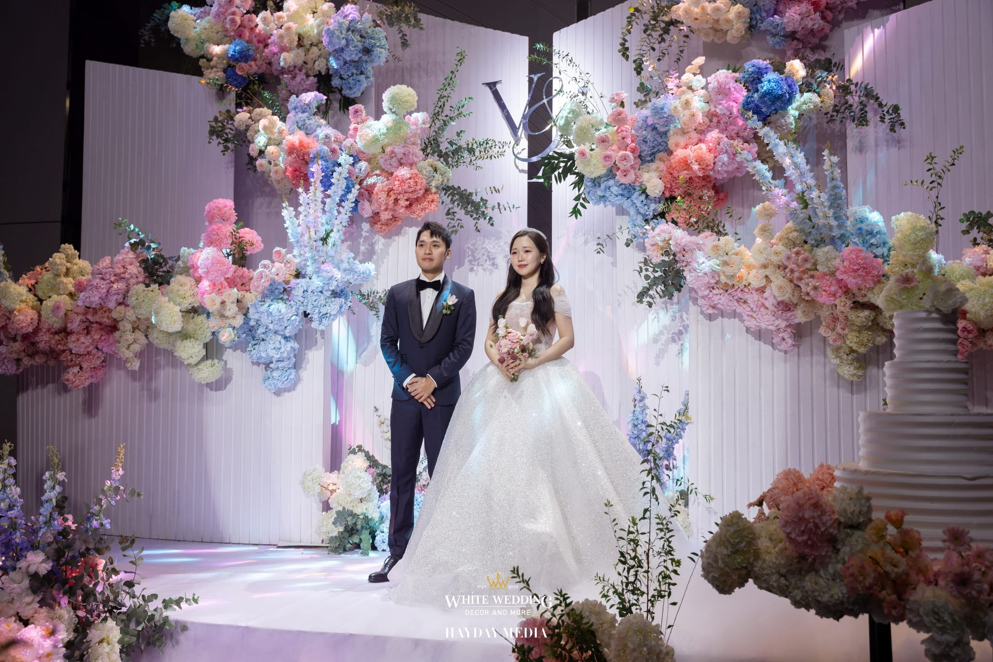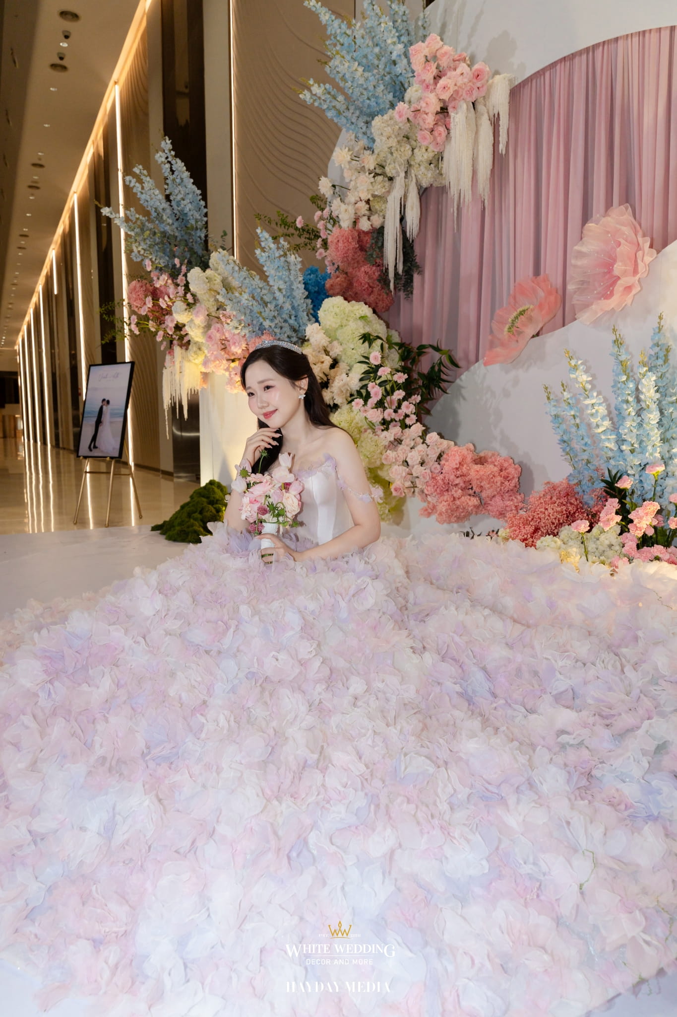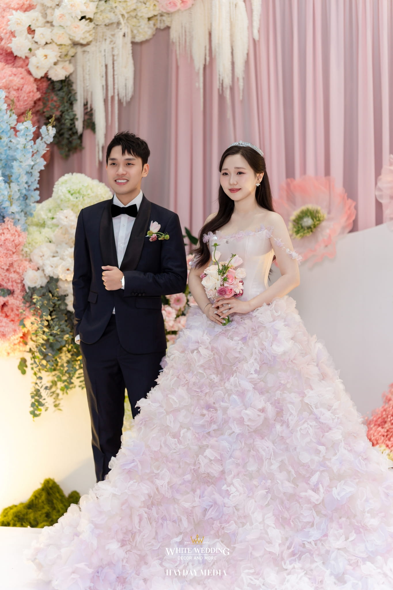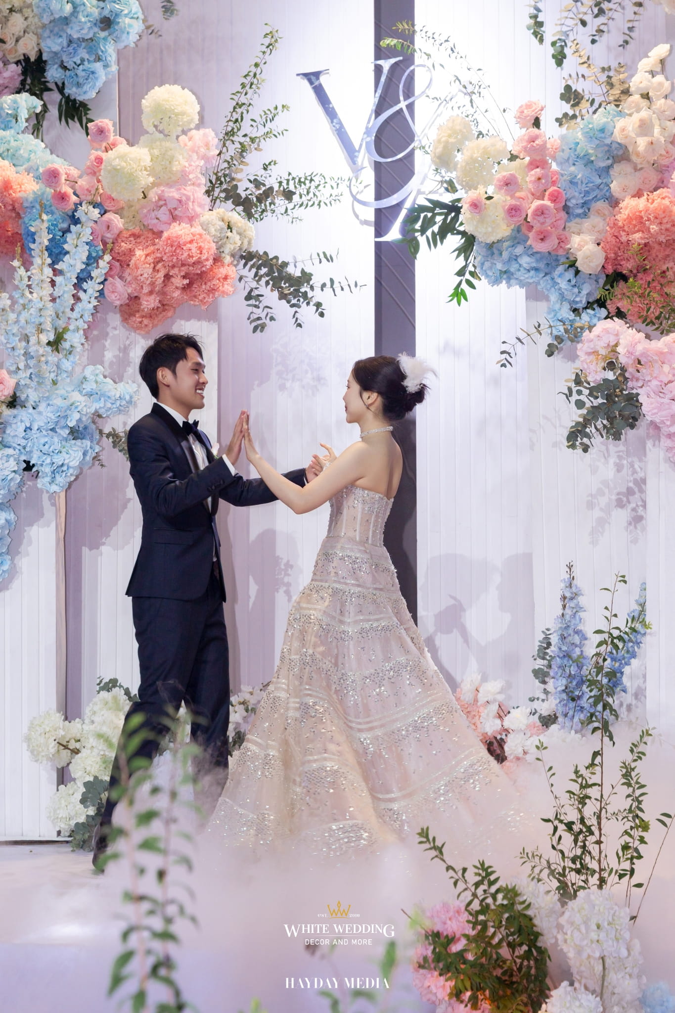 Lấy cảm hứng từ nét ngọt ngào trong tính cách của nàng dâu Jeong Ah, không gian lễ đường được phủ sắc hồng pastel dịu dàng, điểm xuyết chút xanh dương thanh thoát. Một bảng màu nhẹ nhàng nhưng vẫn đủ chiều sâu để tôn lên vẻ nữ tính và tinh tế.