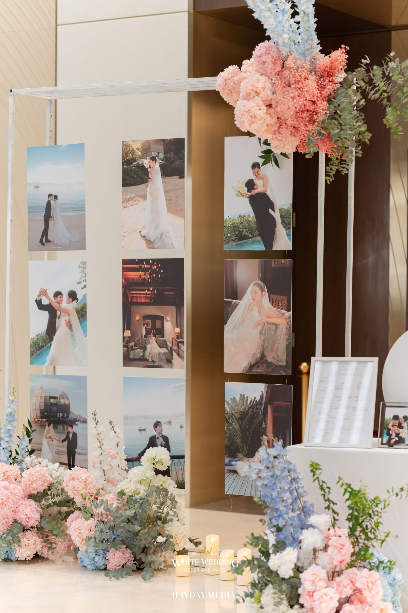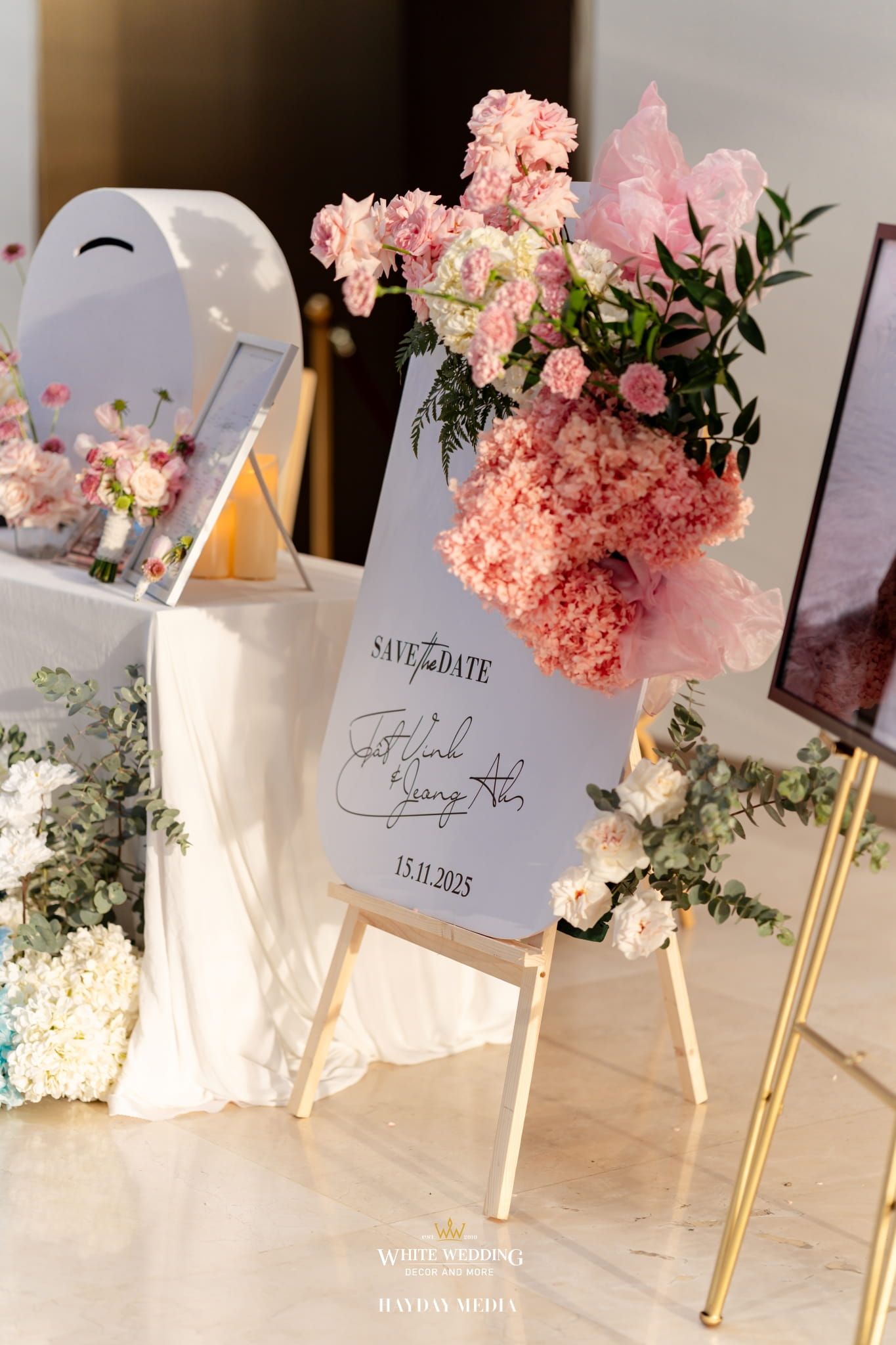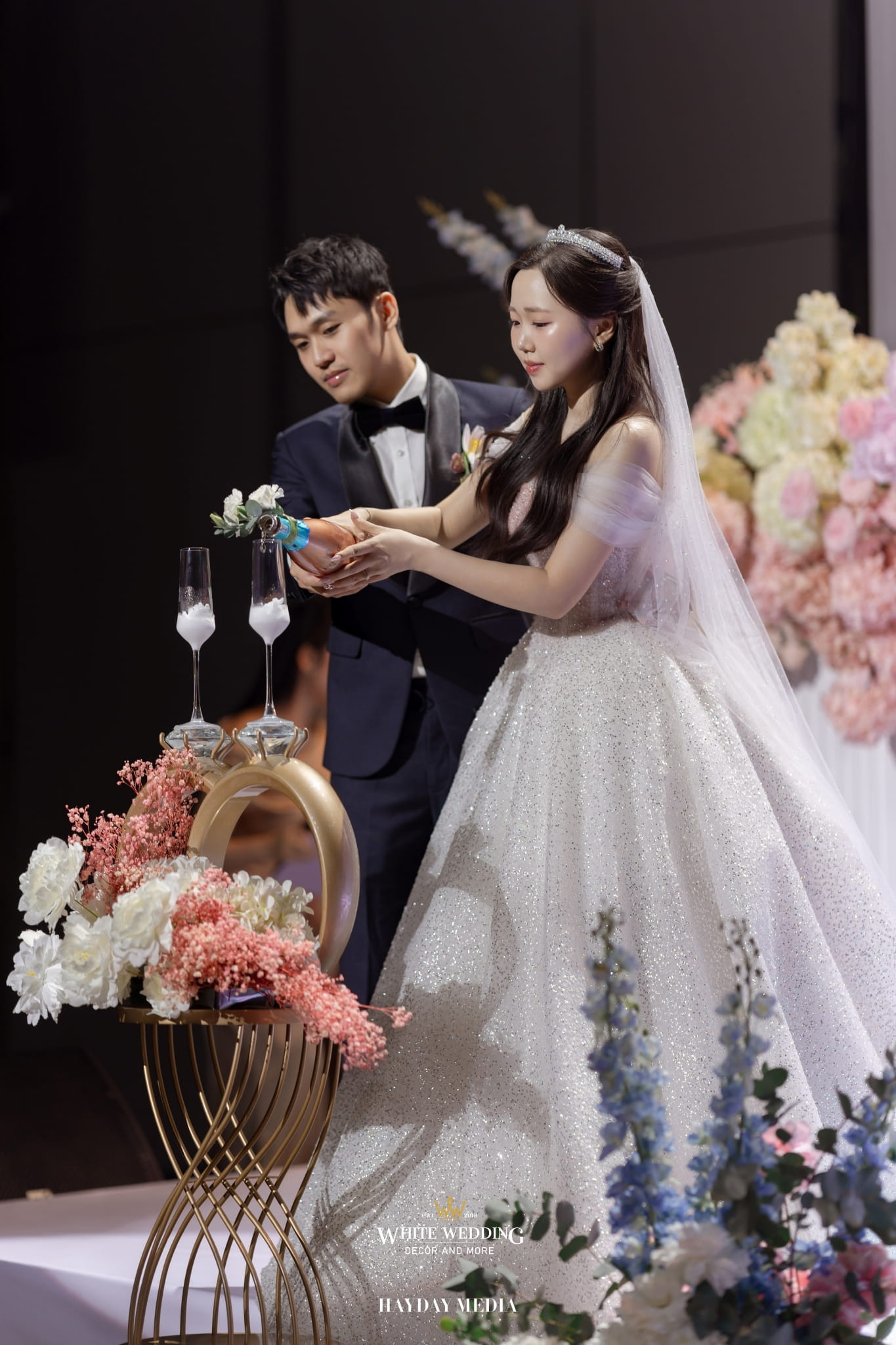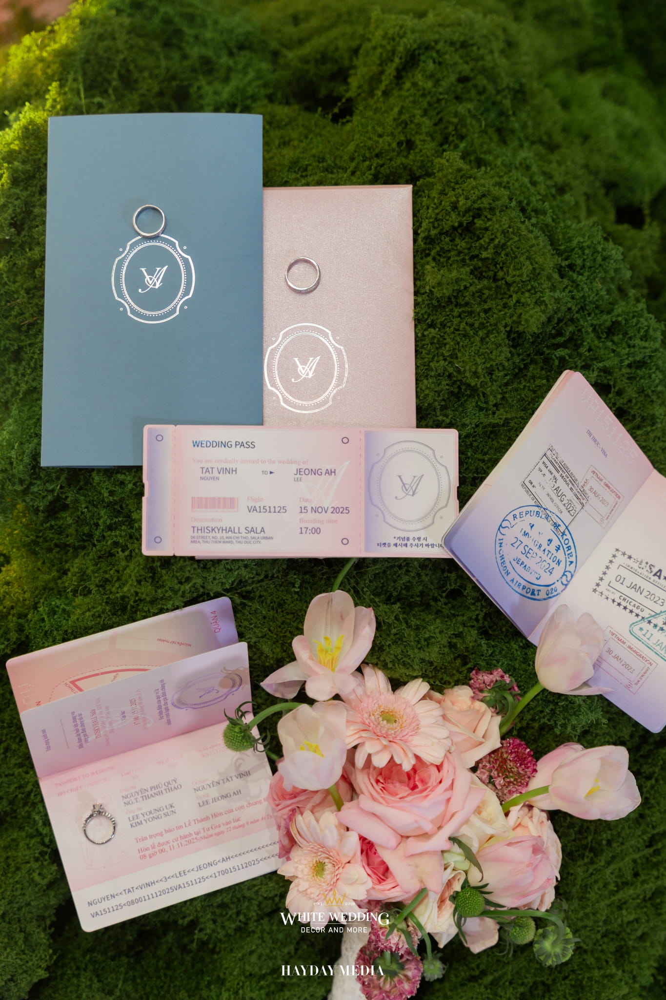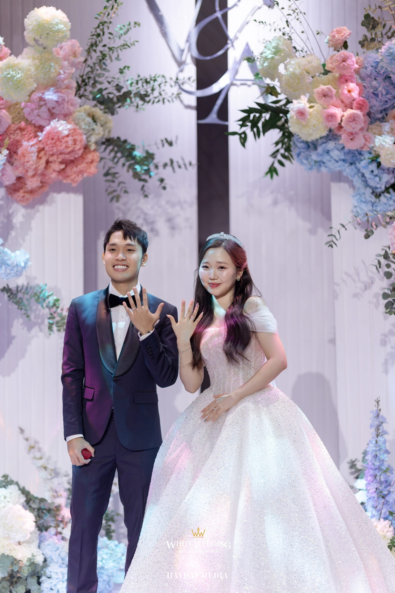 Lấy cảm hứng từ nét ngọt ngào trong tính cách của nàng dâu Jeong Ah, không gian lễ đường được phủ sắc hồng pastel dịu dàng, điểm xuyết chút xanh dương thanh thoát. Một bảng màu nhẹ nhàng nhưng vẫn đủ chiều sâu để tôn lên vẻ nữ tính và tinh tế.