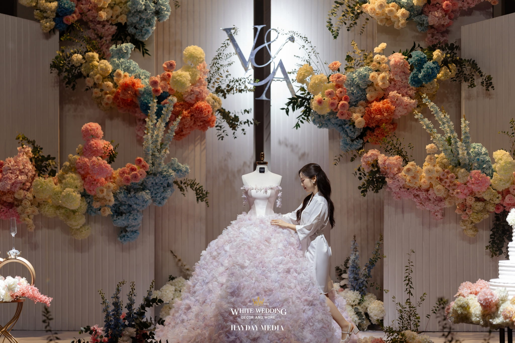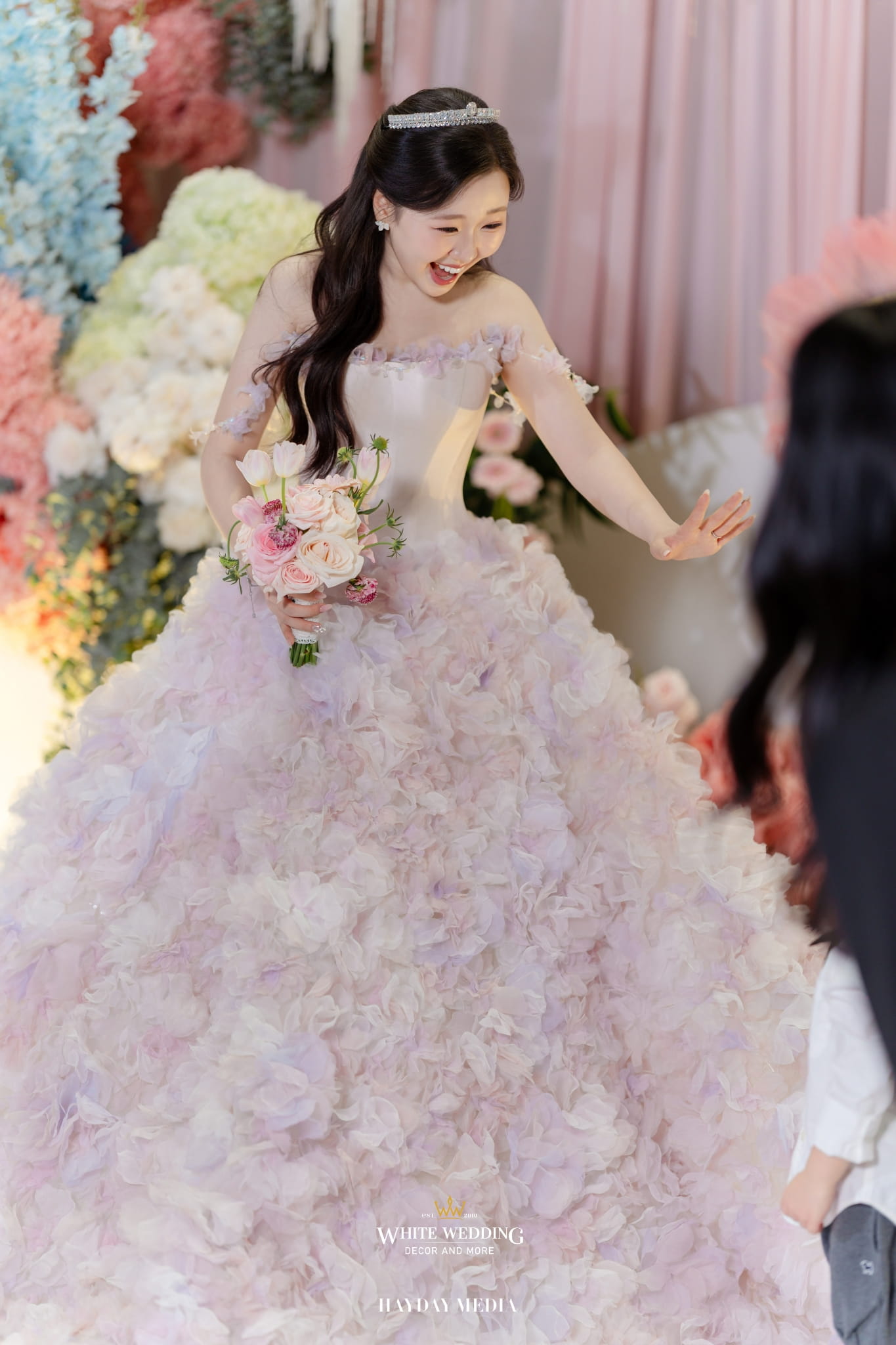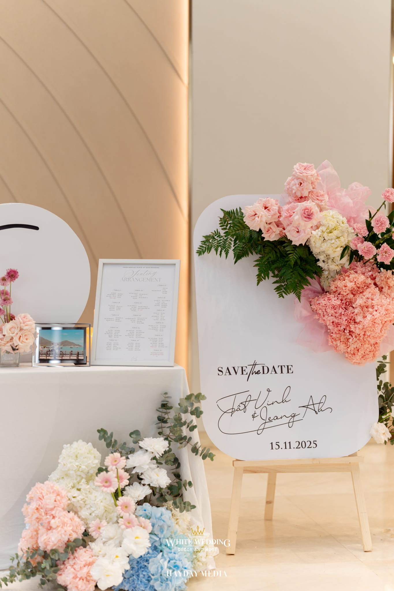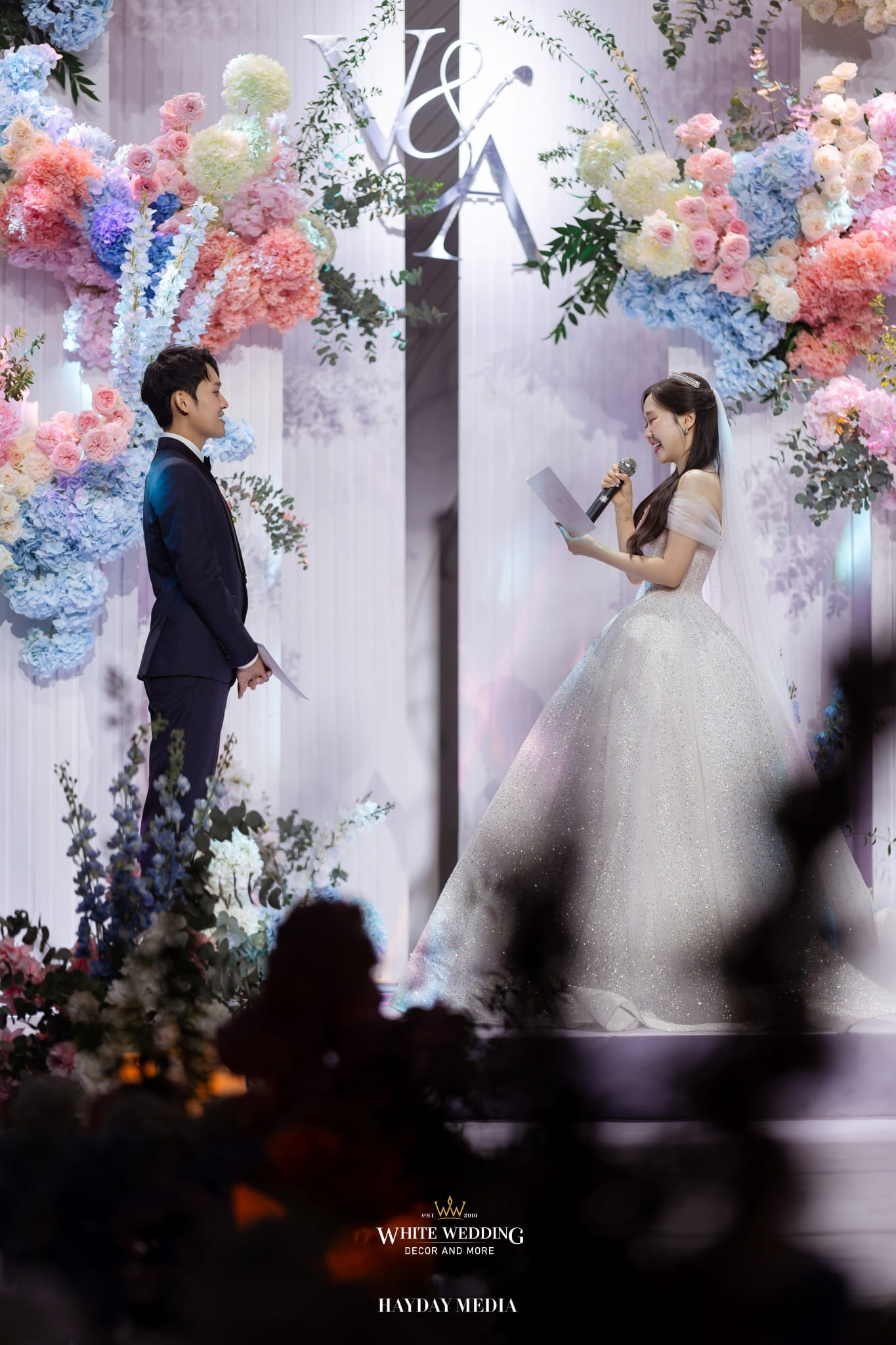 Lấy cảm hứng từ nét ngọt ngào trong tính cách của nàng dâu Jeong Ah, không gian lễ đường được phủ sắc hồng pastel dịu dàng, điểm xuyết chút xanh dương thanh thoát. Một bảng màu nhẹ nhàng nhưng vẫn đủ chiều sâu để tôn lên vẻ nữ tính và tinh tế.