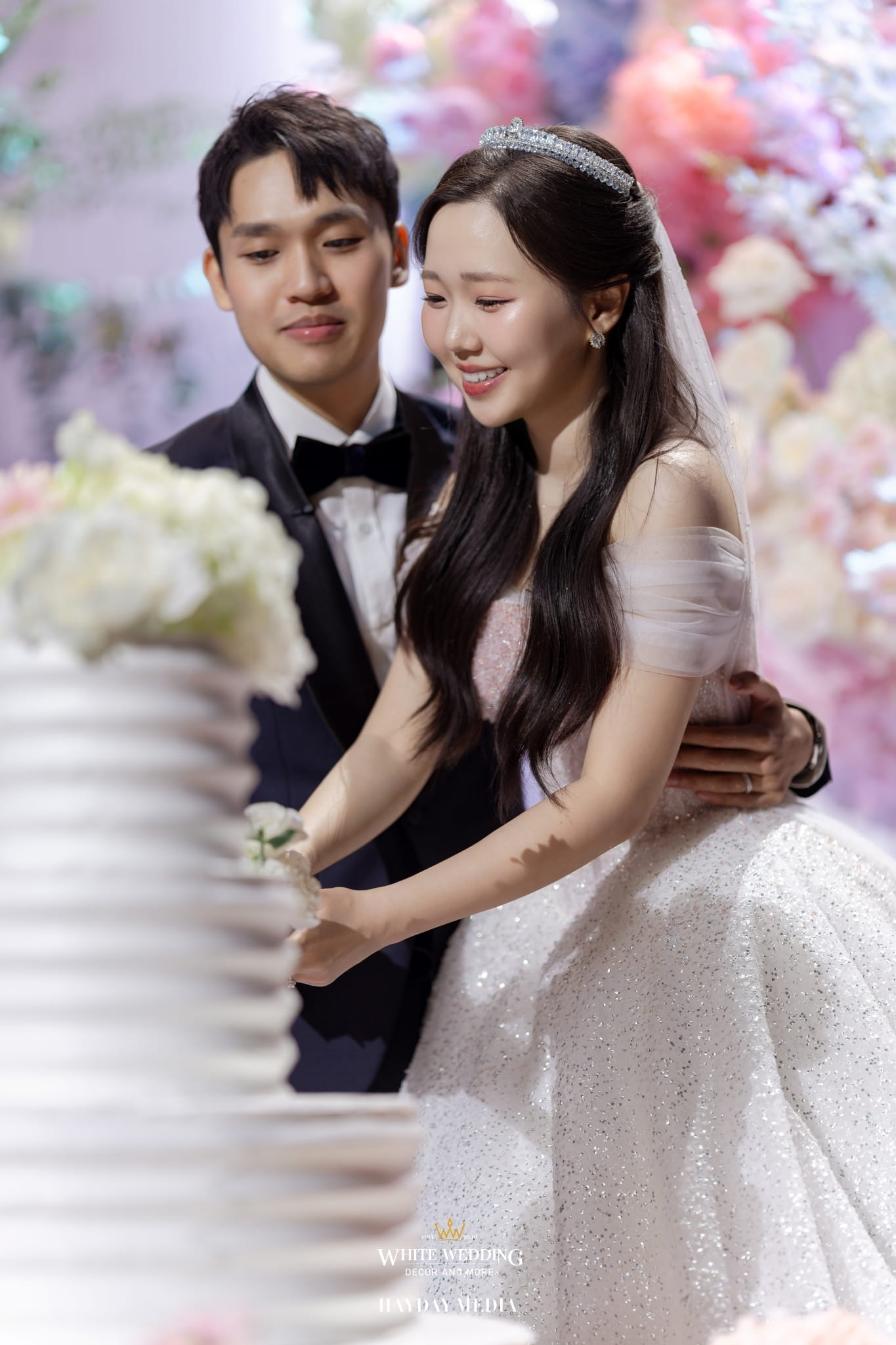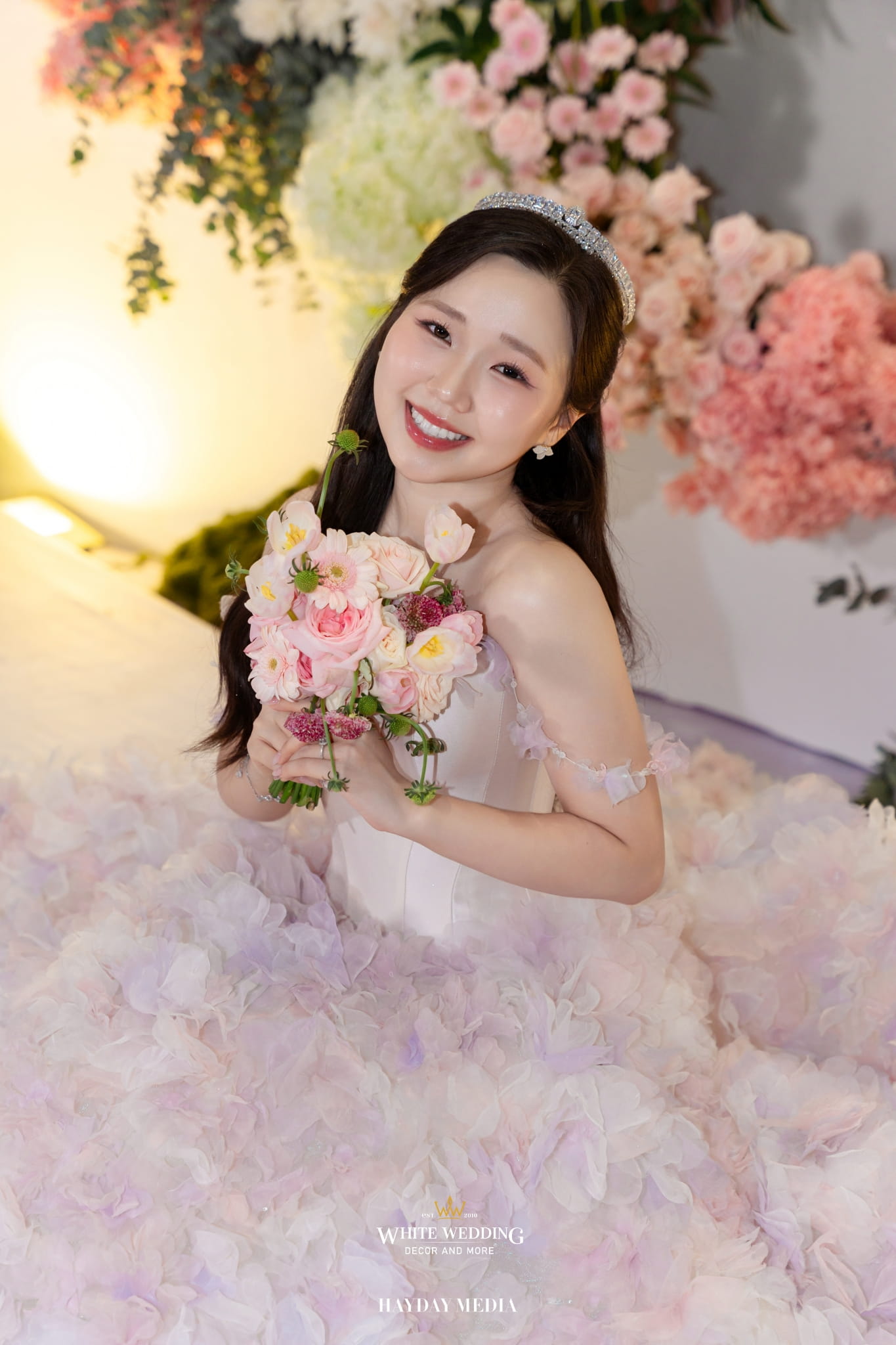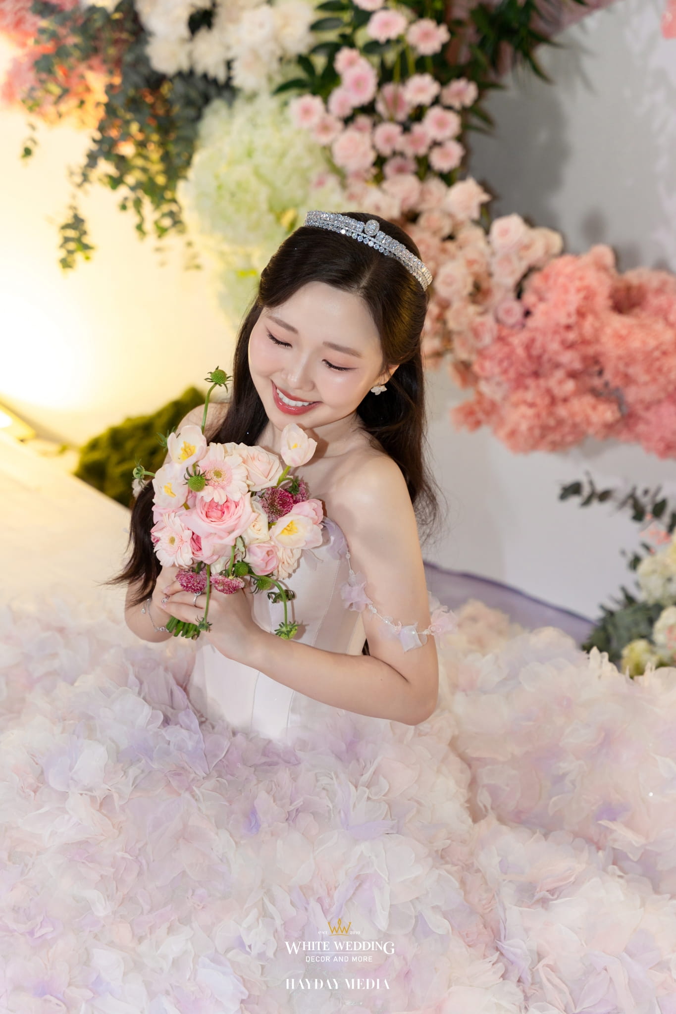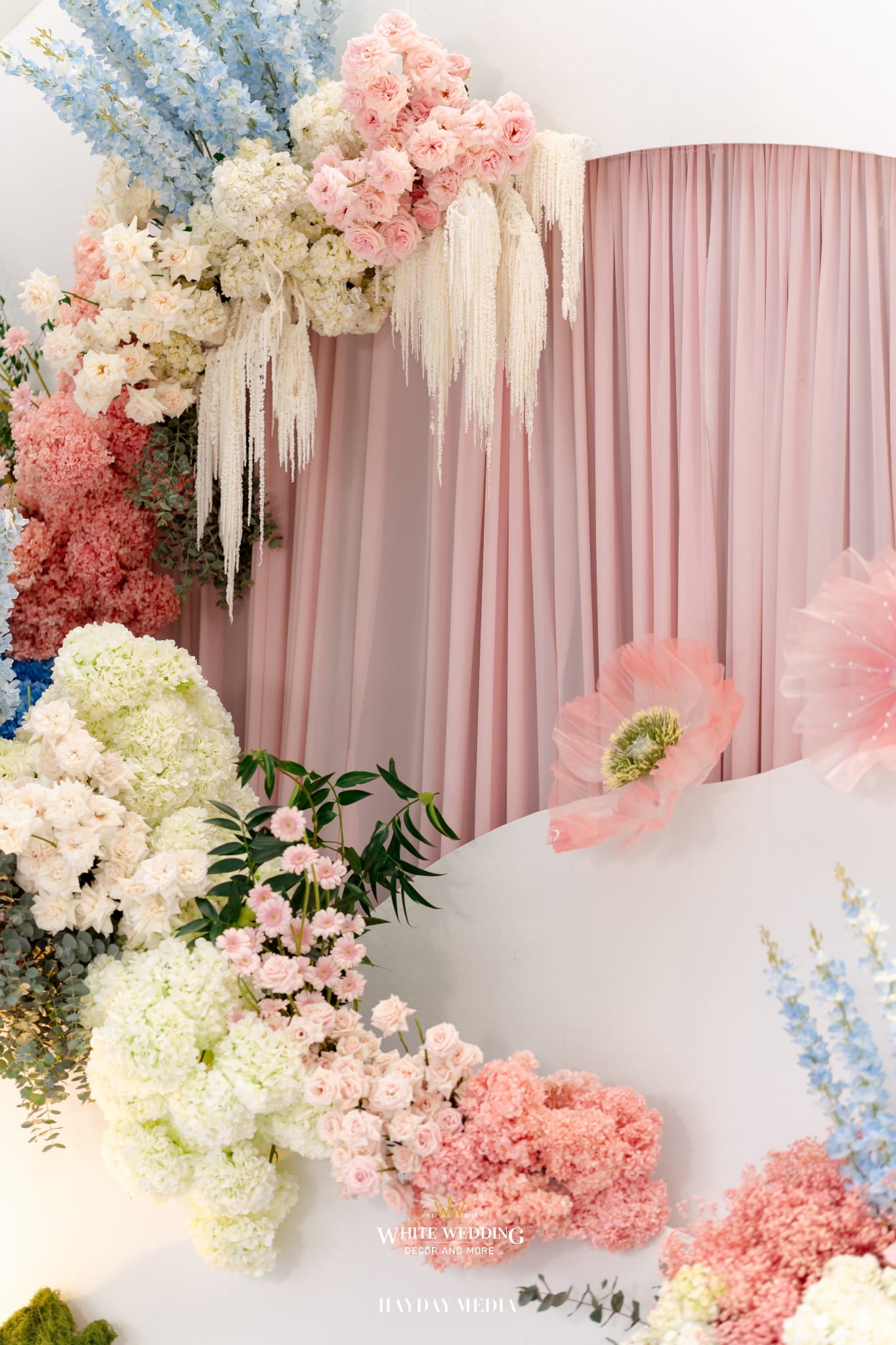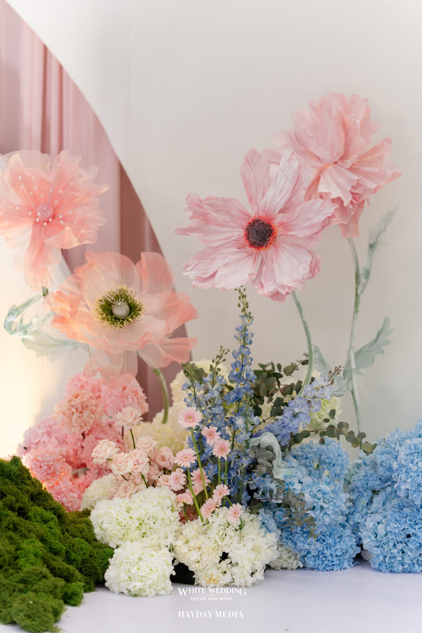 Lấy cảm hứng từ nét ngọt ngào trong tính cách của nàng dâu Jeong Ah, không gian lễ đường được phủ sắc hồng pastel dịu dàng, điểm xuyết chút xanh dương thanh thoát. Một bảng màu nhẹ nhàng nhưng vẫn đủ chiều sâu để tôn lên vẻ nữ tính và tinh tế.