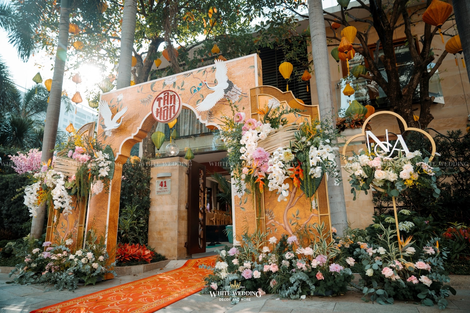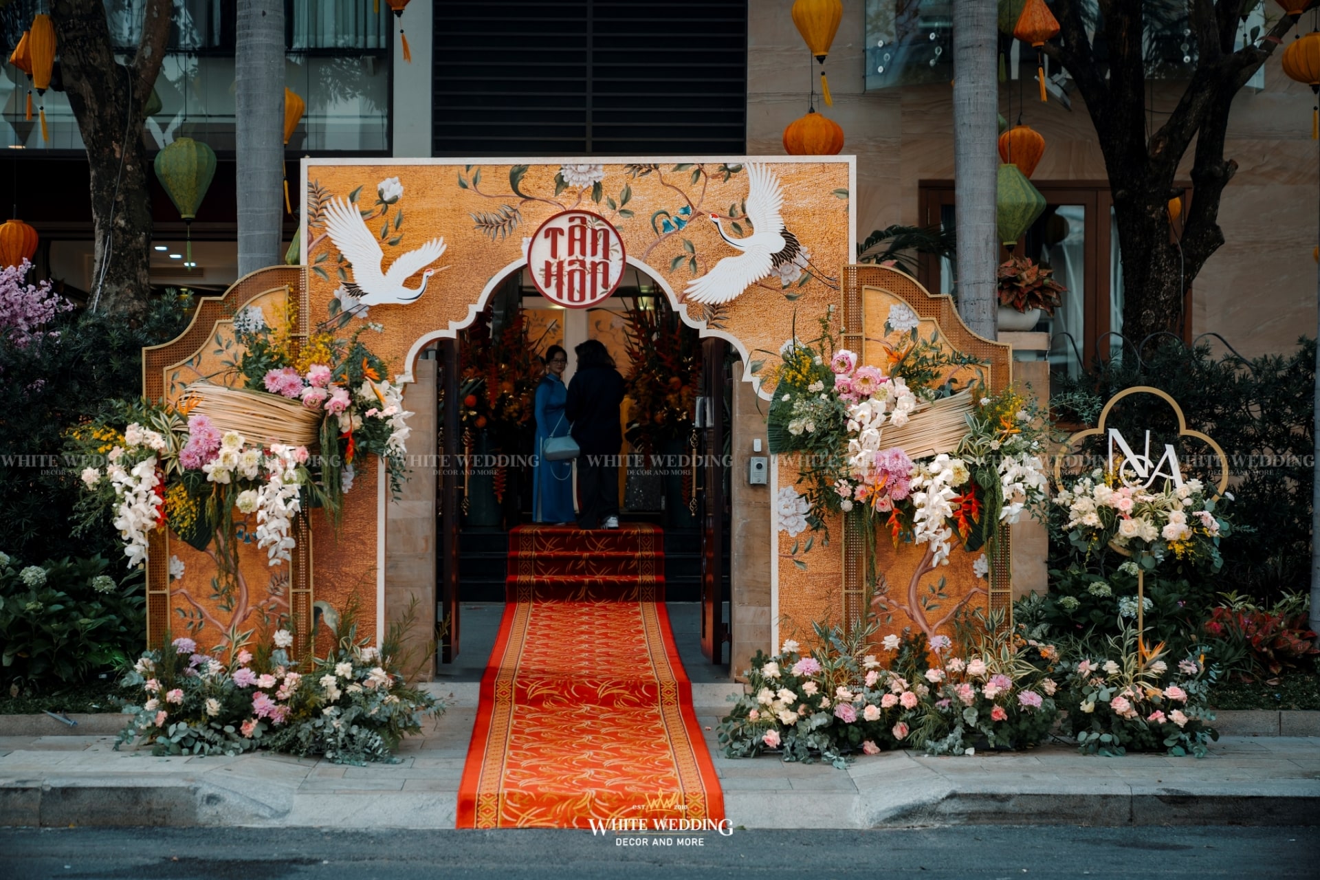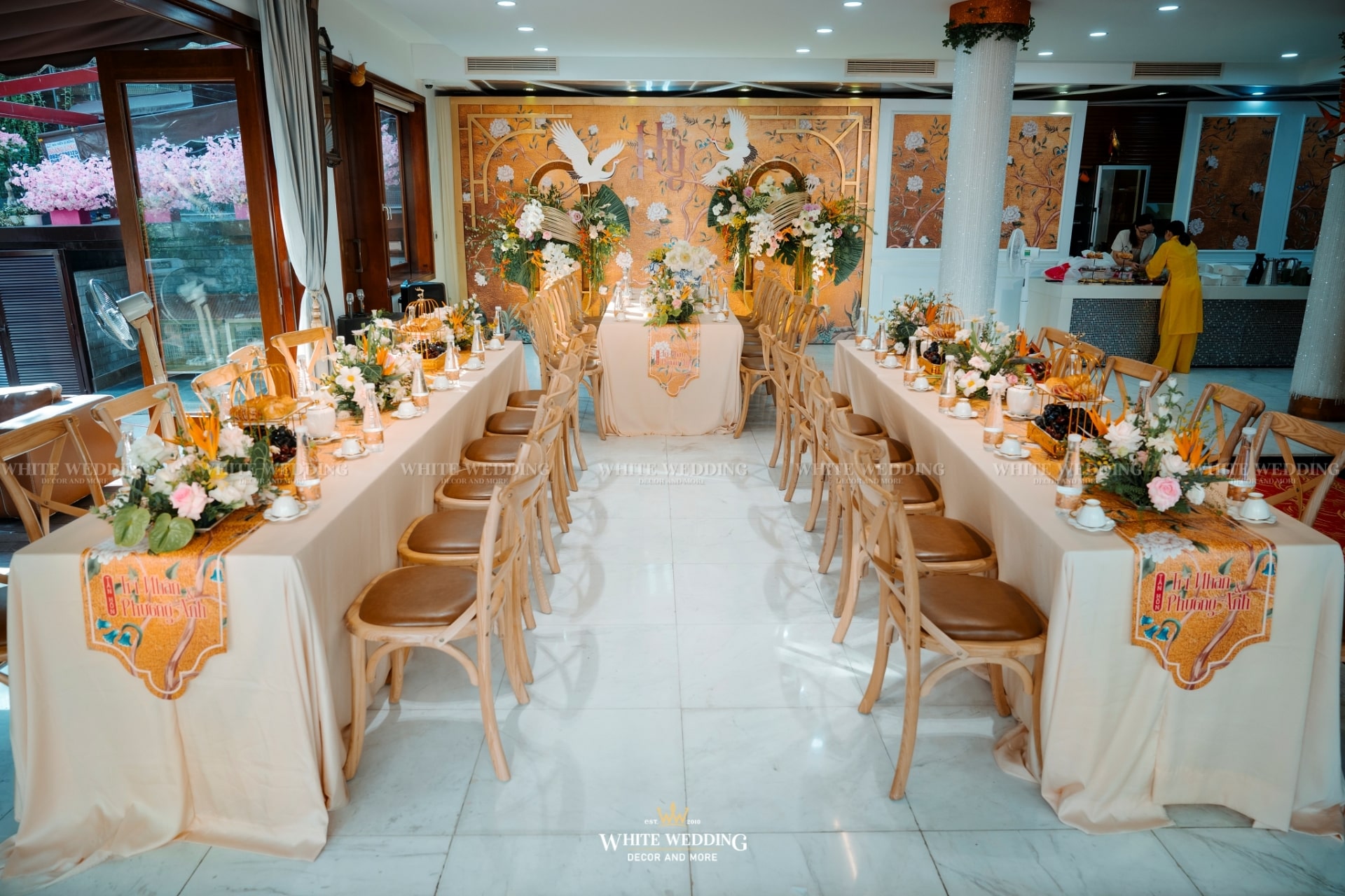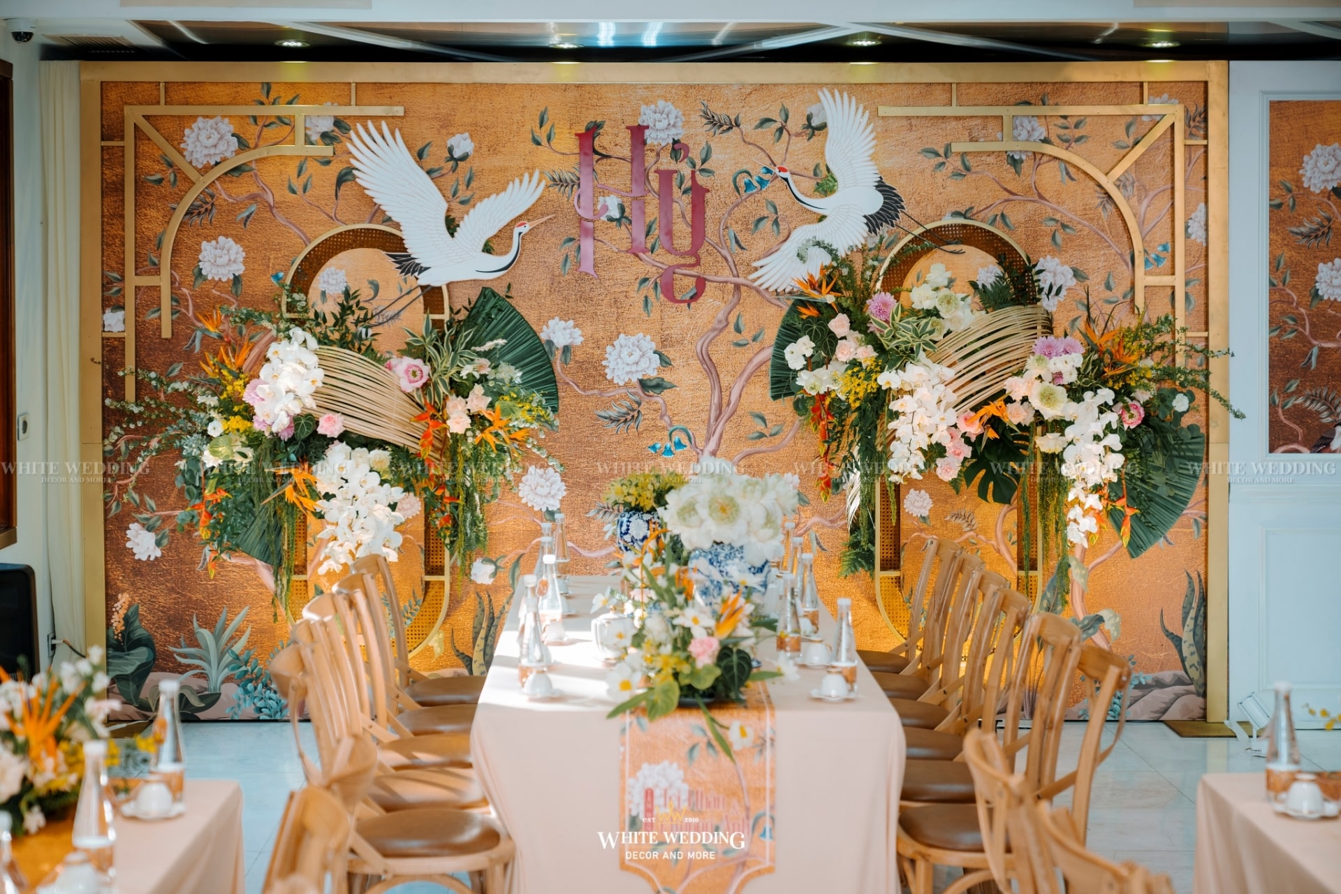 “Khổng Tước” là chủ đề đám cưới của cặp đôi Nhân & Anh. Gam màu vàng vương giả nổi bật kết hợp với linh vật sếu đầu đỏ. Khởi đầu với buổi lễ tân hôn rực rỡ được phối hợp tỉ mỉ đã giúp không gian tư gia của chú rể trở nên bừng sáng, sống động, rộn ràng trong ngày vui của cuộc đời mình, sẵn sàng “đón nàng về dinh”…Rất phù hợp với nội thất mang hơi hướng á đông của căn biệt thự.