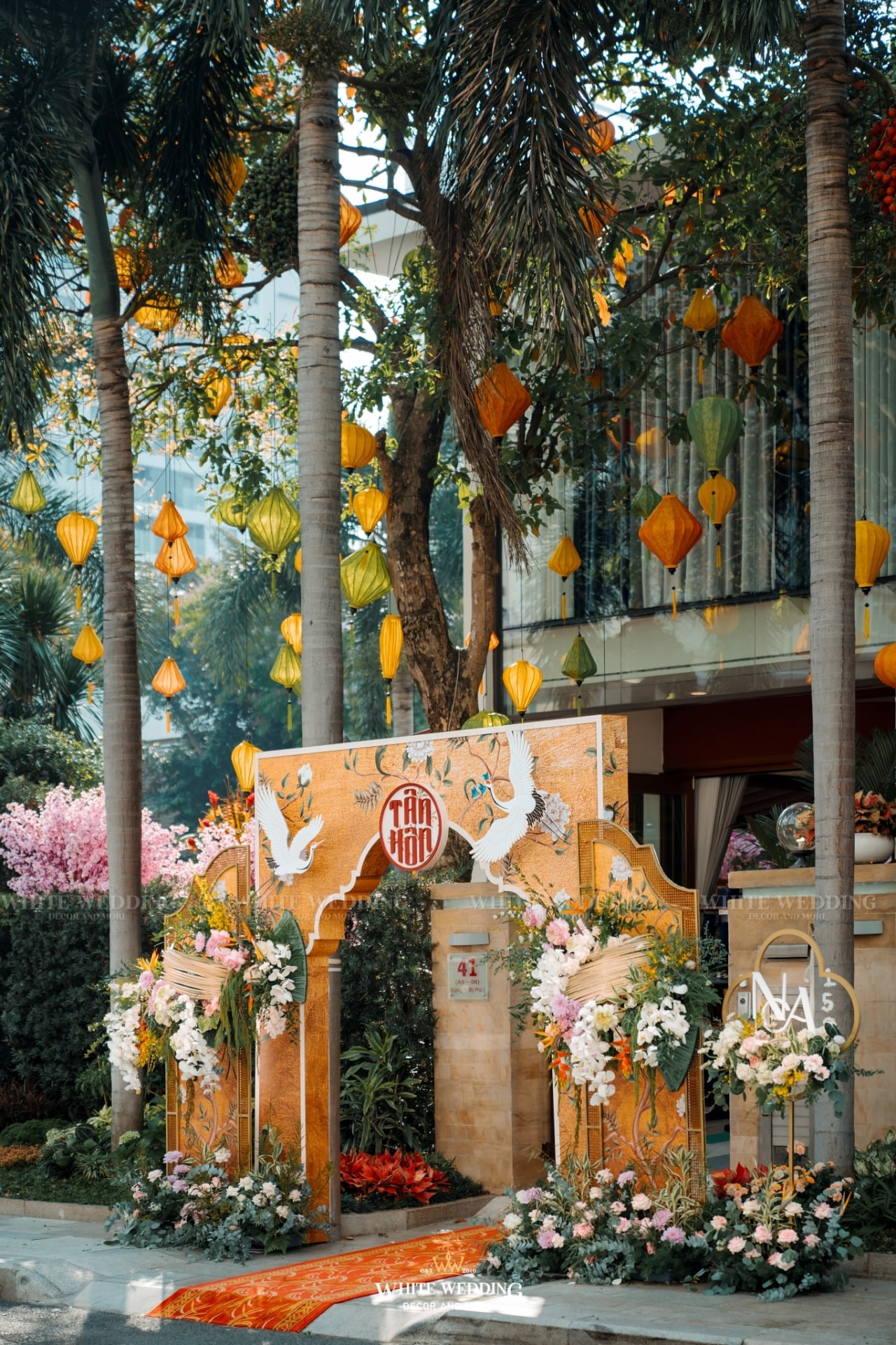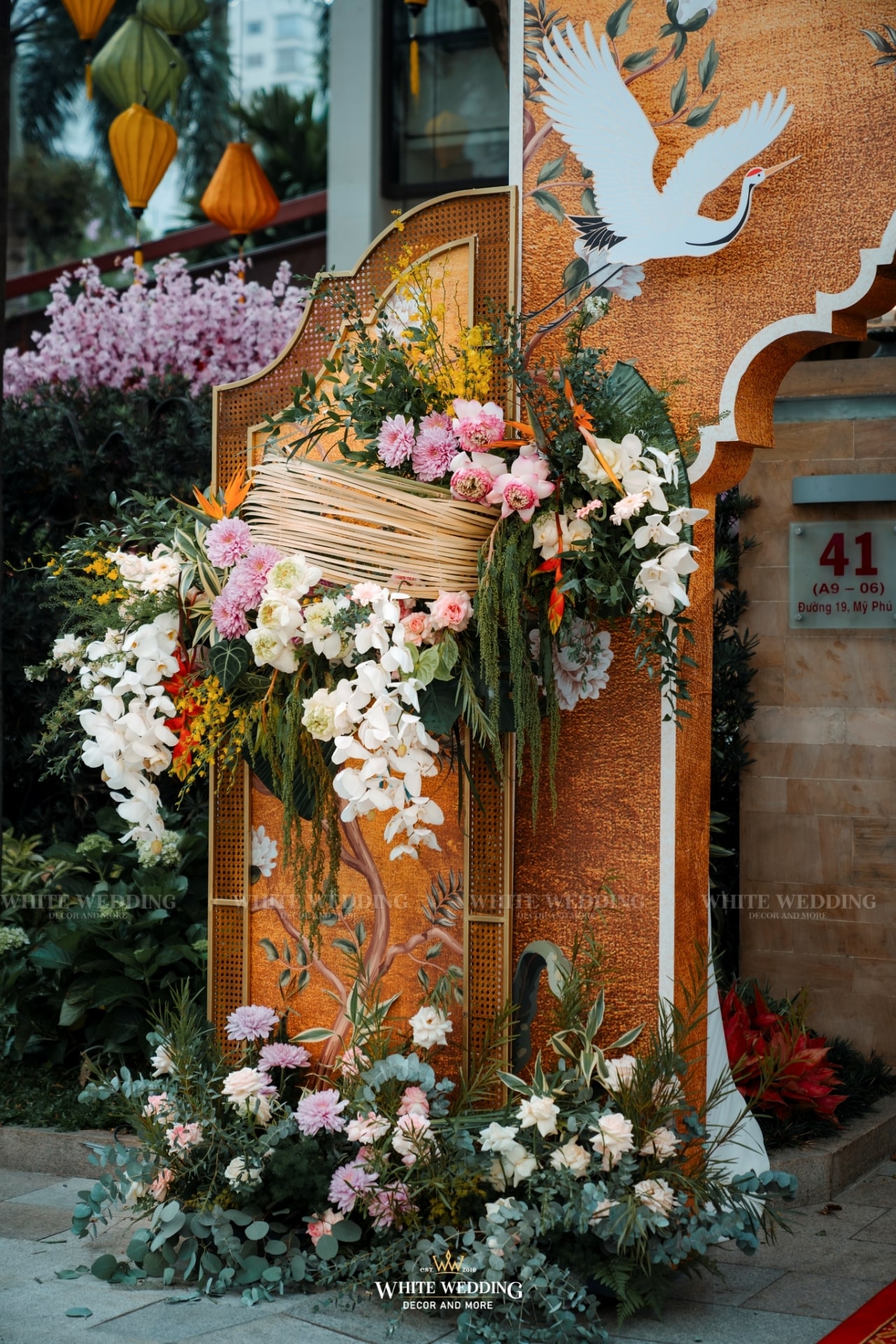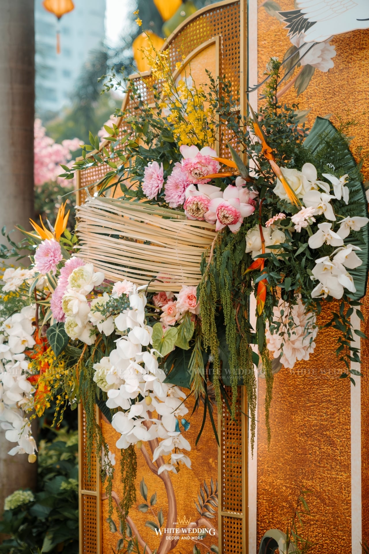 “Khổng Tước” là chủ đề đám cưới của cặp đôi Nhân & Anh. Gam màu vàng vương giả nổi bật kết hợp với linh vật sếu đầu đỏ. Khởi đầu với buổi lễ tân hôn rực rỡ được phối hợp tỉ mỉ đã giúp không gian tư gia của chú rể trở nên bừng sáng, sống động, rộn ràng trong ngày vui của cuộc đời mình, sẵn sàng “đón nàng về dinh”…Rất phù hợp với nội thất mang hơi hướng á đông của căn biệt thự.