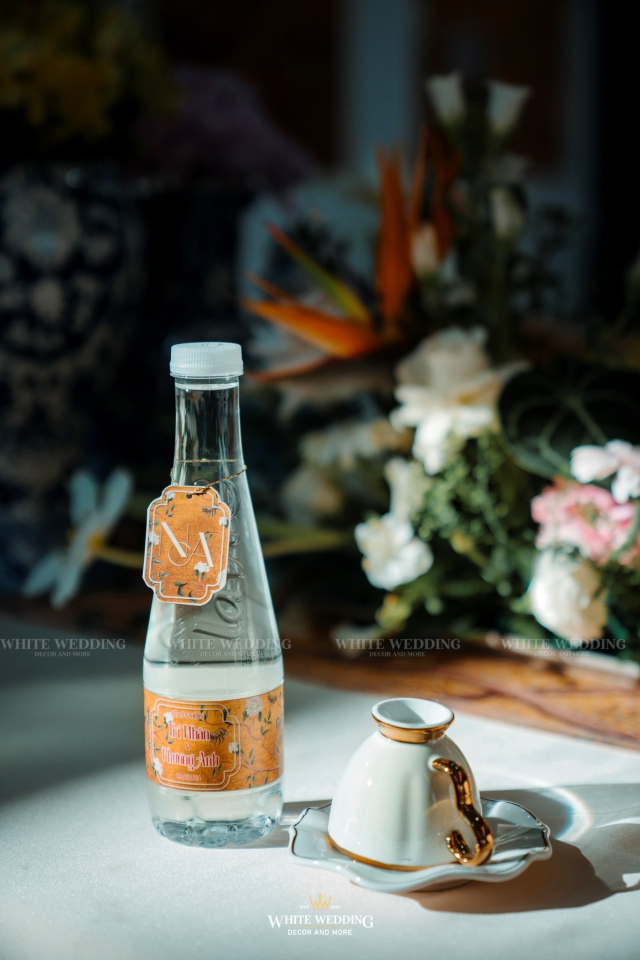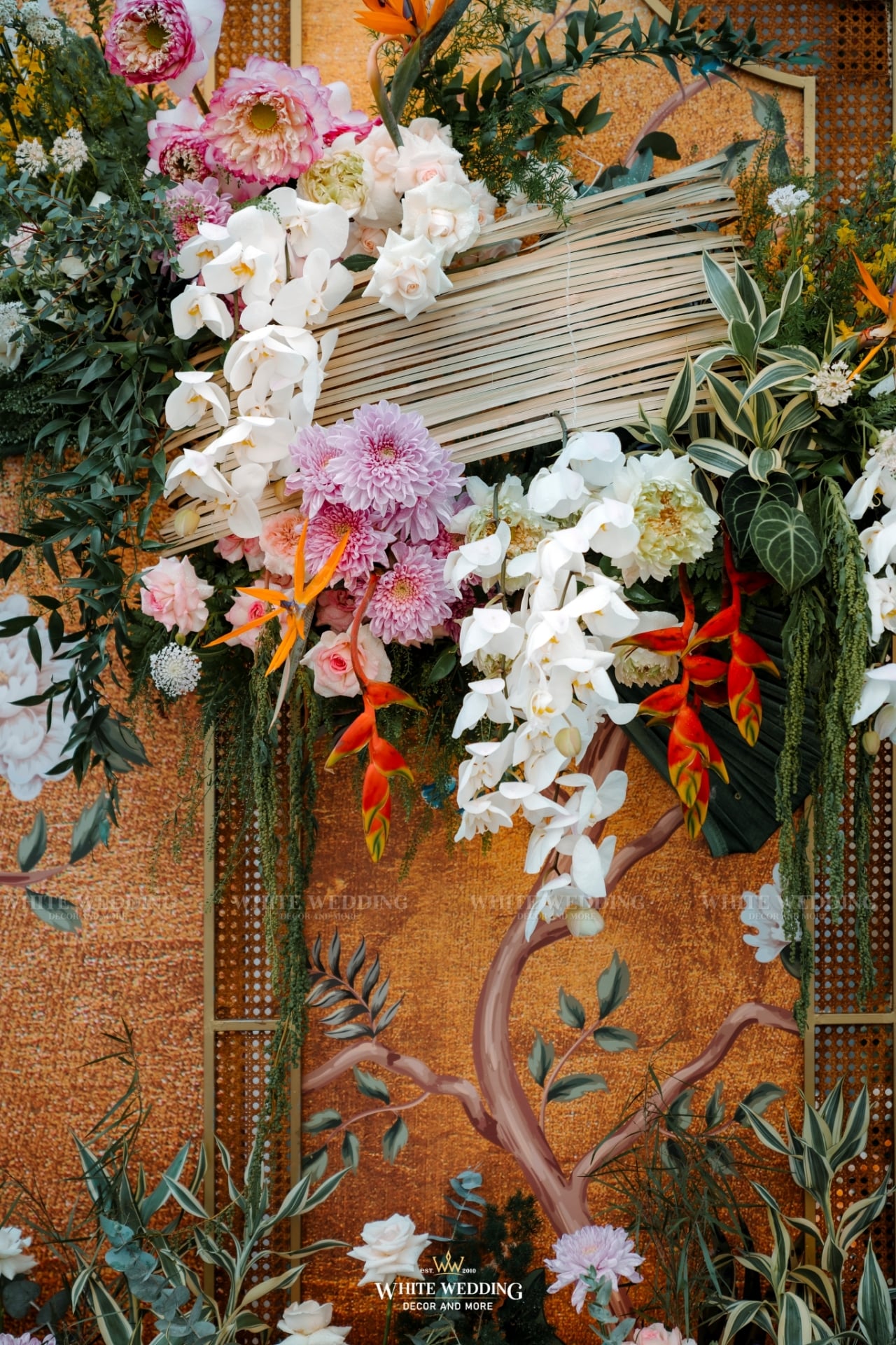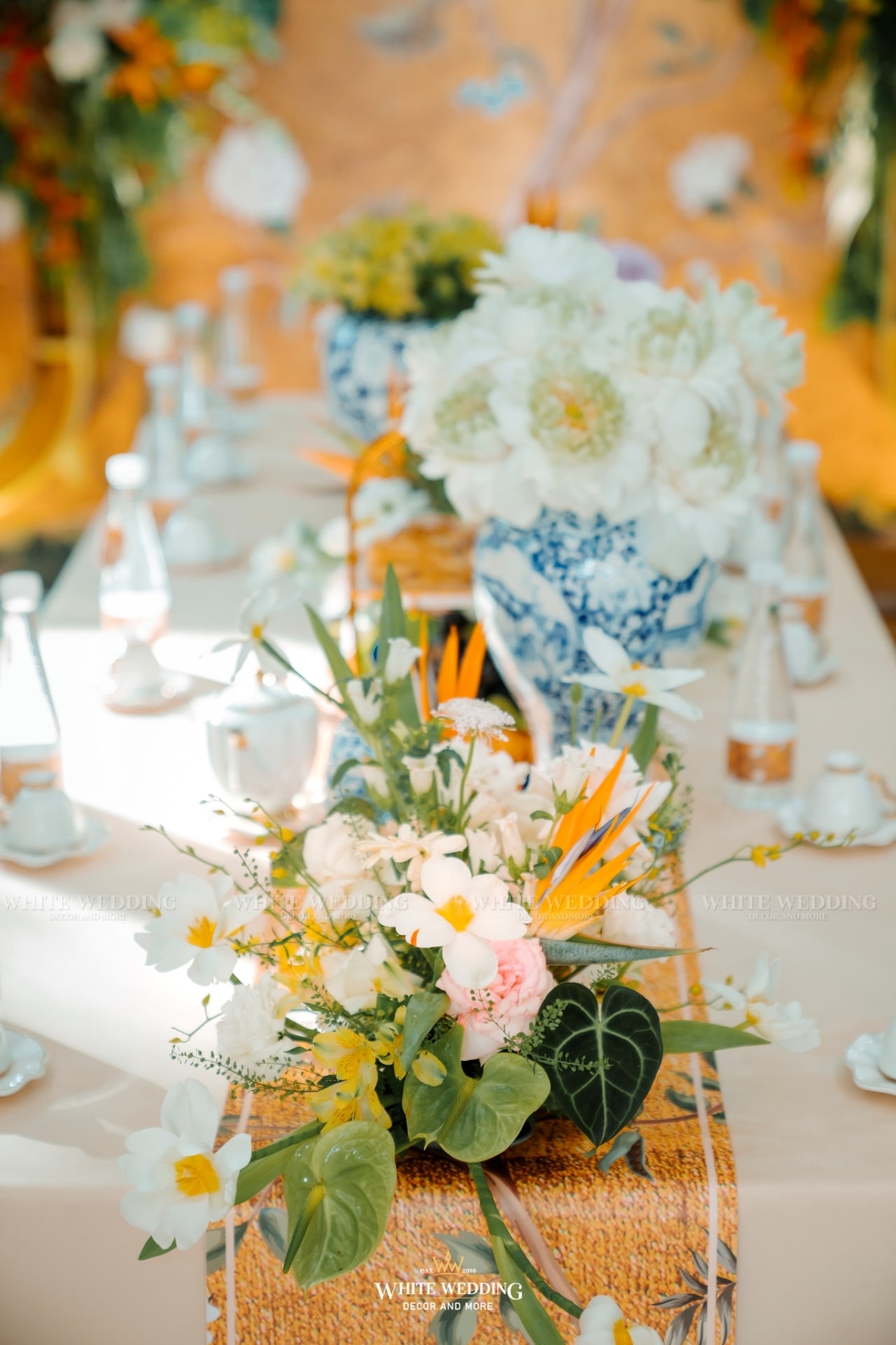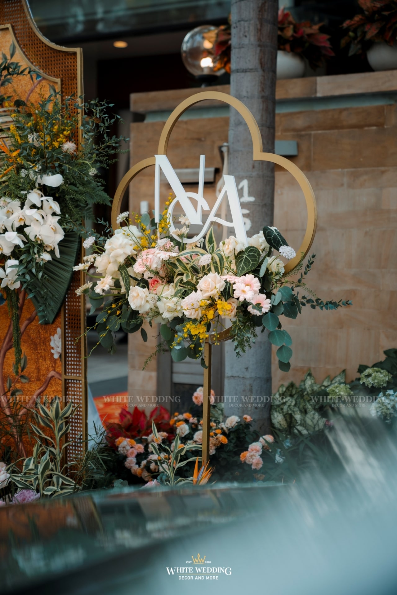 “Khổng Tước” là chủ đề đám cưới của cặp đôi Nhân & Anh. Gam màu vàng vương giả nổi bật kết hợp với linh vật sếu đầu đỏ. Khởi đầu với buổi lễ tân hôn rực rỡ được phối hợp tỉ mỉ đã giúp không gian tư gia của chú rể trở nên bừng sáng, sống động, rộn ràng trong ngày vui của cuộc đời mình, sẵn sàng “đón nàng về dinh”…Rất phù hợp với nội thất mang hơi hướng á đông của căn biệt thự.