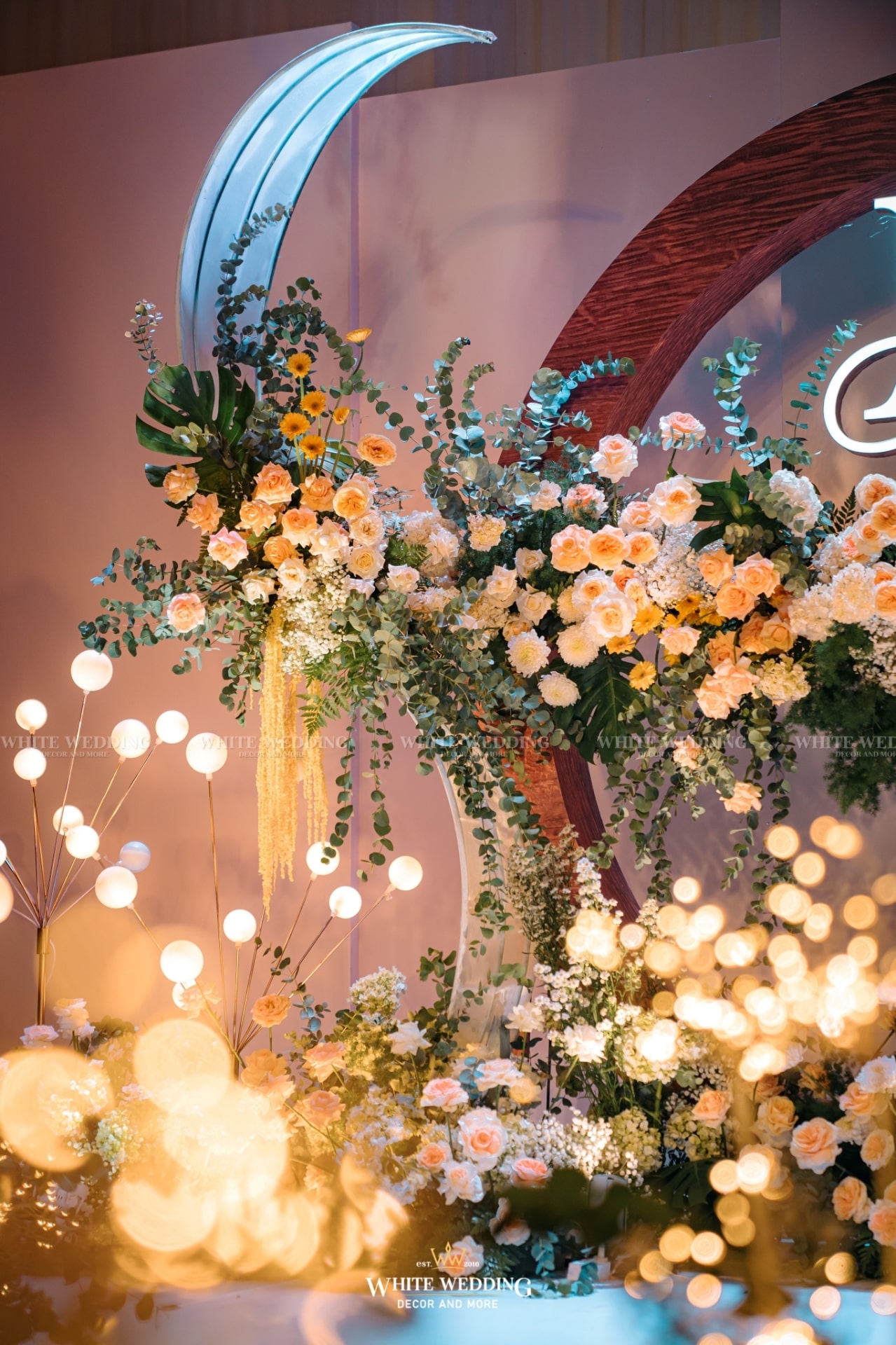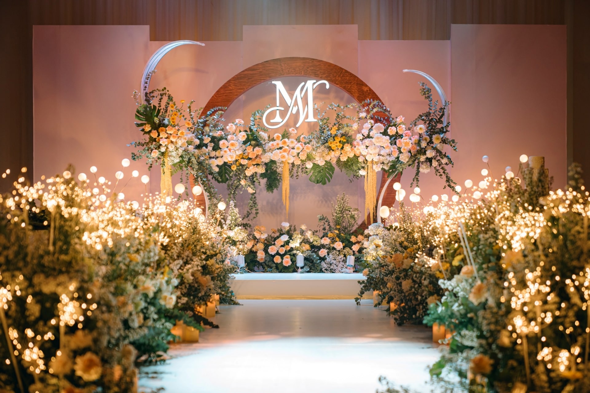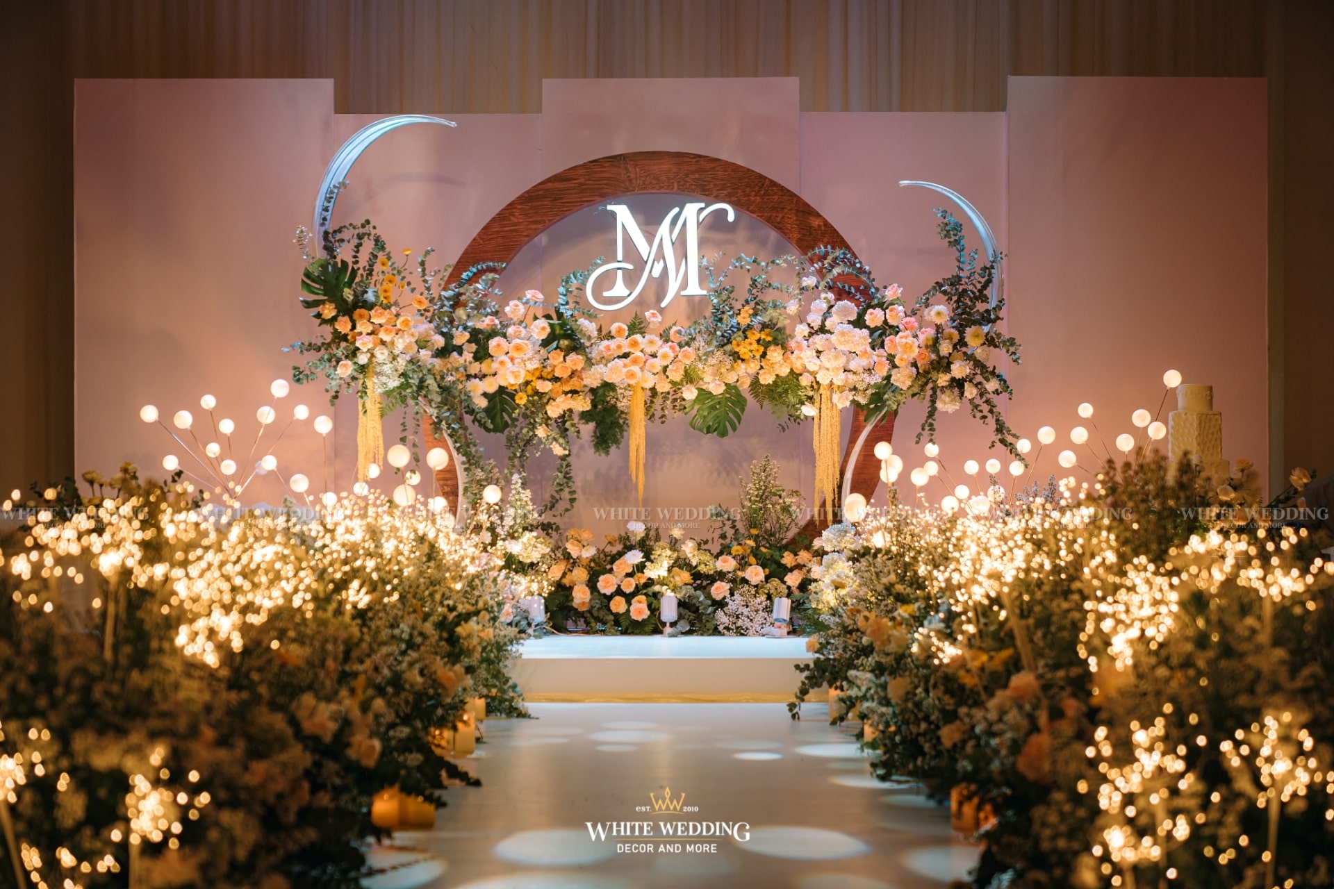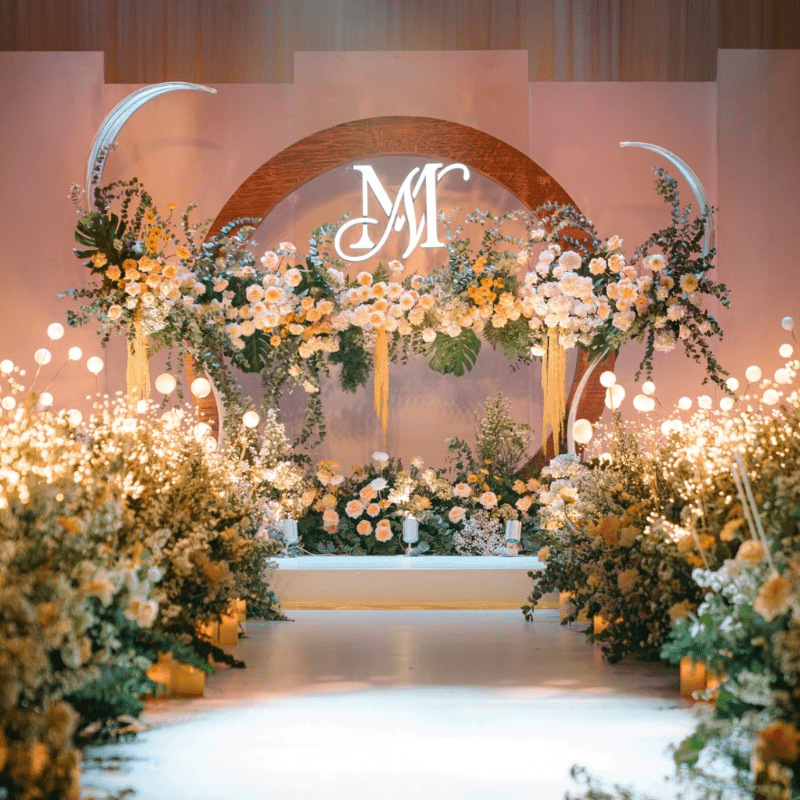 Moonlight mang vẻ đẹp huyền ảo với ánh sáng lung linh và sắc hoa dịu dàng. Khung tròn gỗ tượng trưng cho vầng trăng, kết hợp ánh bạc tạo nên không gian thơ mộng, thanh lịch. Lối đi rực rỡ dẫn lối đôi uyên ương bước vào khoảnh khắc đẹp nhất cuộc đời.