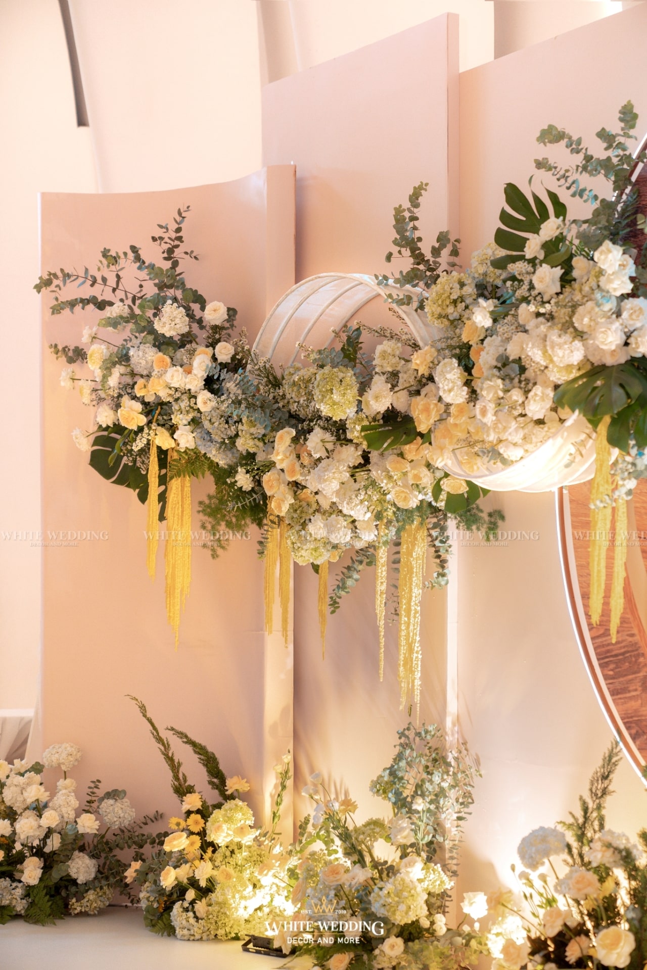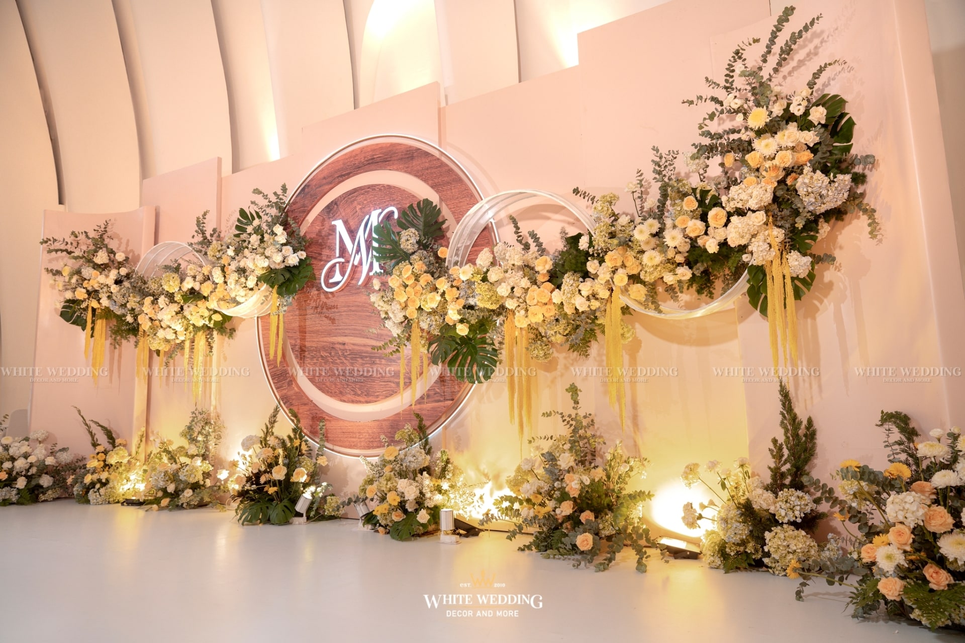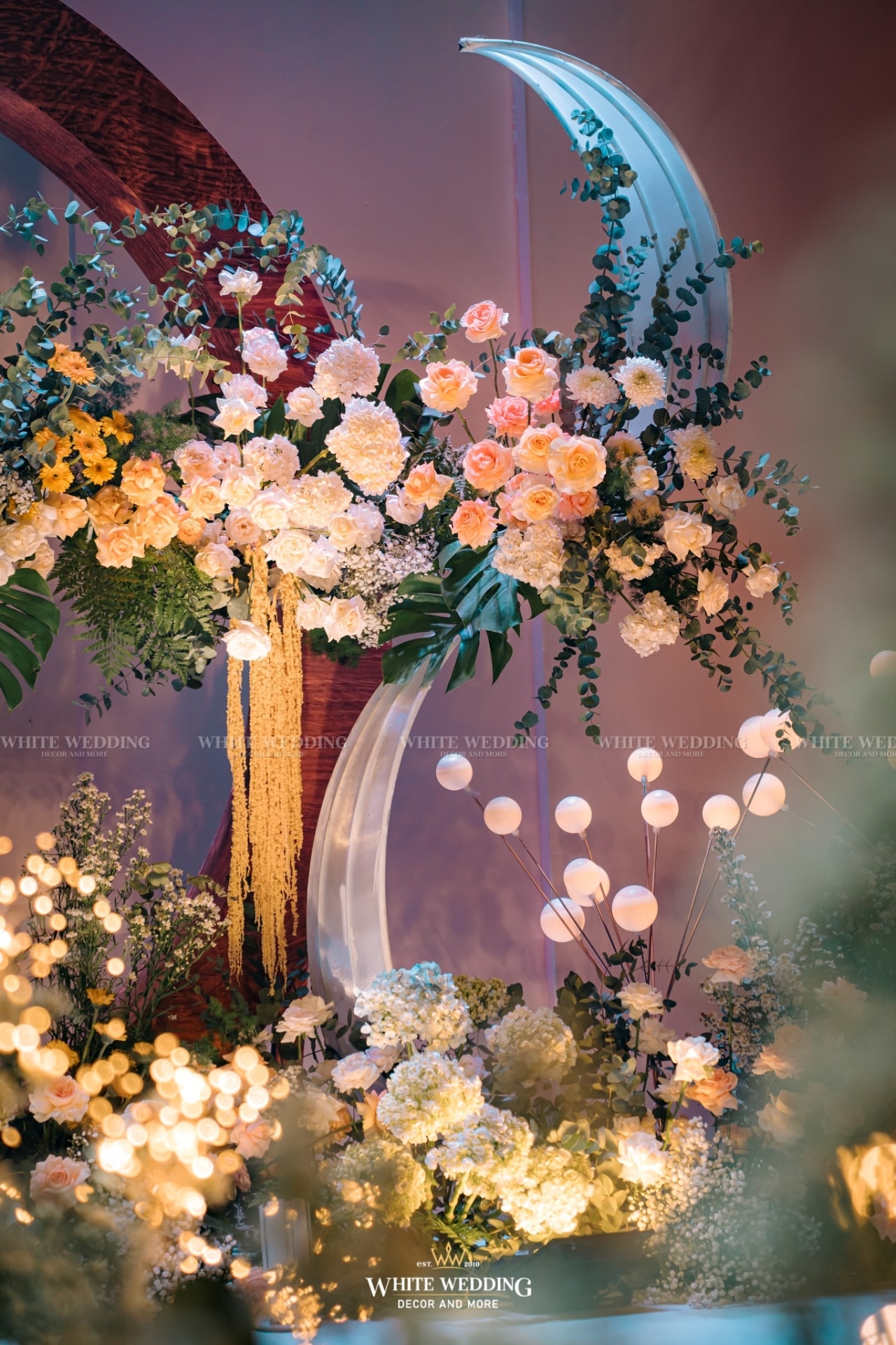 Moonlight mang vẻ đẹp huyền ảo với ánh sáng lung linh và sắc hoa dịu dàng. Khung tròn gỗ tượng trưng cho vầng trăng, kết hợp ánh bạc tạo nên không gian thơ mộng, thanh lịch. Lối đi rực rỡ dẫn lối đôi uyên ương bước vào khoảnh khắc đẹp nhất cuộc đời.