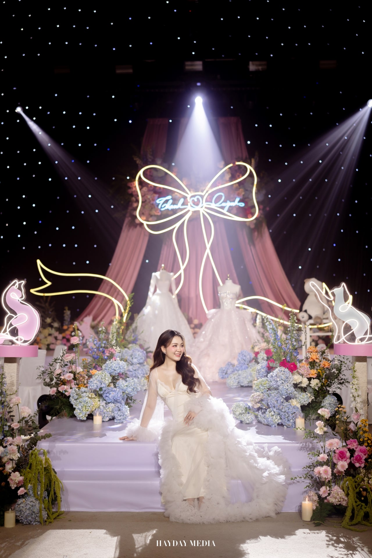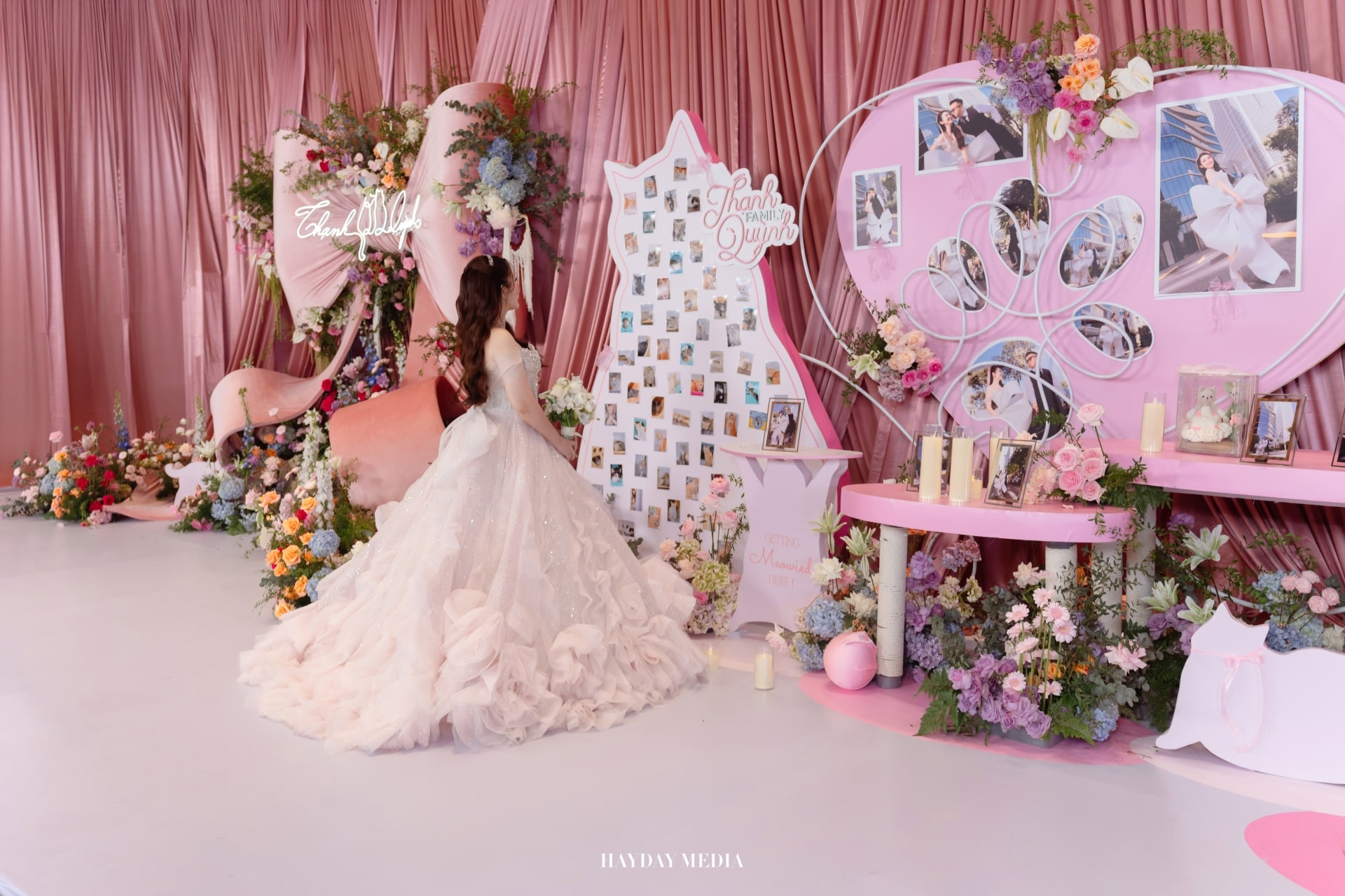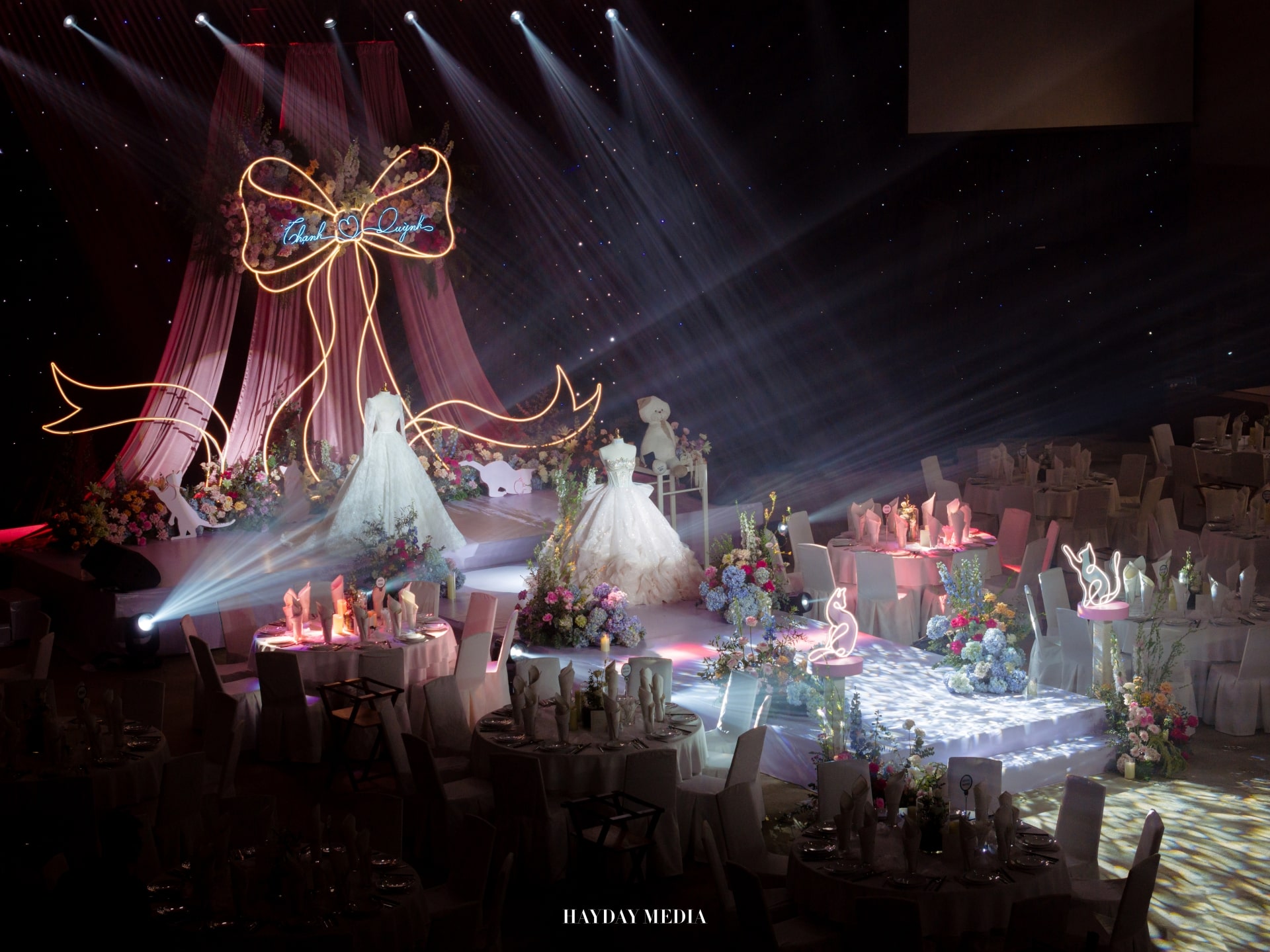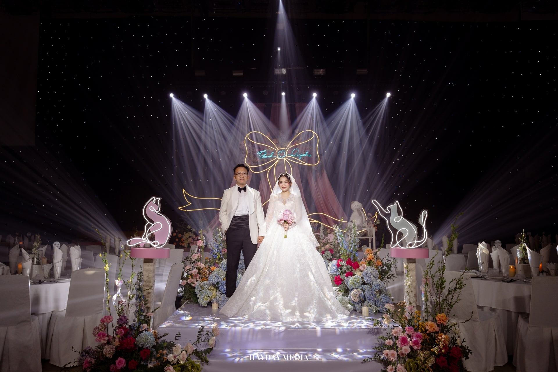 Tiệc cưới được thiết kế trang trí cá nhân hoá đặc biệt theo câu truyện tình yêu đầy lãng mạn của Quỳnh và Thạnh.