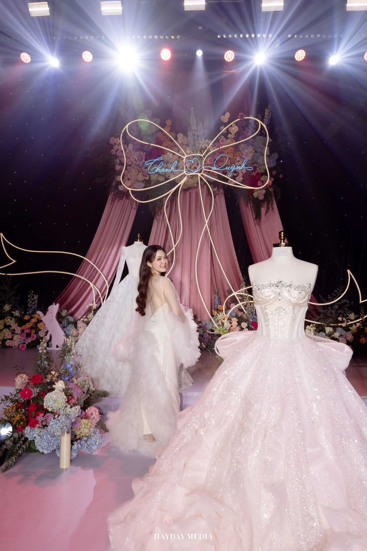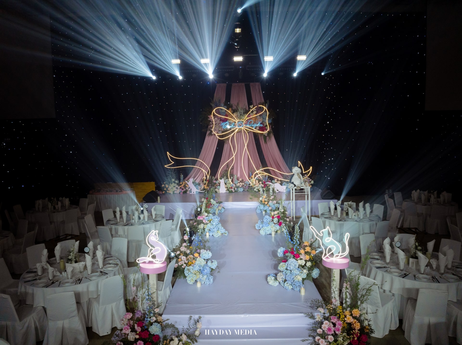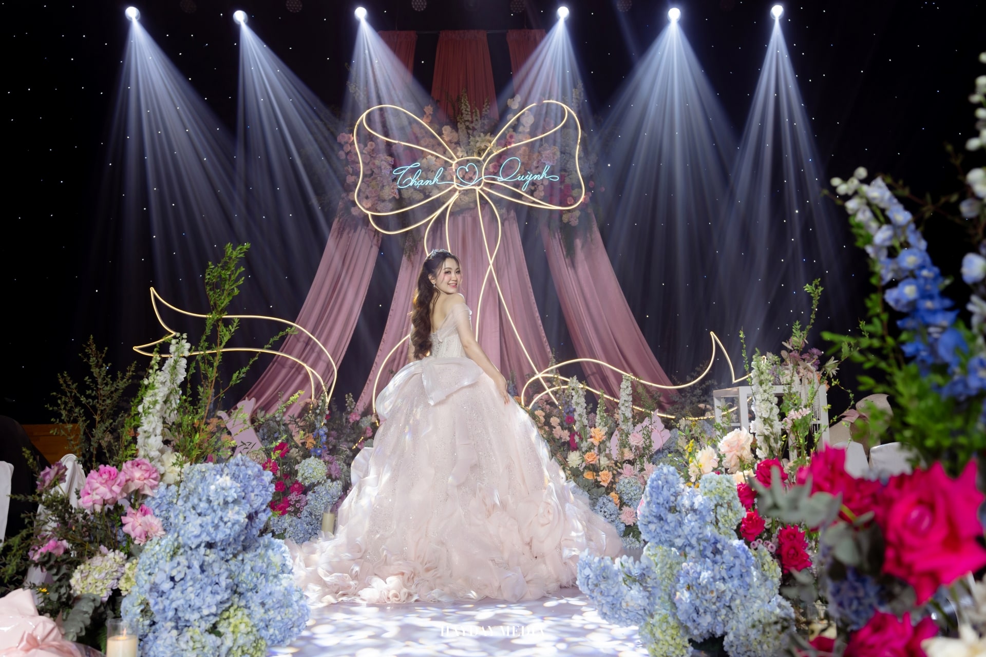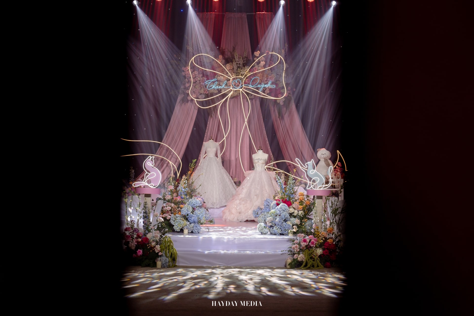 Tiệc cưới được thiết kế trang trí cá nhân hoá đặc biệt theo câu truyện tình yêu đầy lãng mạn của Quỳnh và Thạnh.