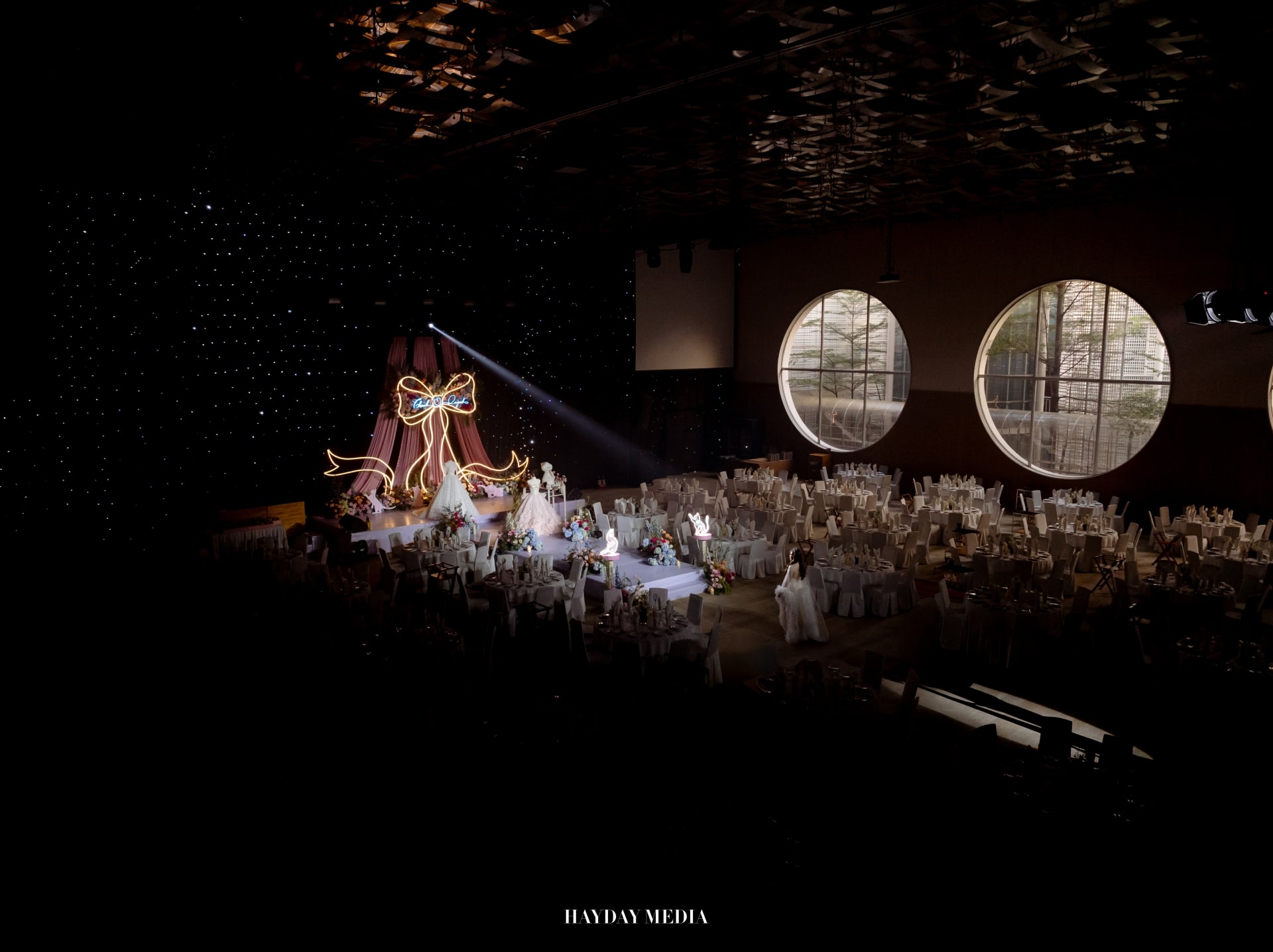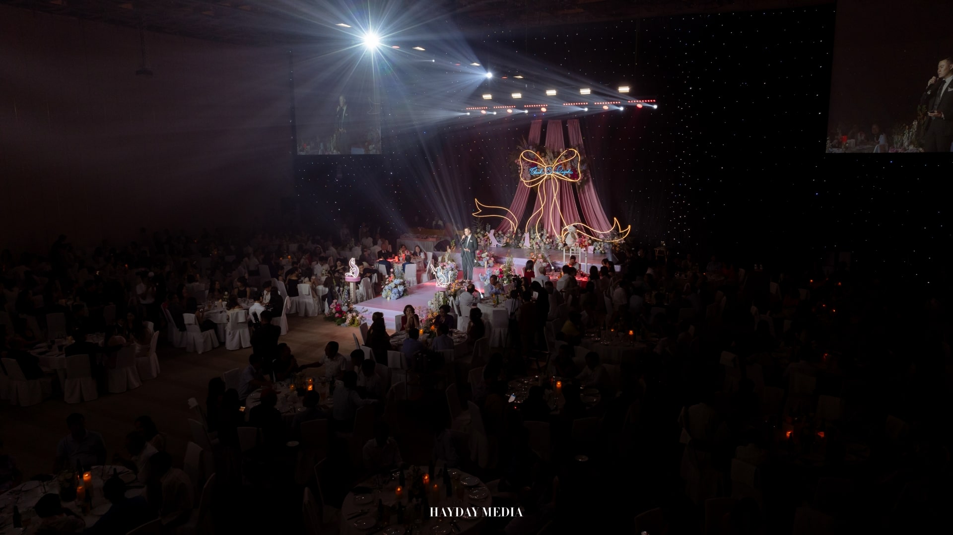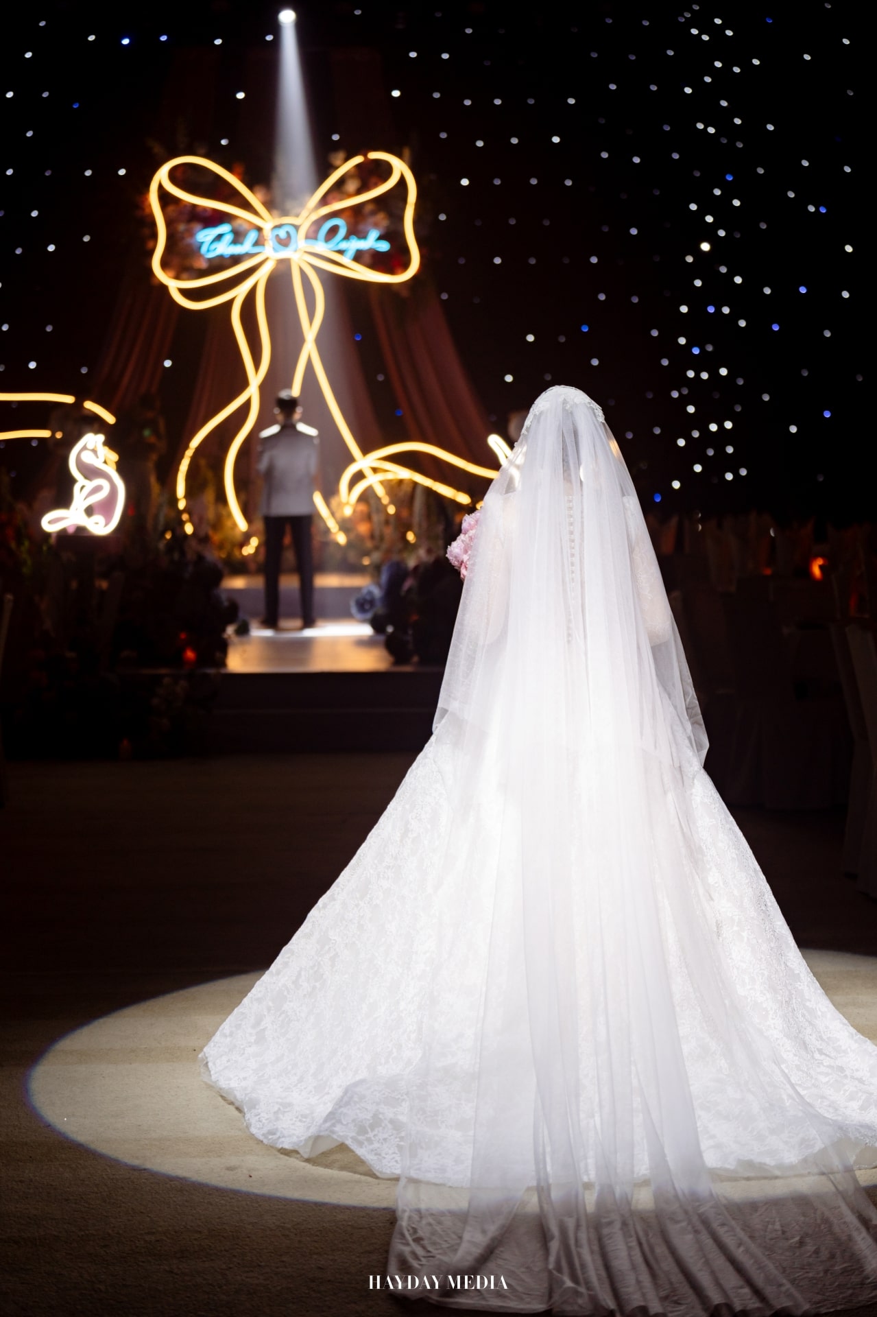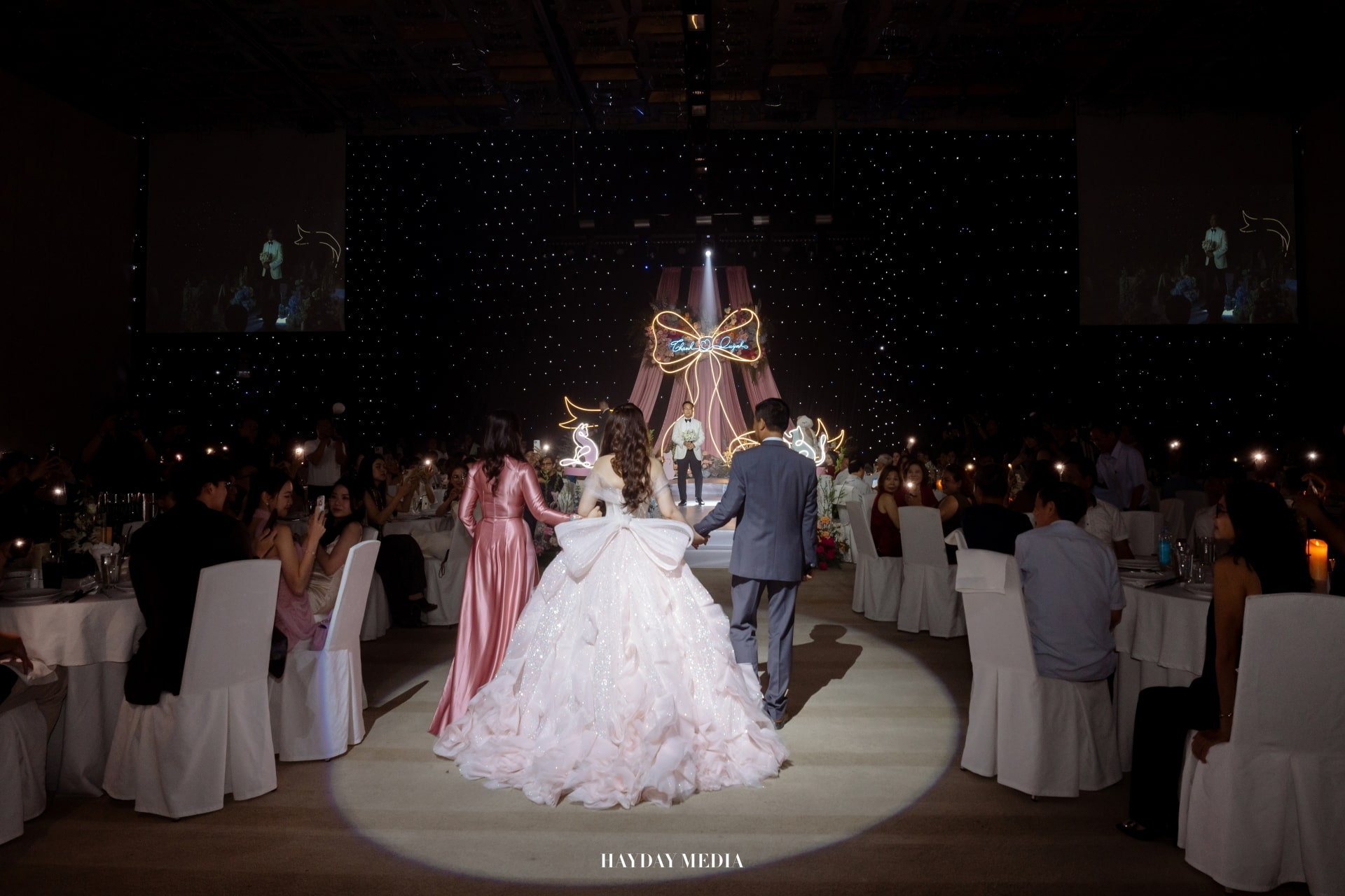 Tiệc cưới được thiết kế trang trí cá nhân hoá đặc biệt theo câu truyện tình yêu đầy lãng mạn của Quỳnh và Thạnh.