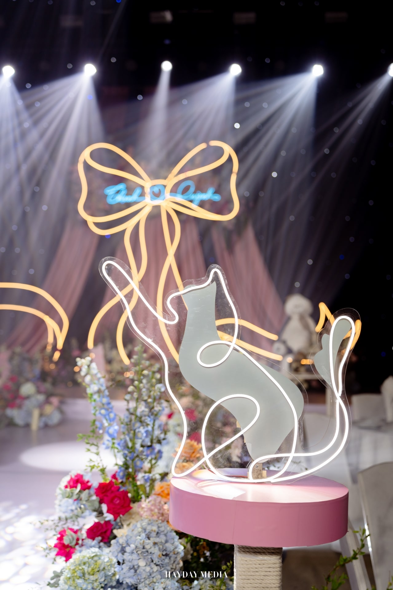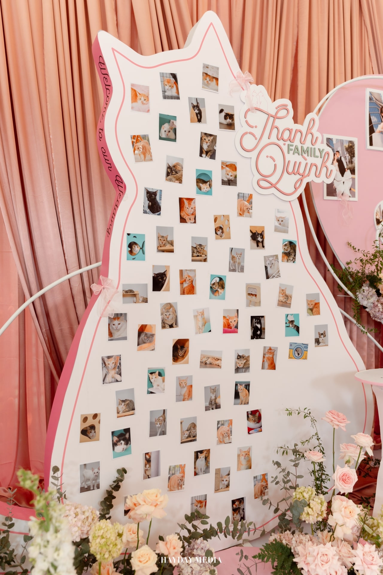 Cặp đôi có một tình yêu mèo mãnh liệt, kết duyên qua hội cứu trợ động vật và đang nhận nuôi gần 100 chú mèo lưu lạc từ khắp nơi. Kết hợp với chiếc nơ khổng lồ đang được trend rần rần trong thời gian qua tạo nên một concept trang trí buổi vu quy thật ấn tượng và độc đáo.