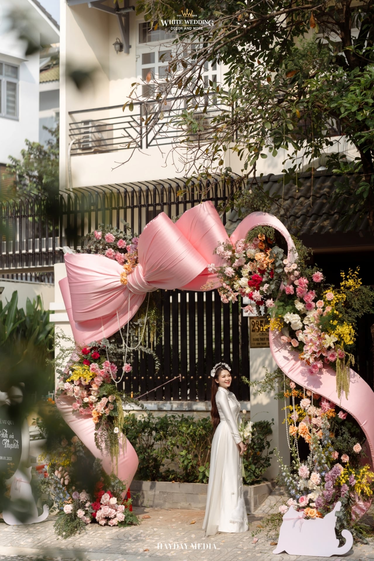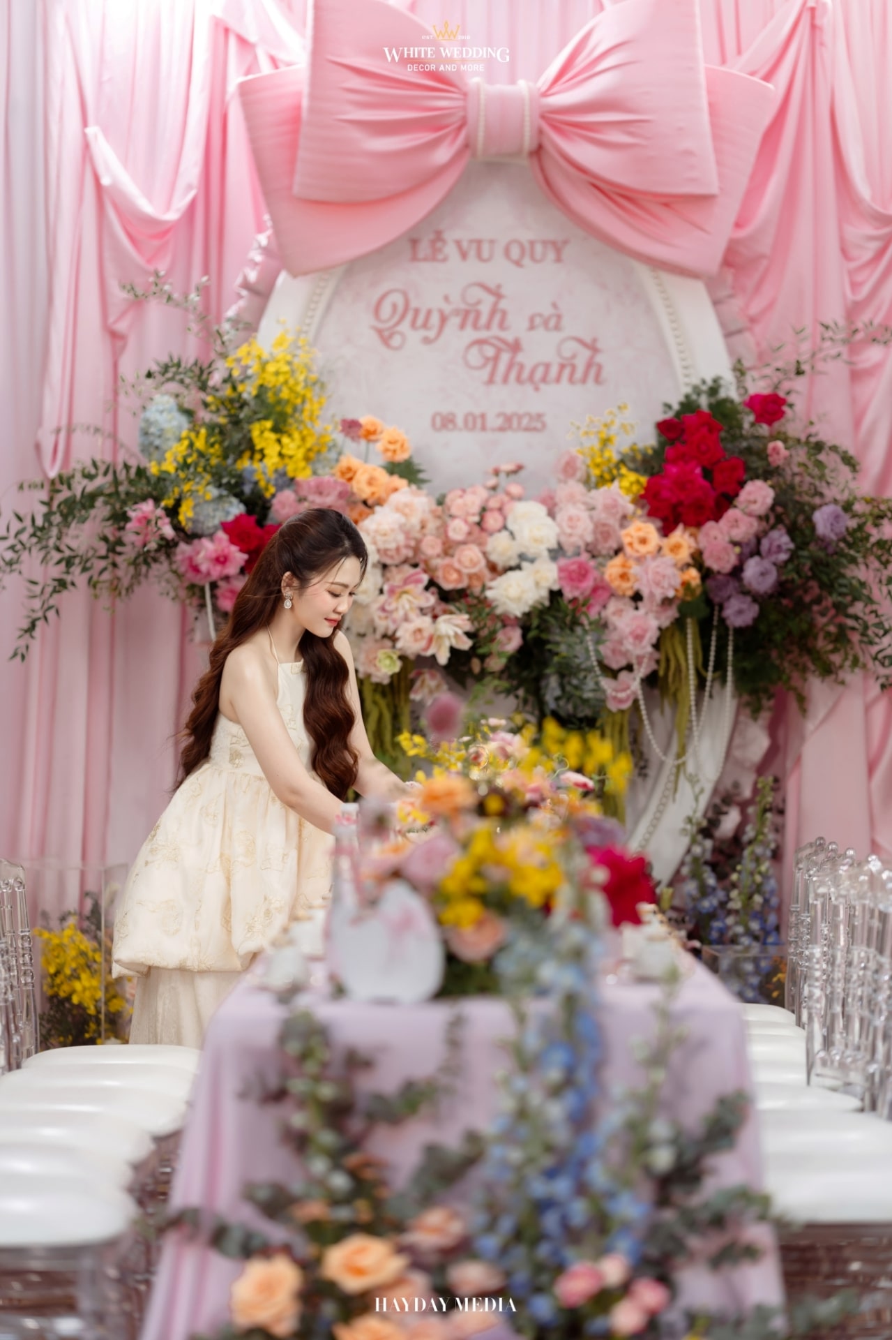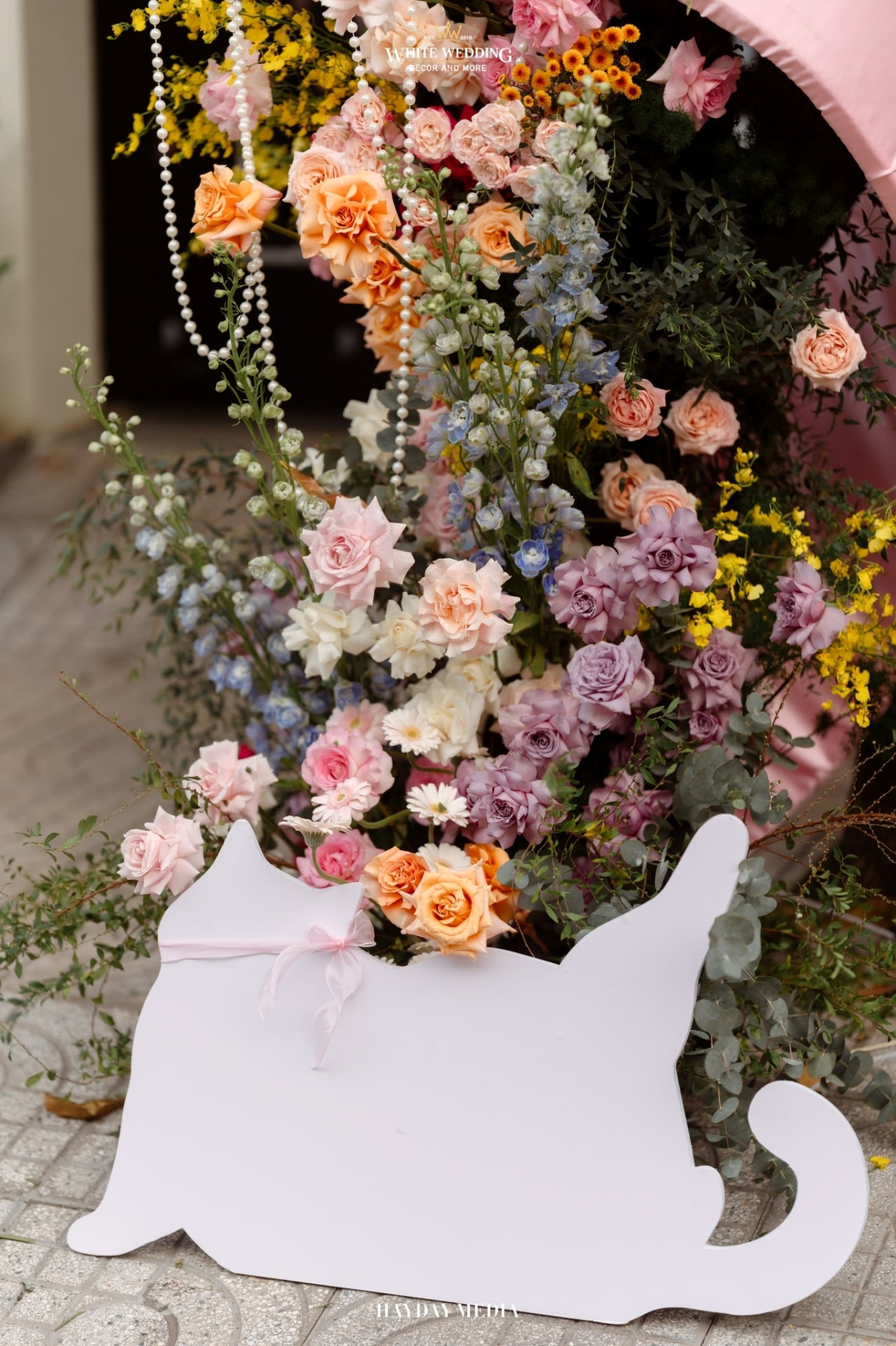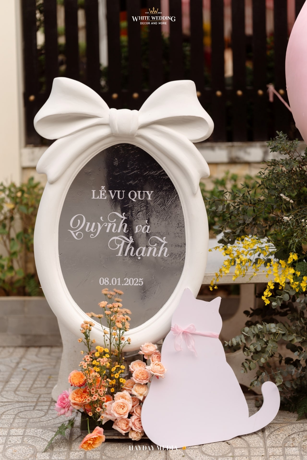 Lễ vu quy được cá nhân hoá đặc biệt theo câu truyện tình yêu đầy lãng mạn của Quỳnh và Thạnh. Cặp đôi có một tình yêu mèo mãnh liệt, kết duyên qua hội cứu trợ động vật và đang nhận nuôi gần 100 chú mèo lưu lạc từ khắp nới… Kết hợp với chiếc nơ khổng lồ đang được trend rần rần trong thời gian qua tạo nên một concept trang trí buổi vu quy thật ấn tượng và độc đáo….