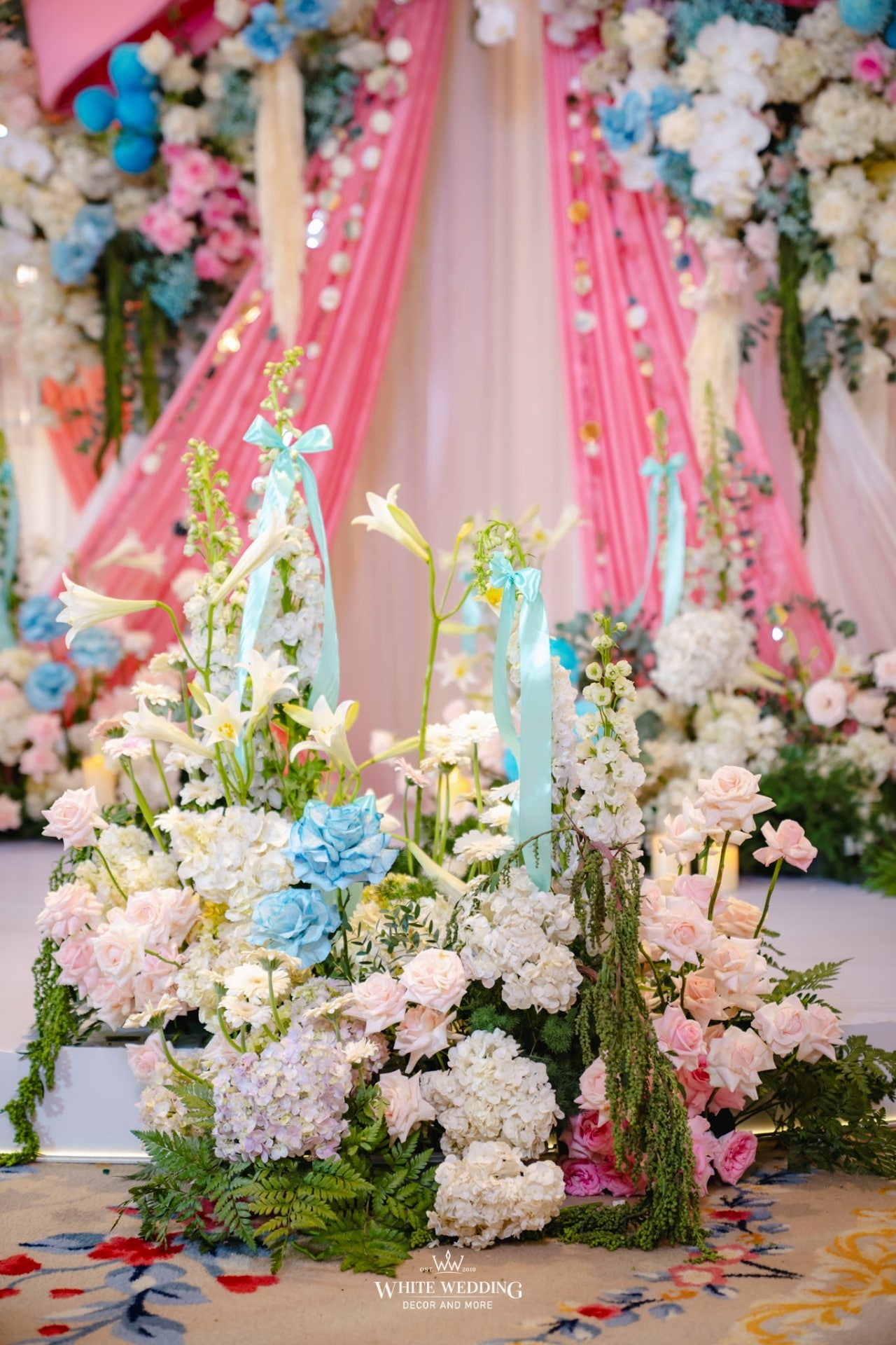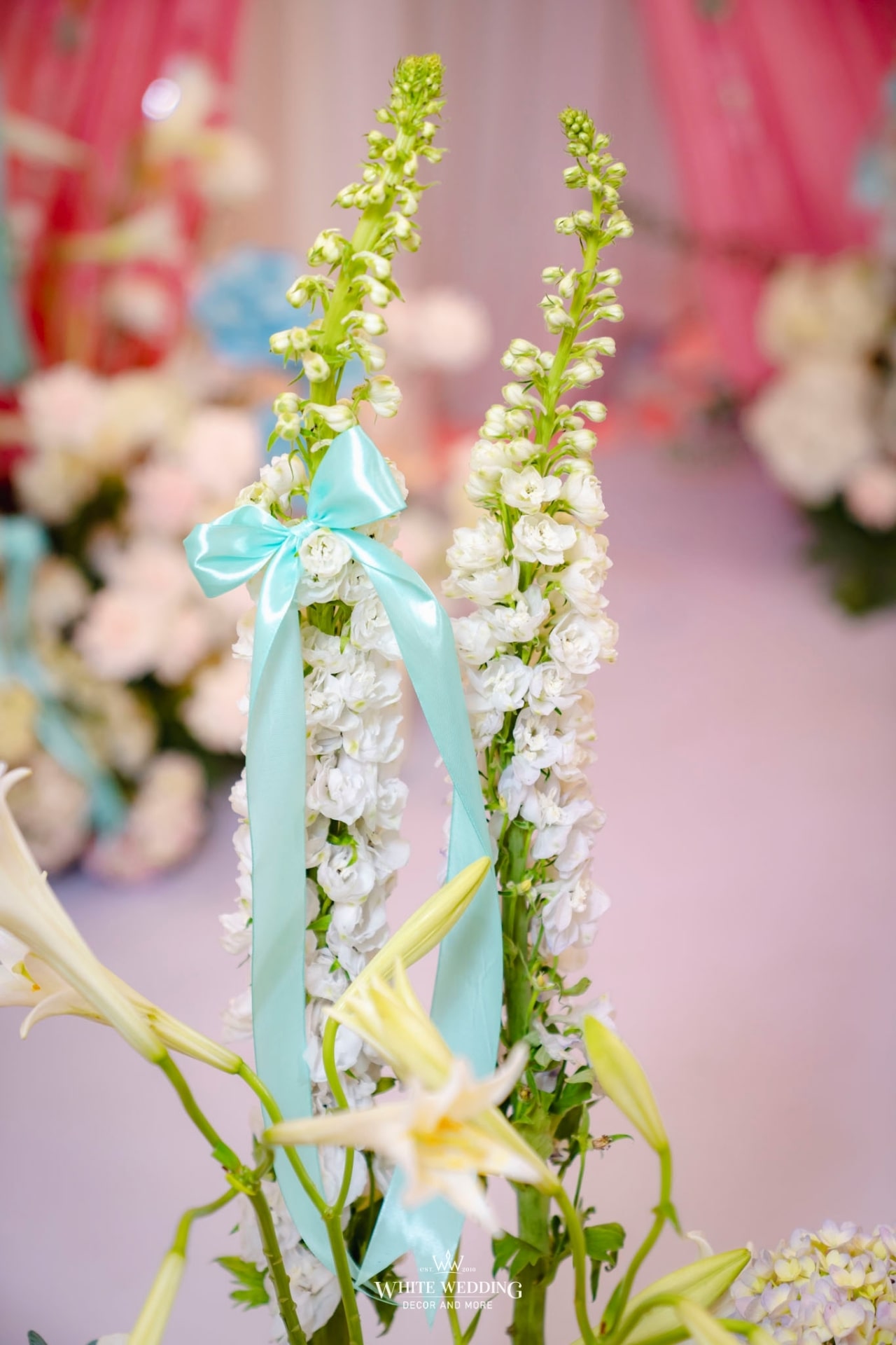 Trong không gian sang trọng của khách sạn Park Hyatt, White Wedding một lần nữa đưa xu hướng nơ trở lại trong lễ đính hôn của nàng dâu Mờ Ray và chú rể Dương Nguyễn.
